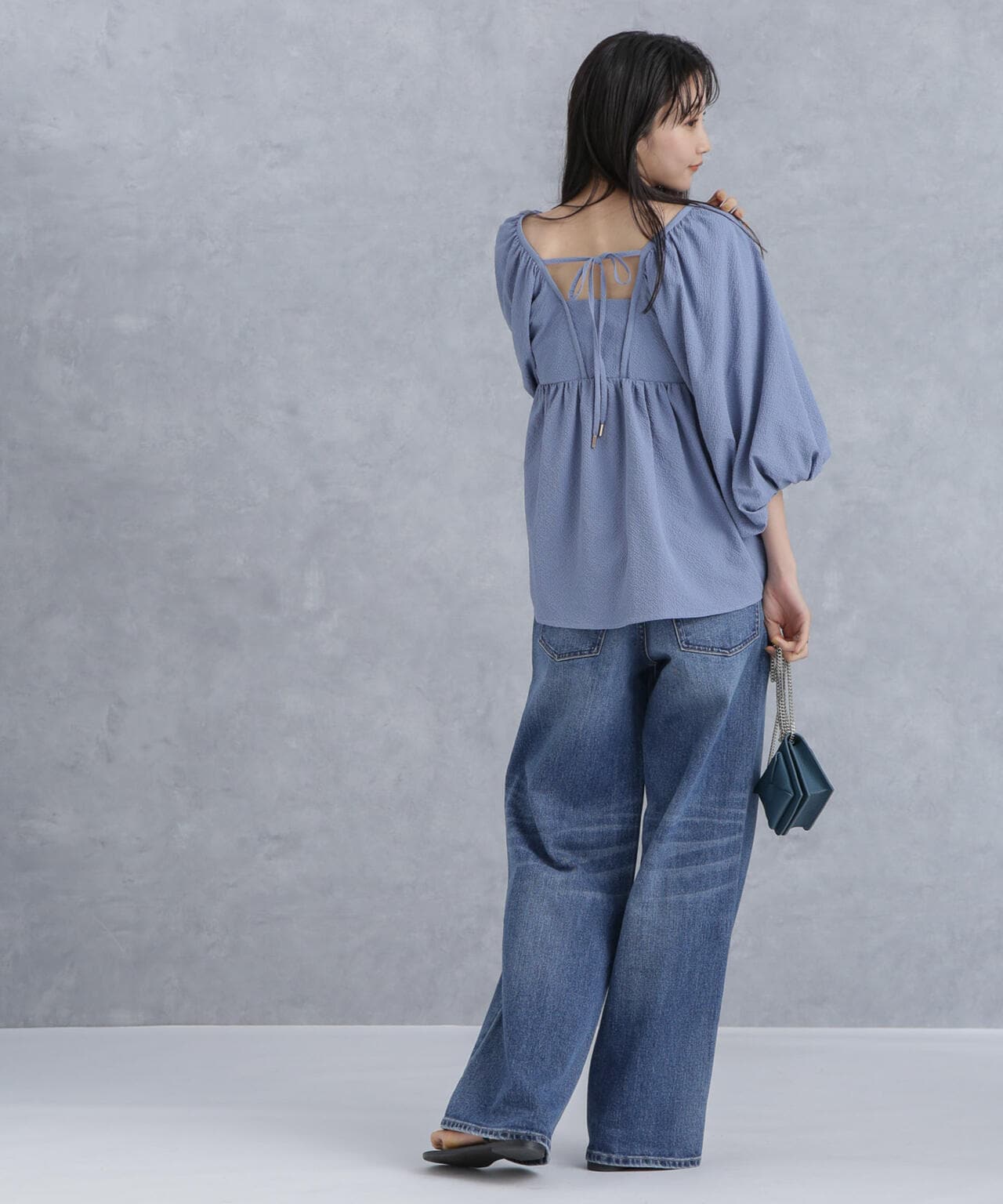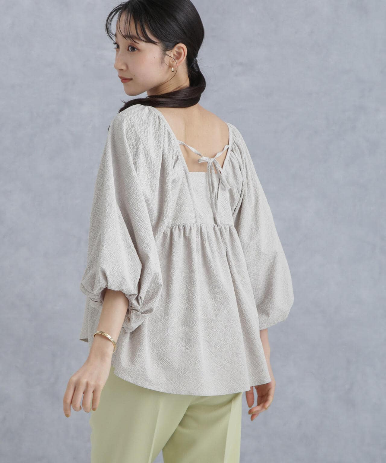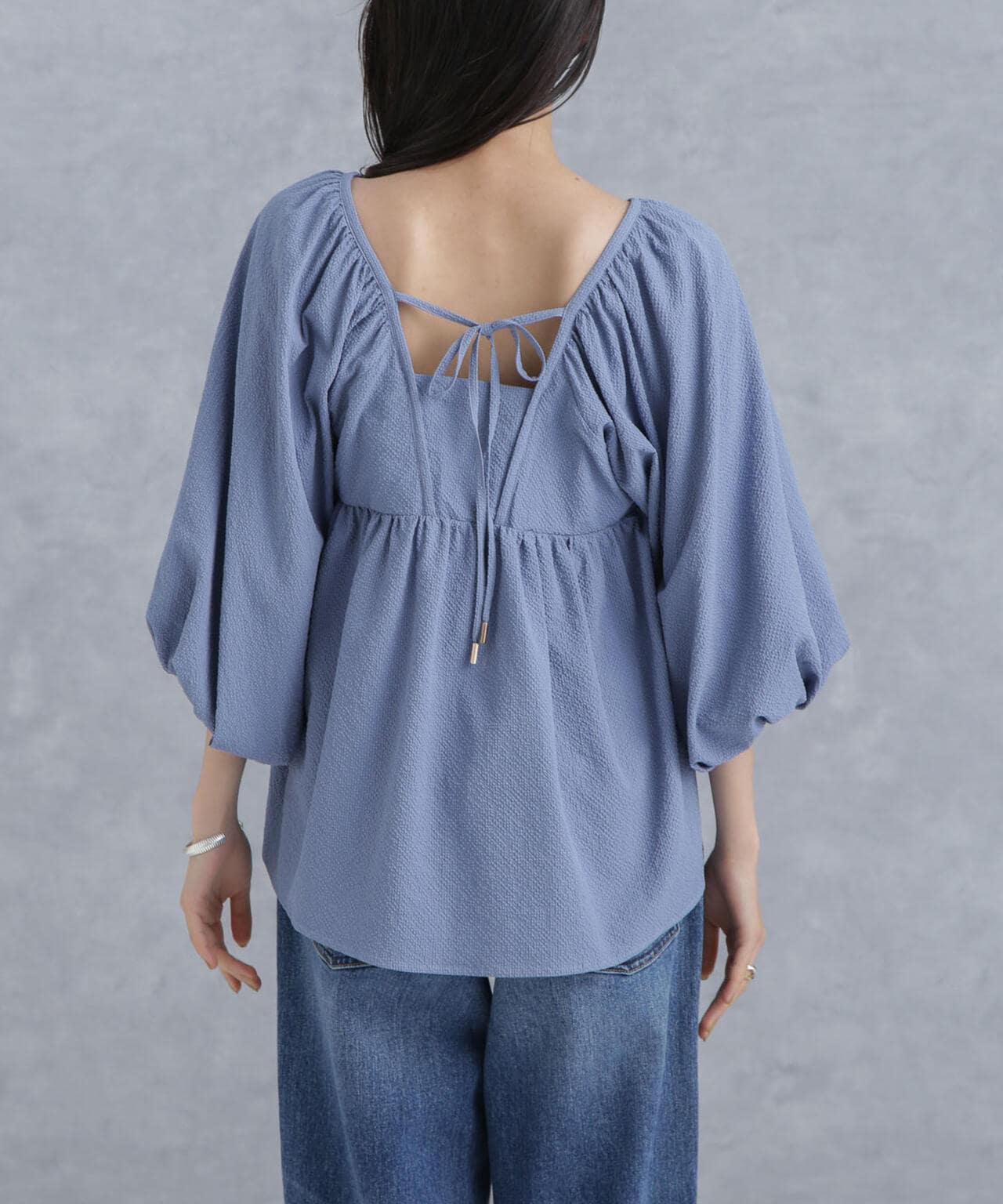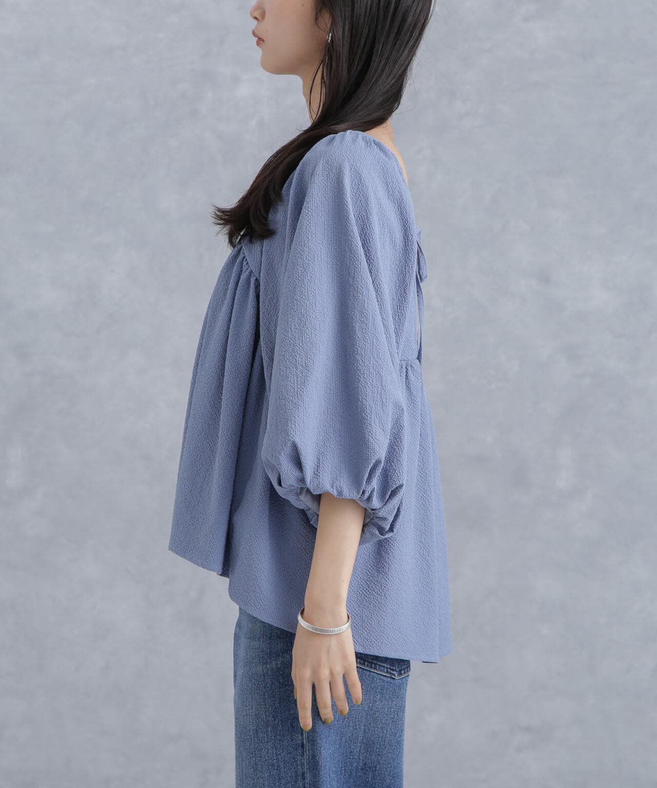 バックリボンが軽やかな印象のブラウス。ボリューム感のある袖とペプラム切り替えでふんわりさせたボディが女性らしいデザイン。すっきりとしたスクエアネックでデコルテがキレイに見えるのも嬉しいポイント◎。ボリュームのあるデザインなのでボトムはスッキリとしたコーディネートがおすすめの一枚です。