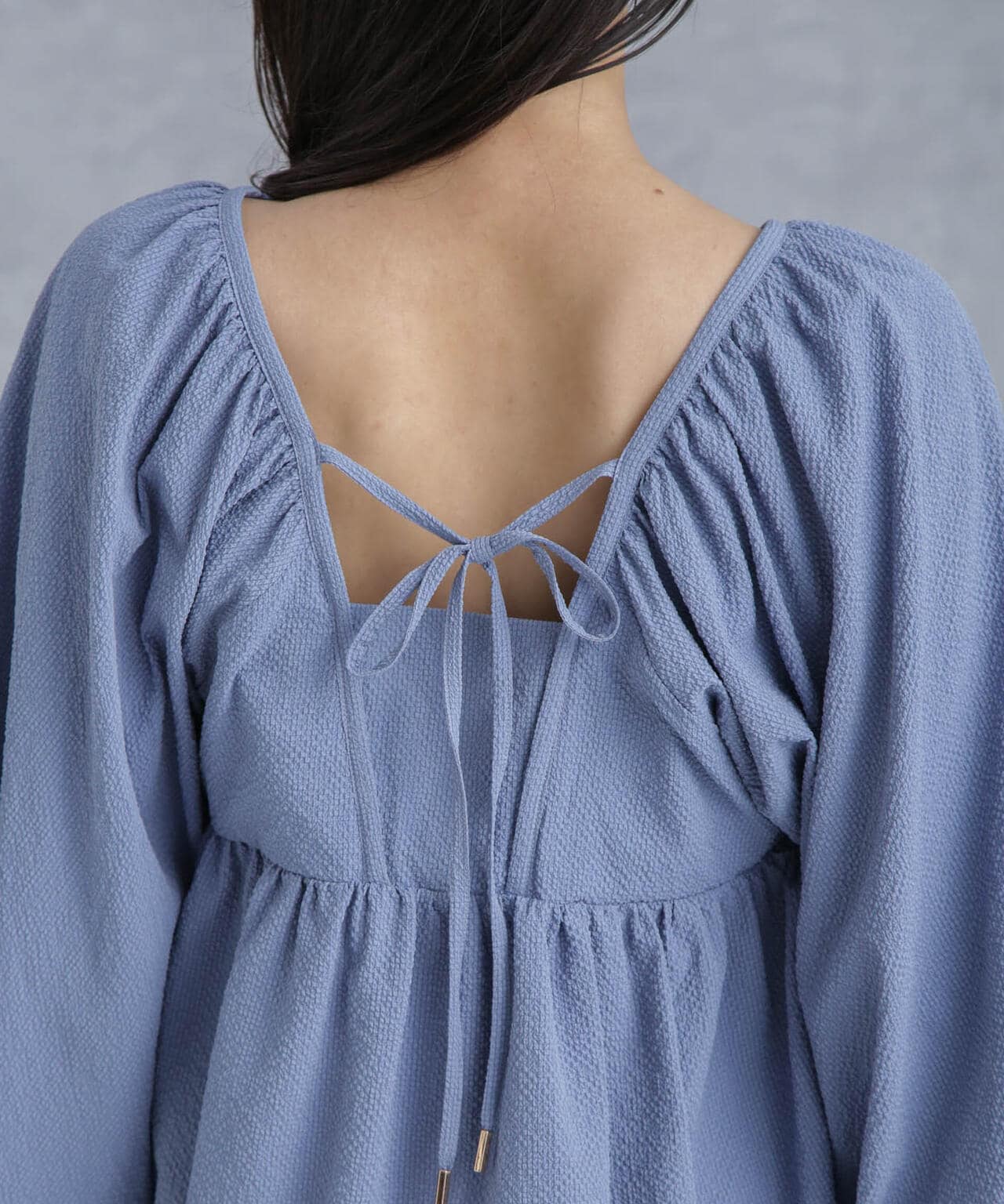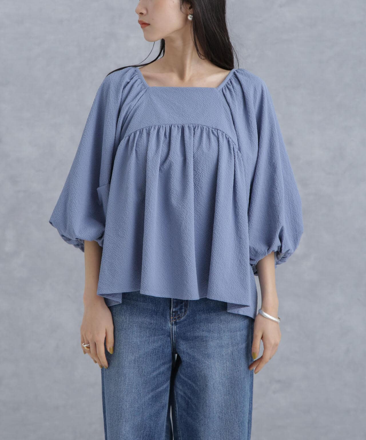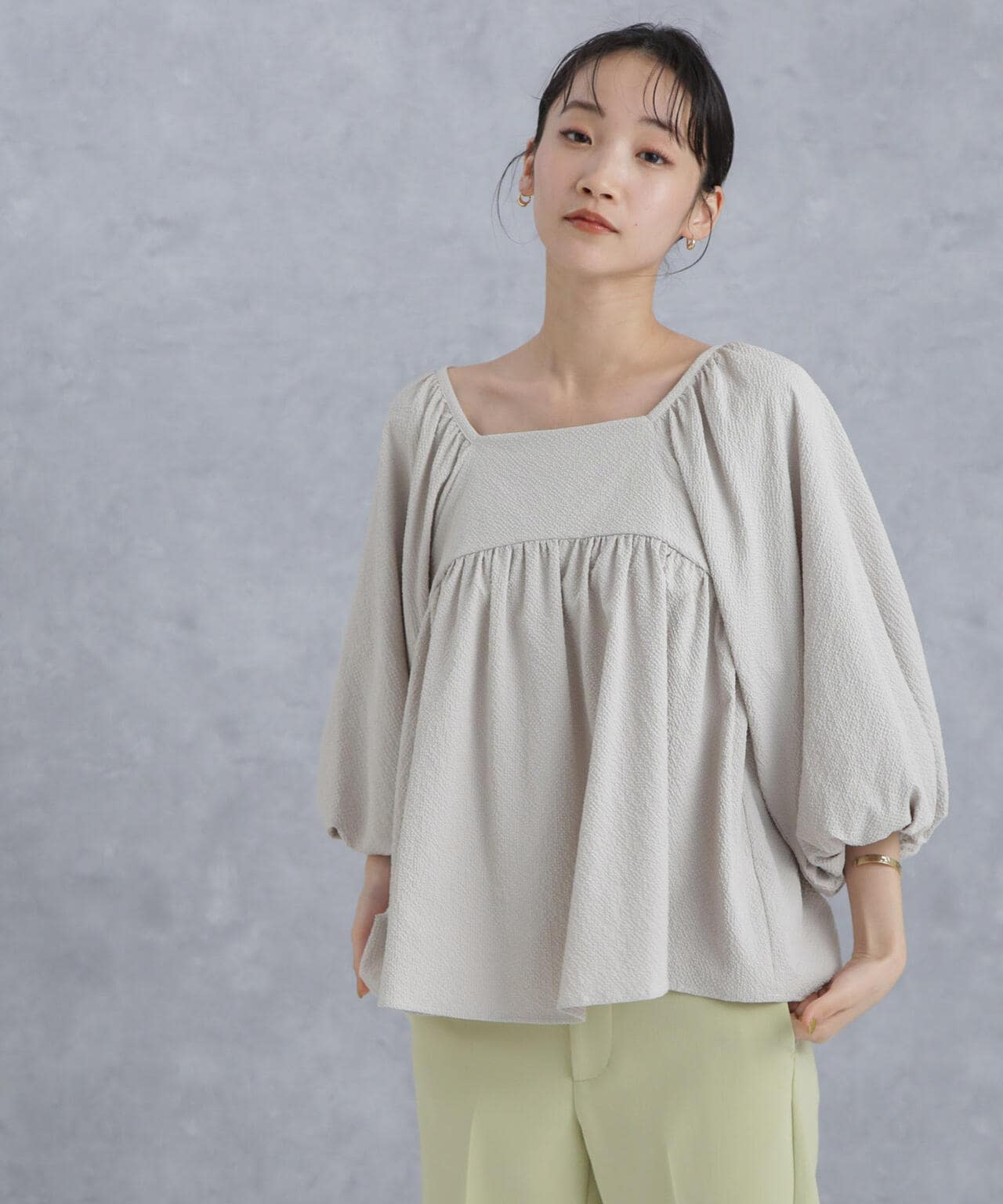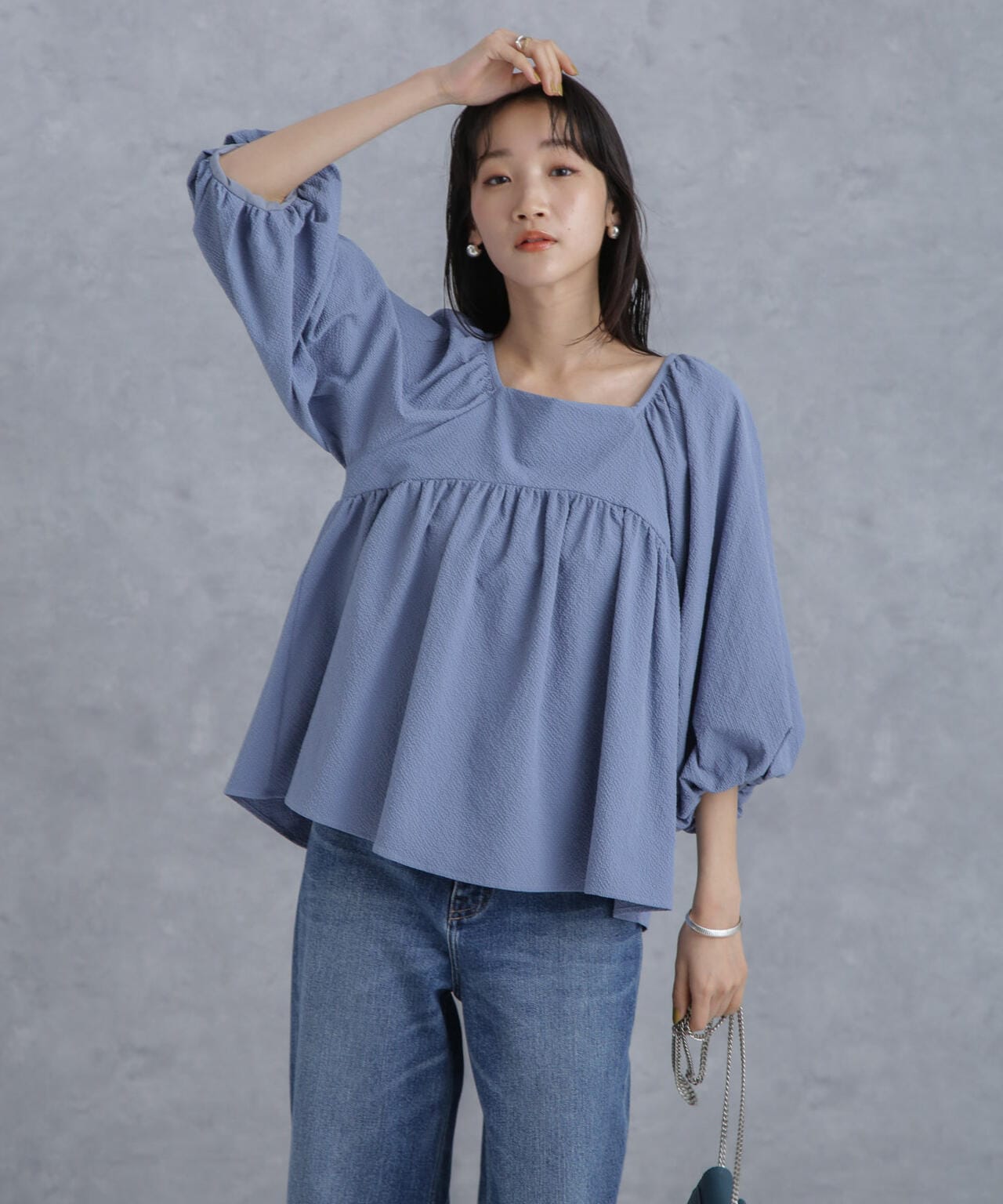 バックリボンが軽やかな印象のブラウス。ボリューム感のある袖とペプラム切り替えでふんわりさせたボディが女性らしいデザイン。すっきりとしたスクエアネックでデコルテがキレイに見えるのも嬉しいポイント◎。ボリュームのあるデザインなのでボトムはスッキリとしたコーディネートがおすすめの一枚です。