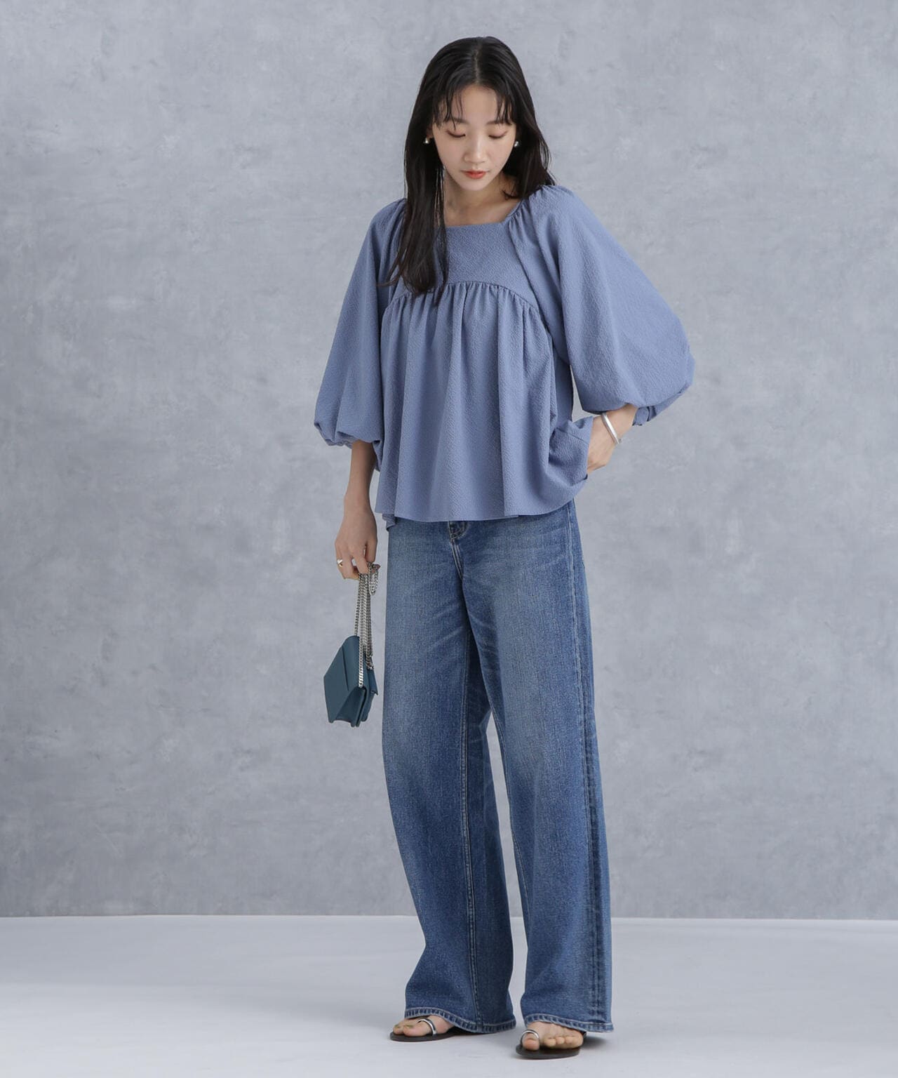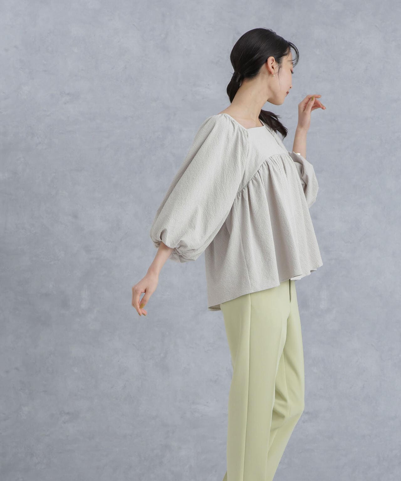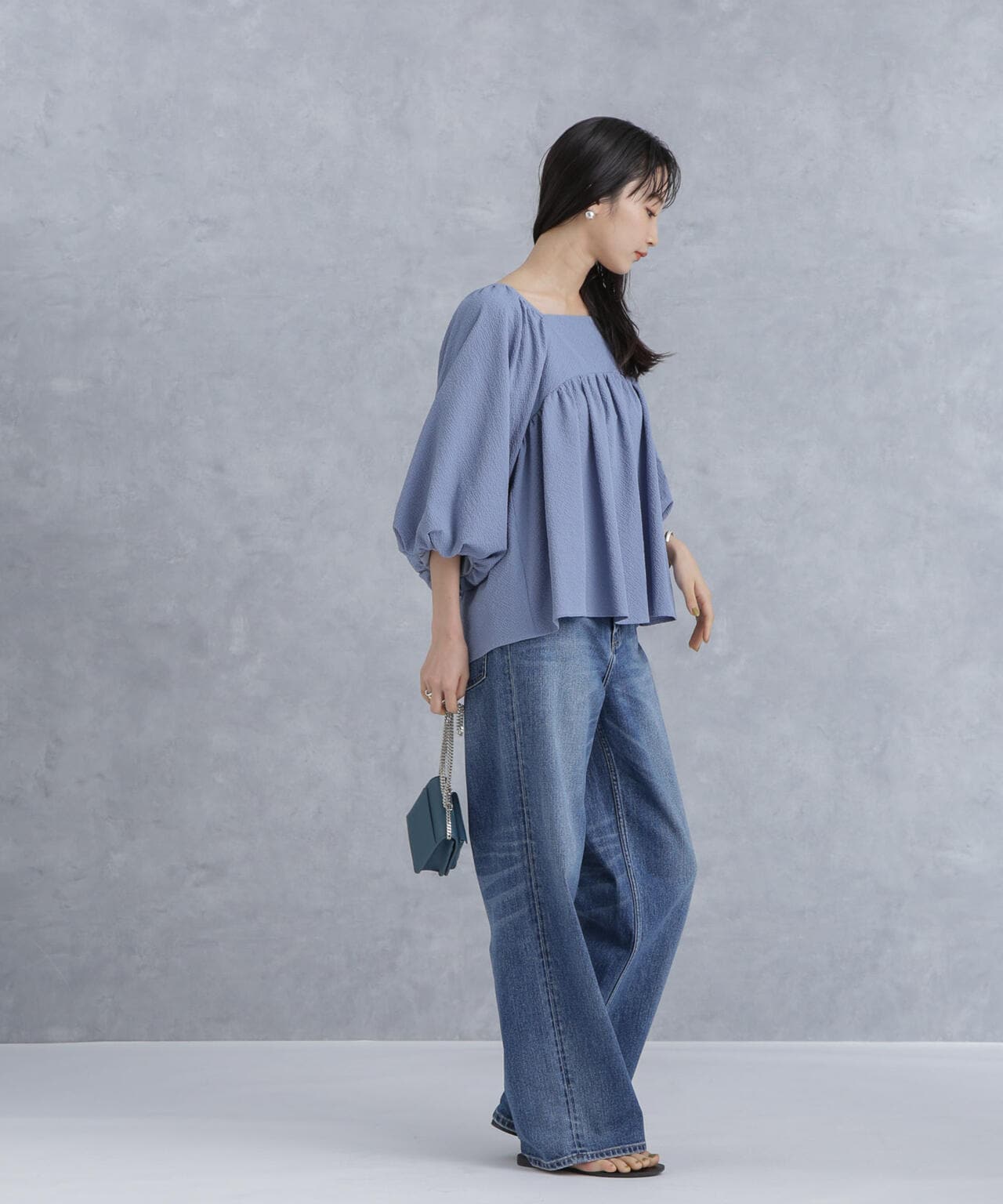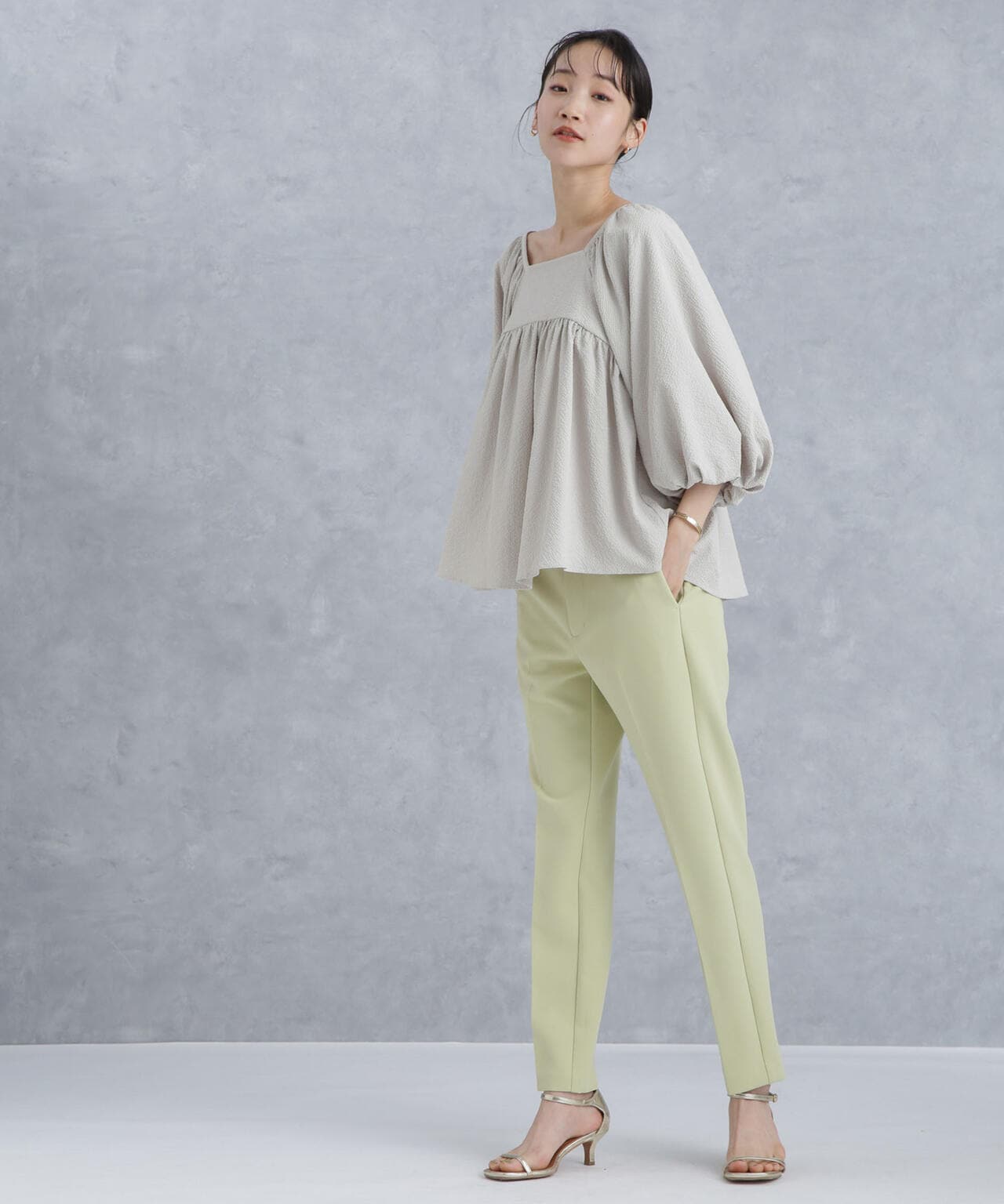バックリボンが軽やかな印象のブラウス。ボリューム感のある袖とペプラム切り替えでふんわりさせたボディが女性らしいデザイン。すっきりとしたスクエアネックでデコルテがキレイに見えるのも嬉しいポイント◎。ボリュームのあるデザインなのでボトムはスッキリとしたコーディネートがおすすめの一枚です。