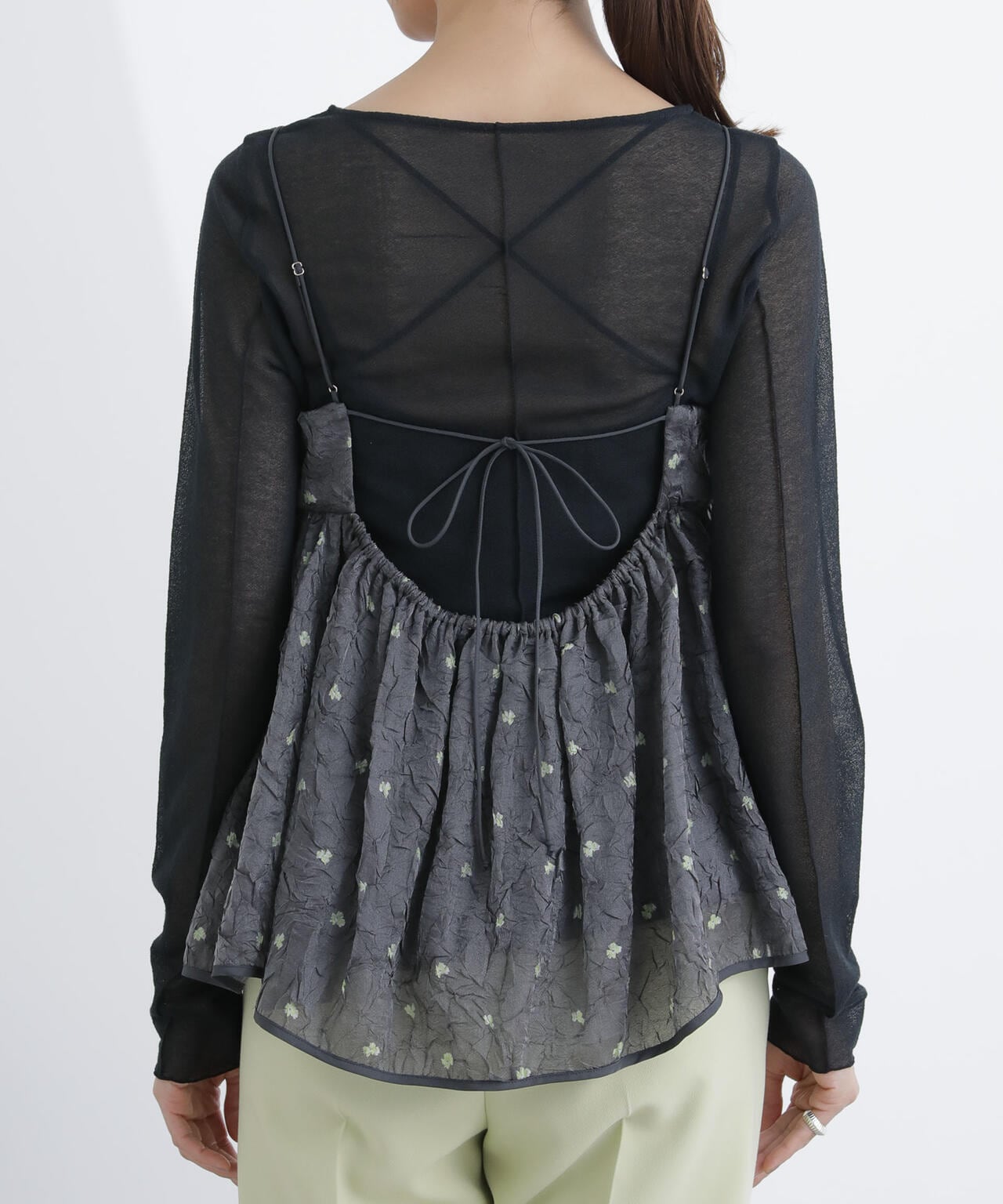 表面変化のあるシアープリント素材で仕立てたキャミソール。後ろがゴムギャザーディティールで、バックシャンな背中の開きデザインもポイント。合わせるアイテム次第でオールシーズン着用可能な素材感で、様々なコーデがお楽しみいただけるひと品です。