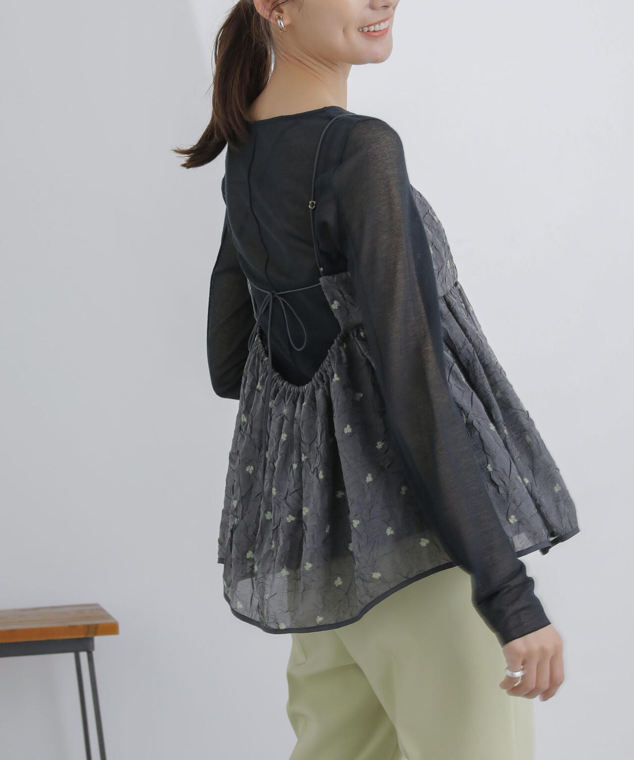 オールシーズン活躍する表情豊かな素材。ゴムギャザーディテールと背中の開きデザインがポイント。おしゃれな春コーデにぴったりなアイテムです。