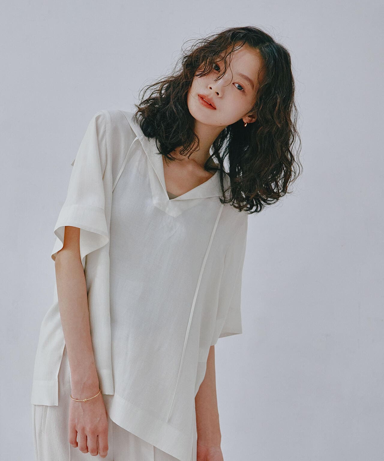 大人見えするサテン地を使用したセーラーカラーのブラウス。衿は大きく折り返したセーラーで、衿端についているリボンは垂らして着ていただくデザイン。カジュアル感のあるやや広がった半袖やオーバーサイズのシルエットながらキレイな印象のサテン素材を使用しているので大人見えする一枚。トラックパンツに合わせた大人カジュアルなスタイリングがおすすめです!