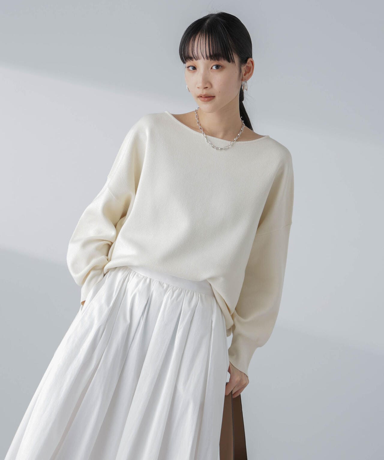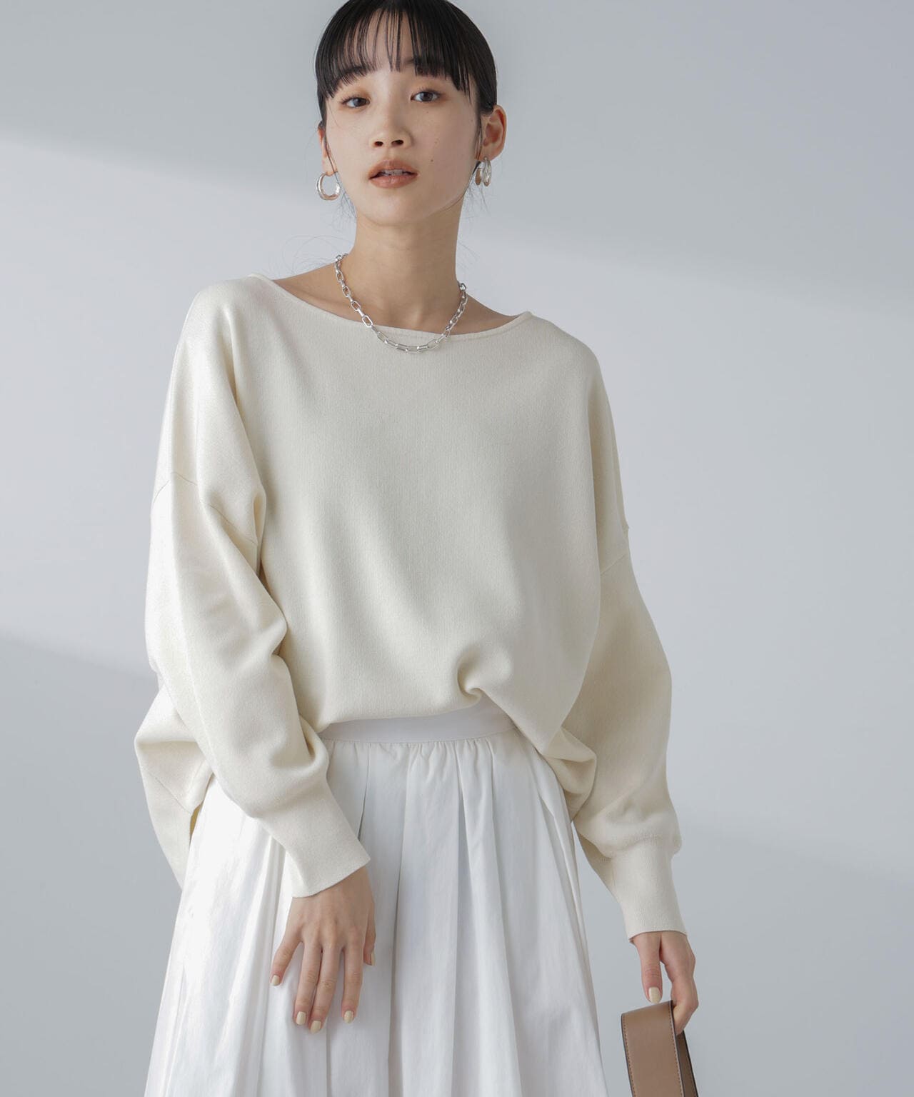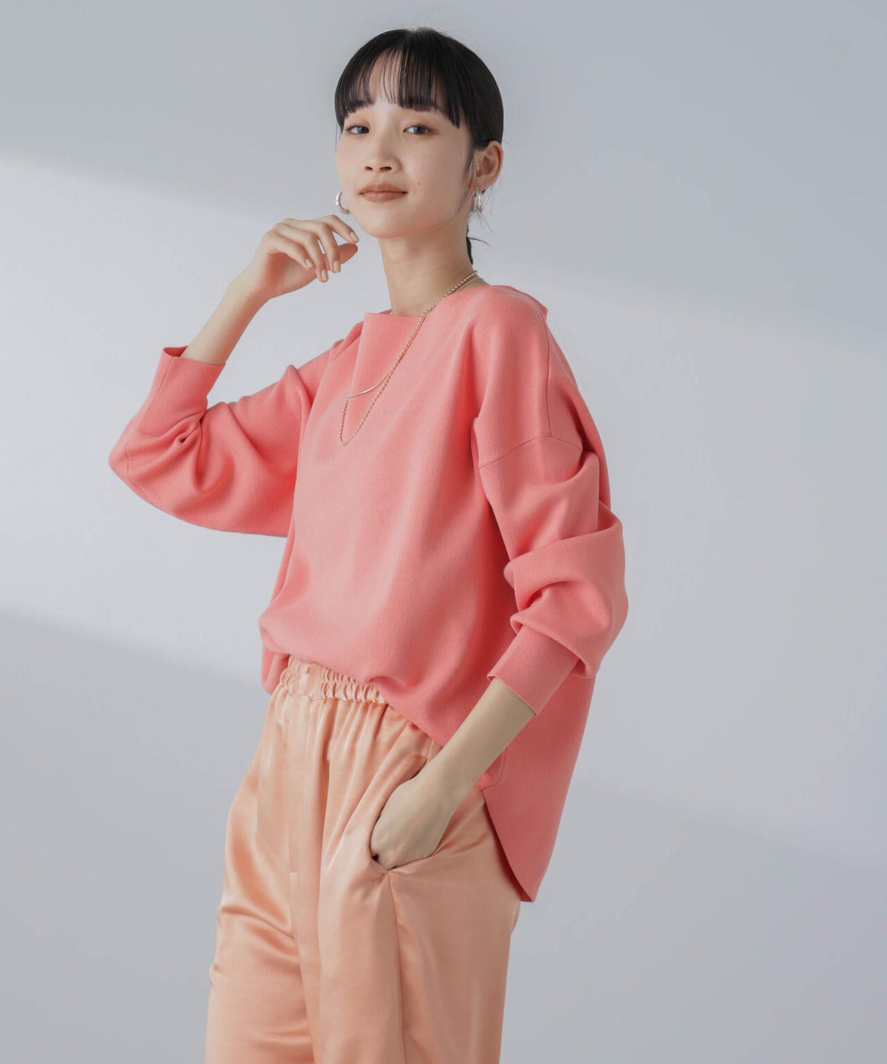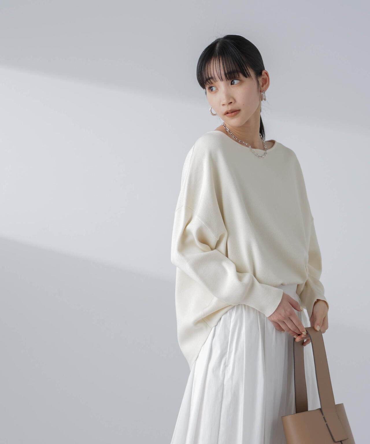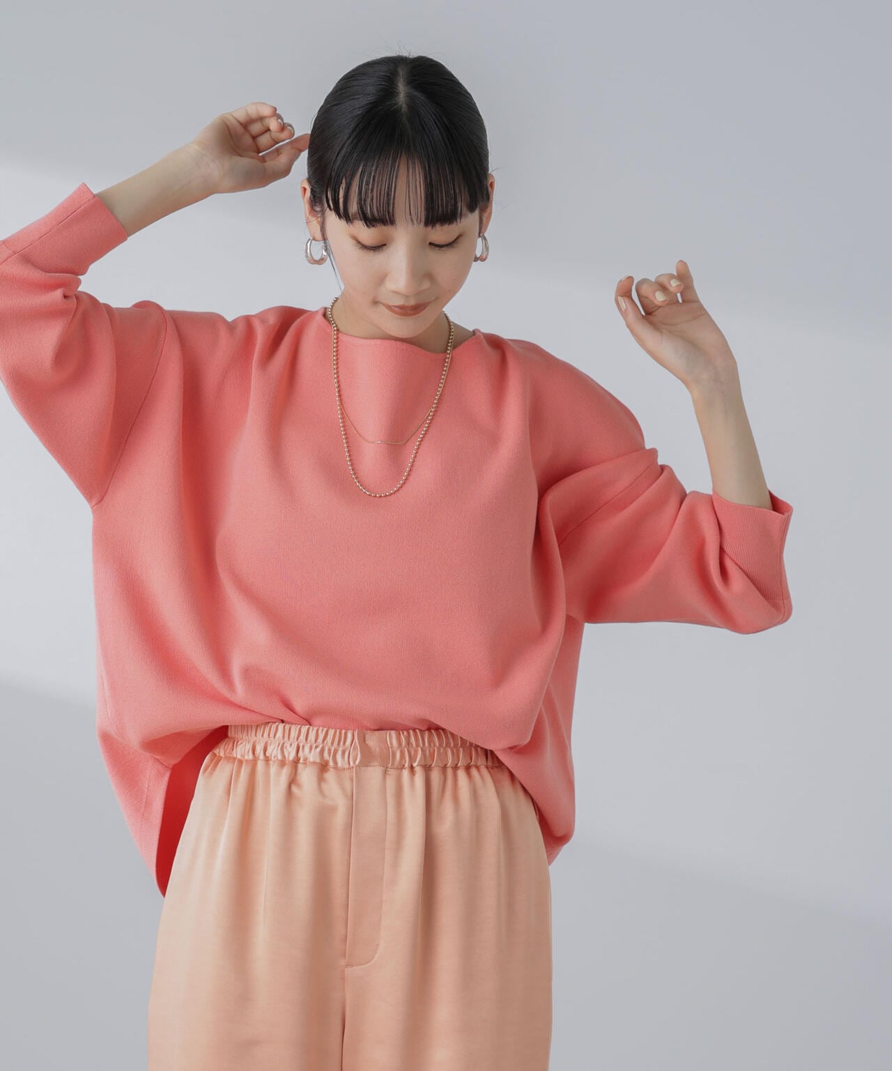 柔らかな雰囲気のあるスムース編みのニットプルオーバー。ニュアンス感のある着こなしが叶うゆとりのあるワイドシルエットに、ネックラインは細いパイピングで上品に仕上げました。女性らしさを引き出してくれる優しいカラーリングで、中にタートルを合わせるレイヤードも素敵です。