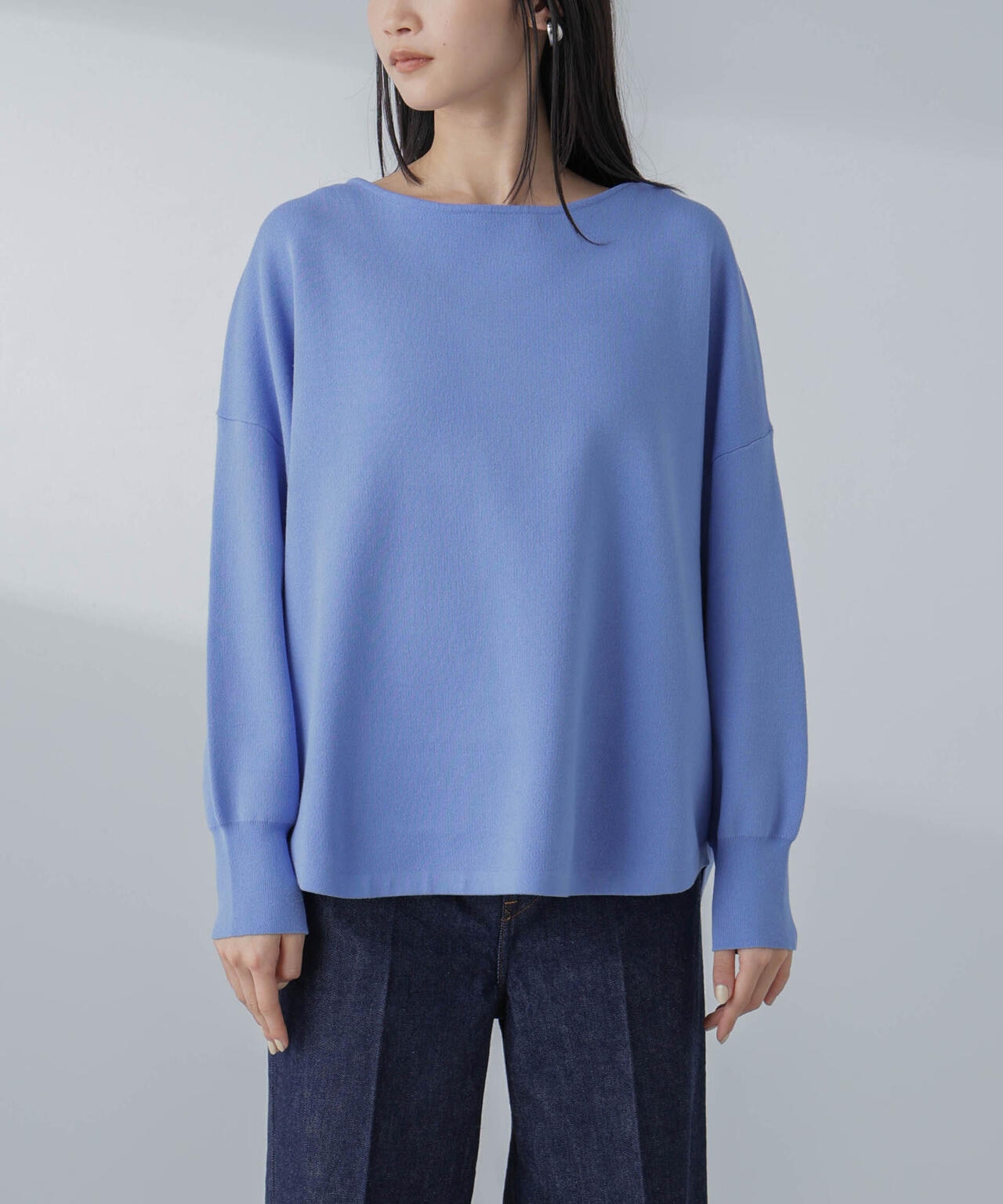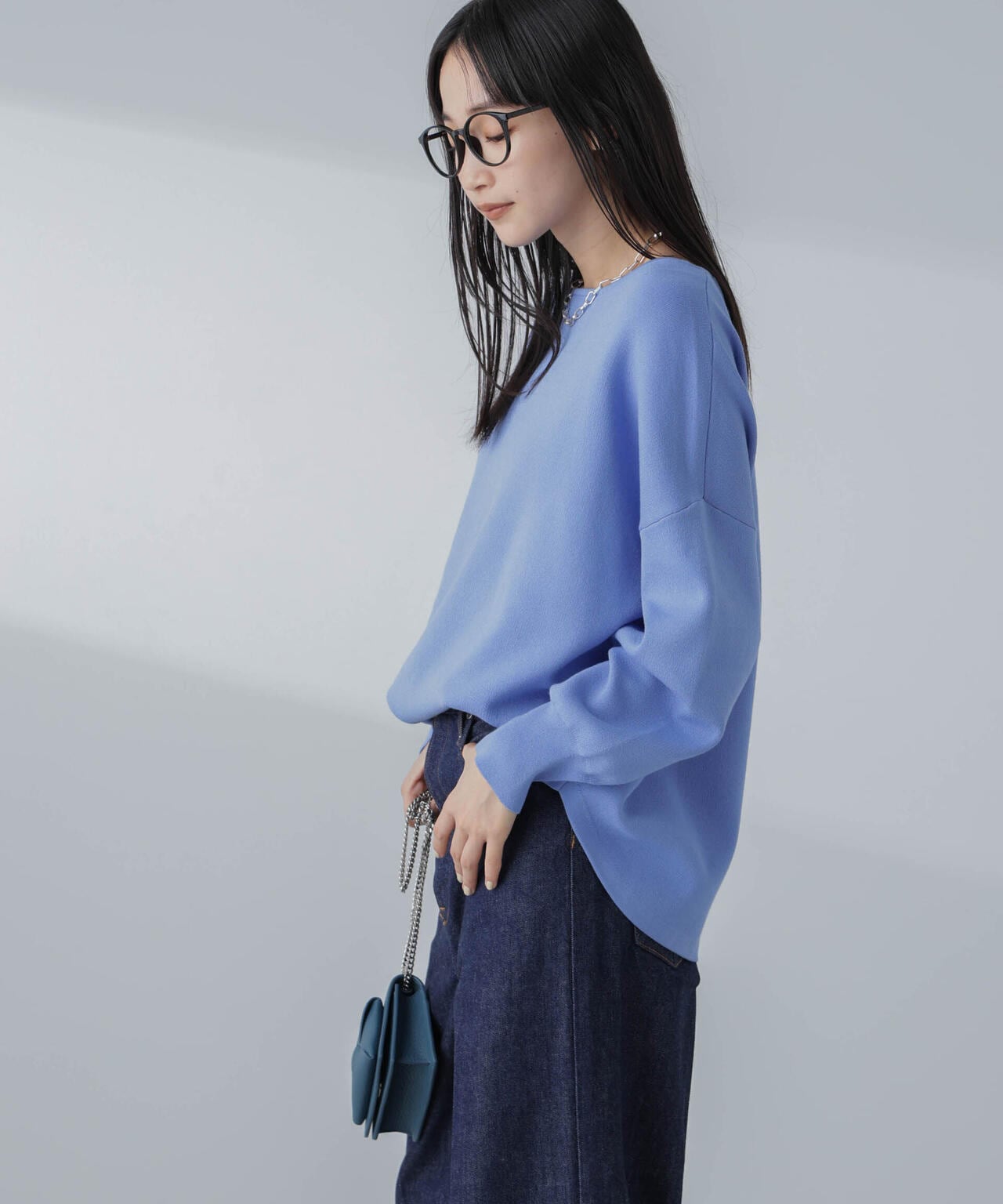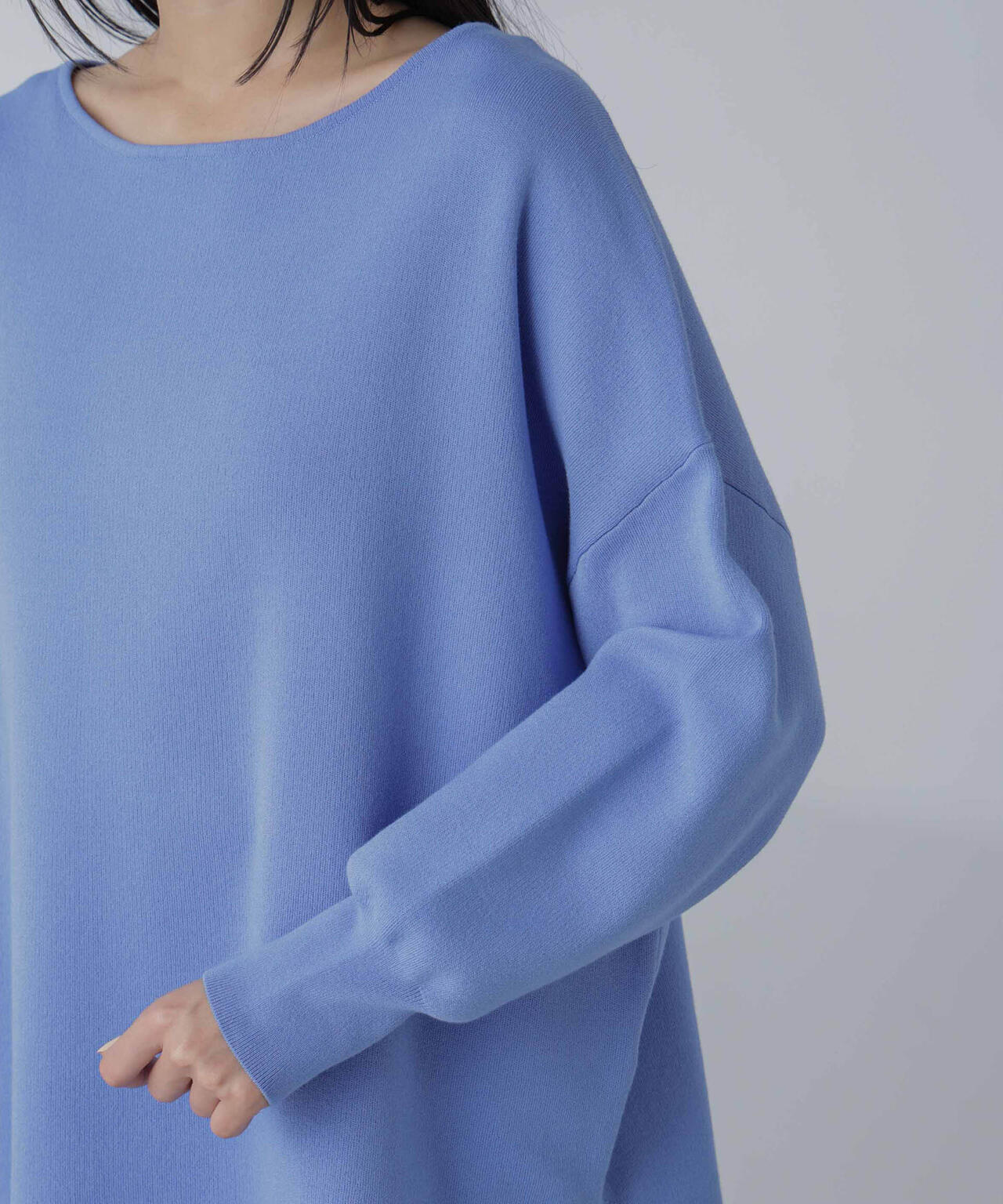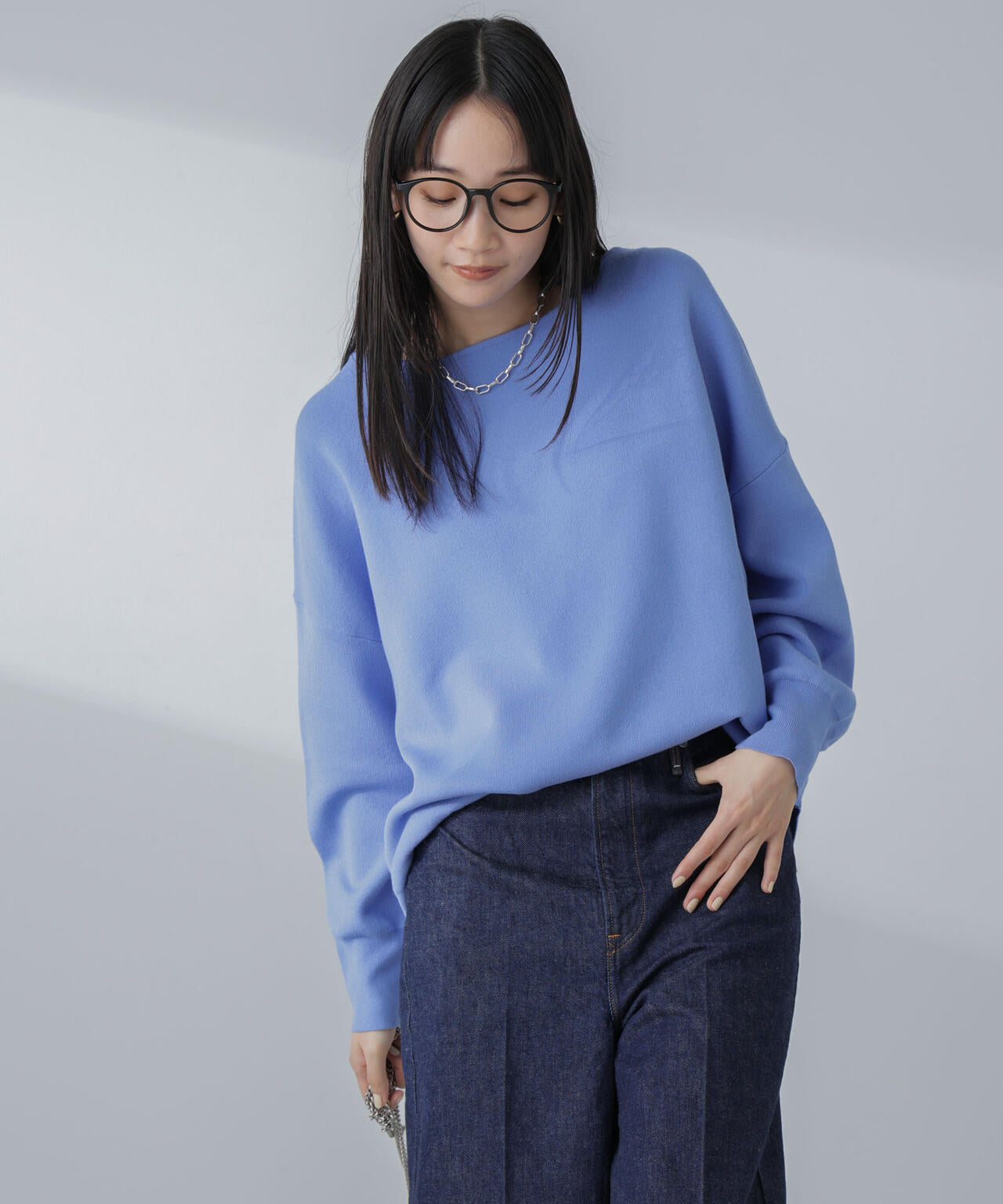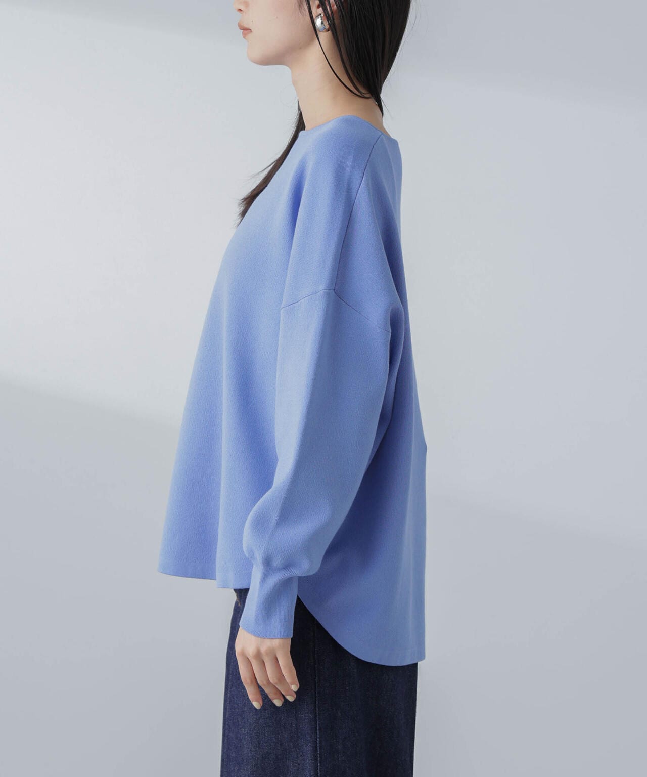 柔らかな雰囲気のあるスムース編みのニットプルオーバー。ニュアンス感のある着こなしが叶うゆとりのあるワイドシルエットに、ネックラインは細いパイピングで上品に仕上げました。女性らしさを引き出してくれる優しいカラーリングで、中にタートルを合わせるレイヤードも素敵です。