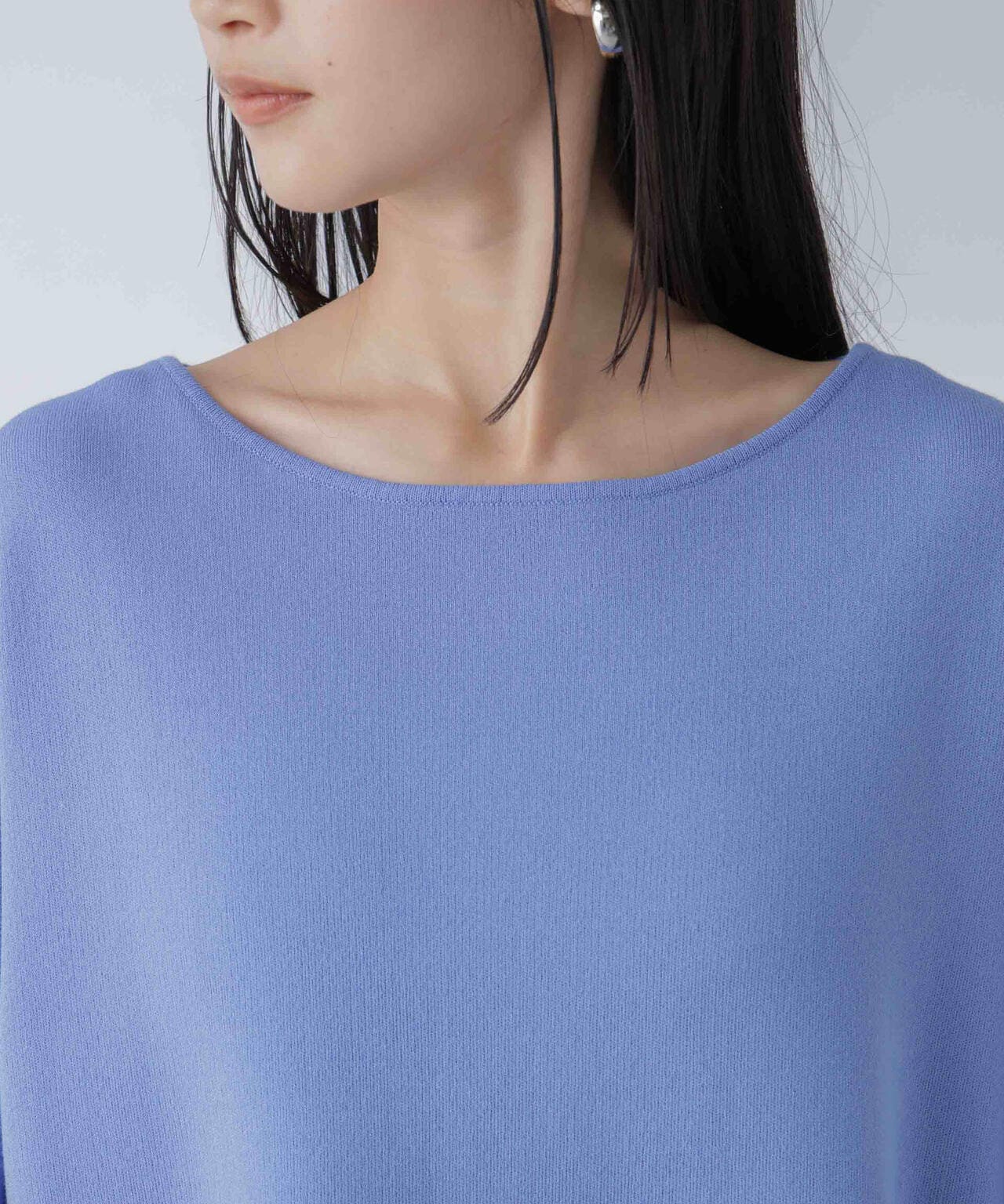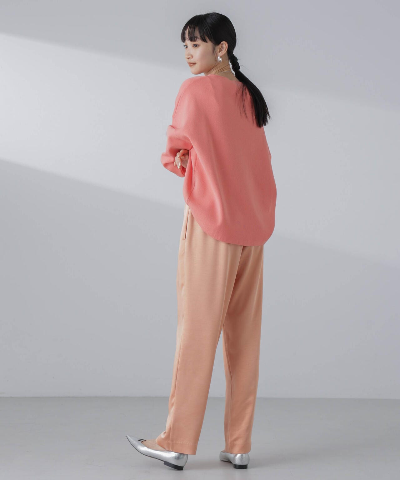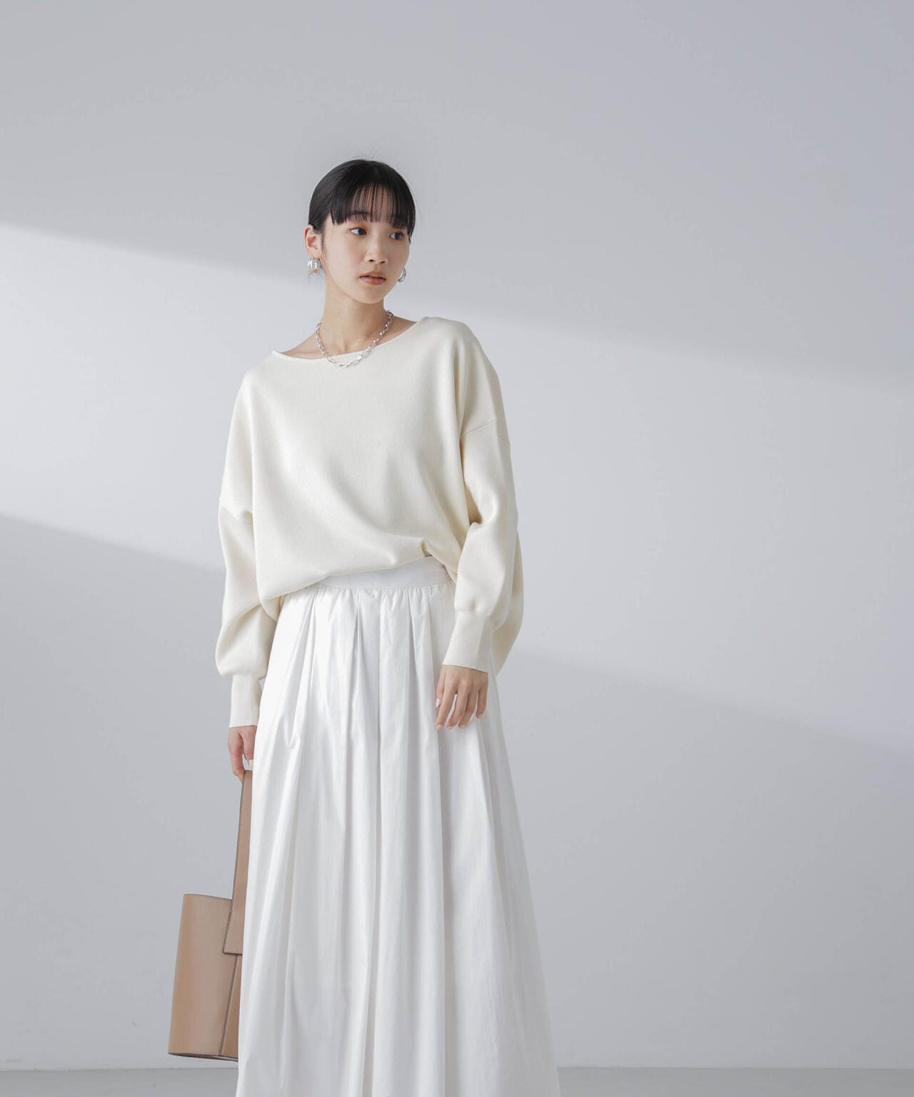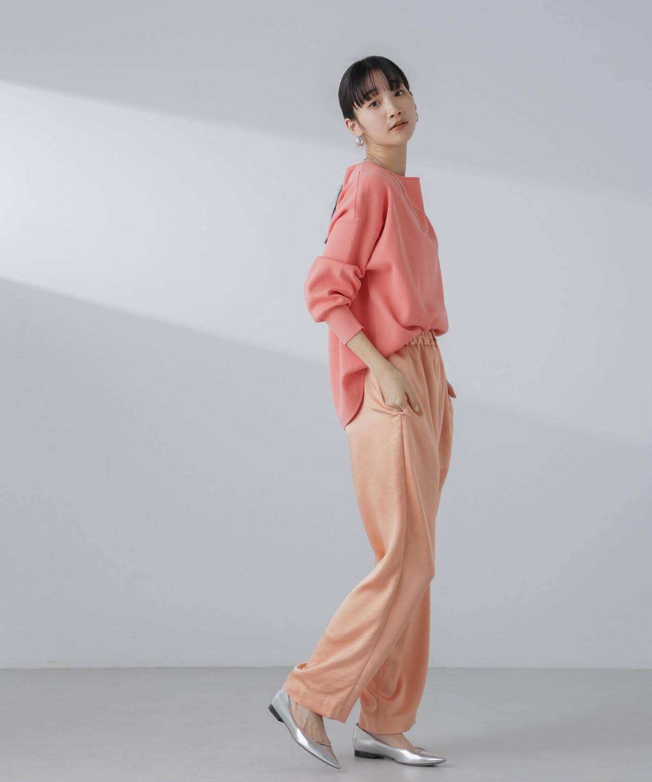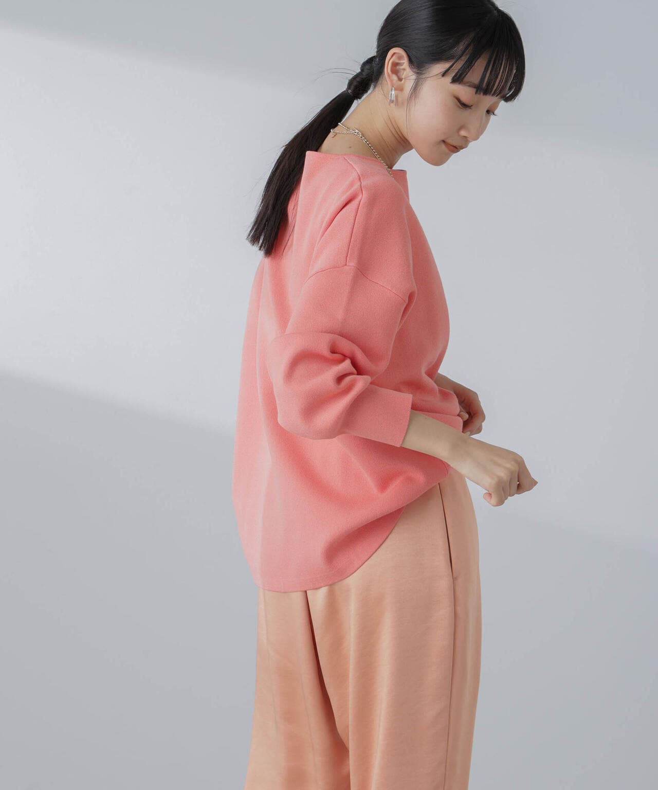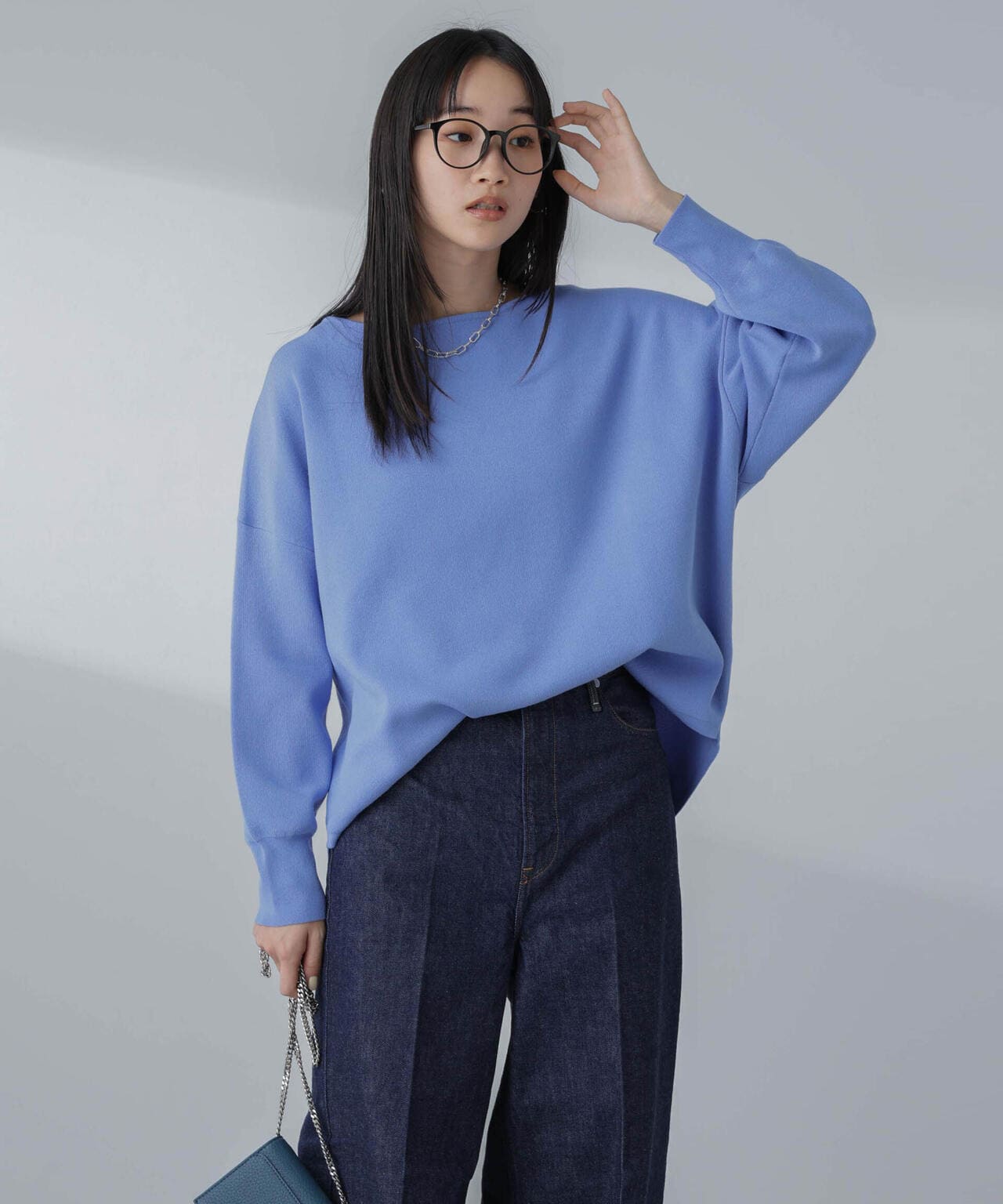 柔らかな雰囲気のあるスムース編みのニットプルオーバー。ニュアンス感のある着こなしが叶うゆとりのあるワイドシルエットに、ネックラインは細いパイピングで上品に仕上げました。女性らしさを引き出してくれる優しいカラーリングで、中にタートルを合わせるレイヤードも素敵です。