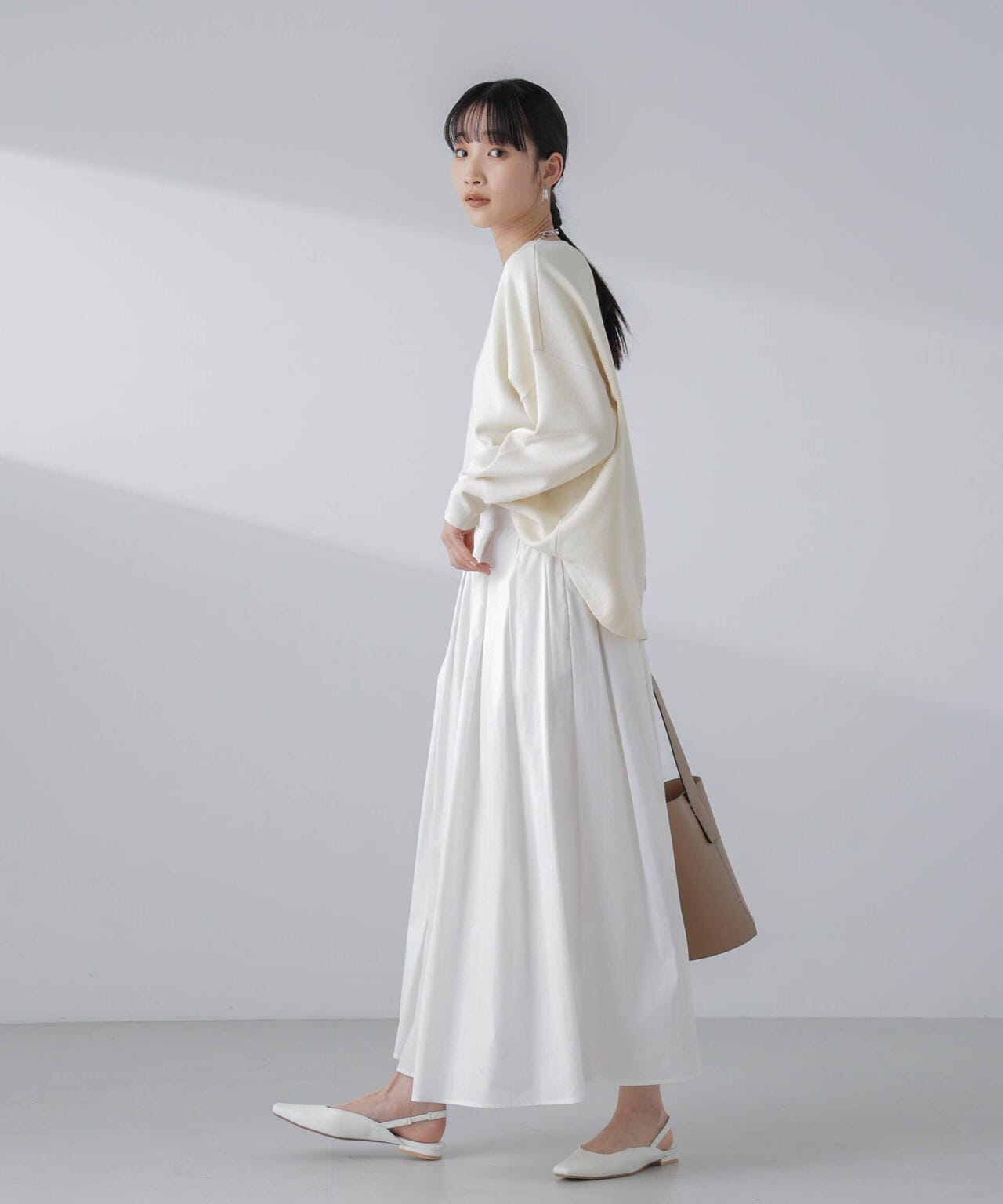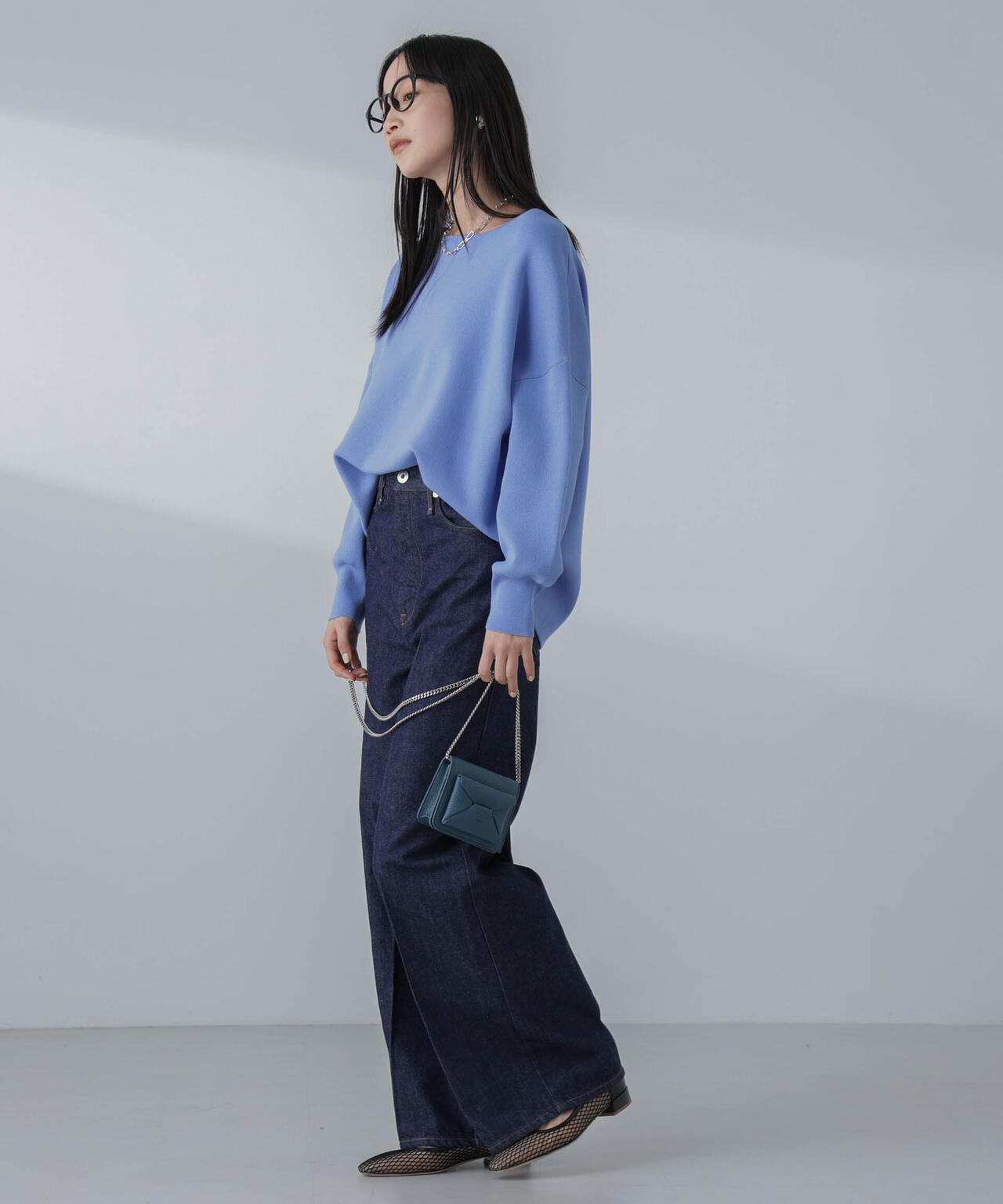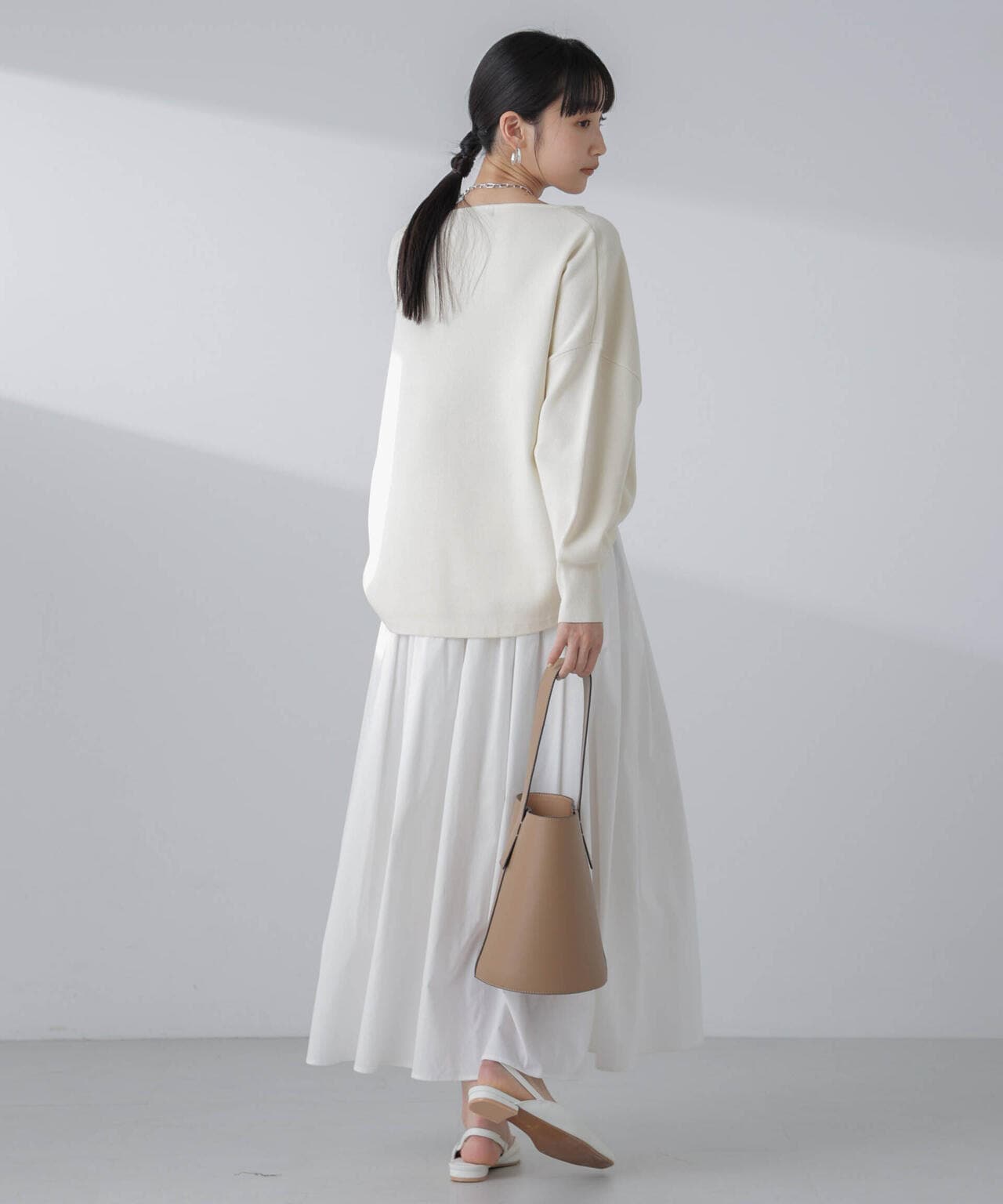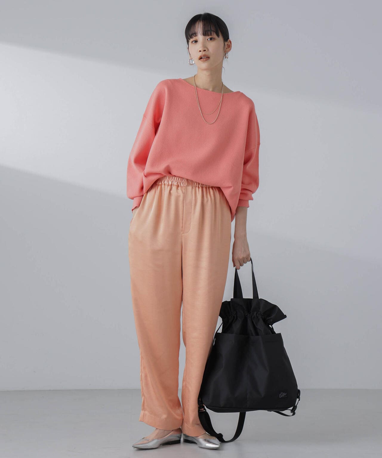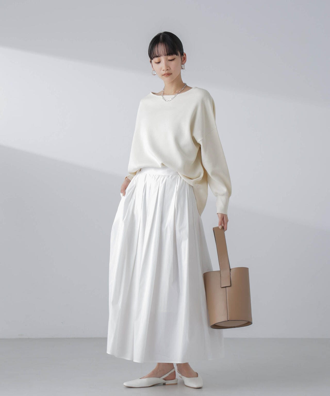 柔らかな雰囲気のあるスムース編みのニットプルオーバー。ニュアンス感のある着こなしが叶うゆとりのあるワイドシルエットに、ネックラインは細いパイピングで上品に仕上げました。女性らしさを引き出してくれる優しいカラーリングで、中にタートルを合わせるレイヤードも素敵です。