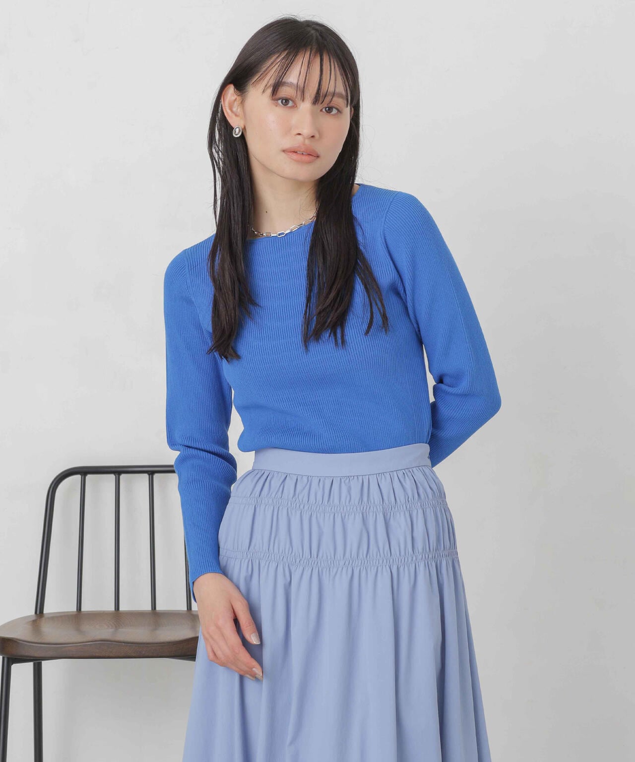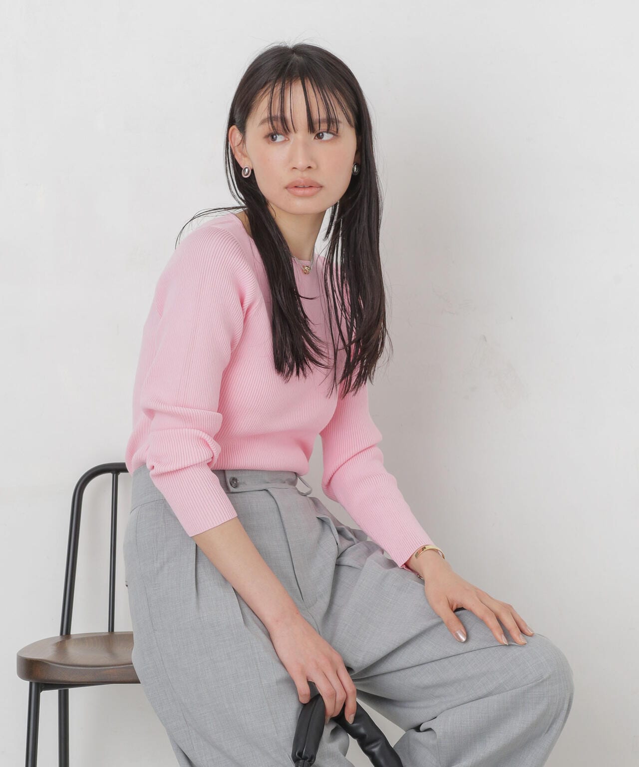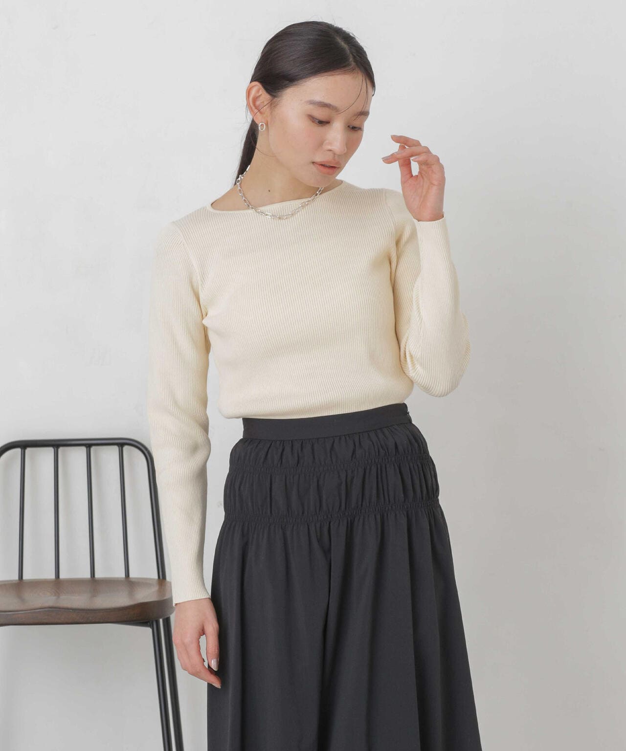 さらっとしたタッチで優しいフィット感が魅力のリブニットトップス。ボートネックで顔周りはスッキリとした印象に。リブ仕様と身体のラインを拾いすぎない程よい細身のシルエットで、女性らしく着こなせる一枚。コンパクトなデザインなので、これからのシーズンにジャケットのインナーとして大活躍します。
