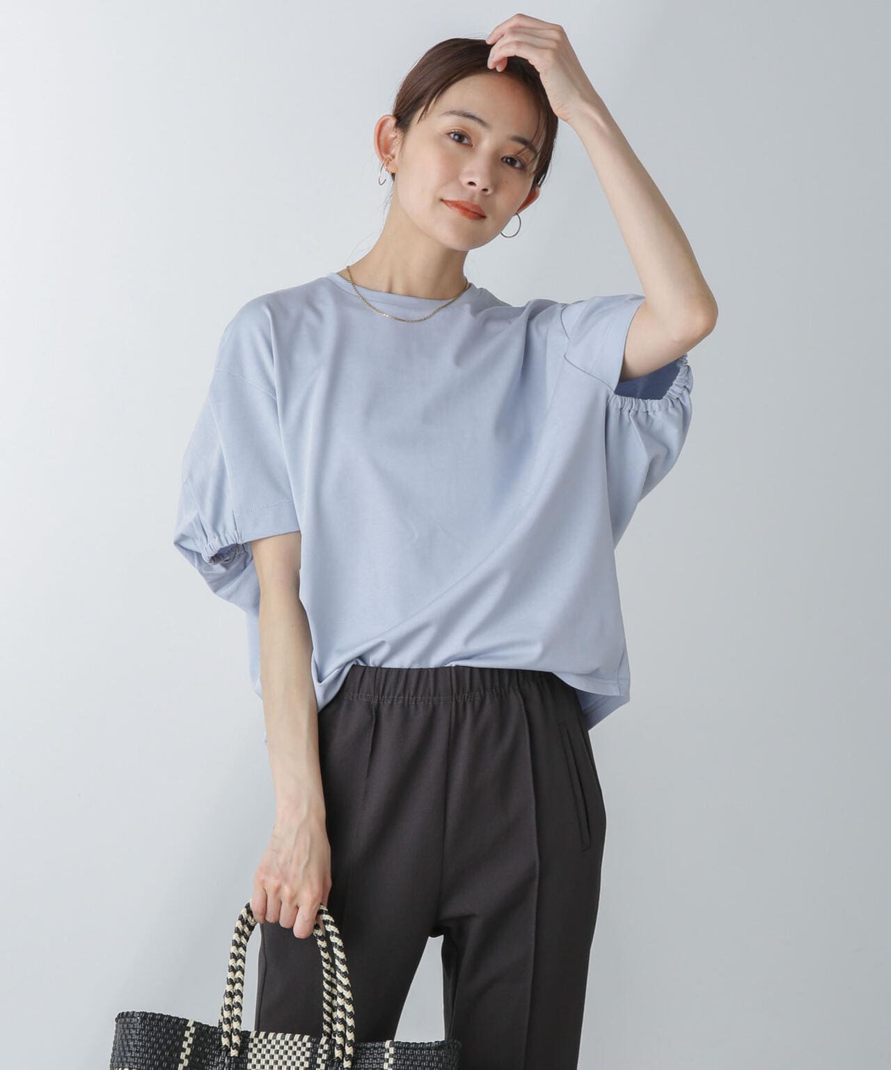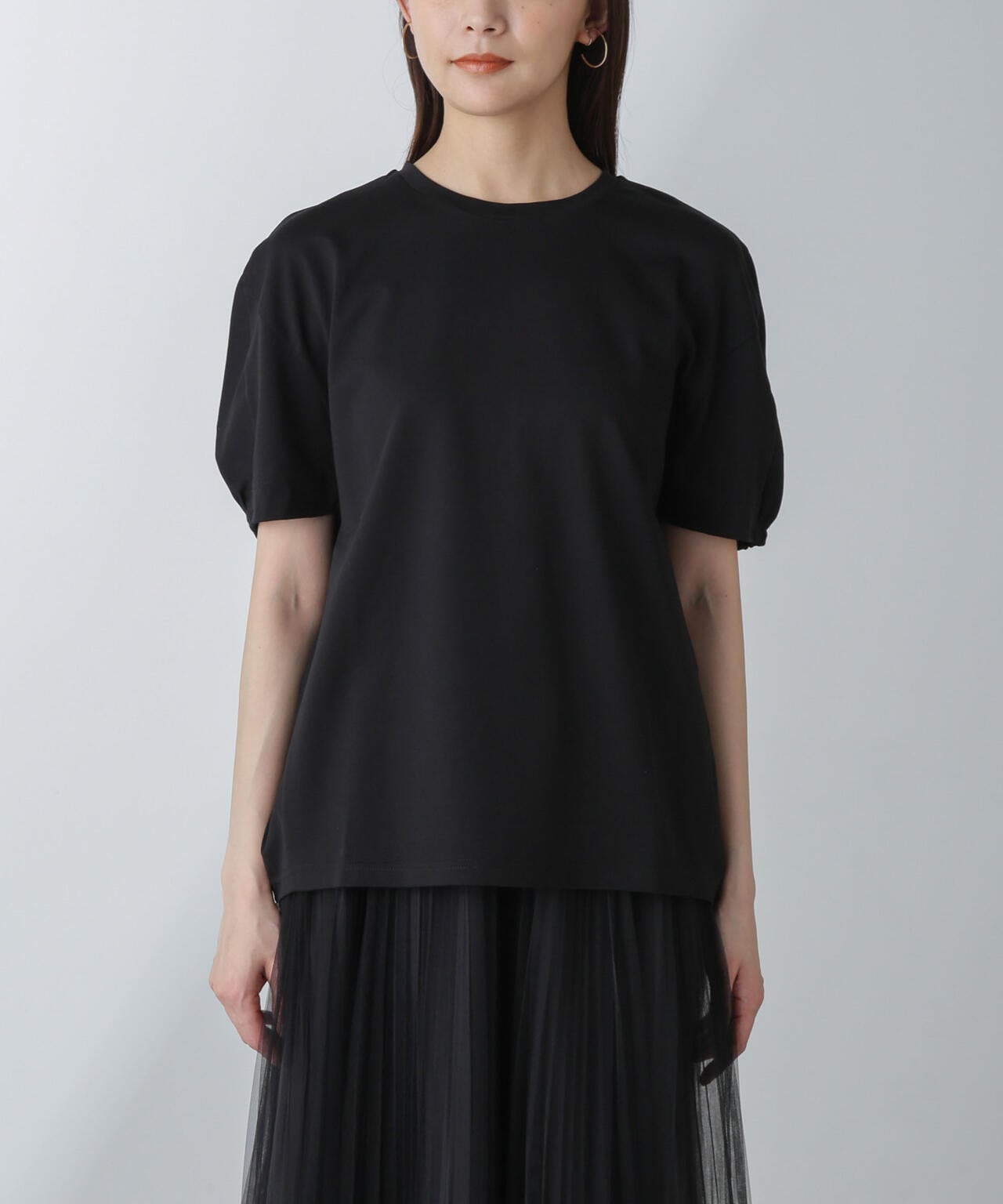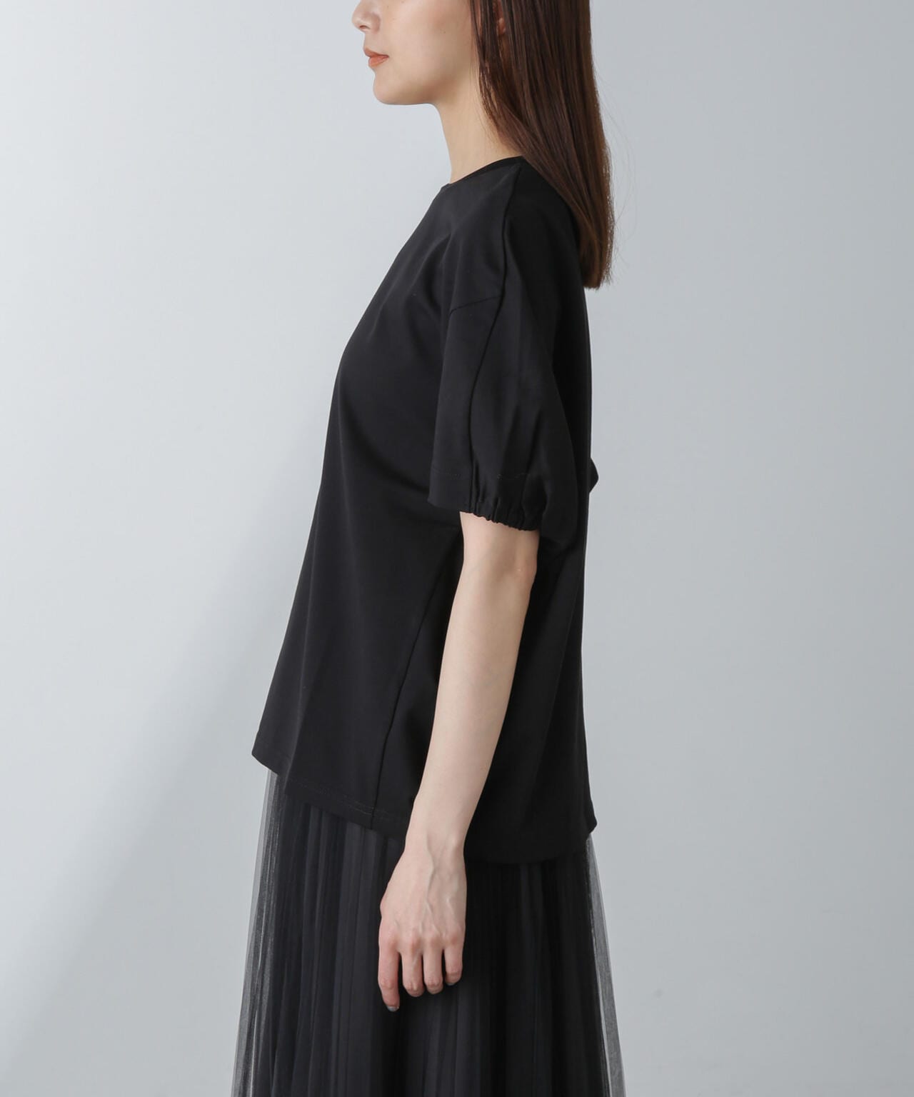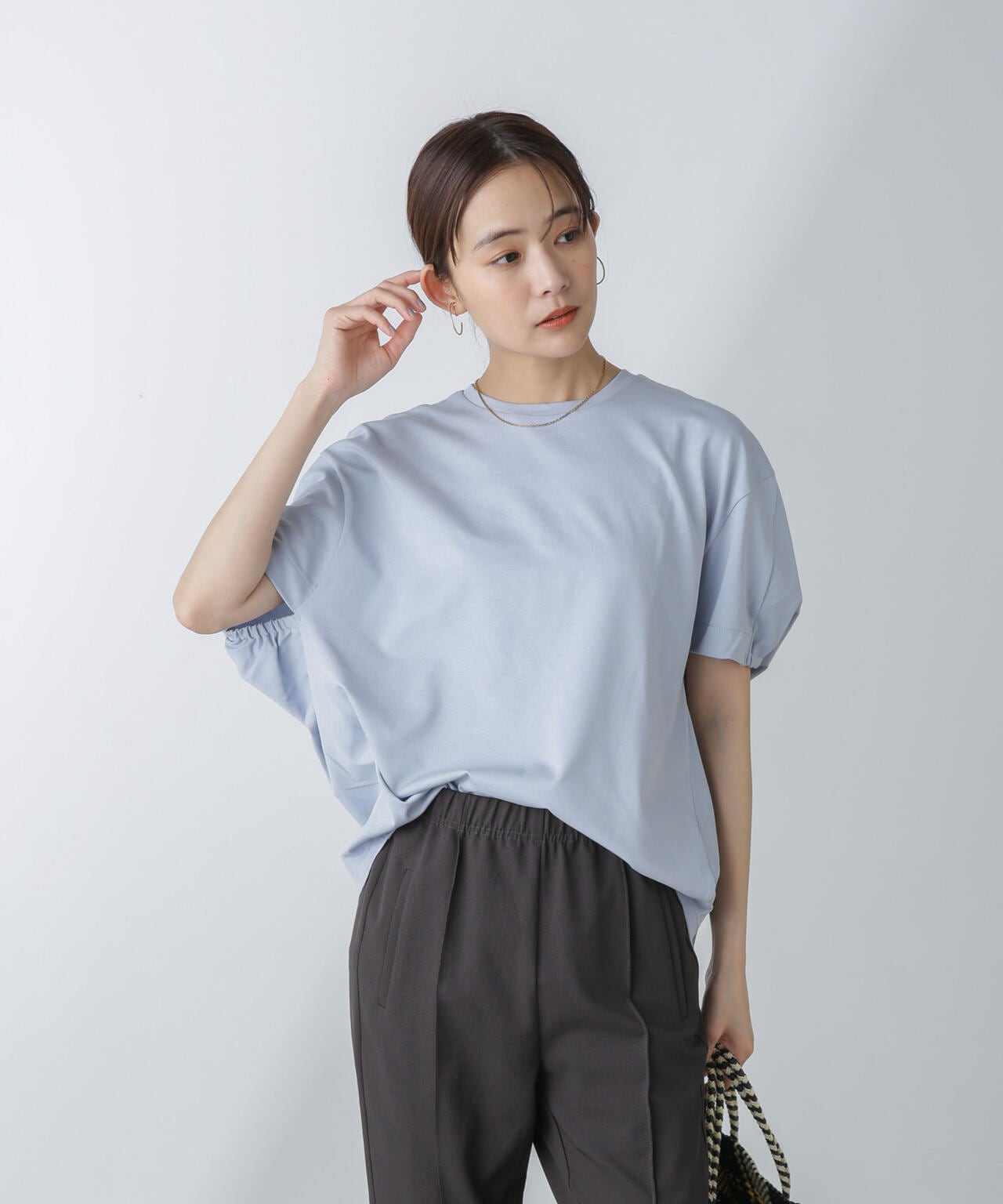 袖のフォルムデザインが魅力なカットトップス。フロントはシンプルな袖ながら、後ろはゴムでギャザーを入れた袖口でコクーンのような膨らみのあるシルエットが特徴。ハリ感のあるやや厚手の素材なので、透け感もなくオンスタイルにも最適な一枚。シンプルながらも、フォルムに特徴があるのでサラッと着ても様になるデザイン性の高いアイテムです!