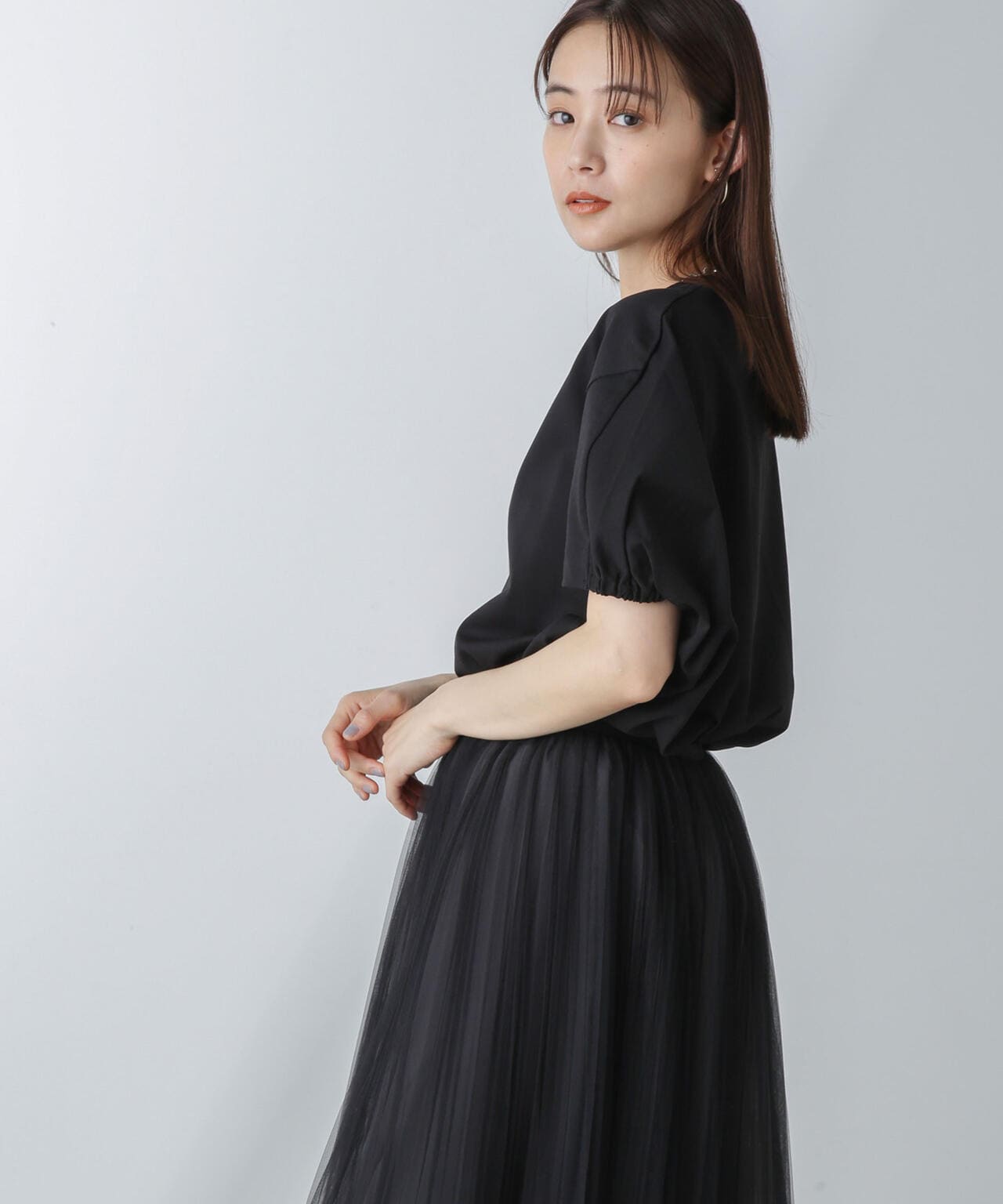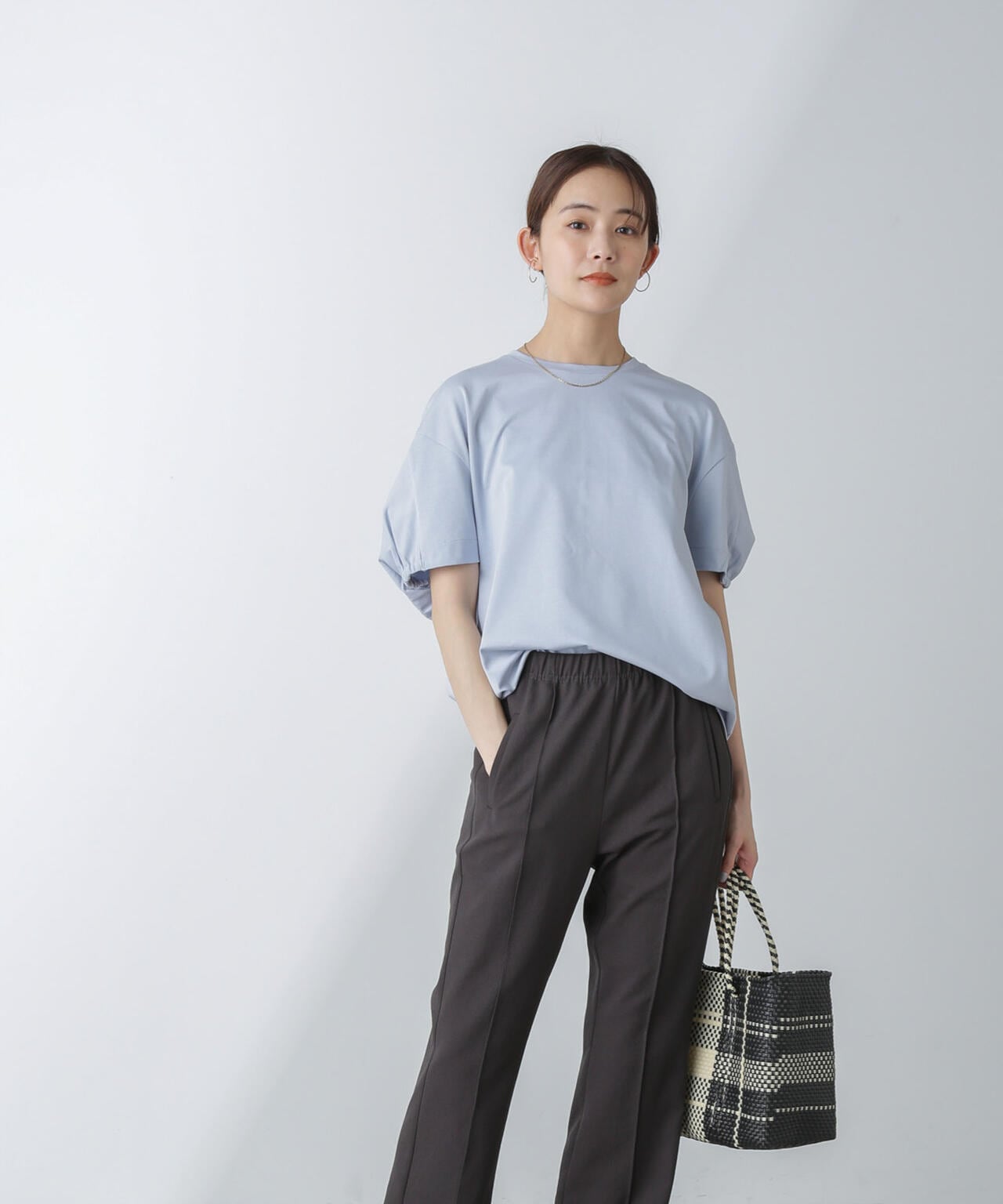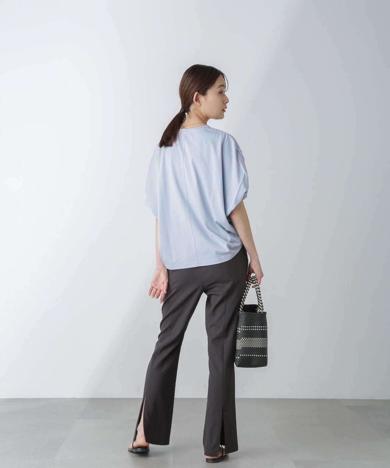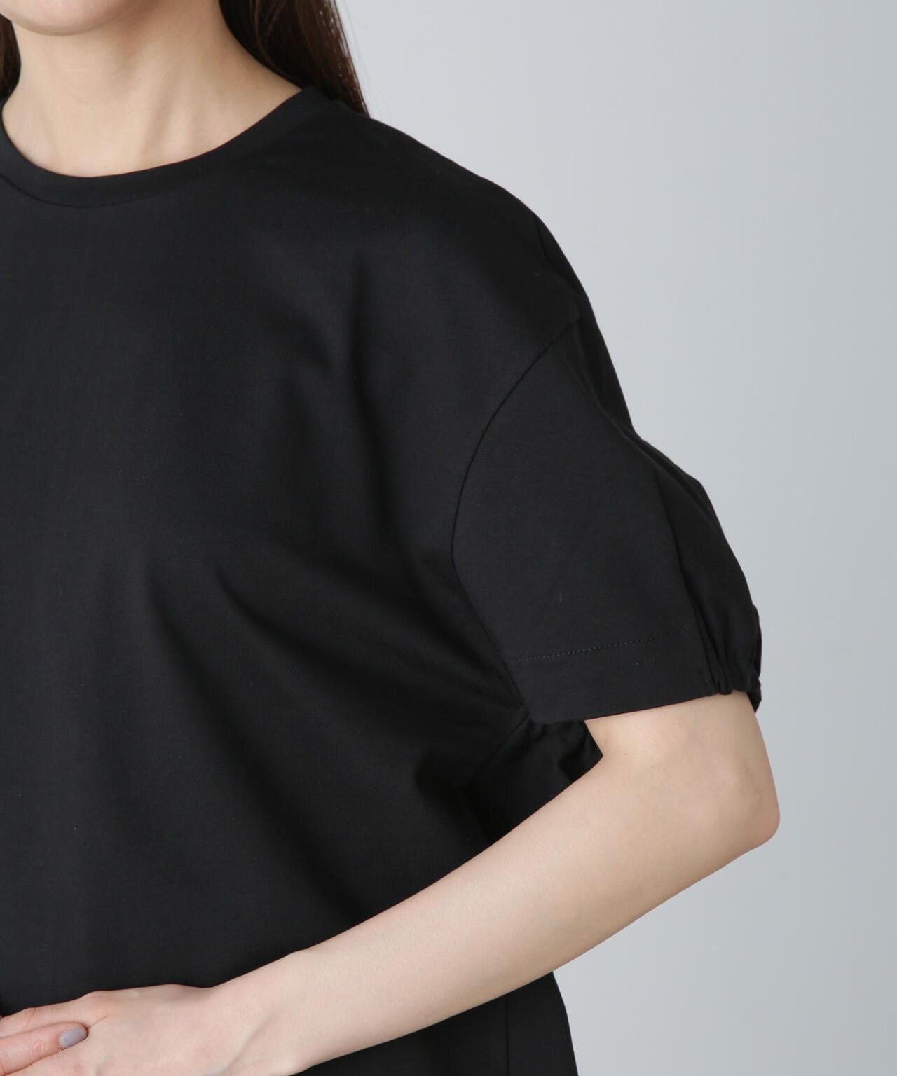 袖のフォルムデザインが魅力なカットトップス。フロントはシンプルな袖ながら、後ろはゴムでギャザーを入れた袖口でコクーンのような膨らみのあるシルエットが特徴。ハリ感のあるやや厚手の素材なので、透け感もなくオンスタイルにも最適な一枚。シンプルながらも、フォルムに特徴があるのでサラッと着ても様になるデザイン性の高いアイテムです!
