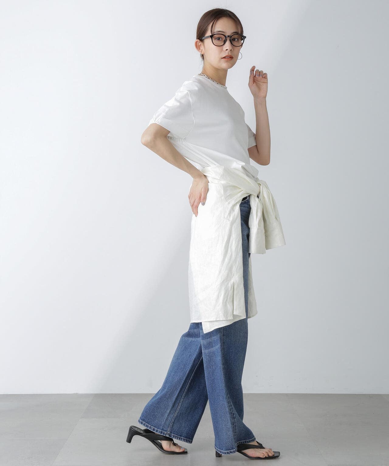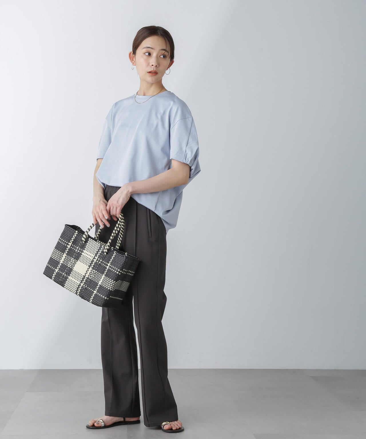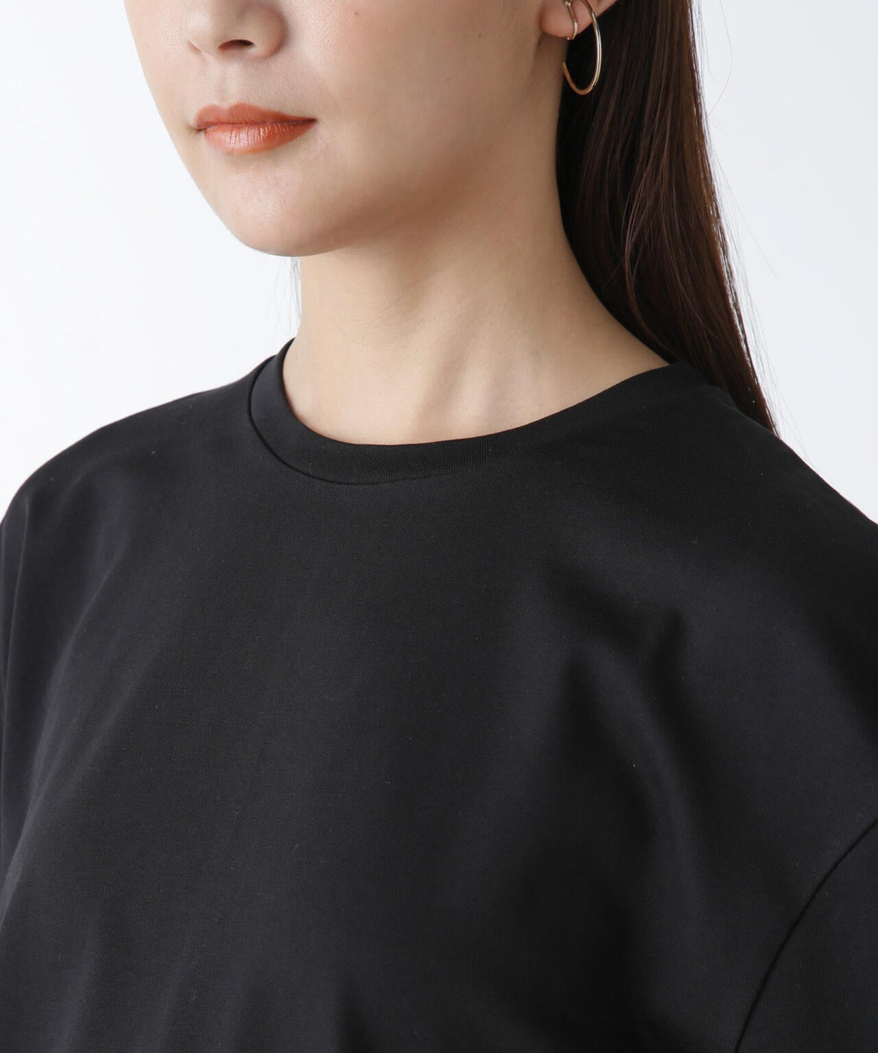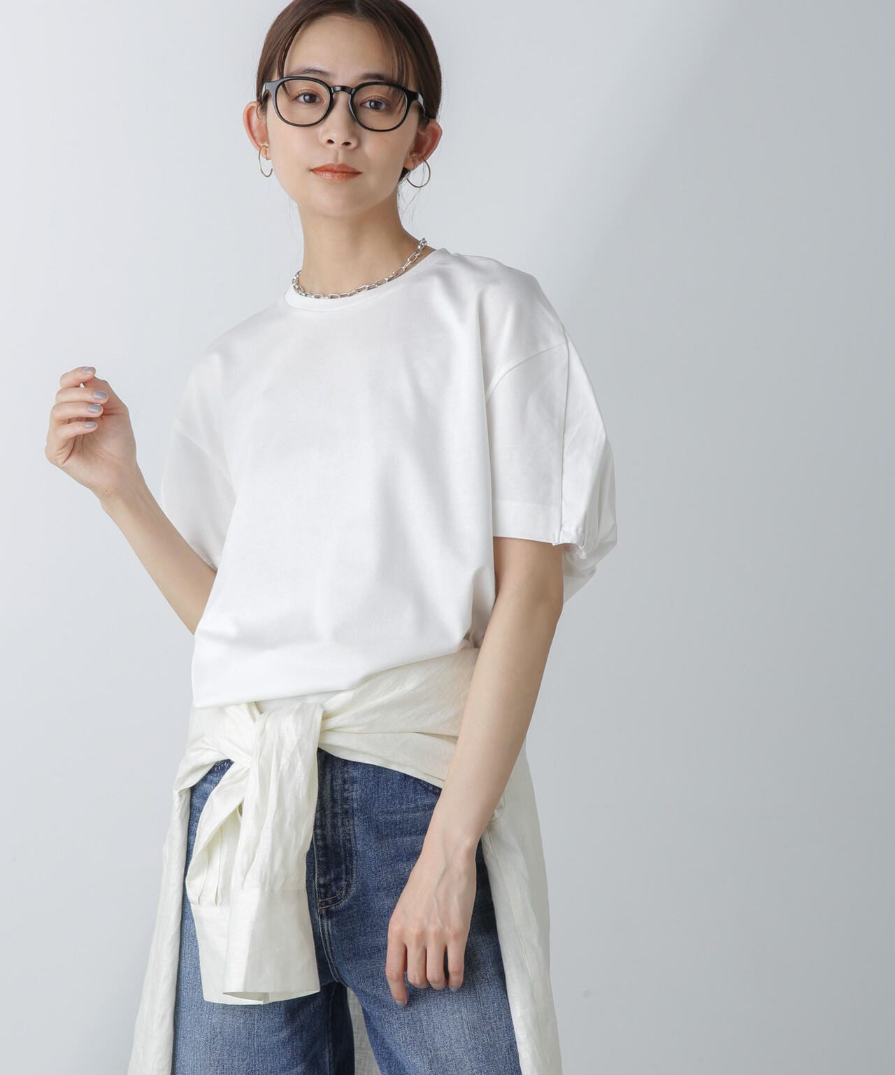 袖のフォルムデザインが魅力なカットトップス。フロントはシンプルな袖ながら、後ろはゴムでギャザーを入れた袖口でコクーンのような膨らみのあるシルエットが特徴。ハリ感のあるやや厚手の素材なので、透け感もなくオンスタイルにも最適な一枚。シンプルながらも、フォルムに特徴があるのでサラッと着ても様になるデザイン性の高いアイテムです!