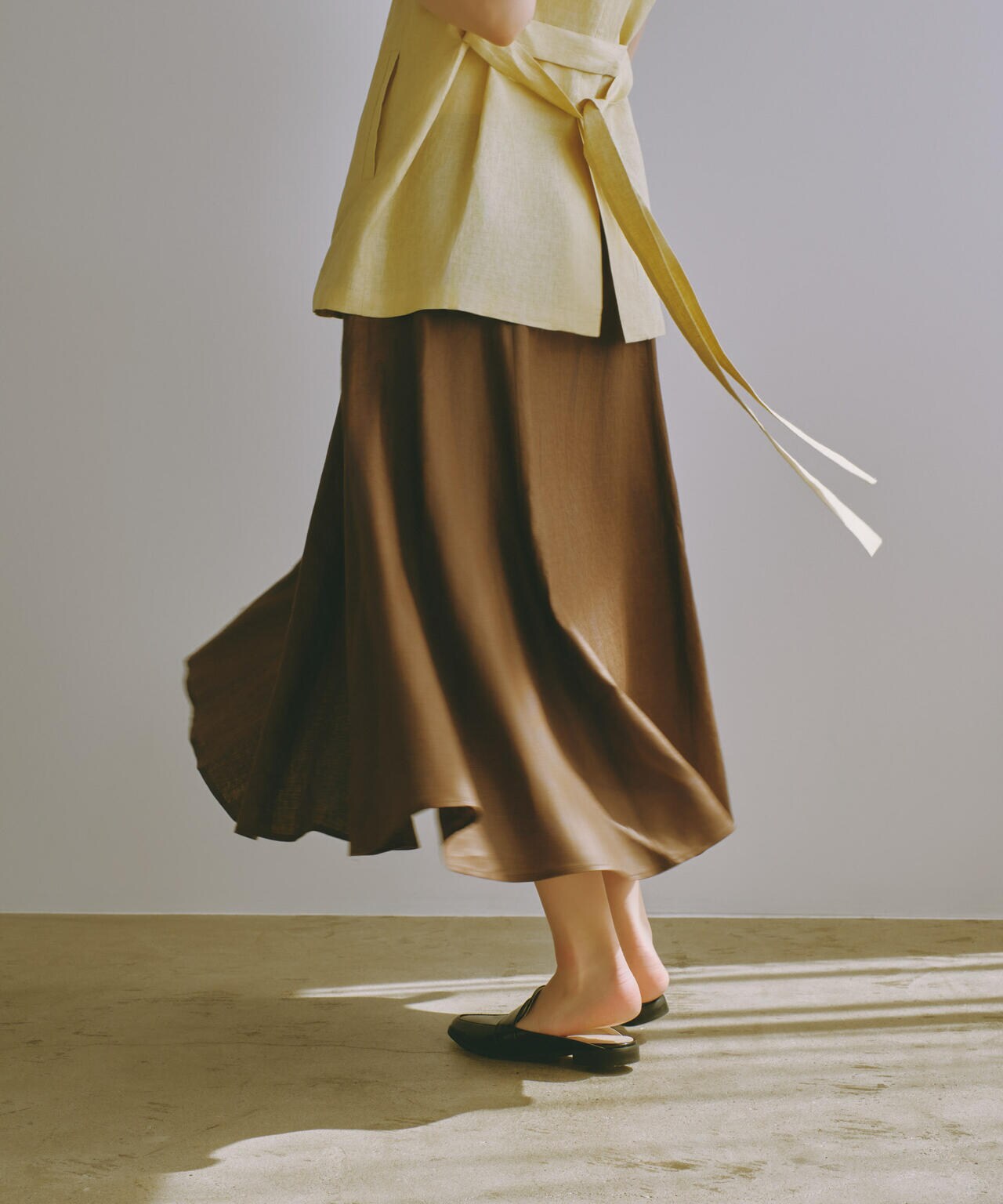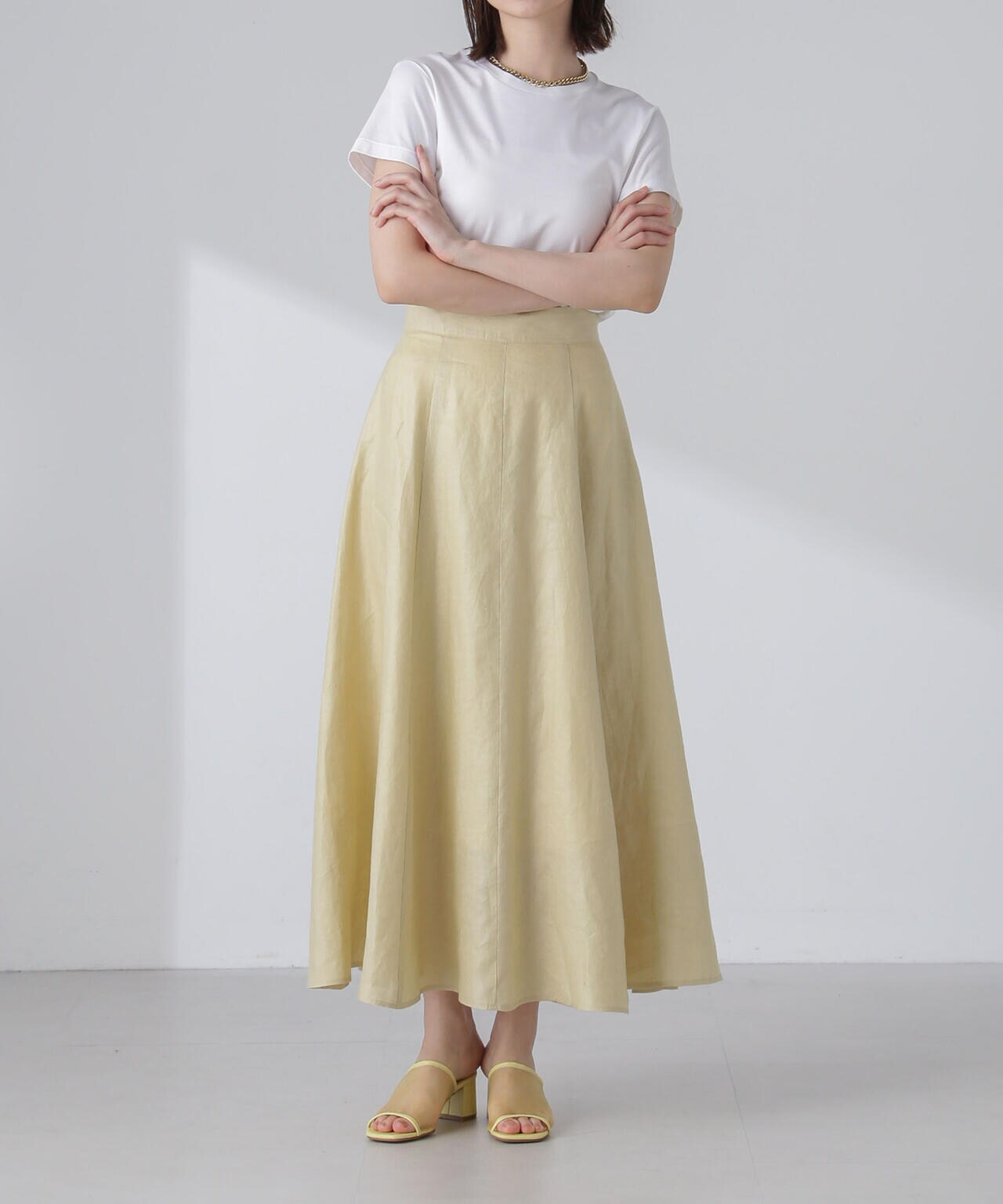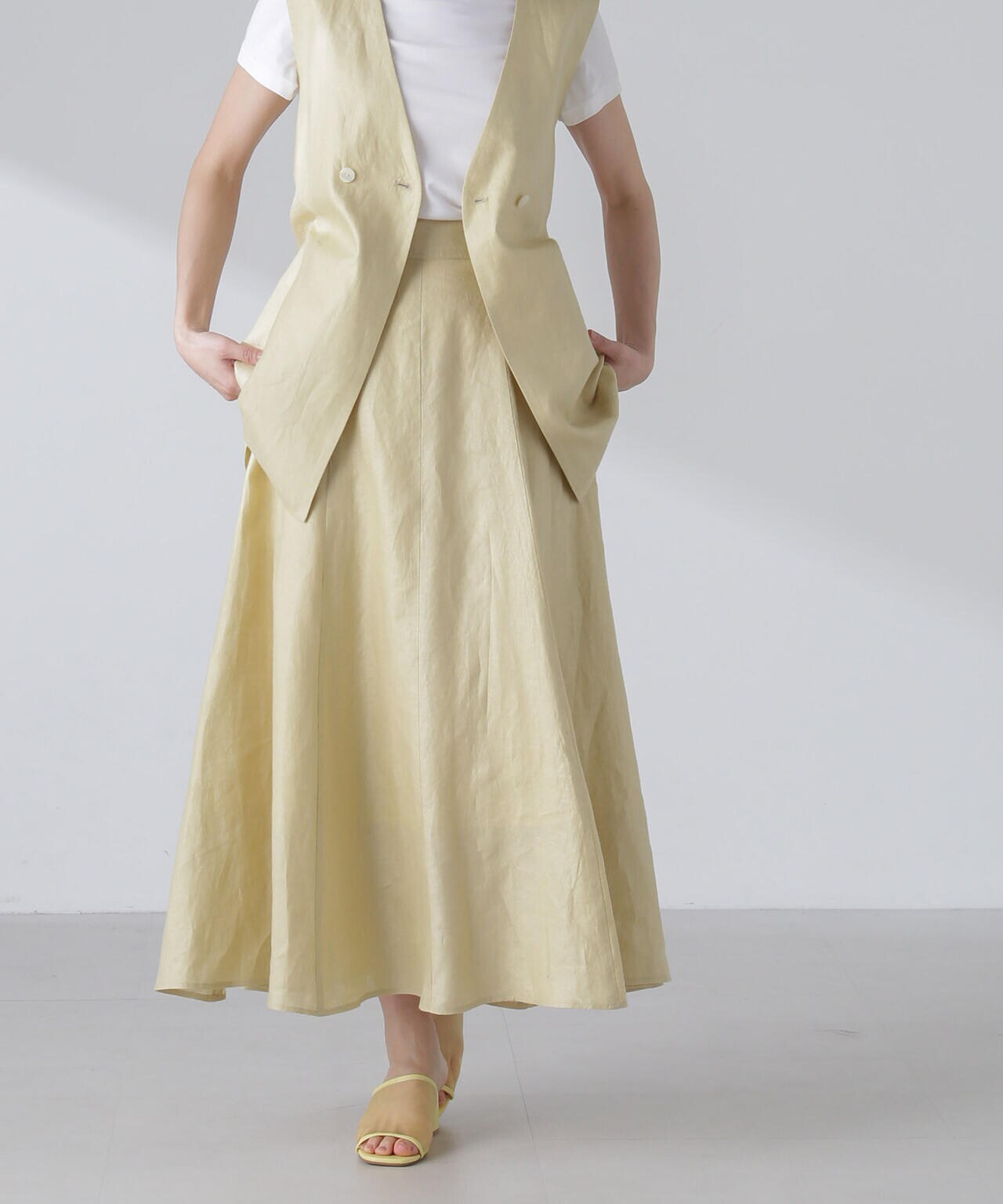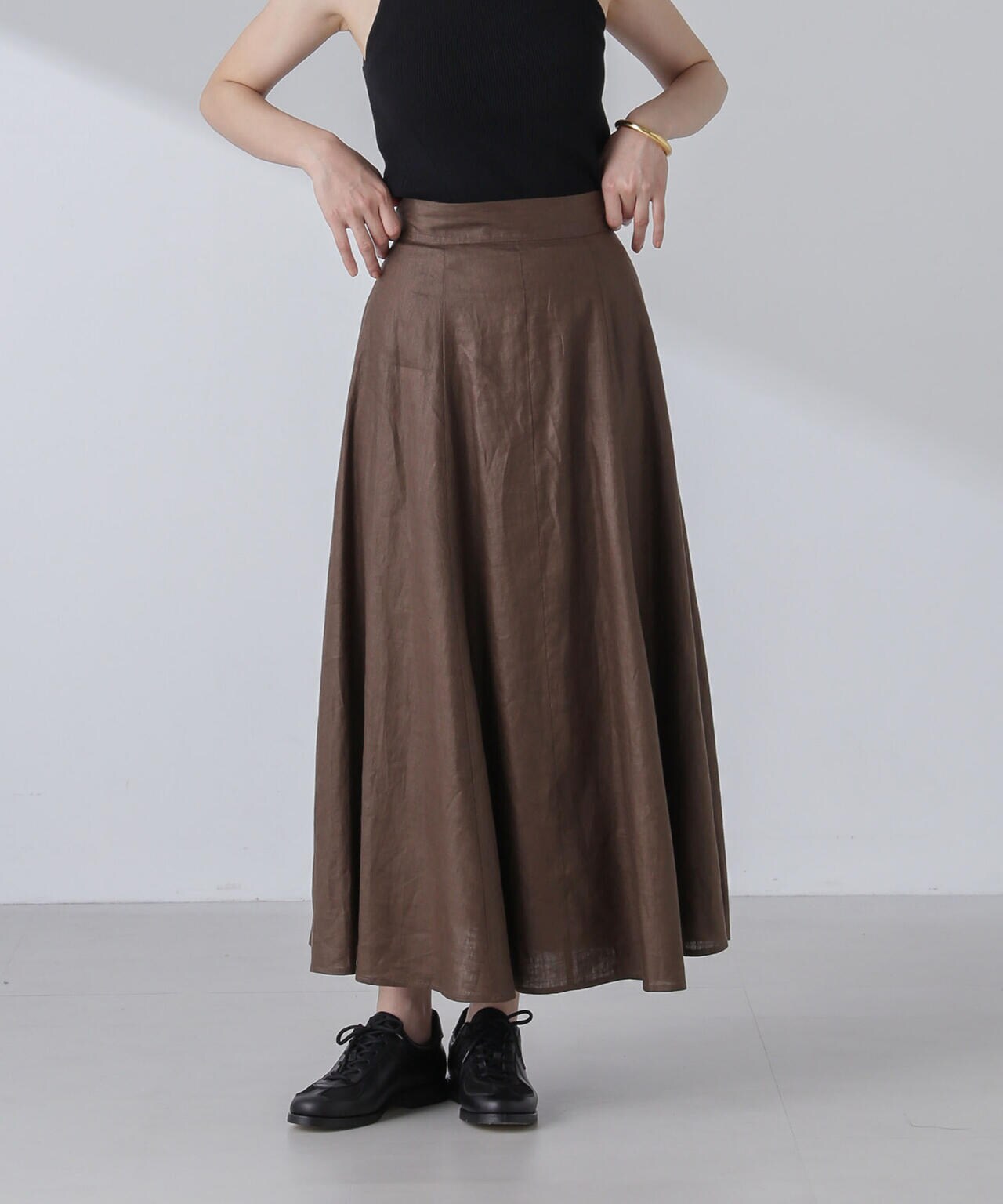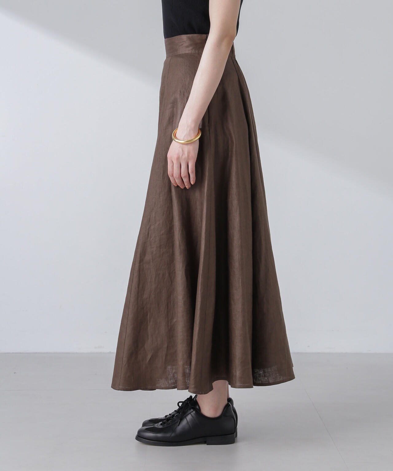 涼し気なリネン生地で仕立てたフレアスカート。ウエストはすっきりと、裾にかけてボリューム感を出すことで、スタイルアップが叶うシルエットに仕上げました。同シリーズのシャツやジレとセットアップスタイルで通勤などのオンスタイルにもおすすめです。