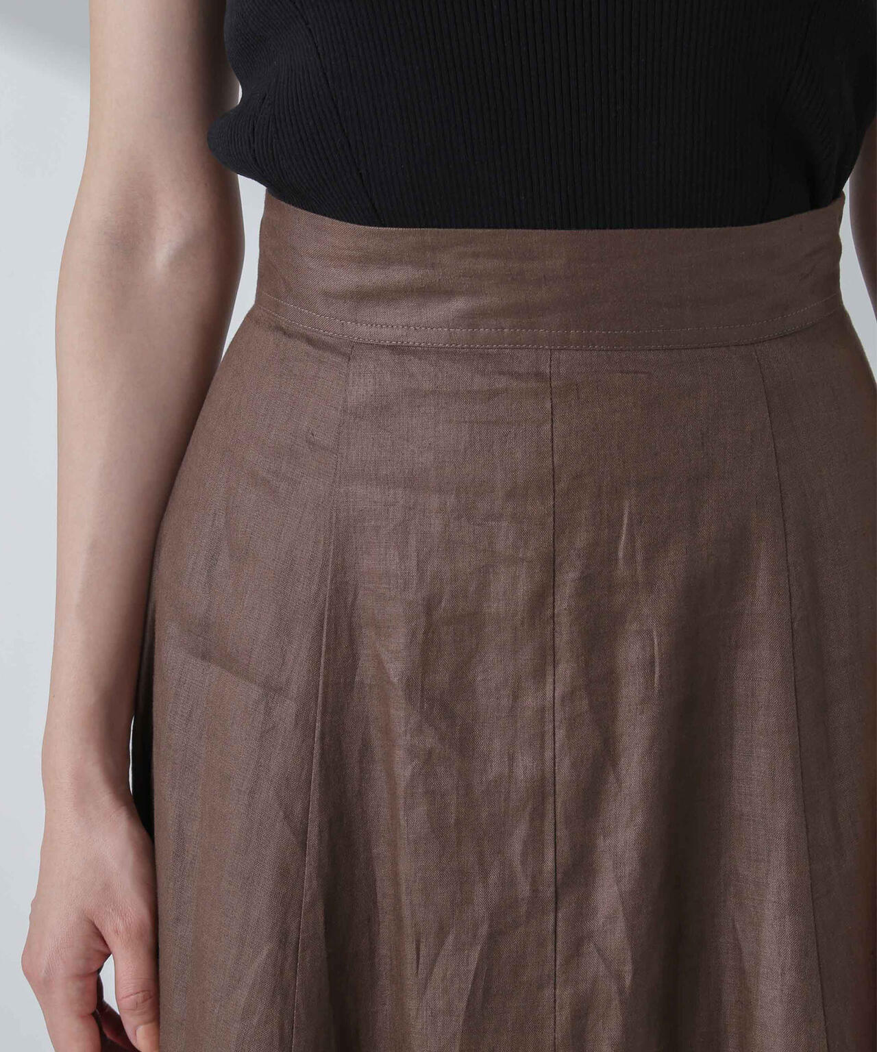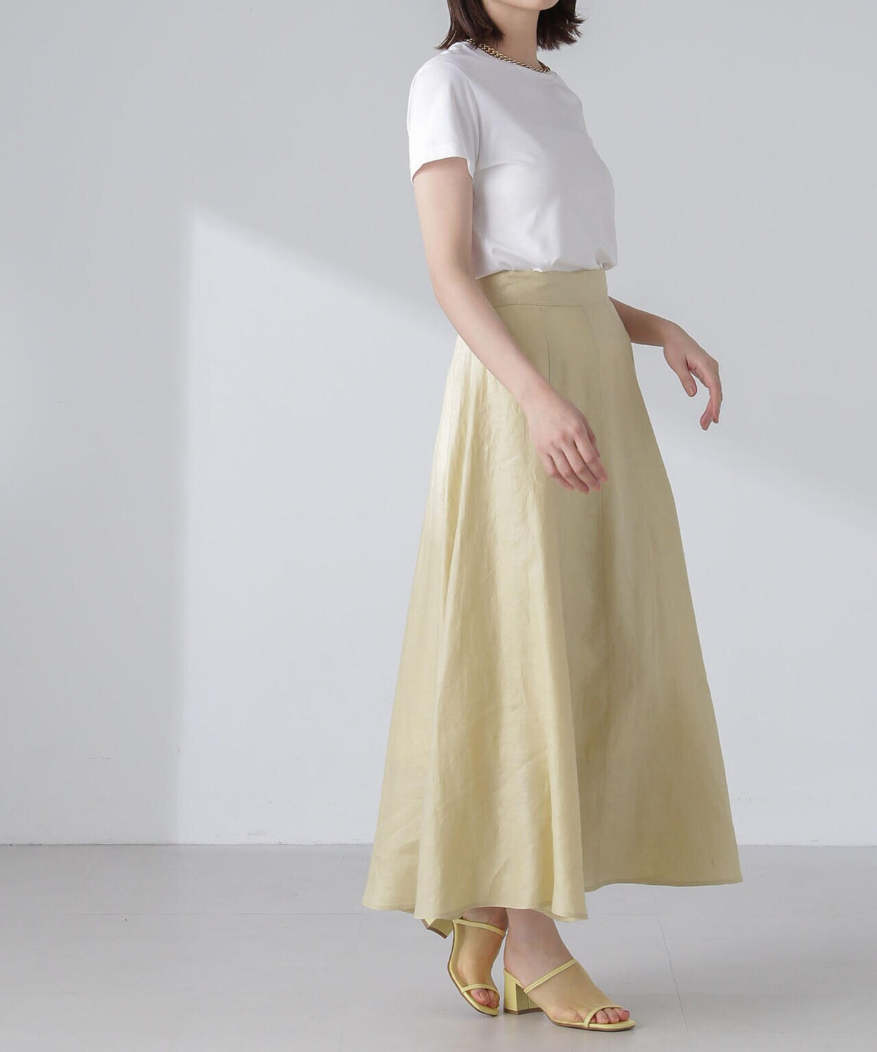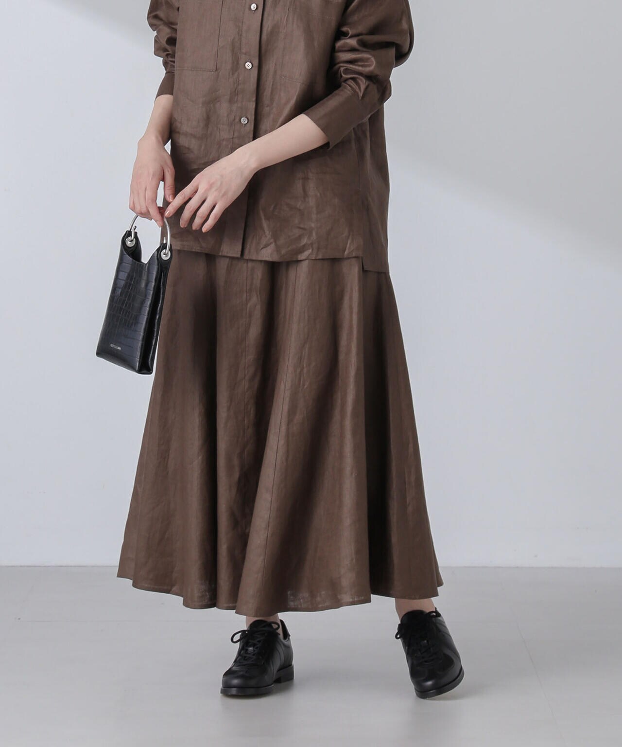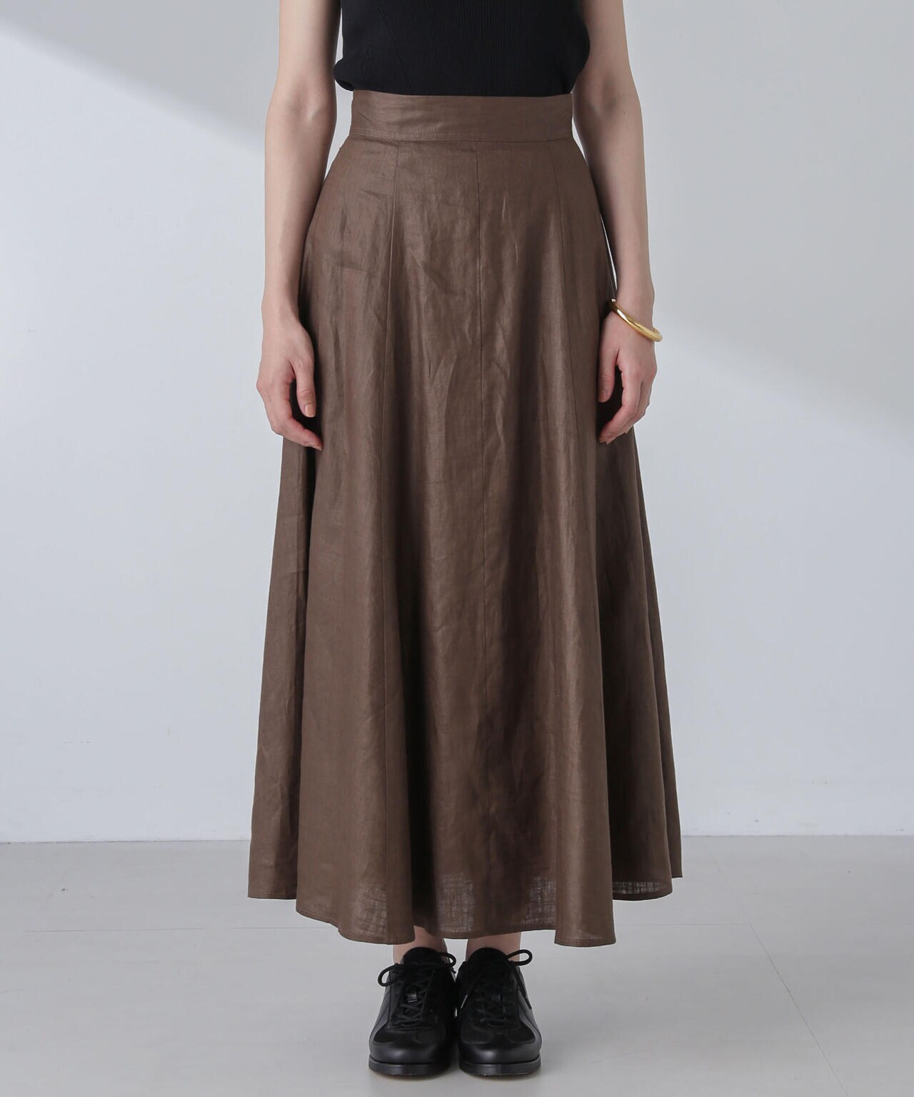 涼し気なリネン生地で仕立てたフレアスカート。ウエストはすっきりと、裾にかけてボリューム感を出すことで、スタイルアップが叶うシルエットに仕上げました。同シリーズのシャツやジレとセットアップスタイルで通勤などのオンスタイルにもおすすめです。