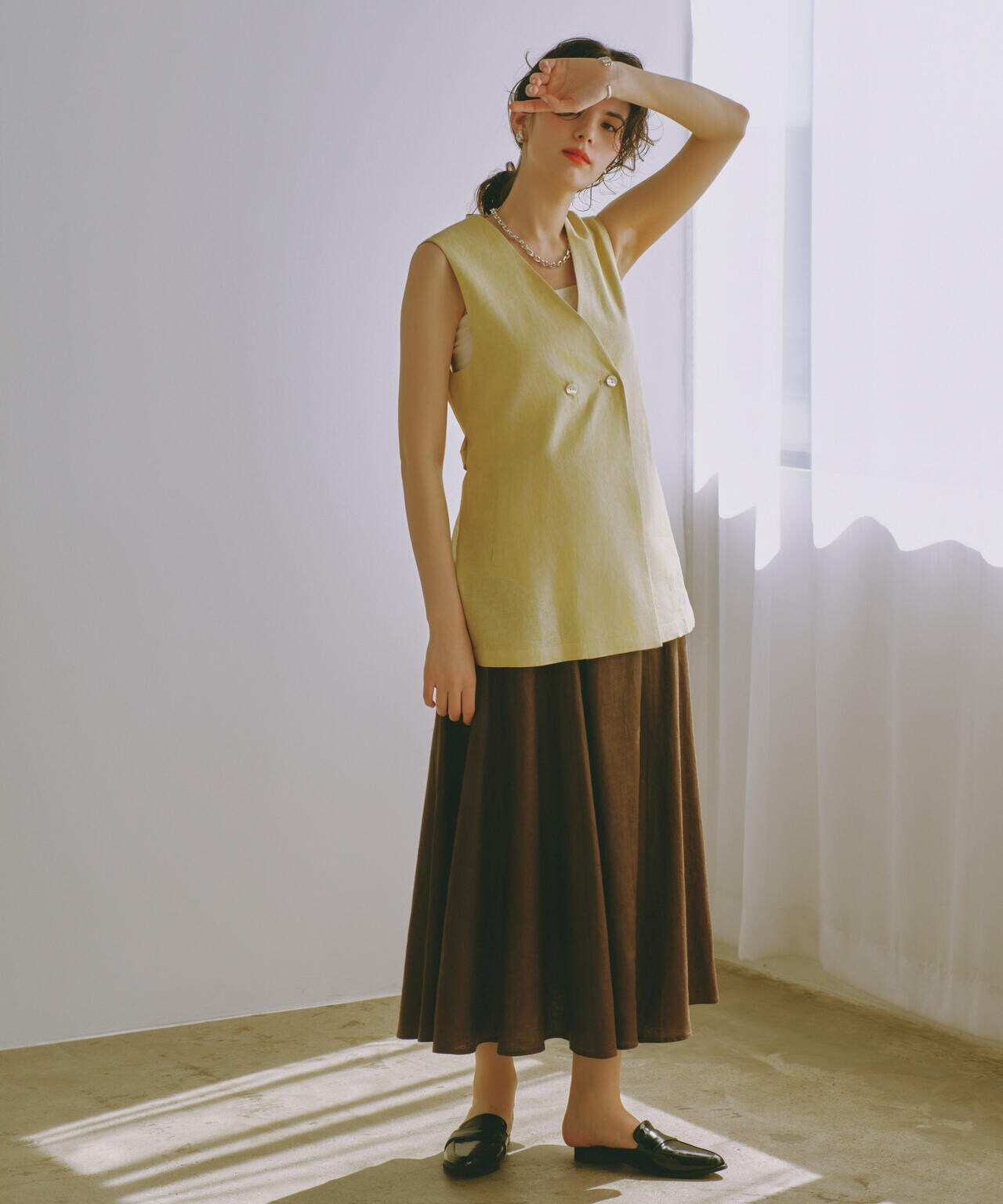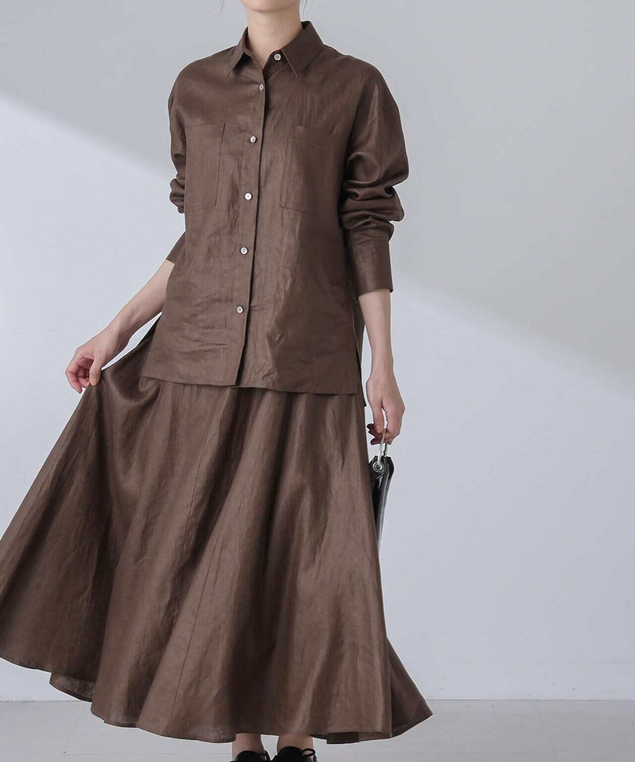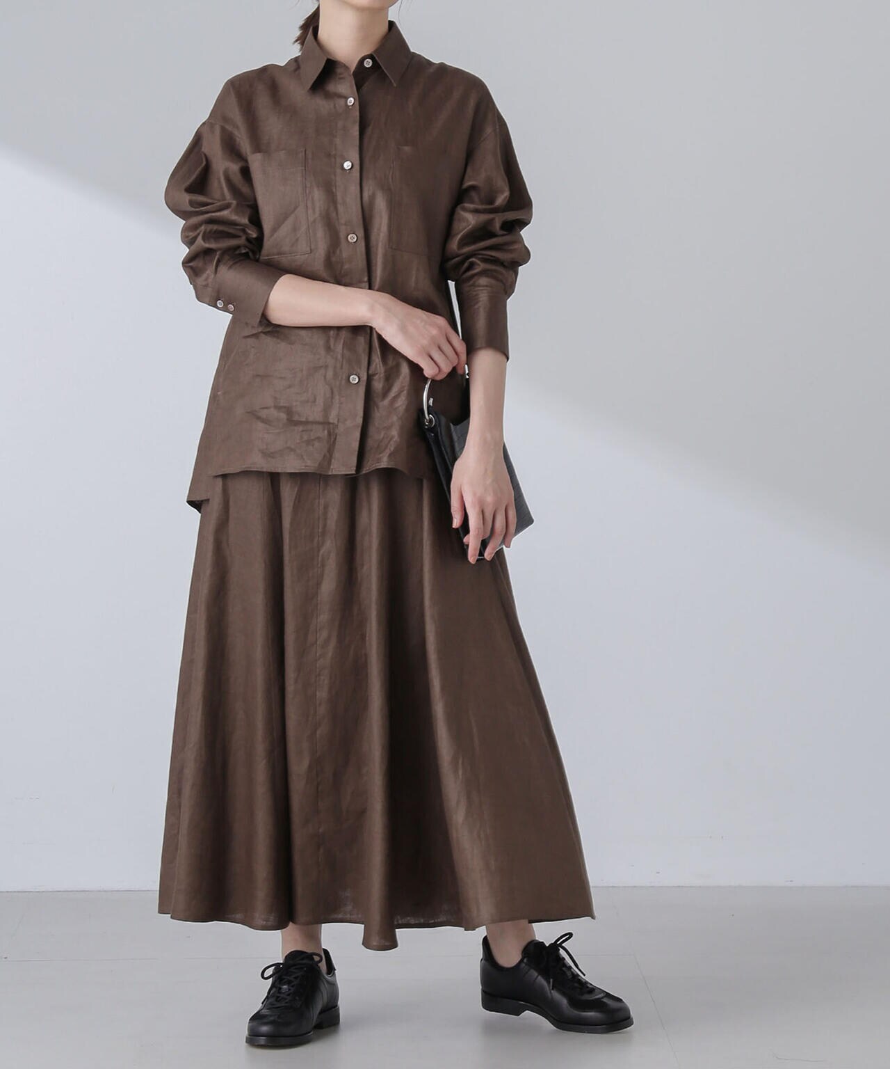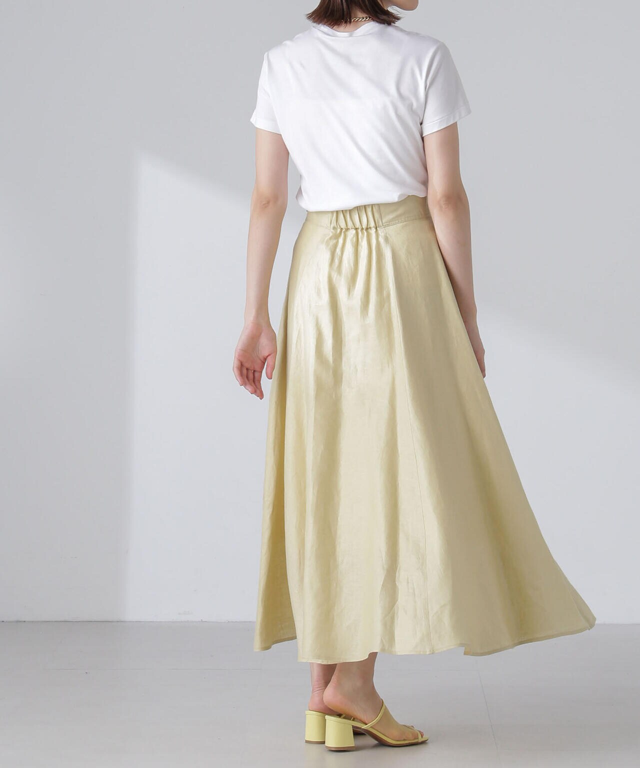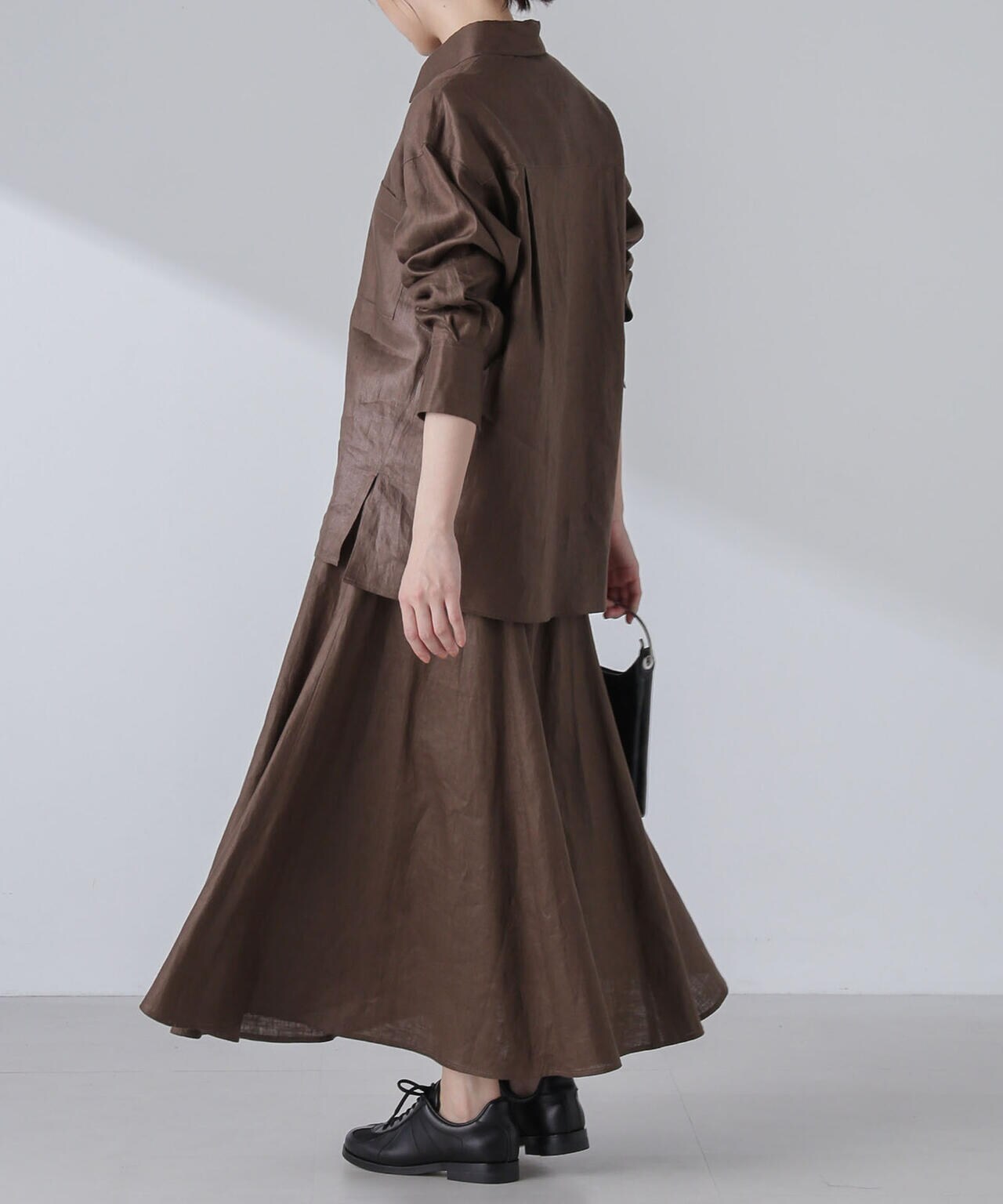 涼し気なリネン生地で仕立てたフレアスカート。ウエストはすっきりと、裾にかけてボリューム感を出すことで、スタイルアップが叶うシルエットに仕上げました。同シリーズのシャツやジレとセットアップスタイルで通勤などのオンスタイルにもおすすめです。