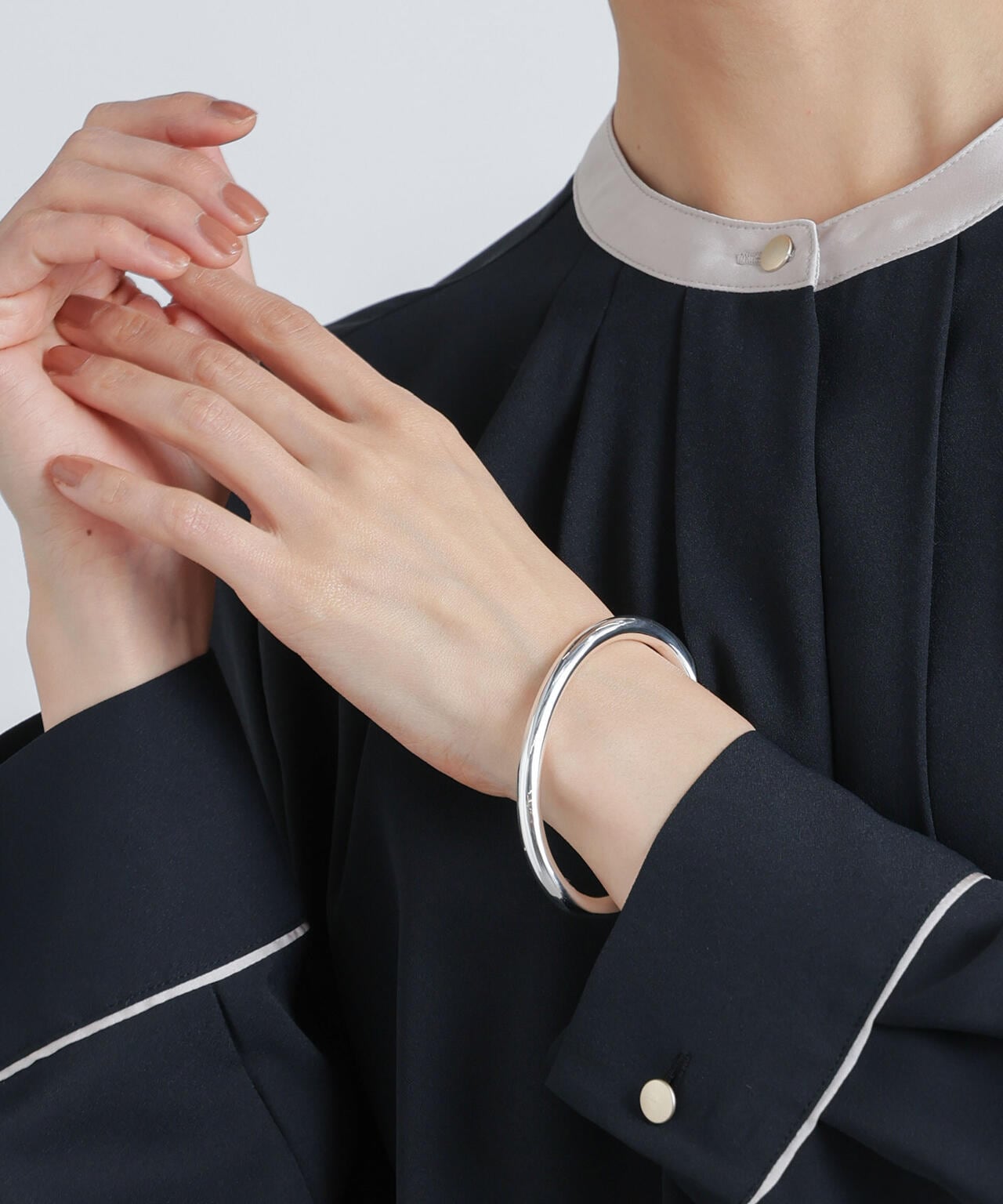 すっきり見えるフォルムに拘った、洗練感漂うバングル。少し太さに変化を付けたデザインに、やや重みを感じるようなルックスが高級感を演出します。スタイルを選ばずON/OFFで活躍するので、ワードローブに追加しておくと重宝しそう。