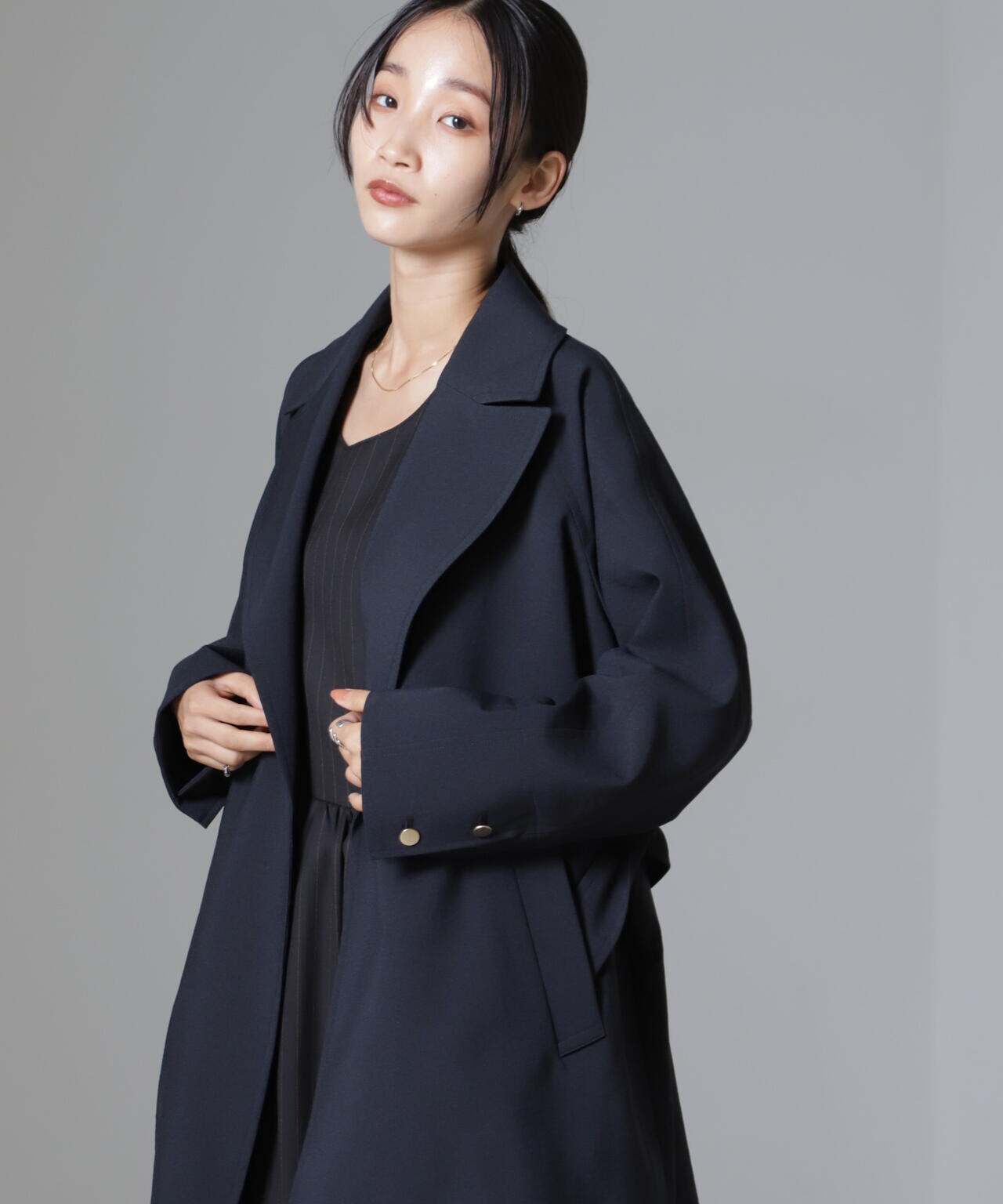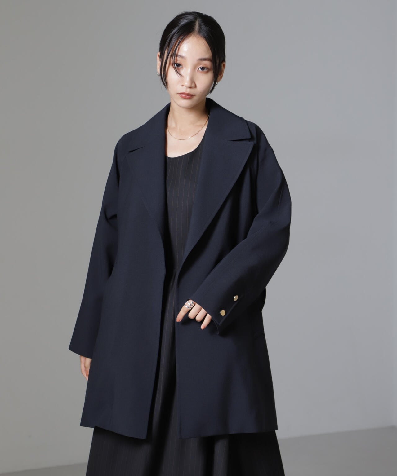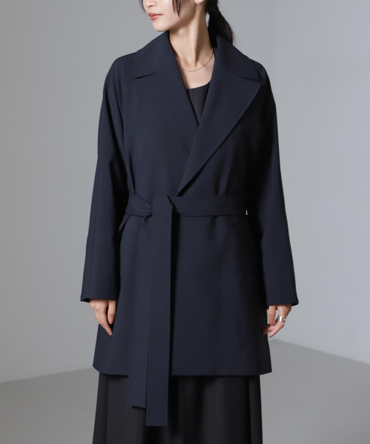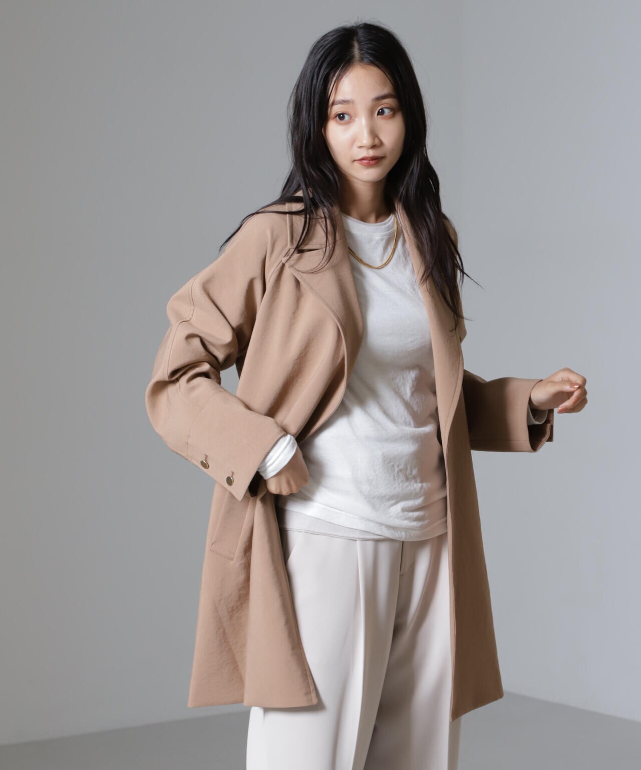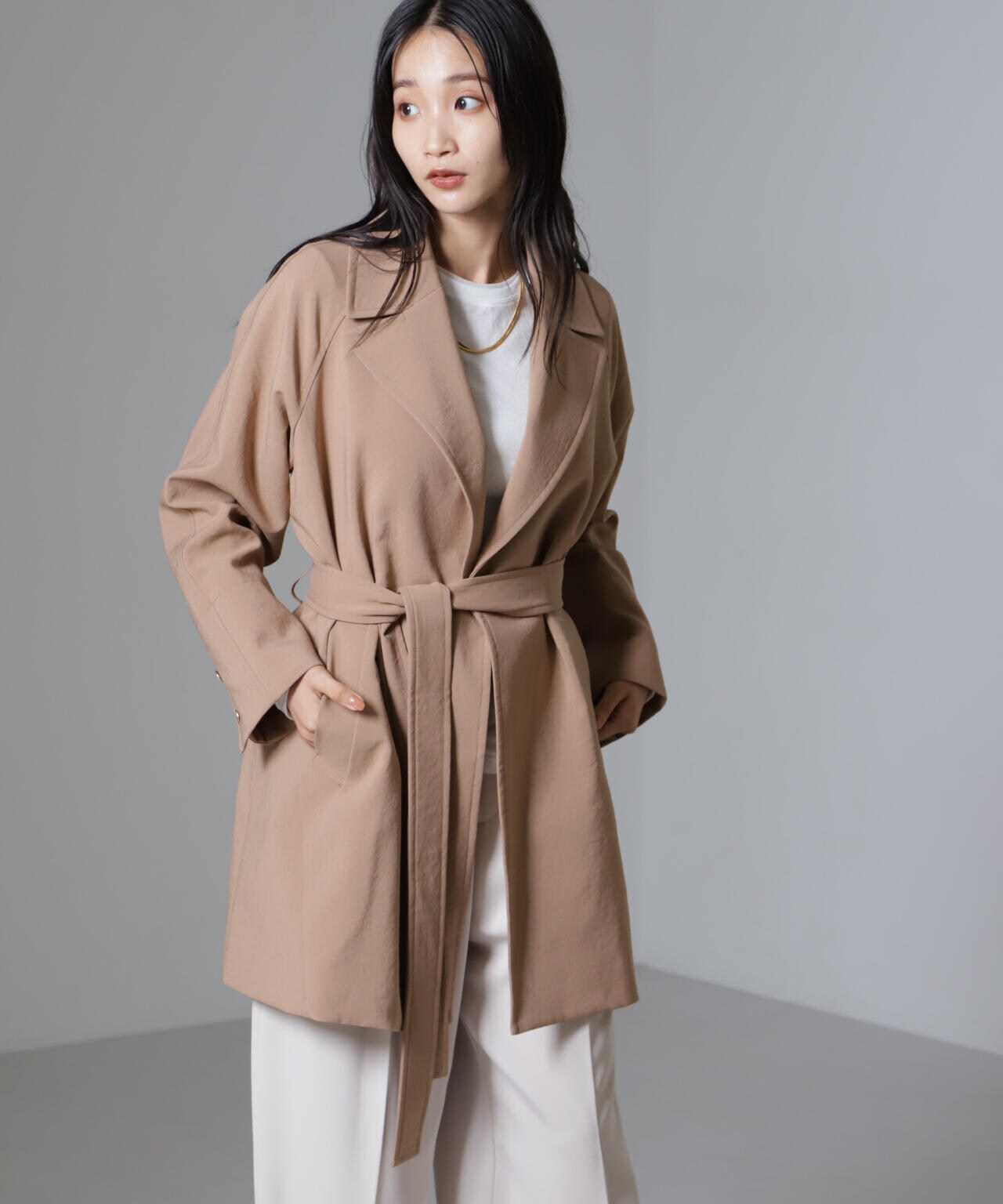 大きなラペルが印象的なミドル丈コート。フロントはボタンレスでベルテッドで着て頂けるデザイン。夏が長く暑い時期が続くのでウールコートが登場するまでライトな秋羽織として活躍するアイテムです!