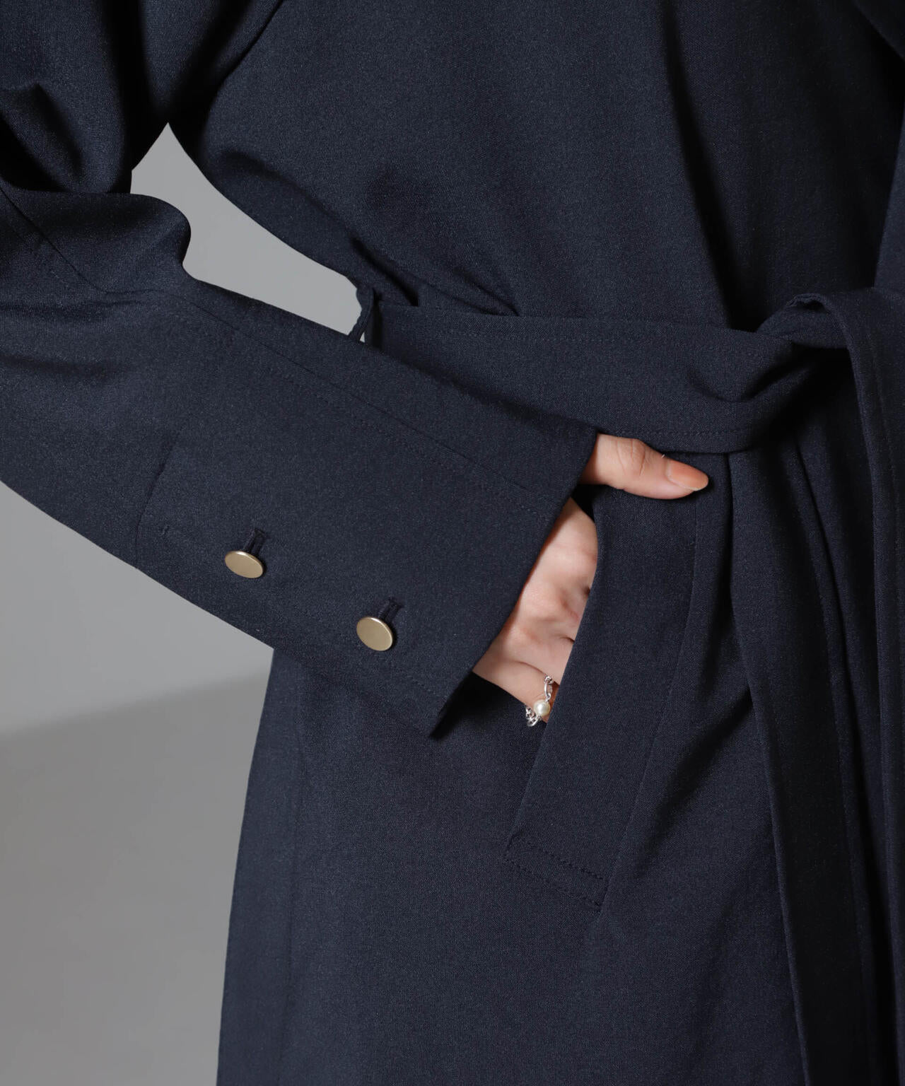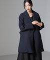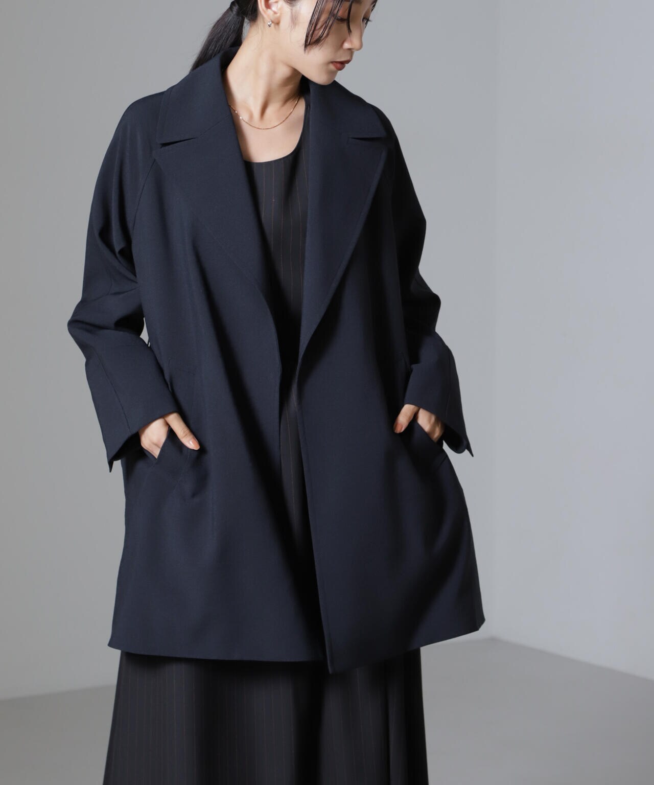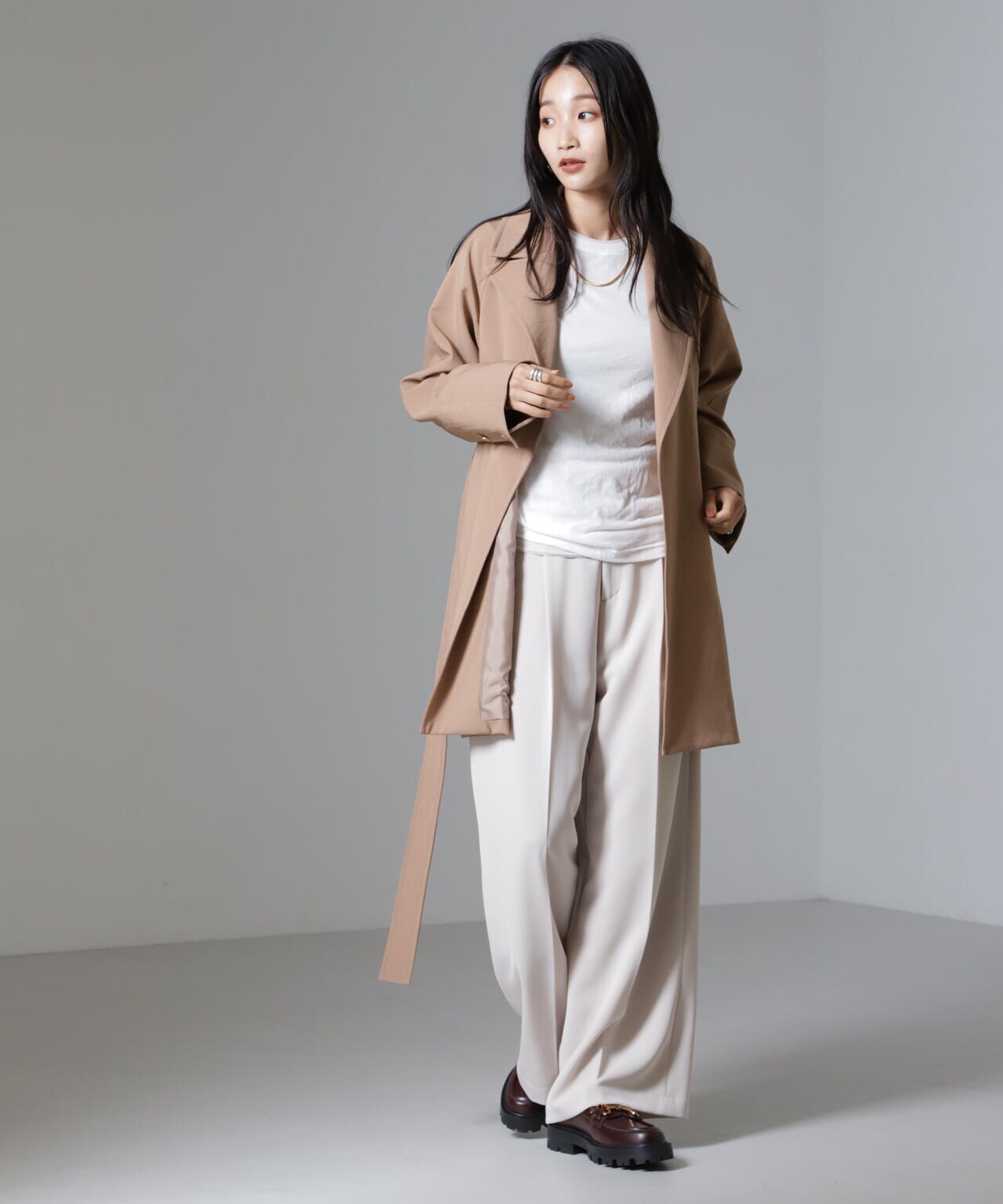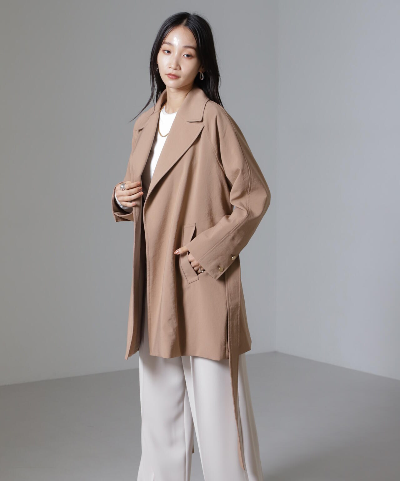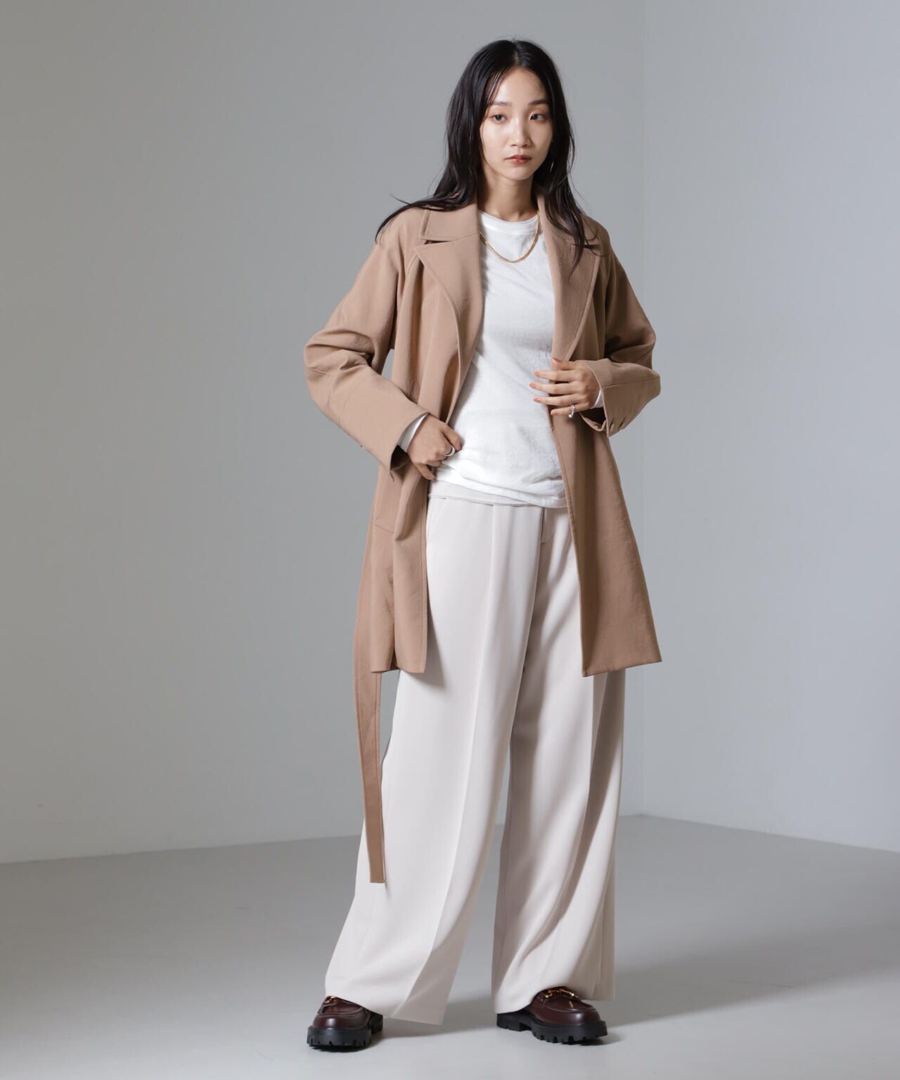 大きなラペルが印象的なミドル丈コート。フロントはボタンレスでベルテッドで着て頂けるデザイン。夏が長く暑い時期が続くのでウールコートが登場するまでライトな秋羽織として活躍するアイテムです!