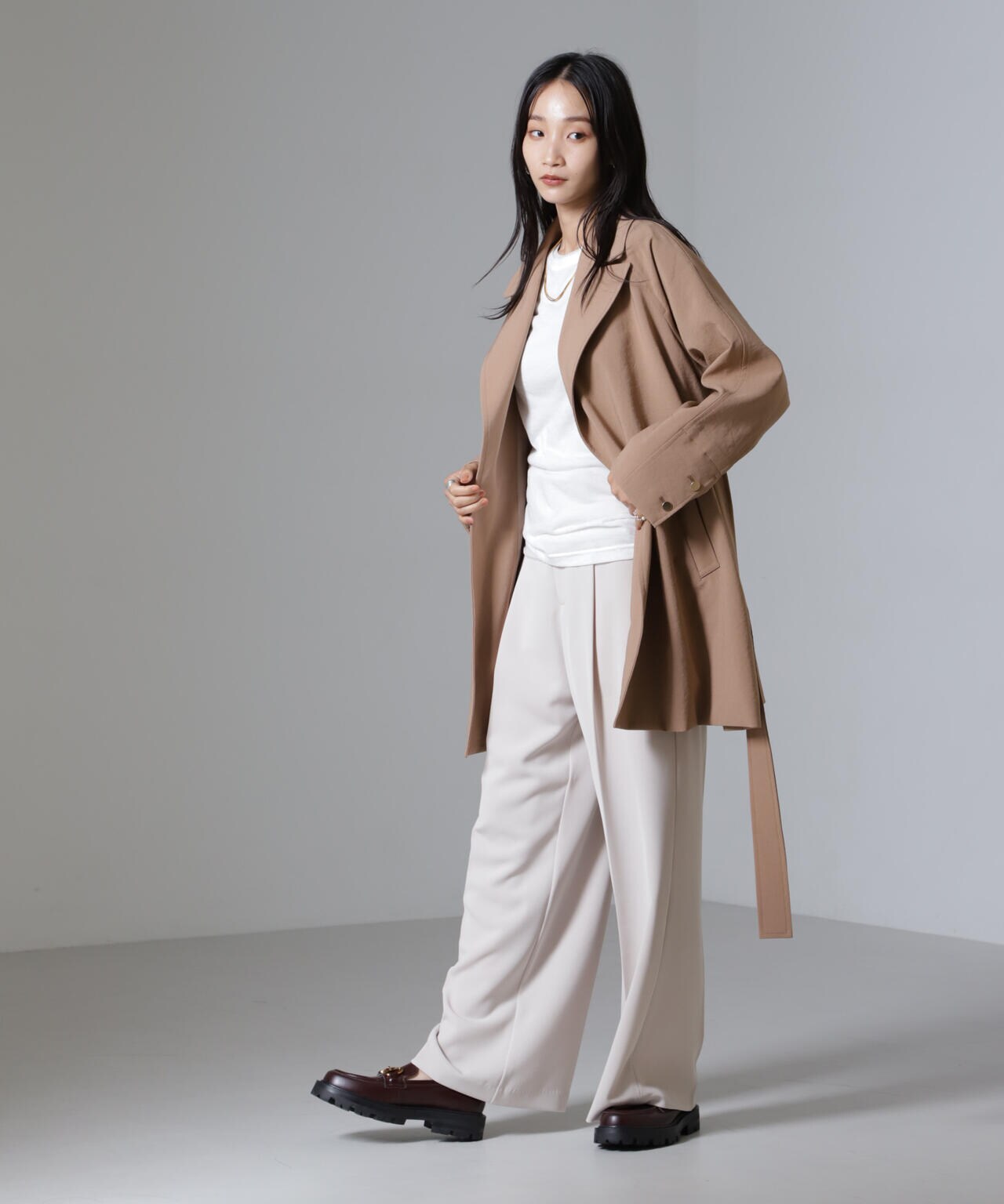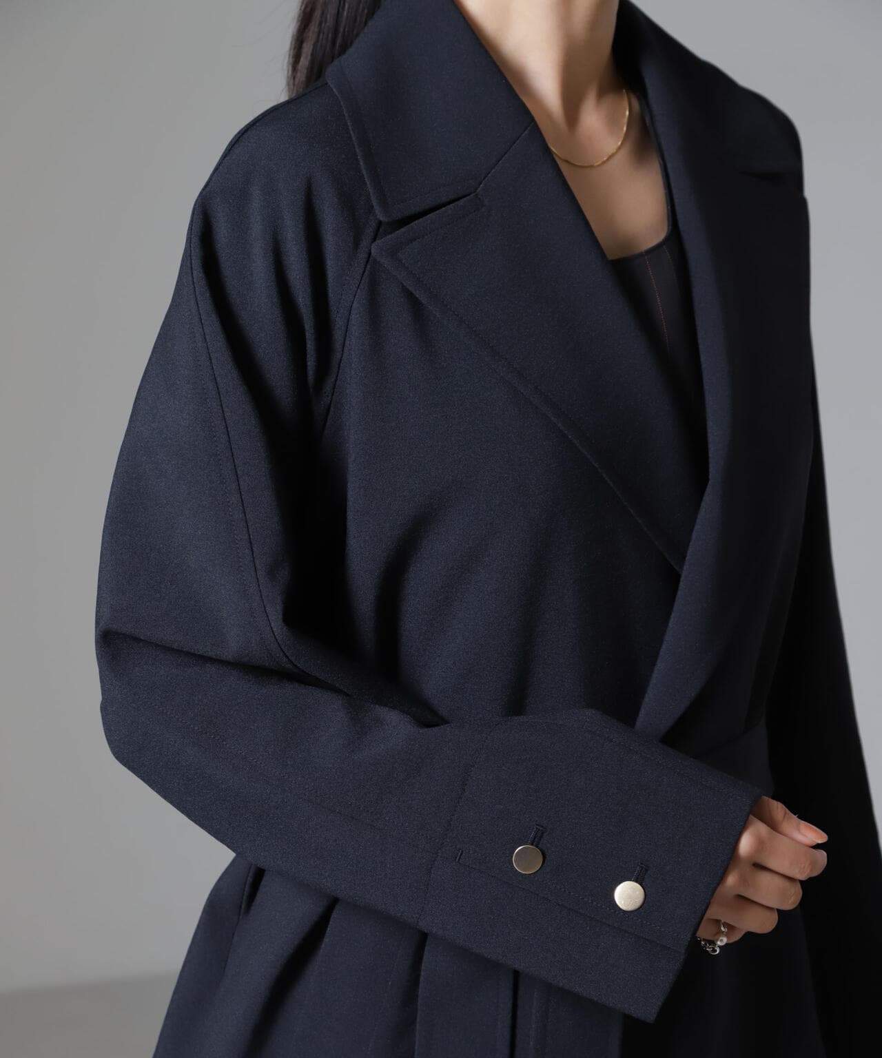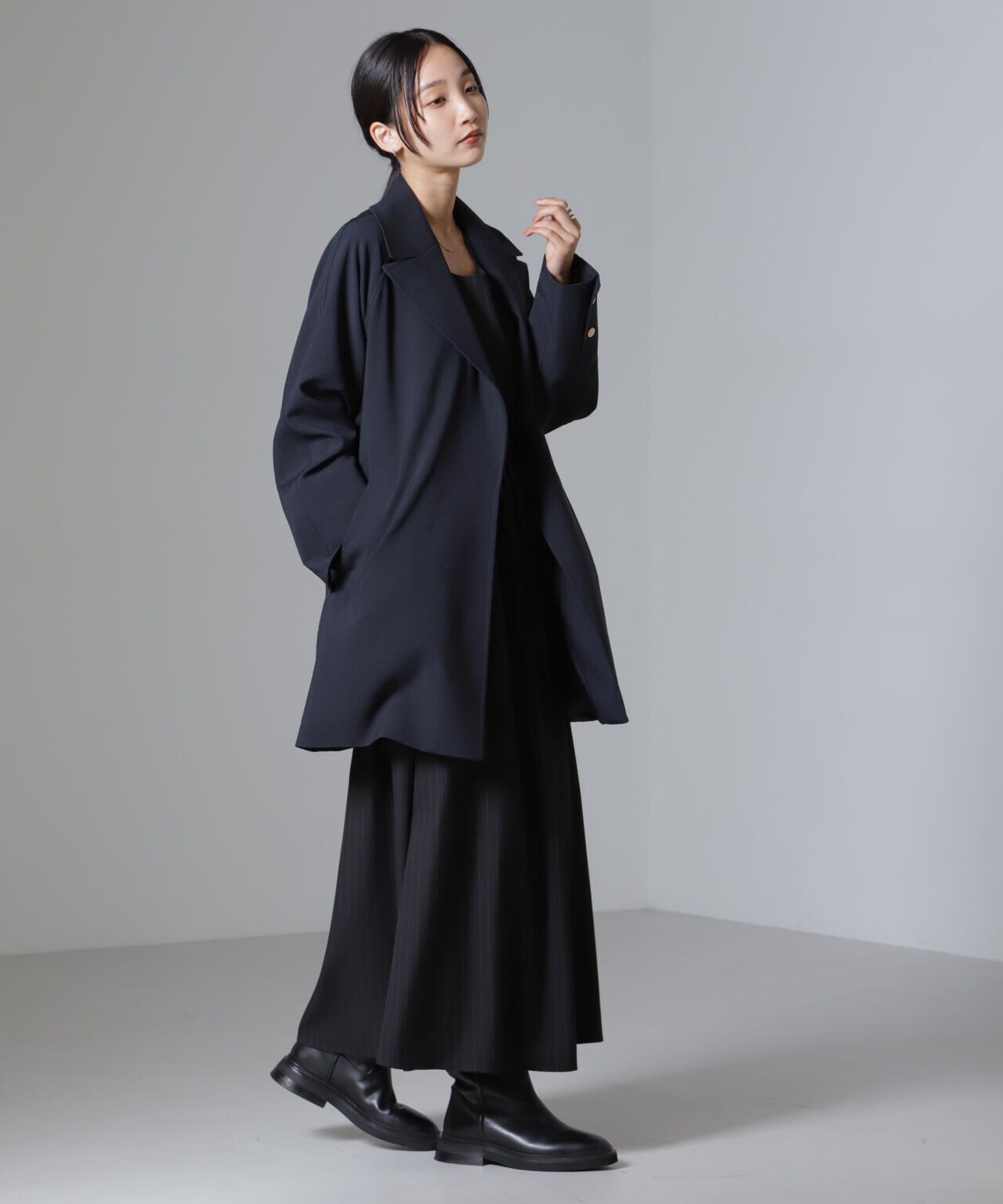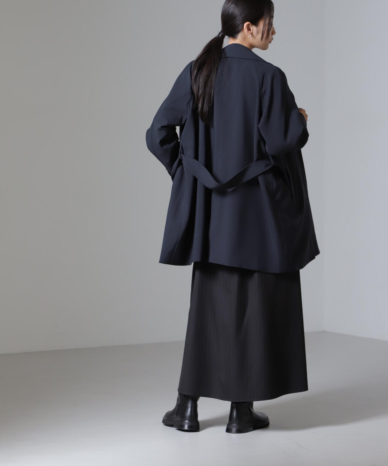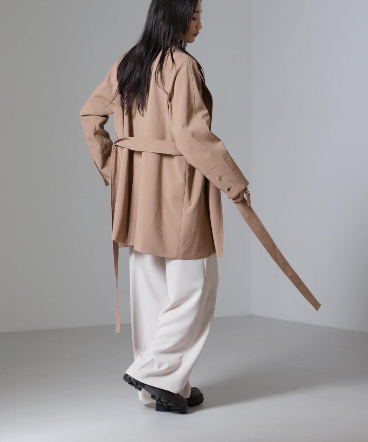大きなラペルが印象的なミドル丈コート。フロントはボタンレスでベルテッドで着て頂けるデザイン。夏が長く暑い時期が続くのでウールコートが登場するまでライトな秋羽織として活躍するアイテムです!