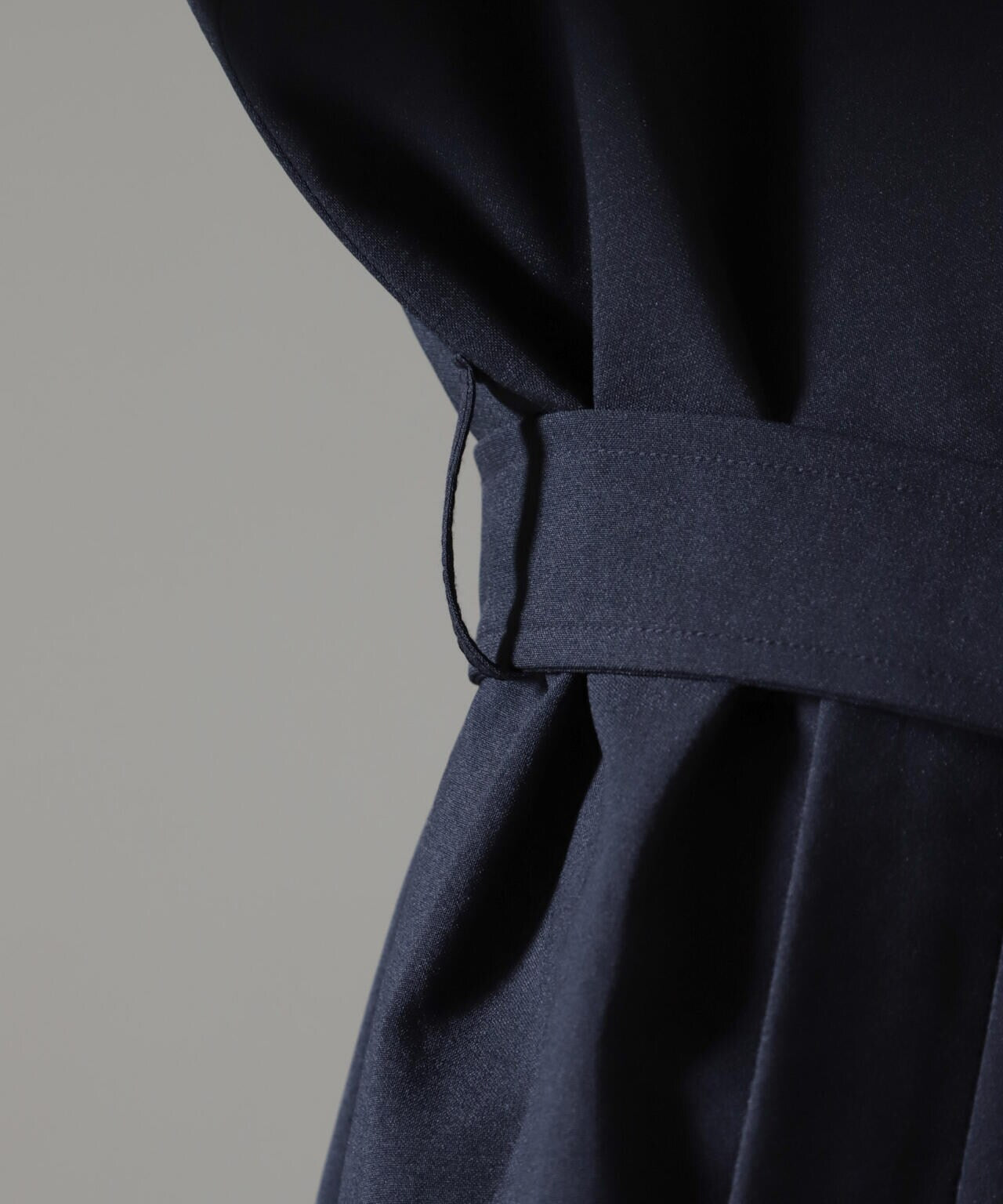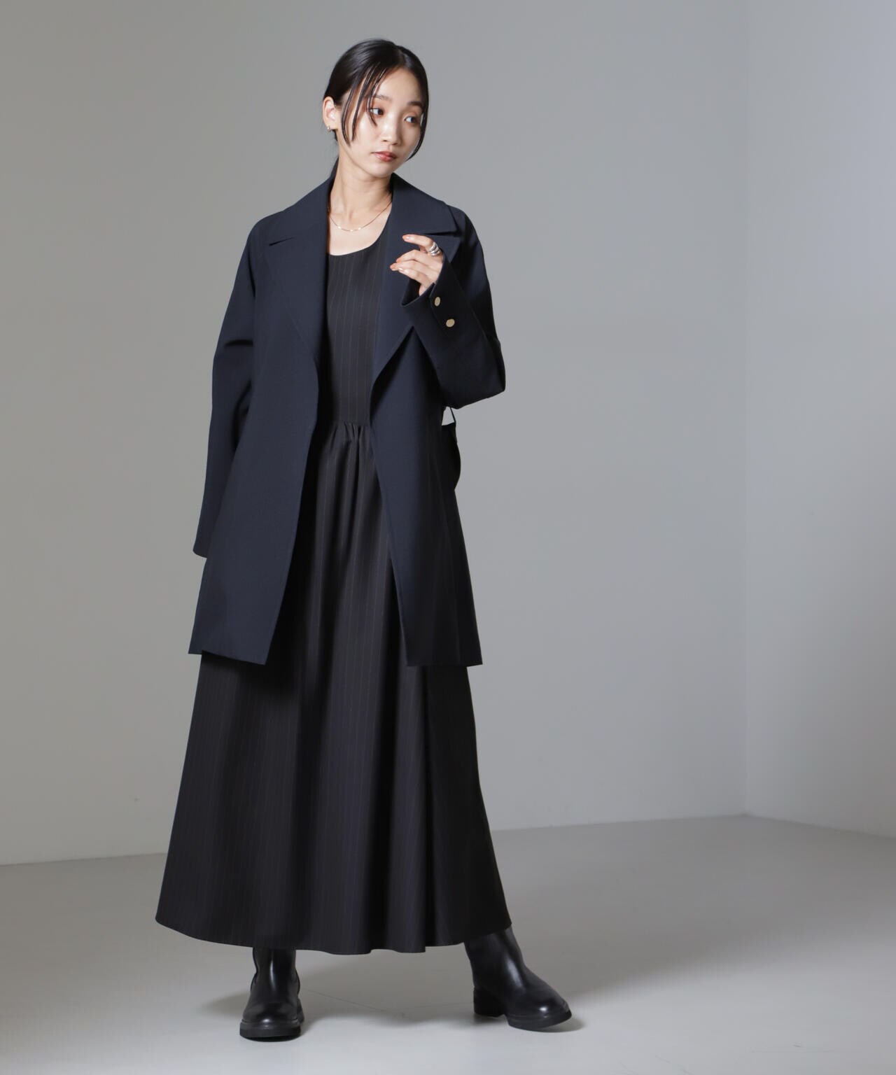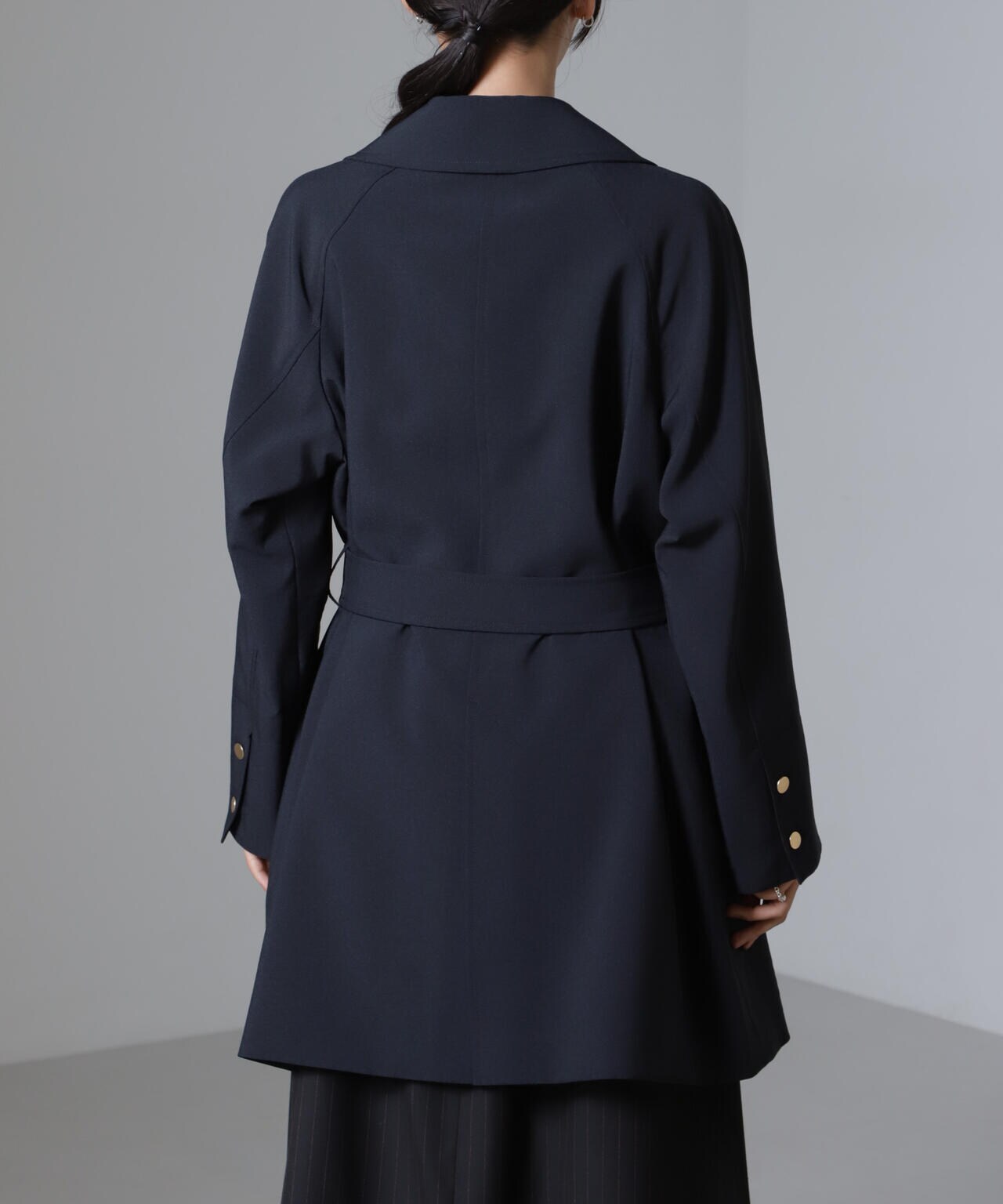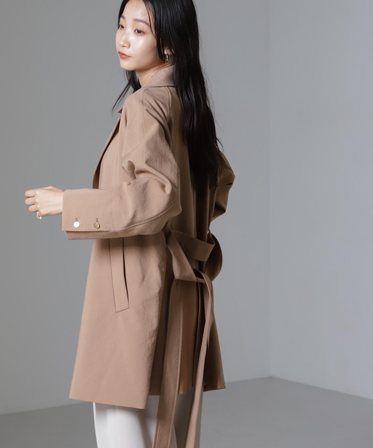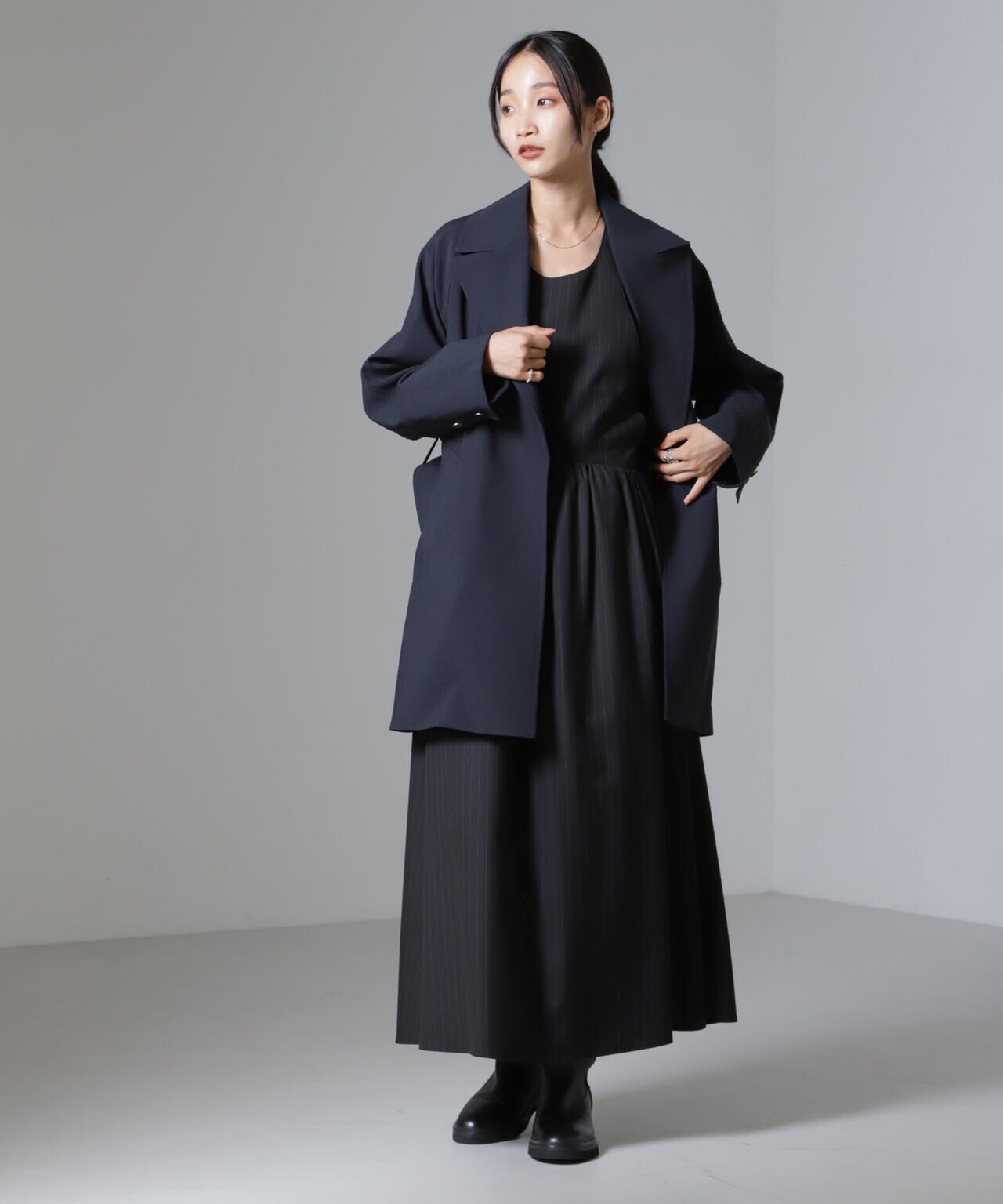 大きなラペルが印象的なミドル丈コート。フロントはボタンレスでベルテッドで着て頂けるデザイン。夏が長く暑い時期が続くのでウールコートが登場するまでライトな秋羽織として活躍するアイテムです!