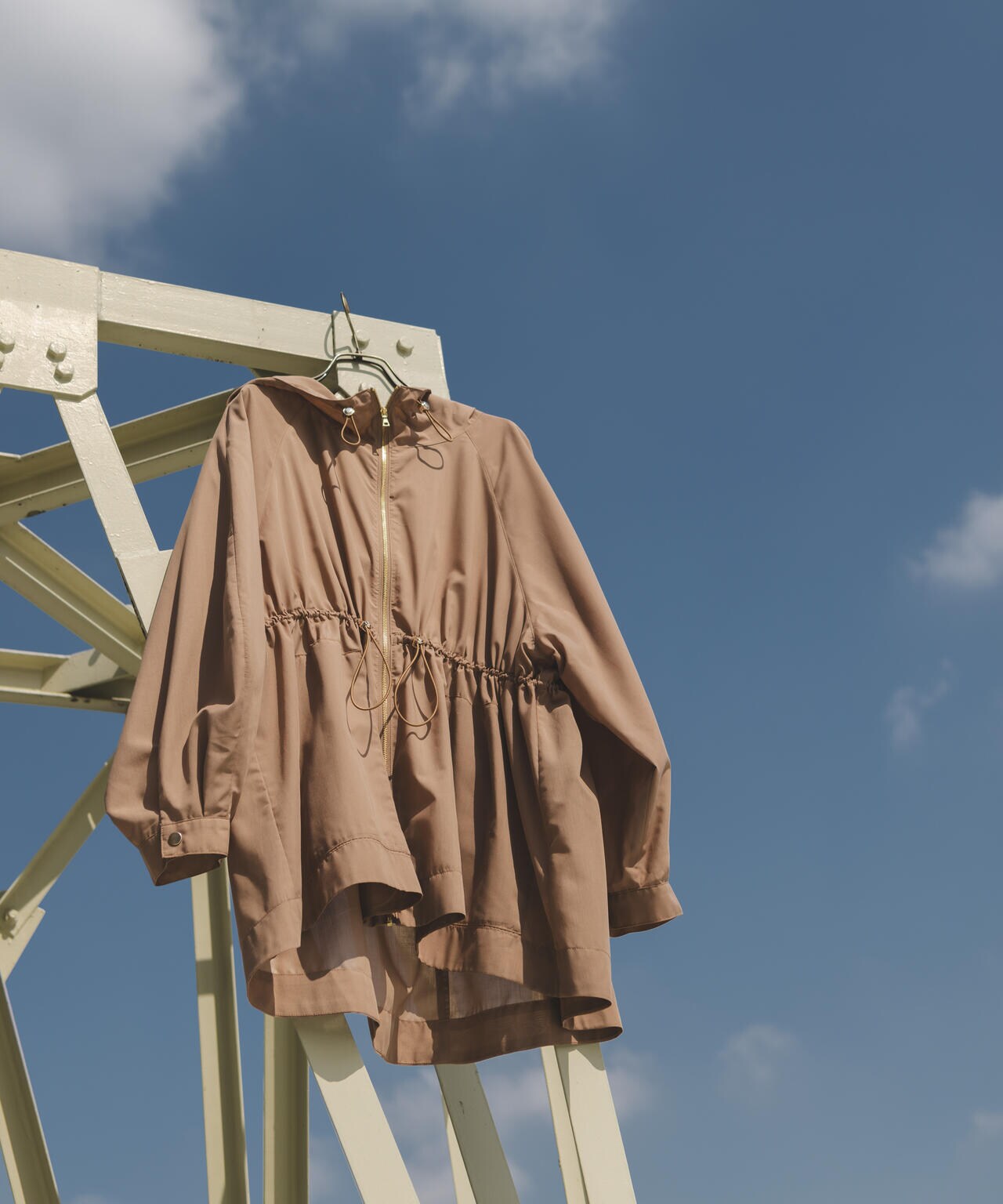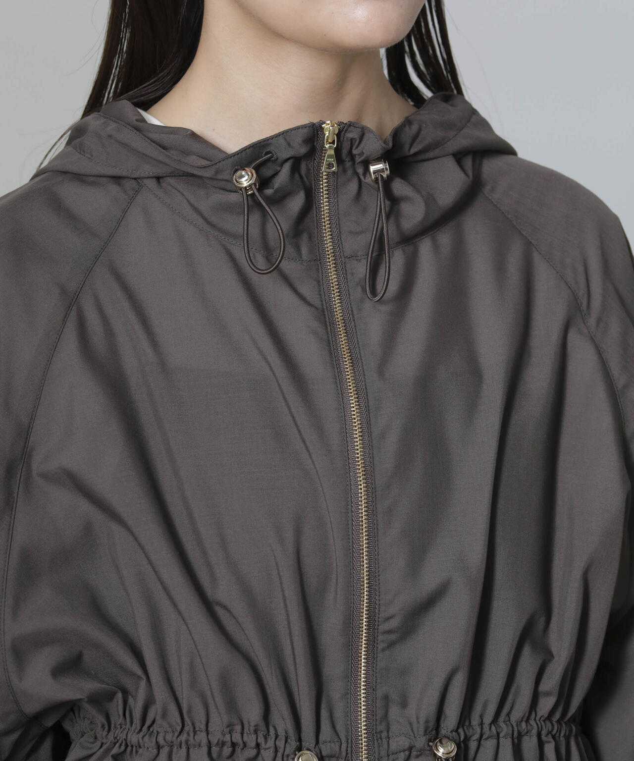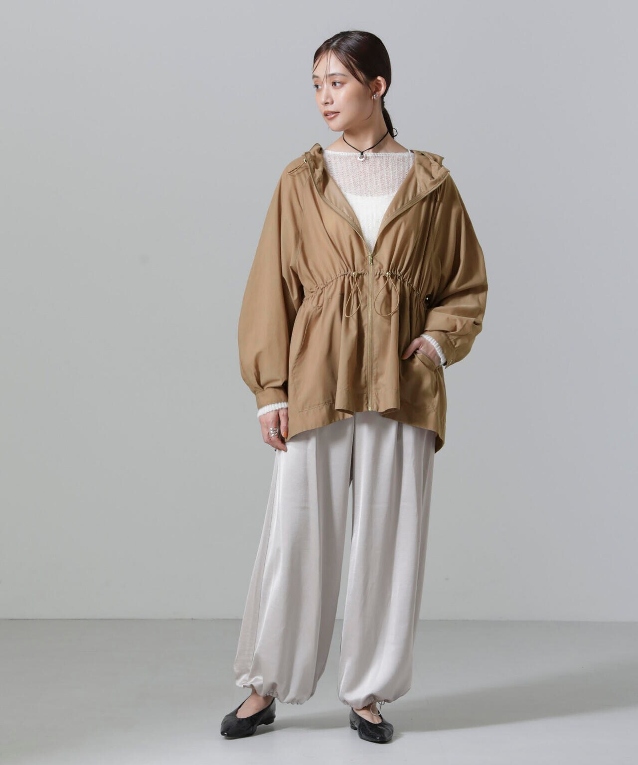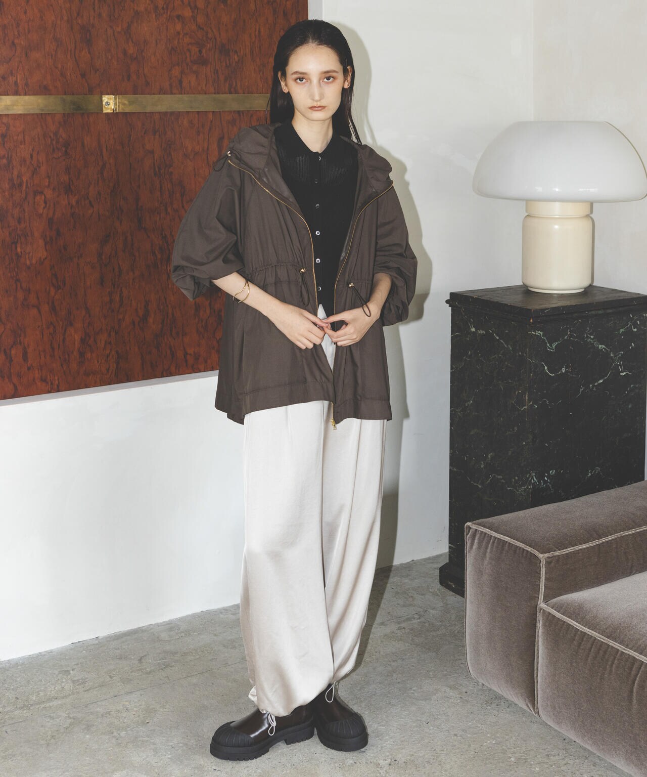 まだ暑い時期にサッと素肌の上から羽織れる新感覚ブルゾン。くたっとしたフードやゴールドパーツで大人スポーティな印象を与えてくれるアイテム。ウエストのドローコードで絞ってスタイリッシュにギャザー感の調節が可能です。袖口にはボタンが付いており、留めたままキュッとたくし上げても、外してシャツのようにロールアップするのも◎