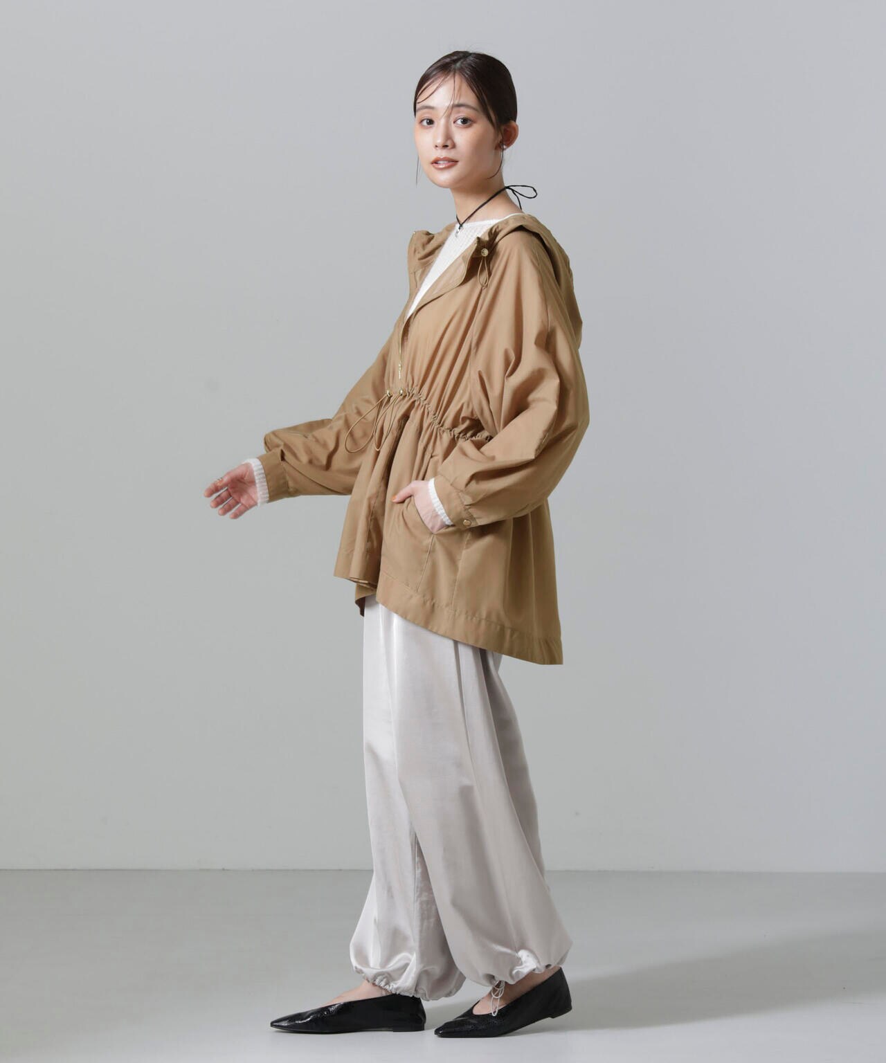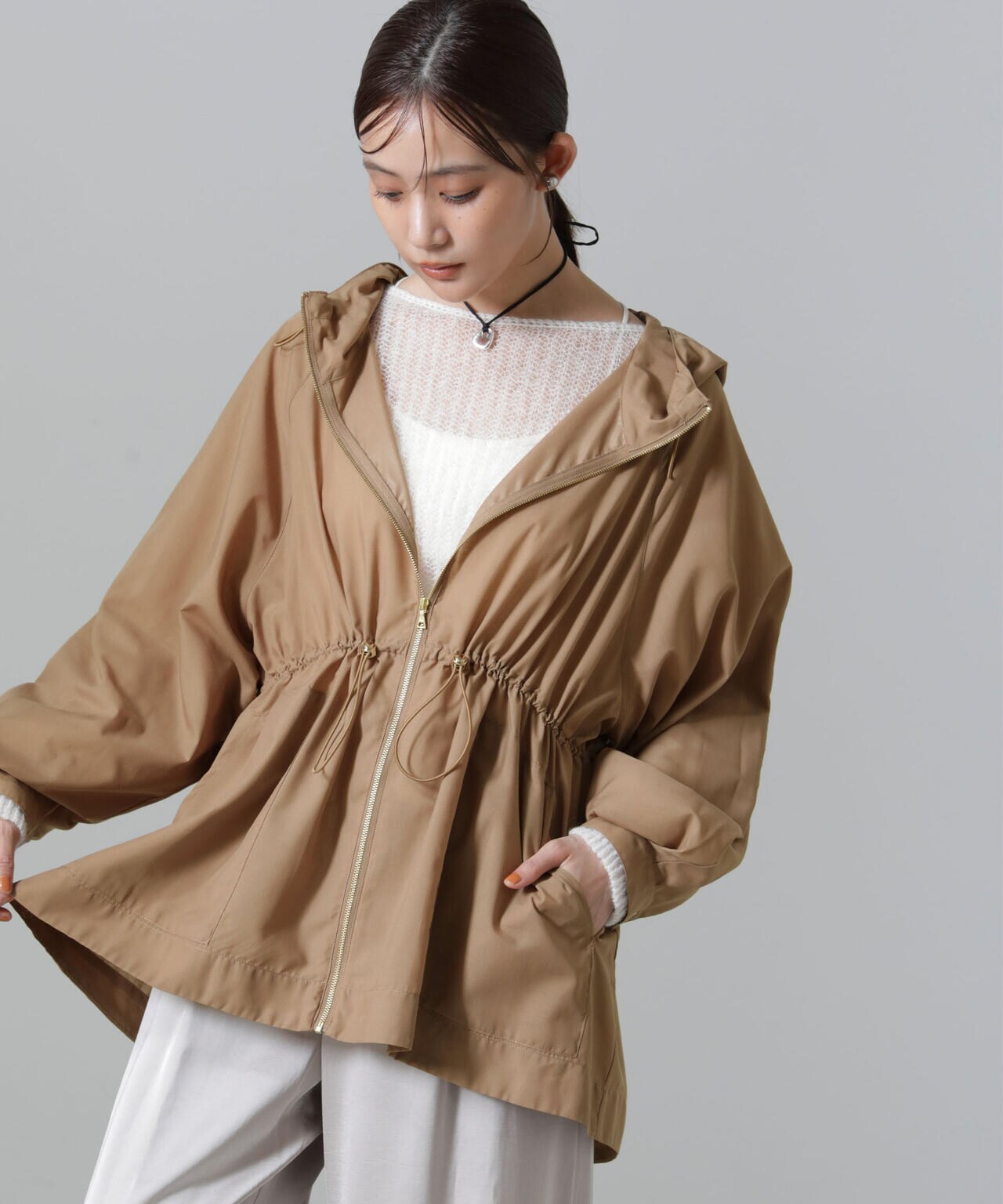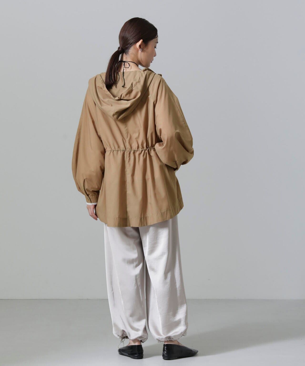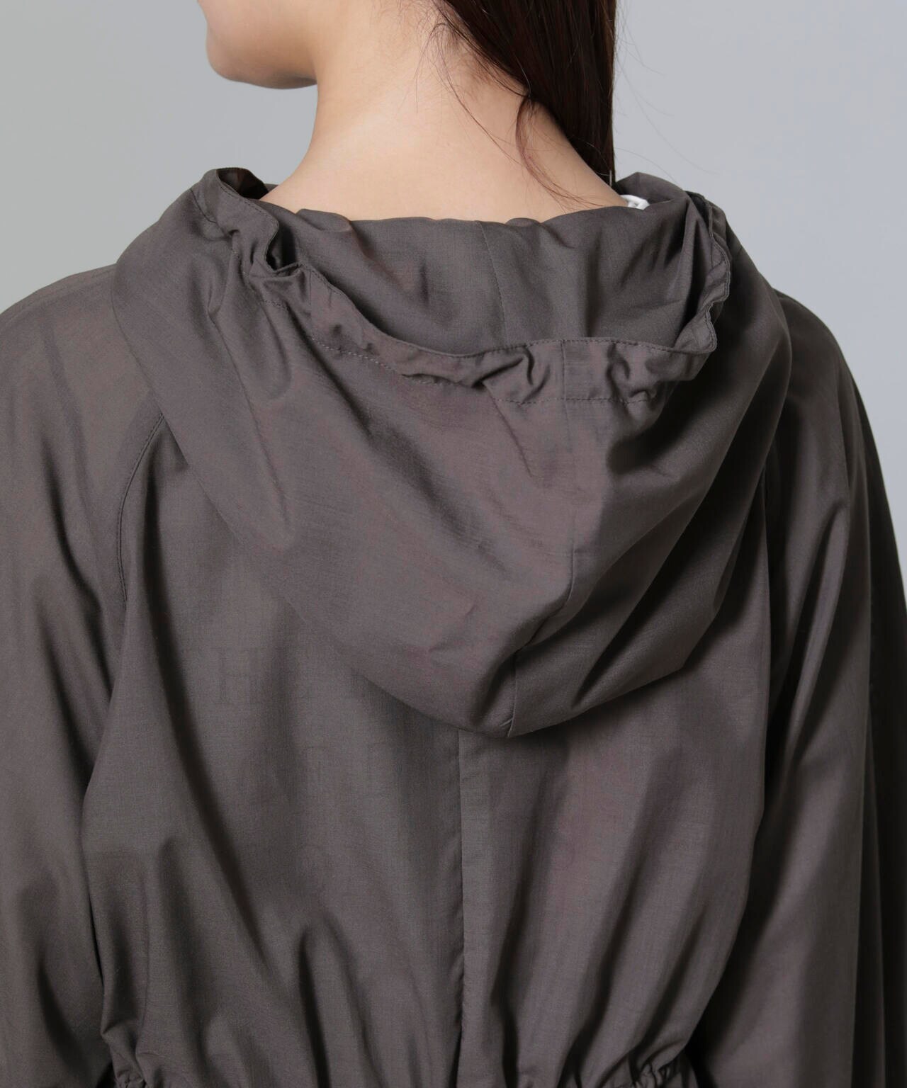 まだ暑い時期にサッと素肌の上から羽織れる新感覚ブルゾン。くたっとしたフードやゴールドパーツで大人スポーティな印象を与えてくれるアイテム。ウエストのドローコードで絞ってスタイリッシュにギャザー感の調節が可能です。袖口にはボタンが付いており、留めたままキュッとたくし上げても、外してシャツのようにロールアップするのも◎