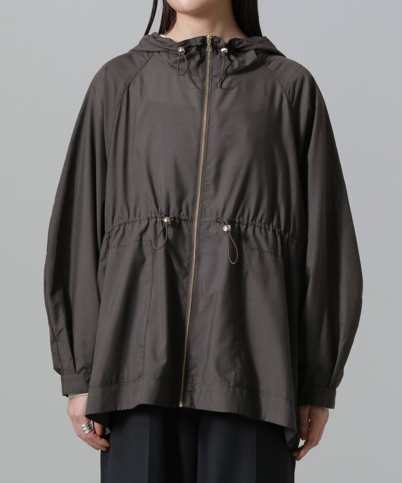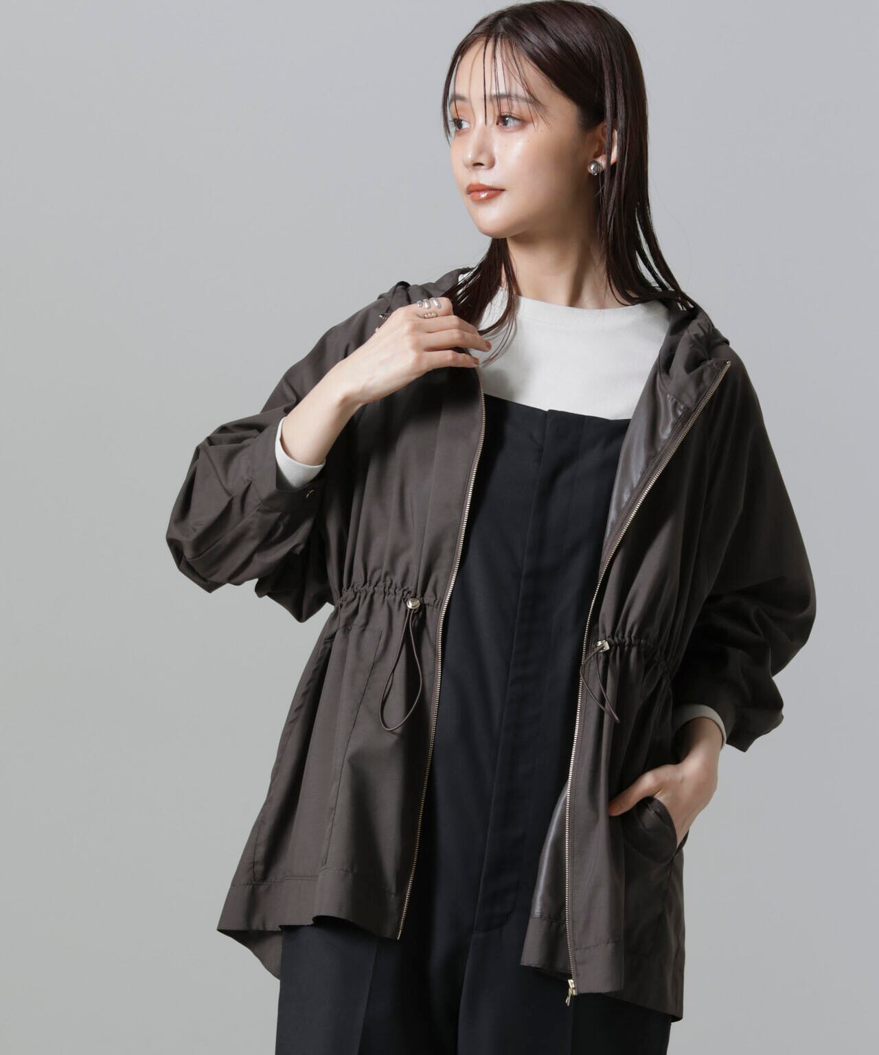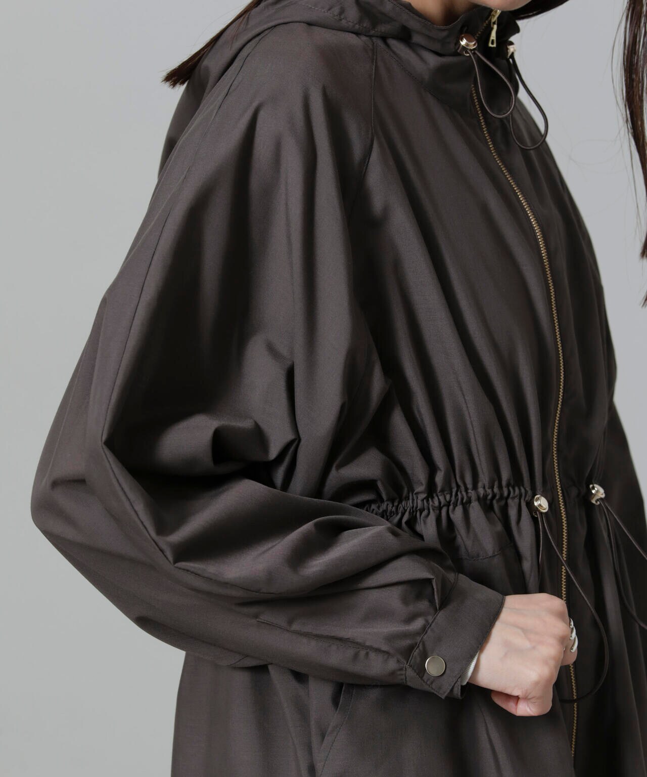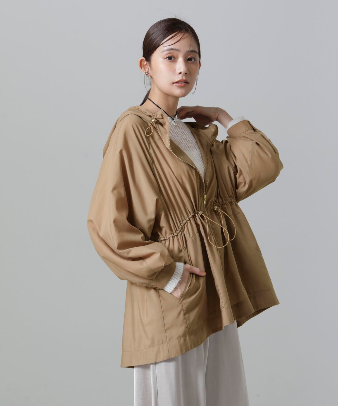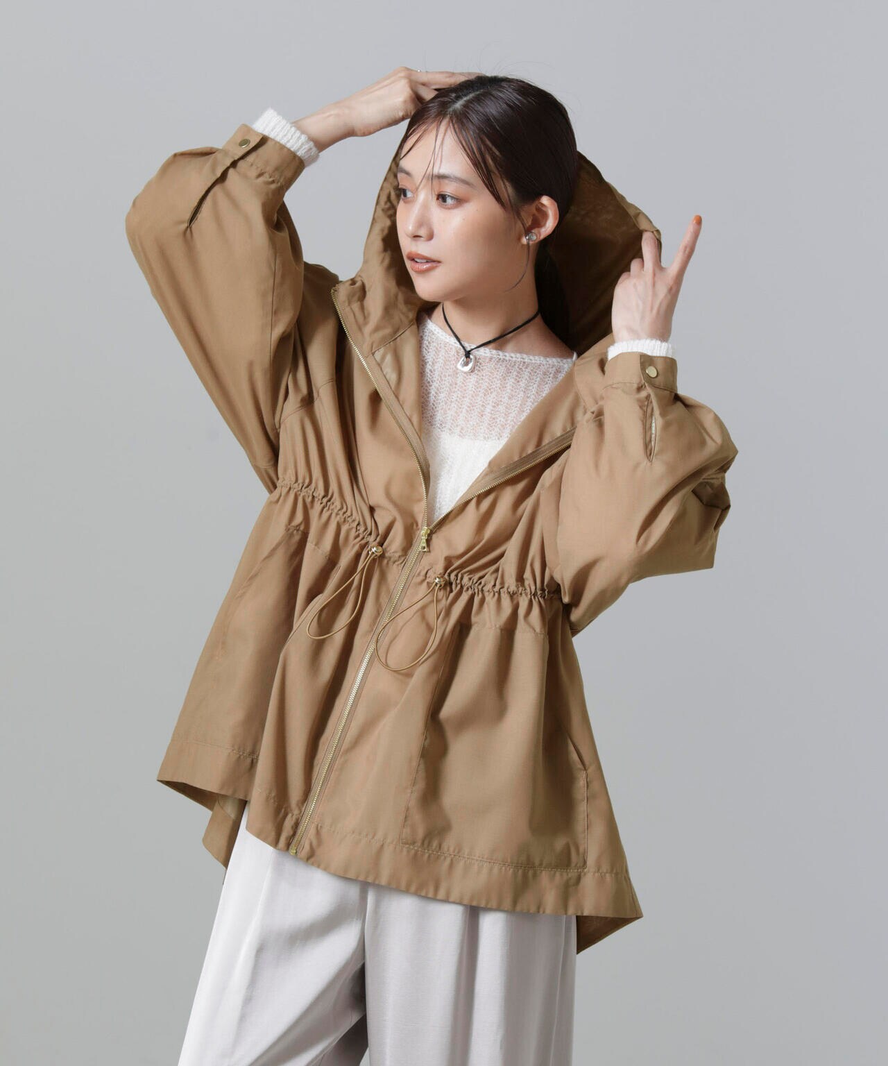 まだ暑い時期にサッと素肌の上から羽織れる新感覚ブルゾン。くたっとしたフードやゴールドパーツで大人スポーティな印象を与えてくれるアイテム。ウエストのドローコードで絞ってスタイリッシュにギャザー感の調節が可能です。袖口にはボタンが付いており、留めたままキュッとたくし上げても、外してシャツのようにロールアップするのも◎