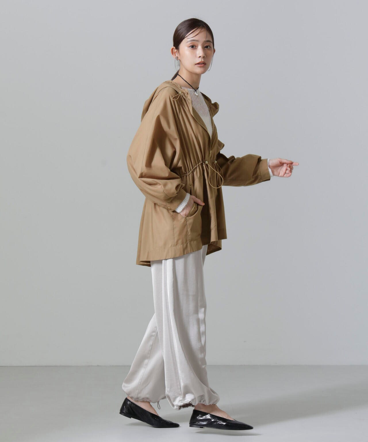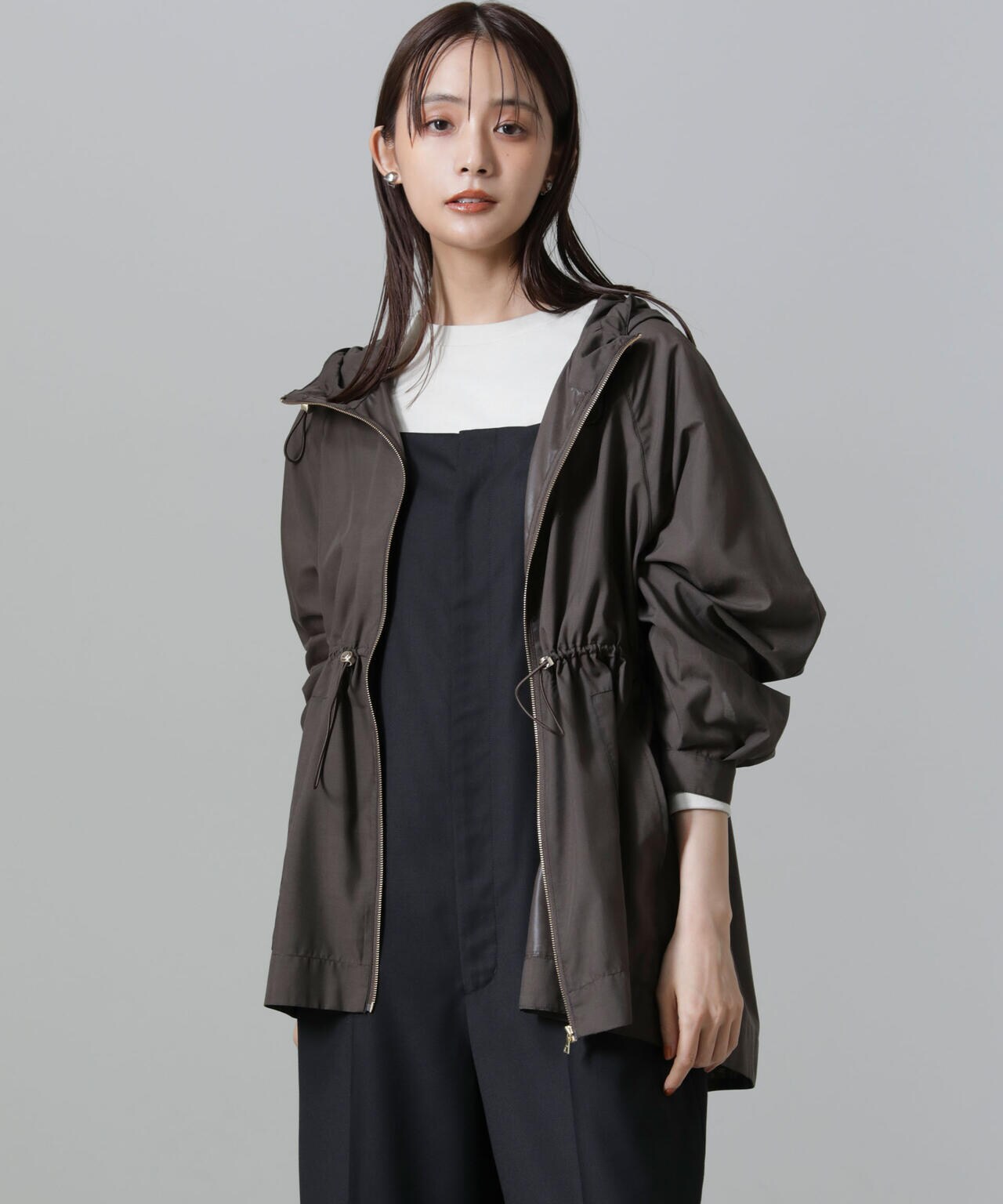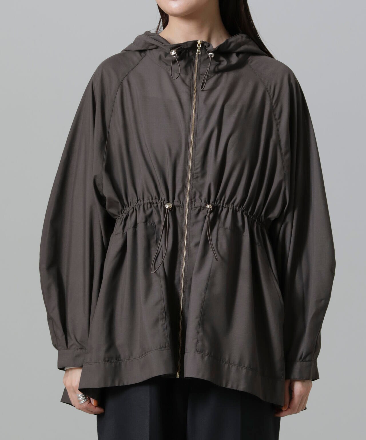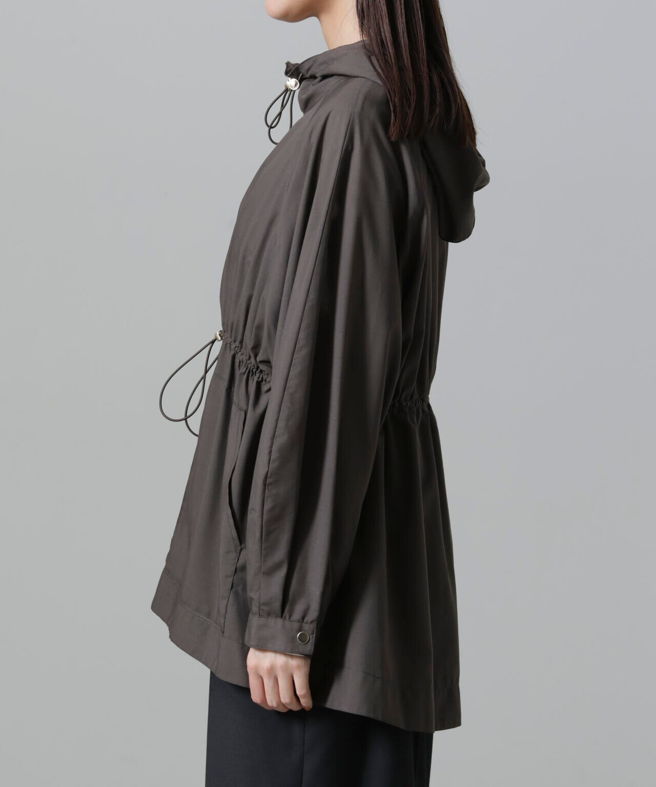 まだ暑い時期にサッと素肌の上から羽織れる新感覚ブルゾン。くたっとしたフードやゴールドパーツで大人スポーティな印象を与えてくれるアイテム。ウエストのドローコードで絞ってスタイリッシュにギャザー感の調節が可能です。袖口にはボタンが付いており、留めたままキュッとたくし上げても、外してシャツのようにロールアップするのも◎