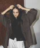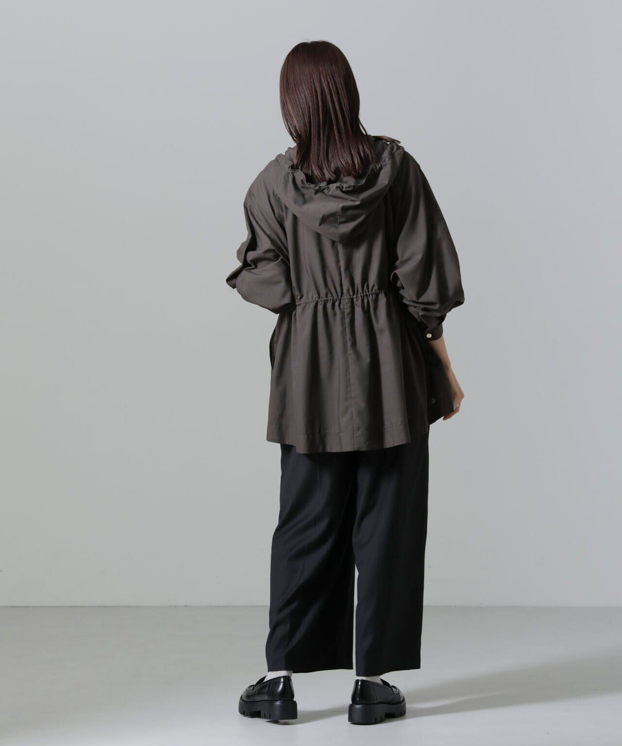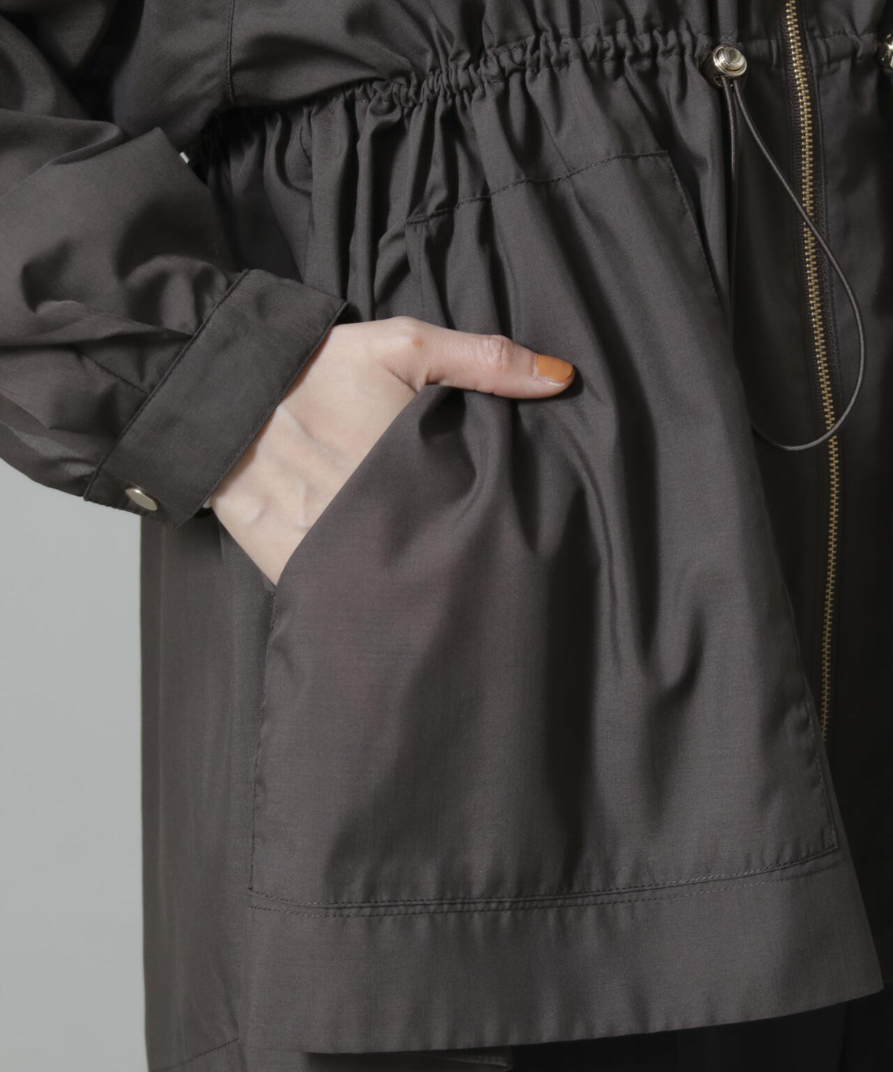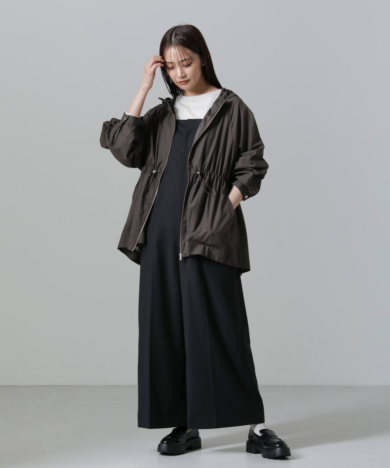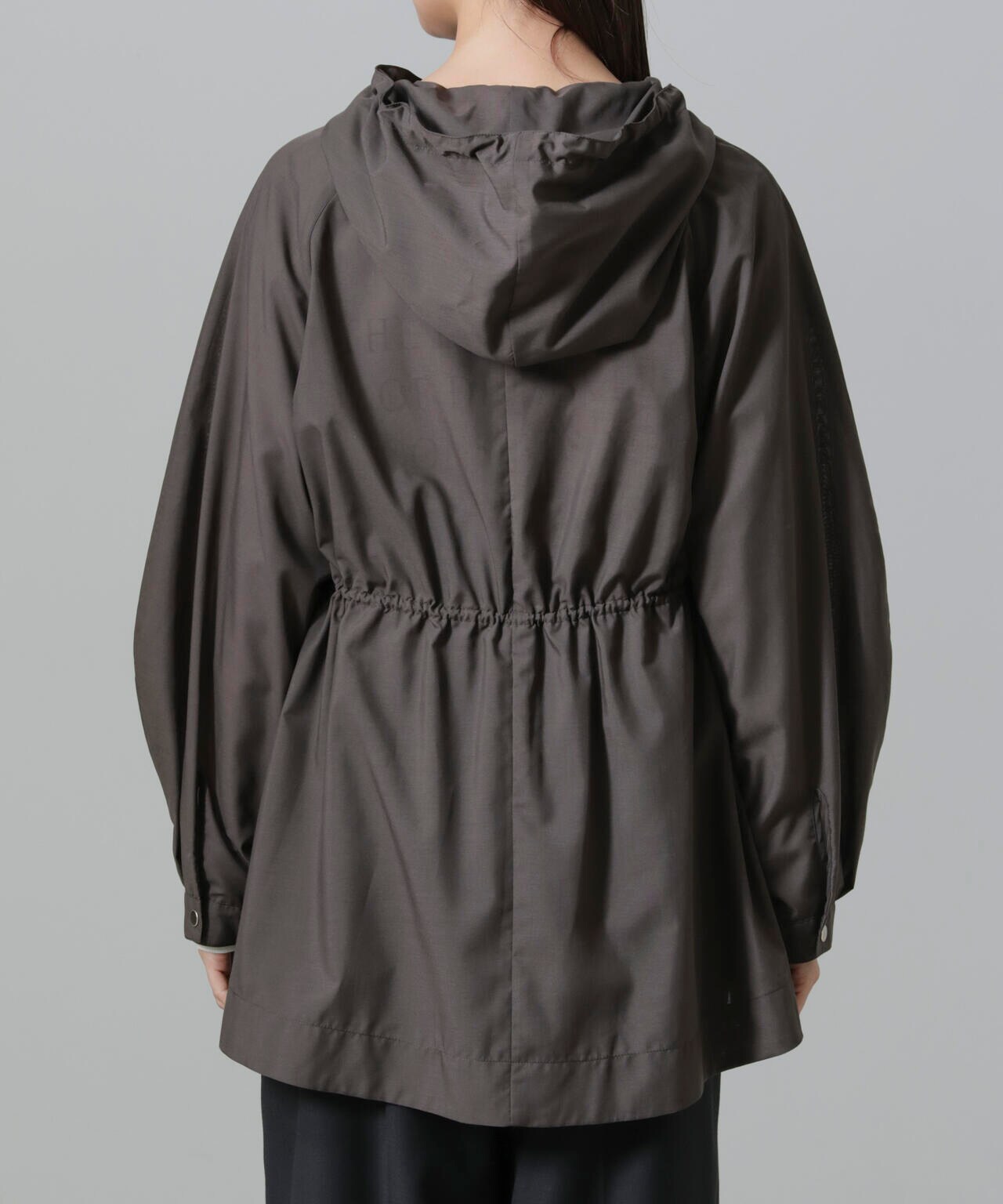 まだ暑い時期にサッと素肌の上から羽織れる新感覚ブルゾン。くたっとしたフードやゴールドパーツで大人スポーティな印象を与えてくれるアイテム。ウエストのドローコードで絞ってスタイリッシュにギャザー感の調節が可能です。袖口にはボタンが付いており、留めたままキュッとたくし上げても、外してシャツのようにロールアップするのも◎