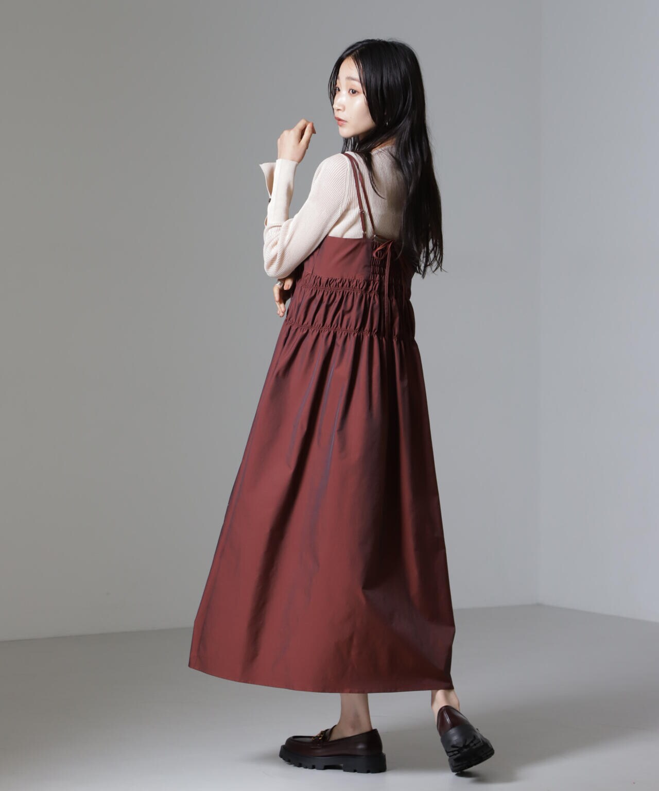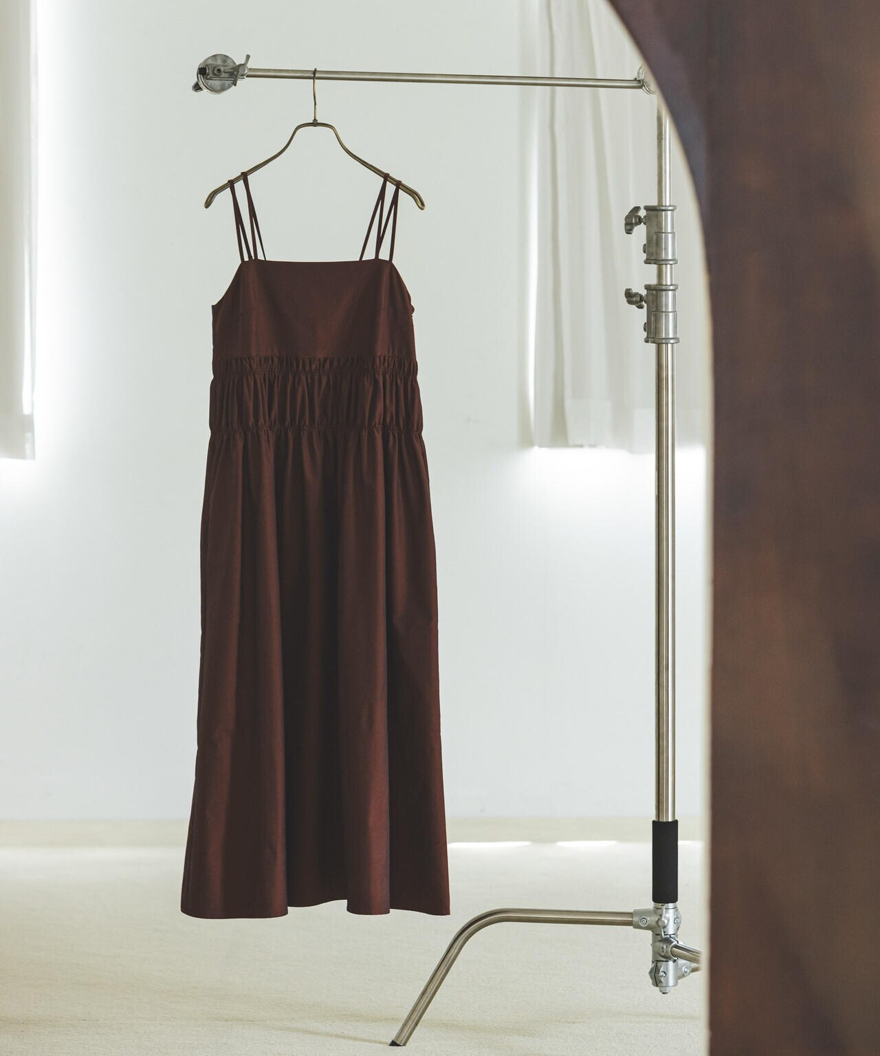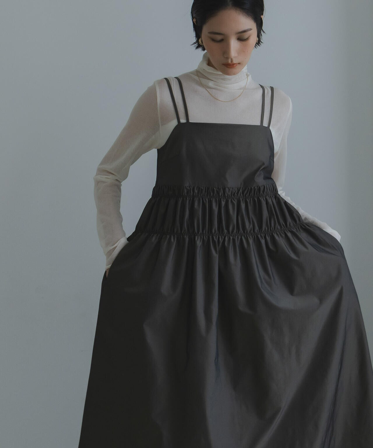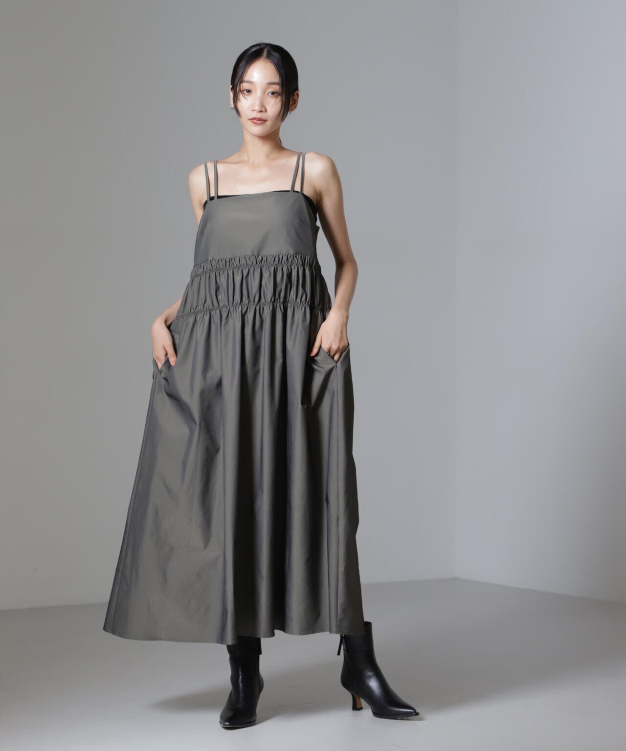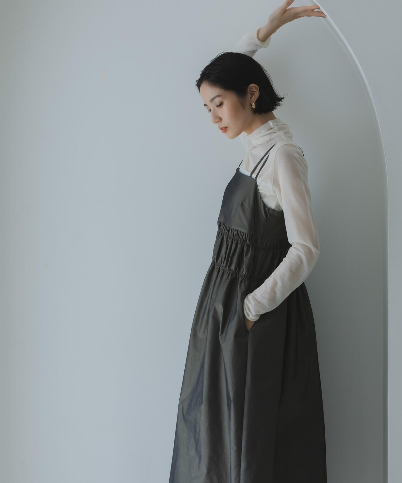 シャンブレータフタ生地を使用した季節問わず活躍するキャミワンピース。角度によって色の見え方が変わるので、カラーによって表情の違いを楽しめるアイテム。