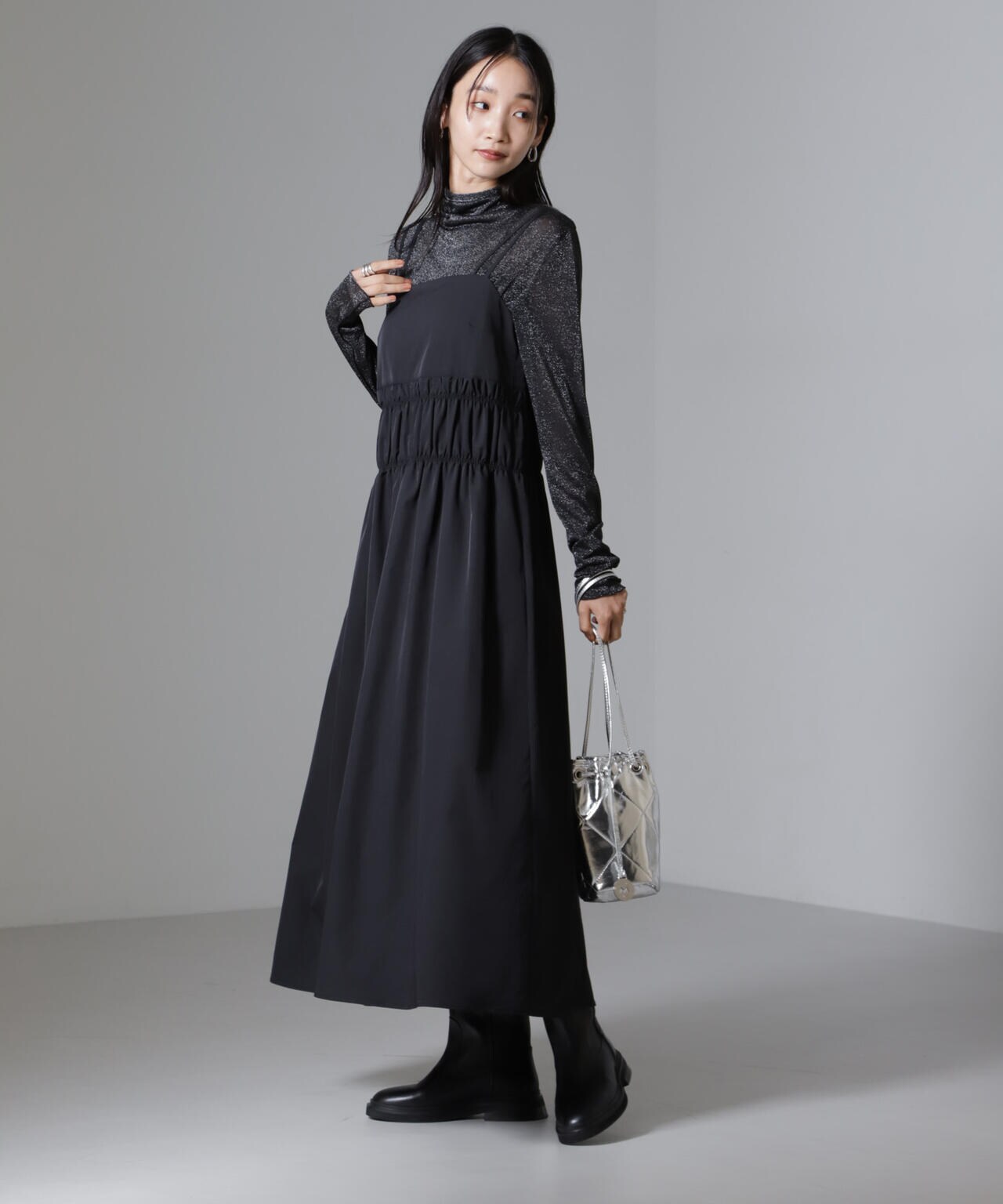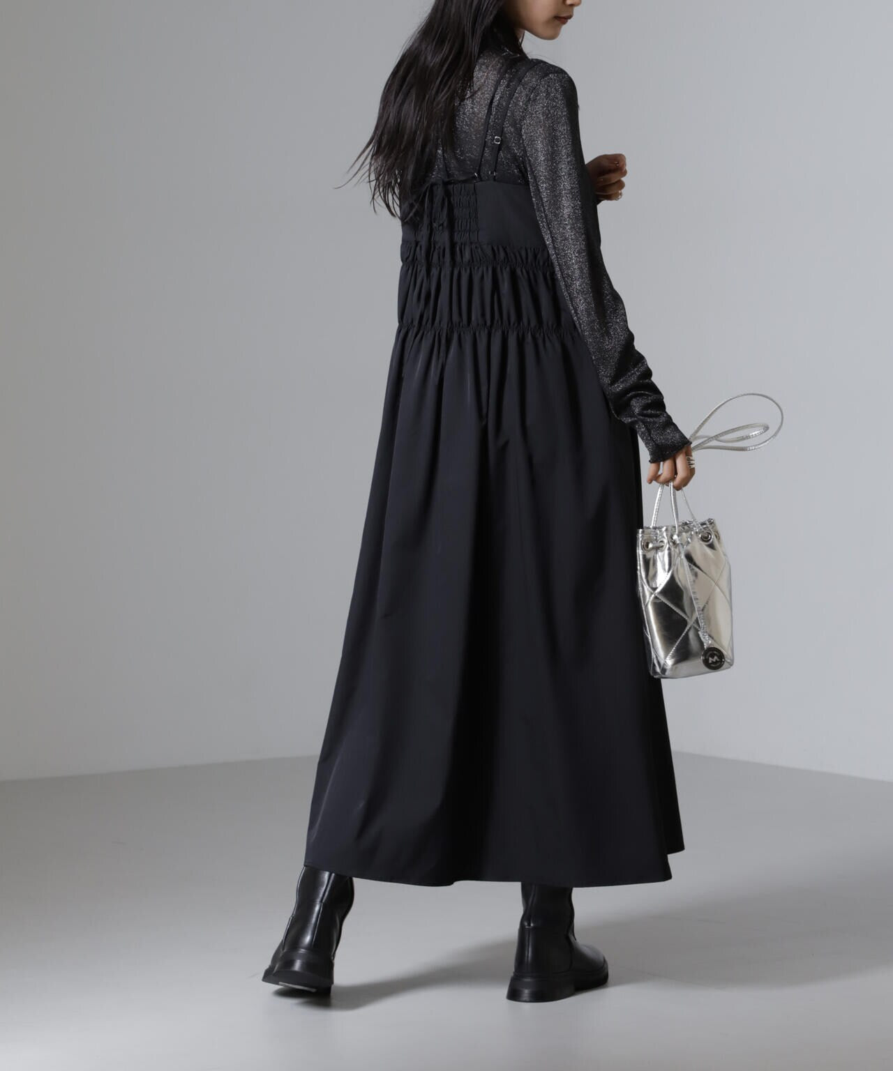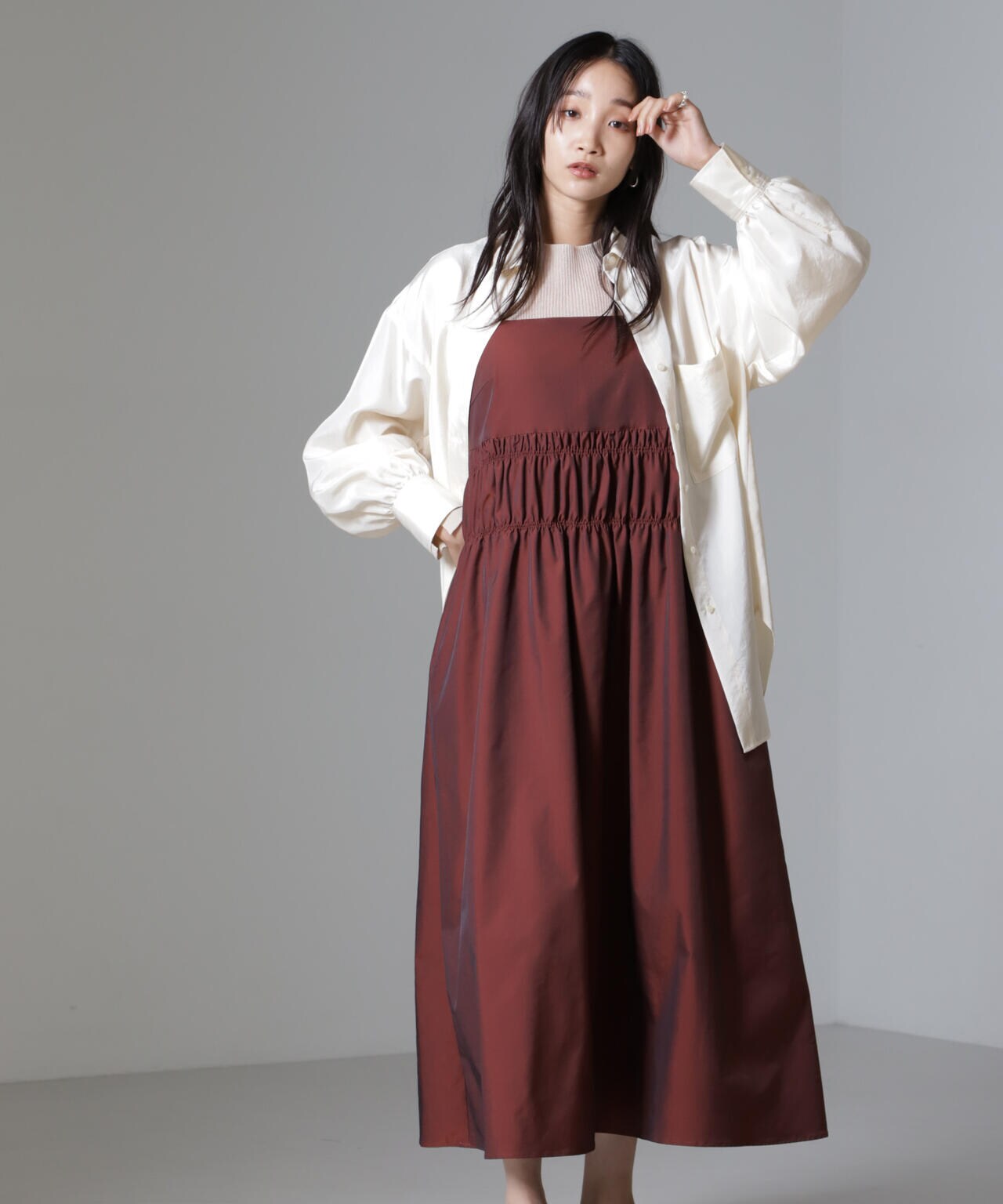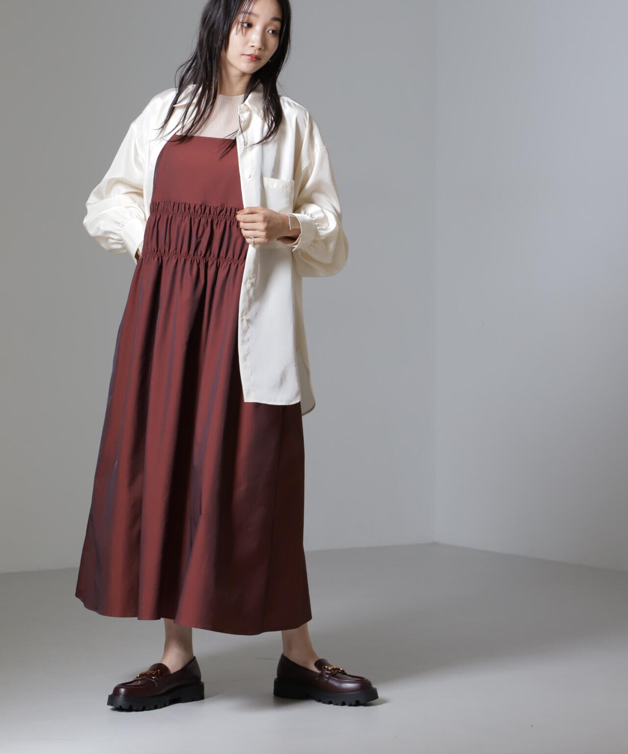 シャンブレータフタ生地を使用した季節問わず活躍するキャミワンピース。角度によって色の見え方が変わるので、カラーによって表情の違いを楽しめるアイテム。