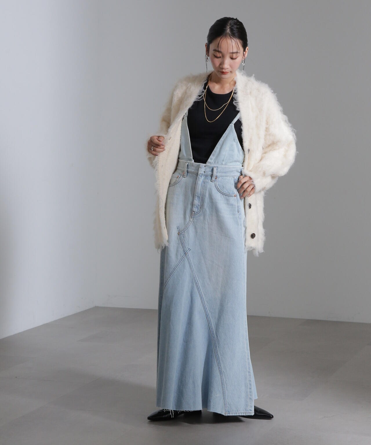 一点投入でお洒落なスタイリングが完成するリメイク風ジャンパースカート。女性らしさのあるタイトでややマーメイド感のあるシルエットと、カジュアルなリメイク風デザインのバランスが他にはない一着。シーズンレスでレイヤードを楽しめるアイテムです!