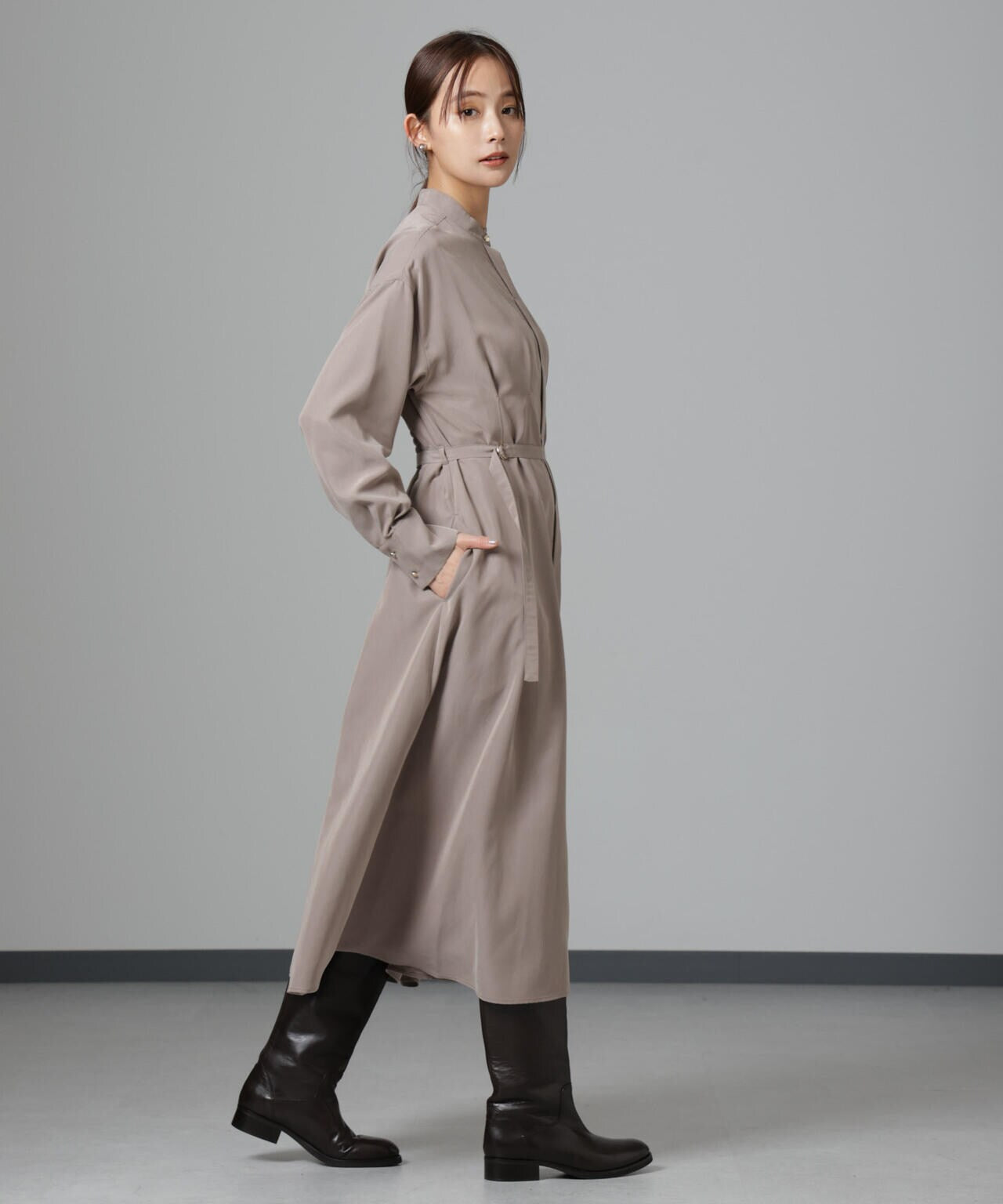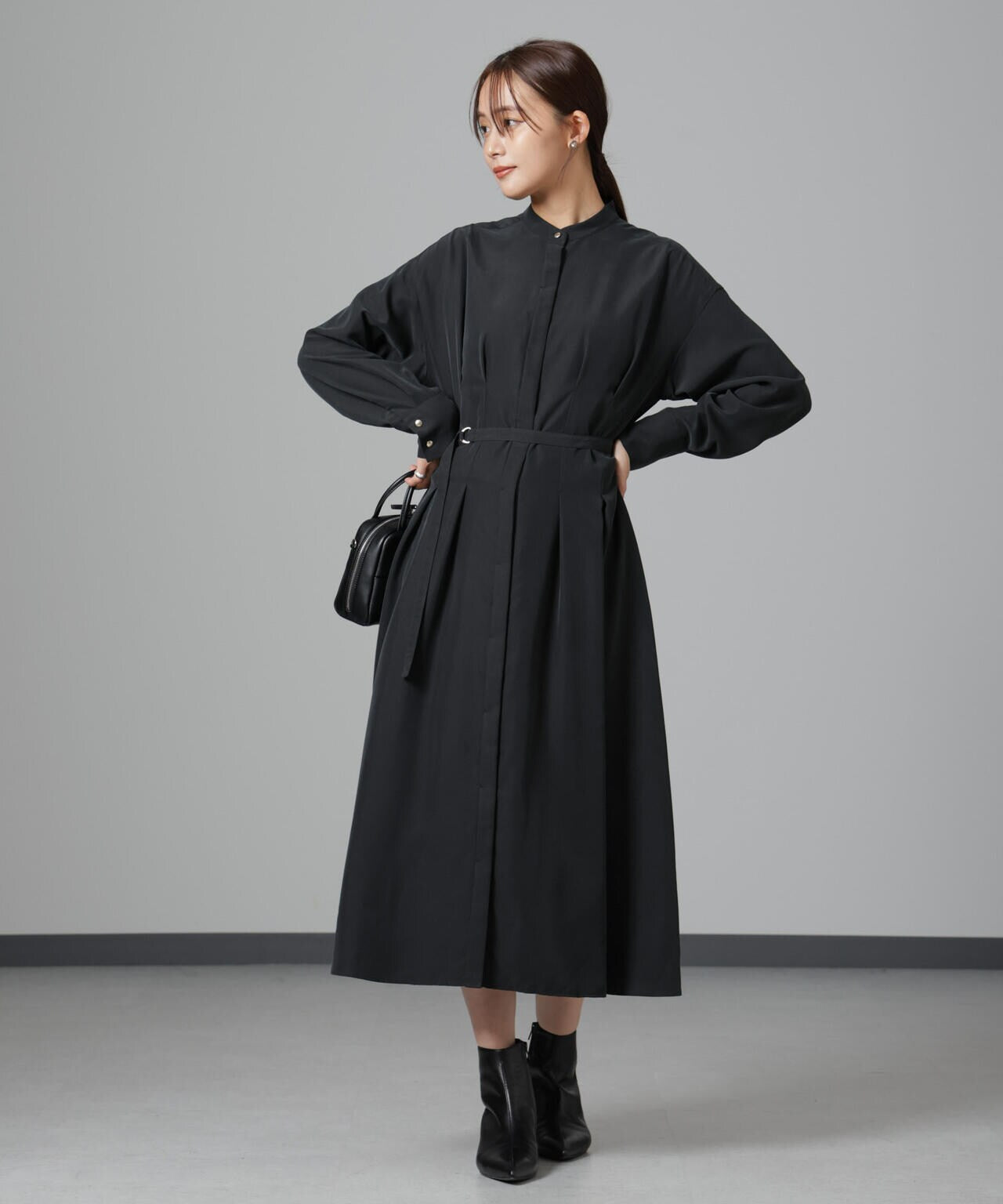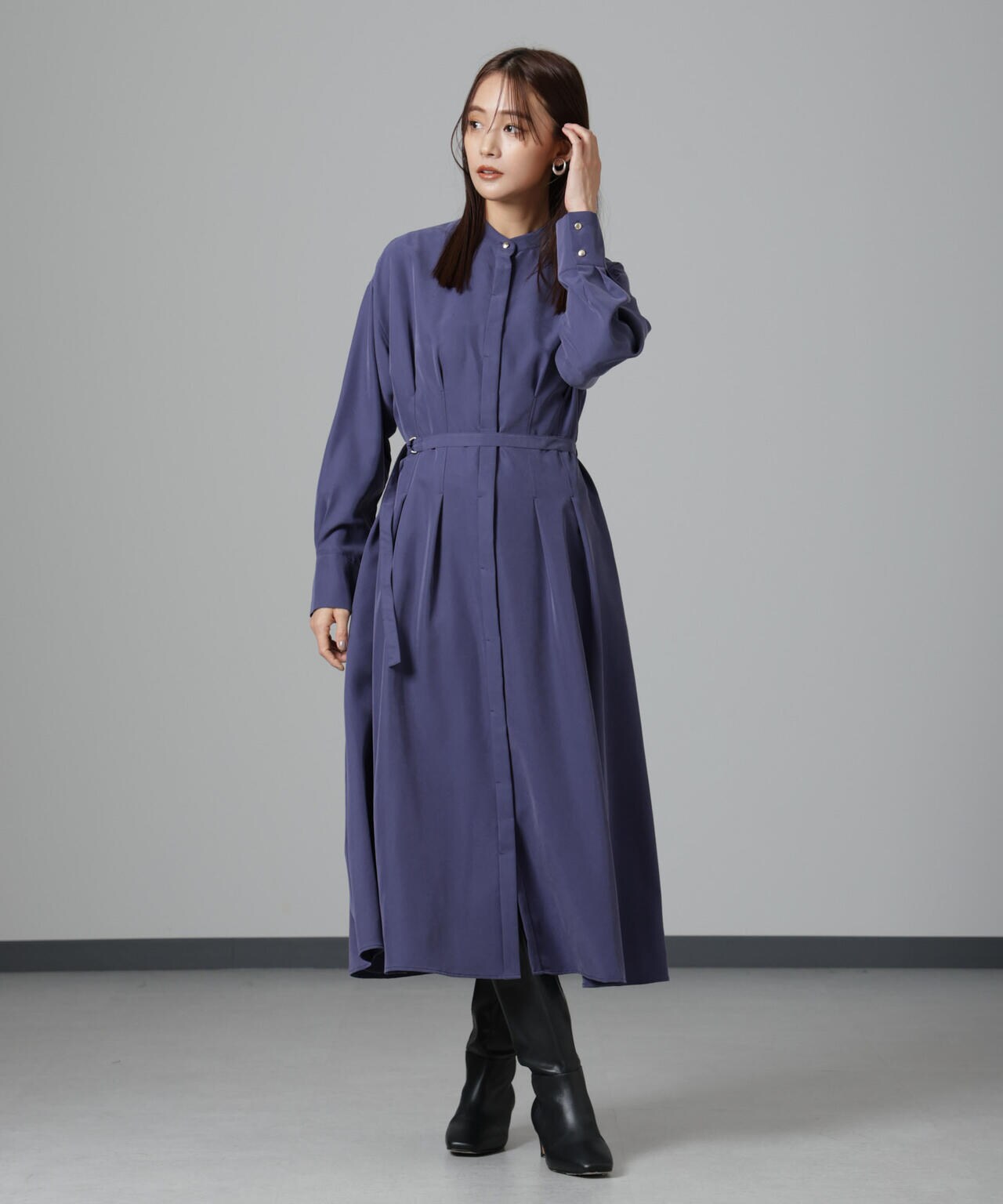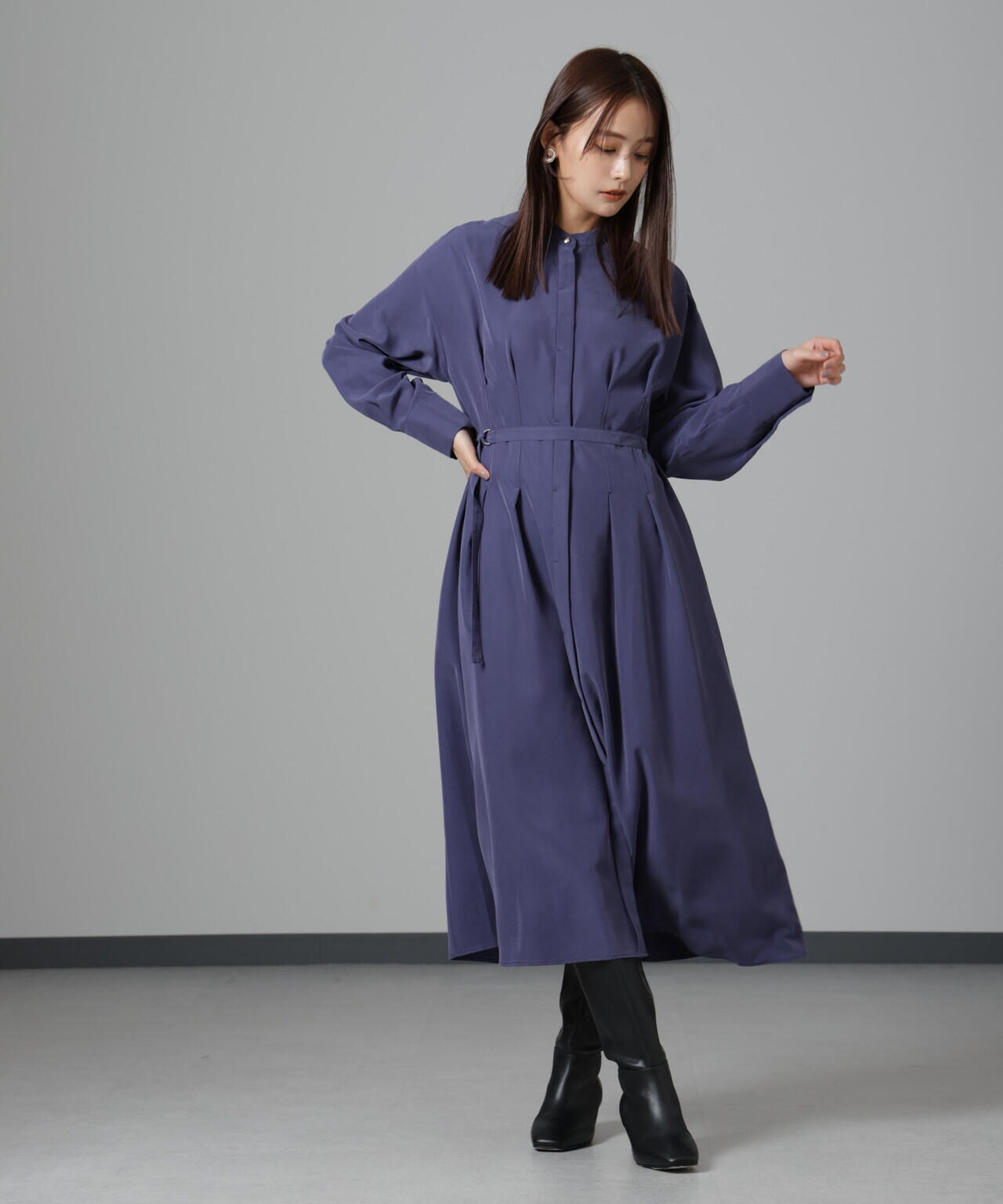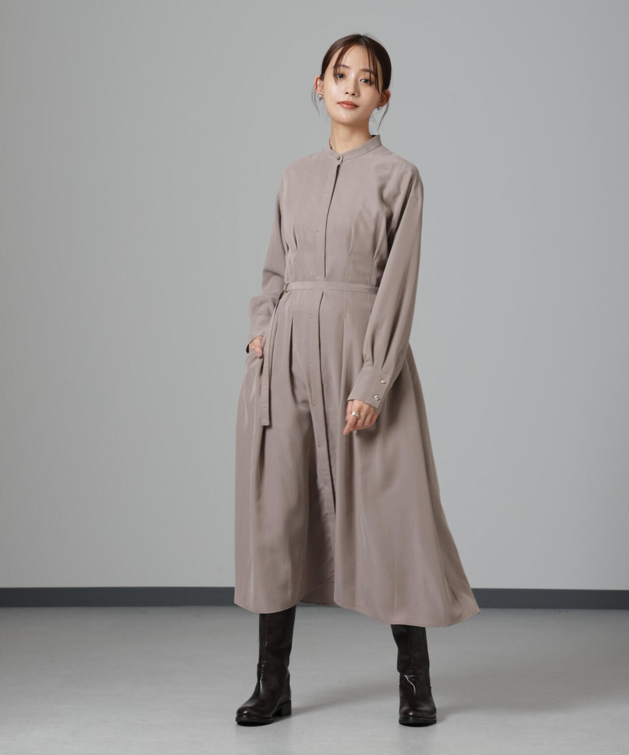 秋らしい素材感のスタンドカラーのベルト付きシャツ型ワンピース。ウエストは中縫いタックで程よくすっきり見えるようにシェイプされ、共生地の細ベルトでウエストマークで決まるきれいめなデザインです。