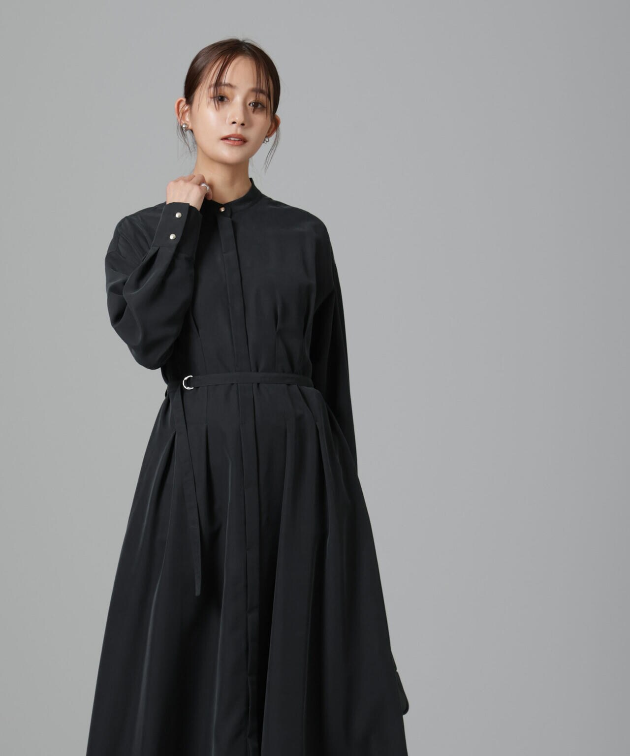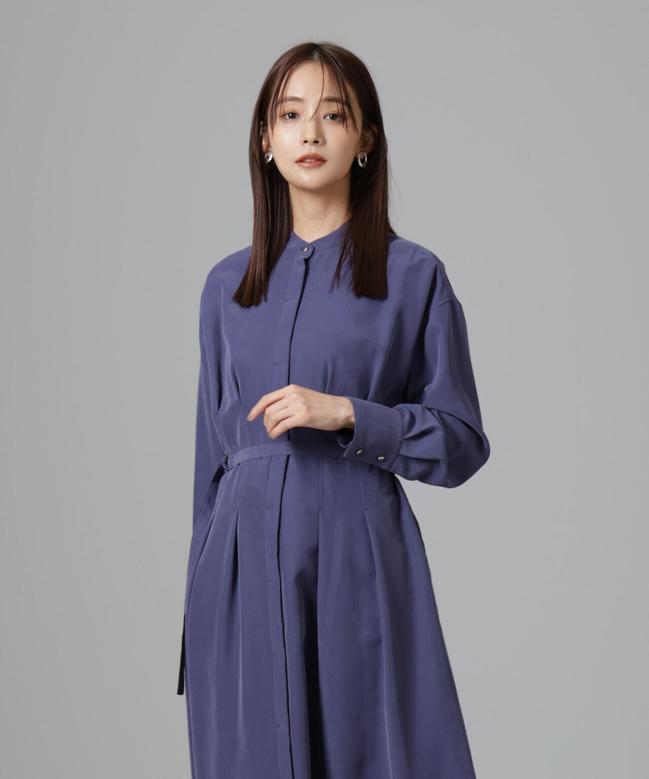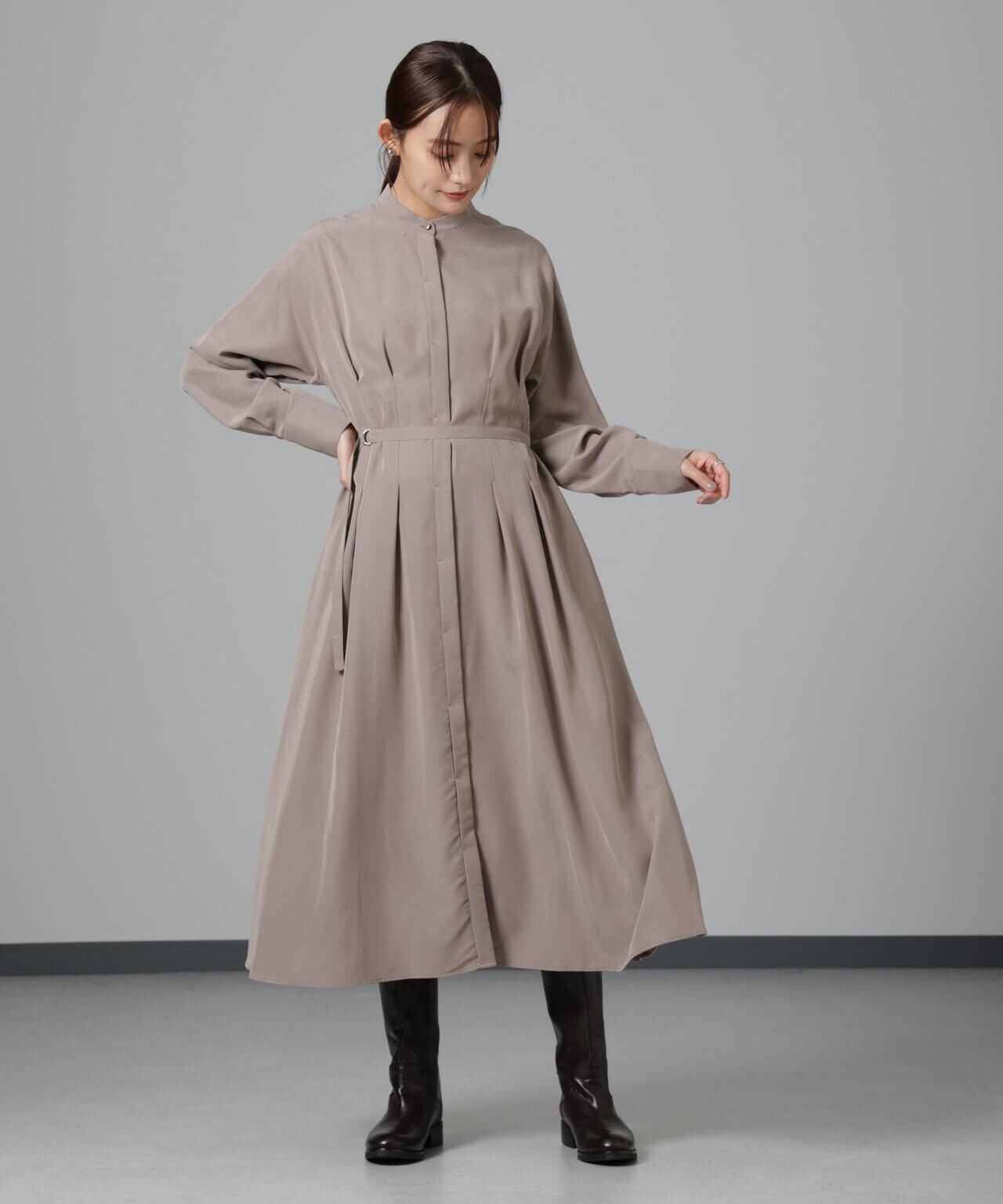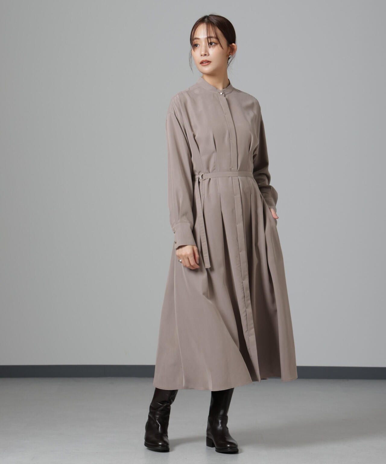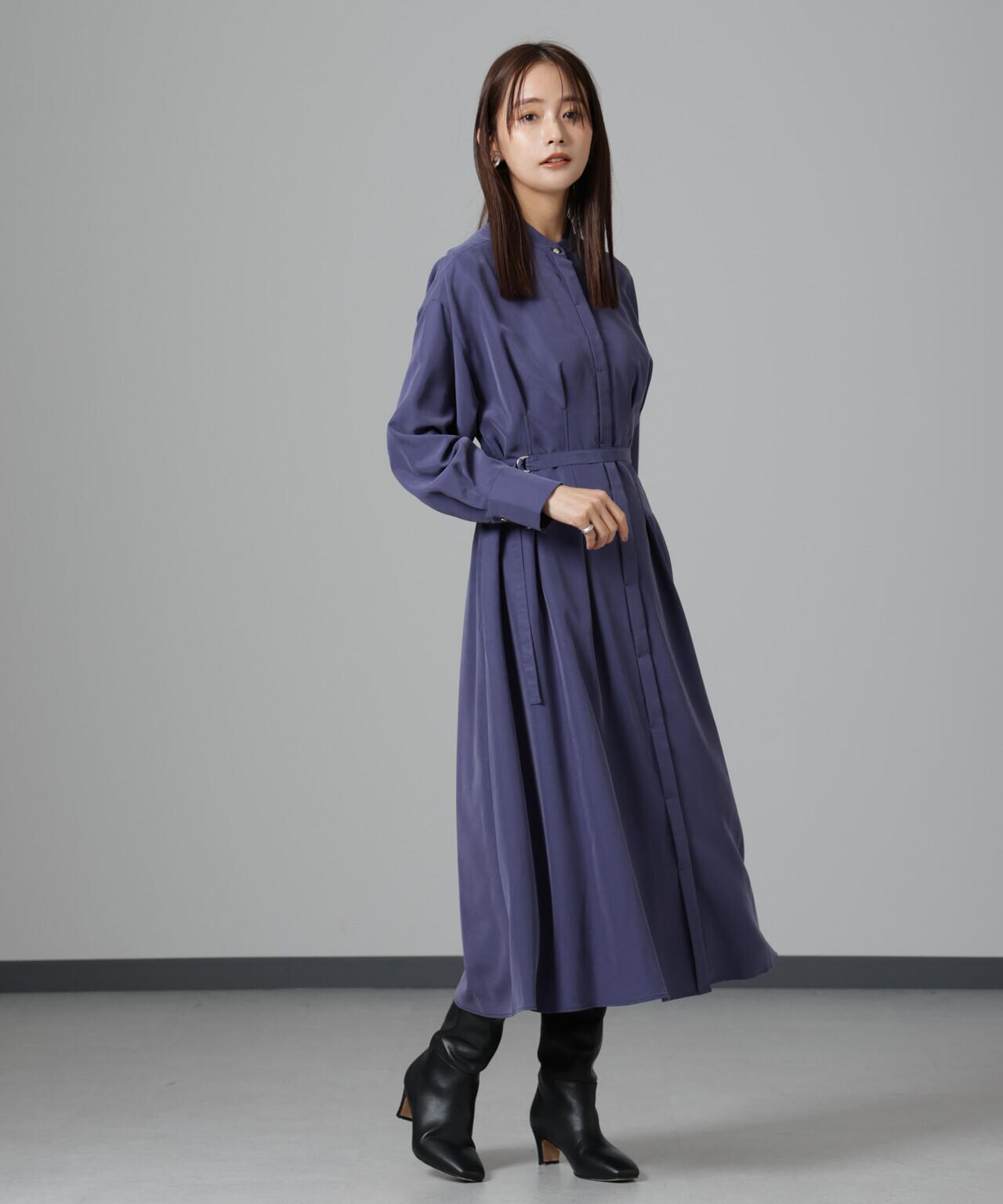 秋らしい素材感のスタンドカラーのベルト付きシャツ型ワンピース。ウエストは中縫いタックで程よくすっきり見えるようにシェイプされ、共生地の細ベルトでウエストマークで決まるきれいめなデザインです。