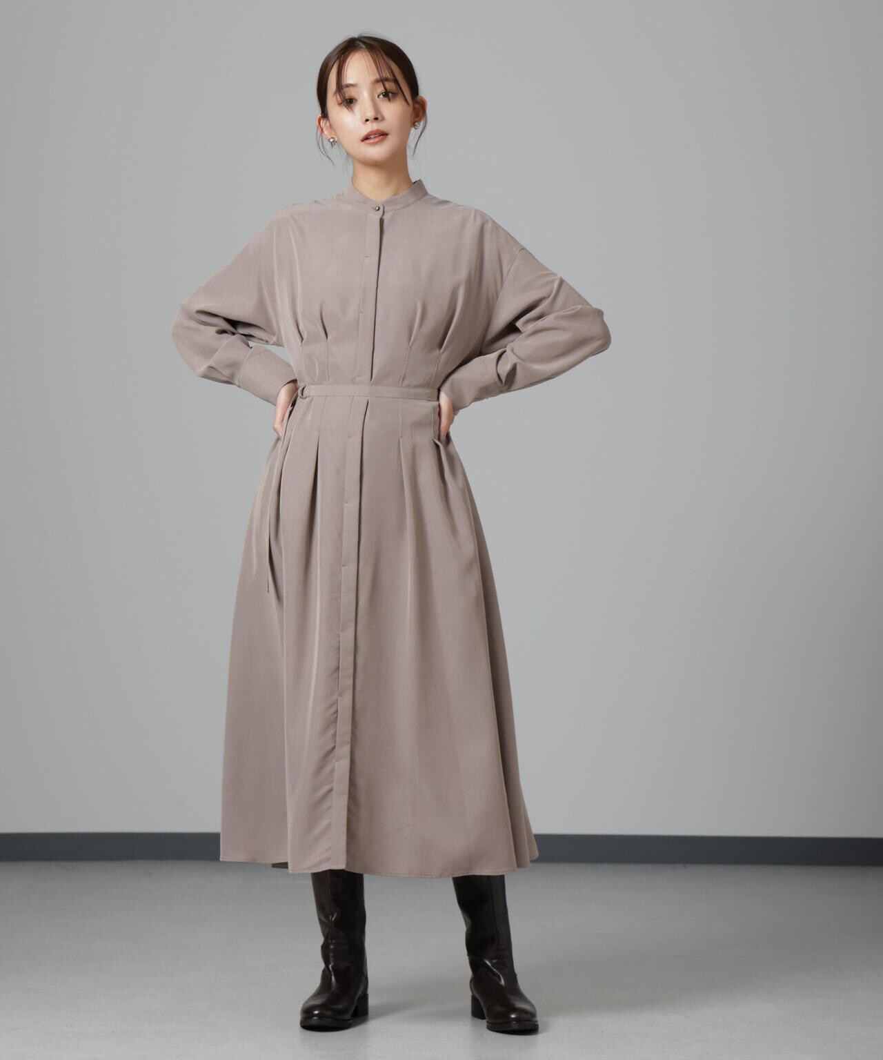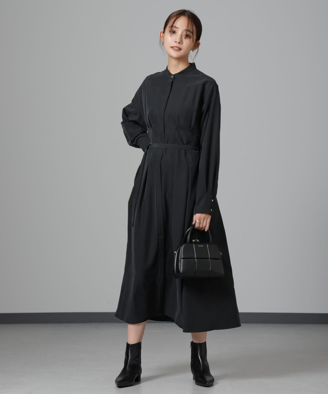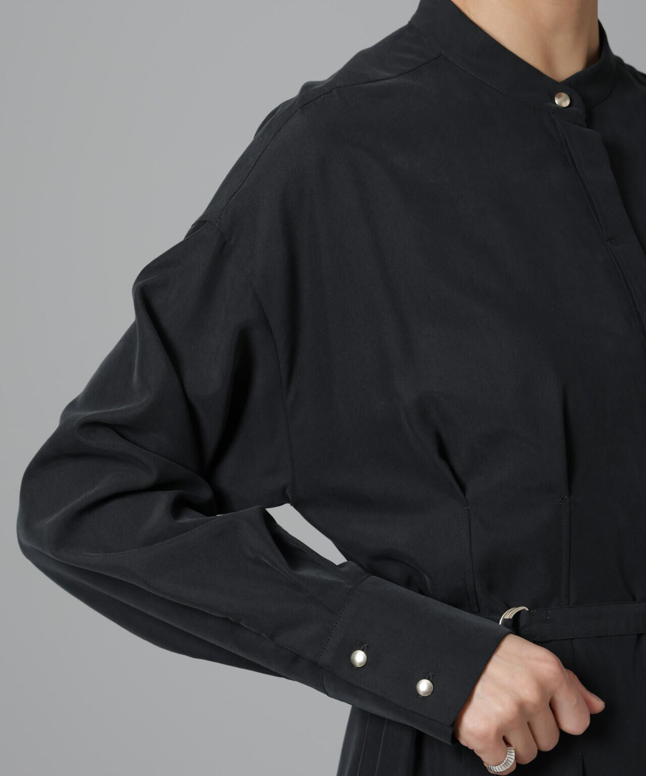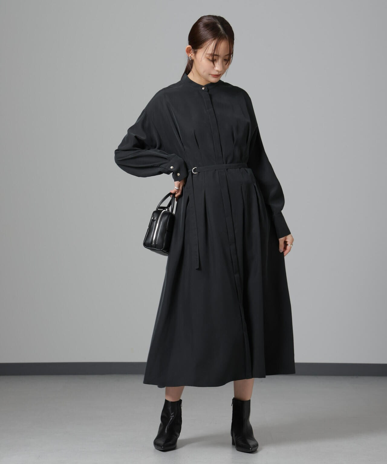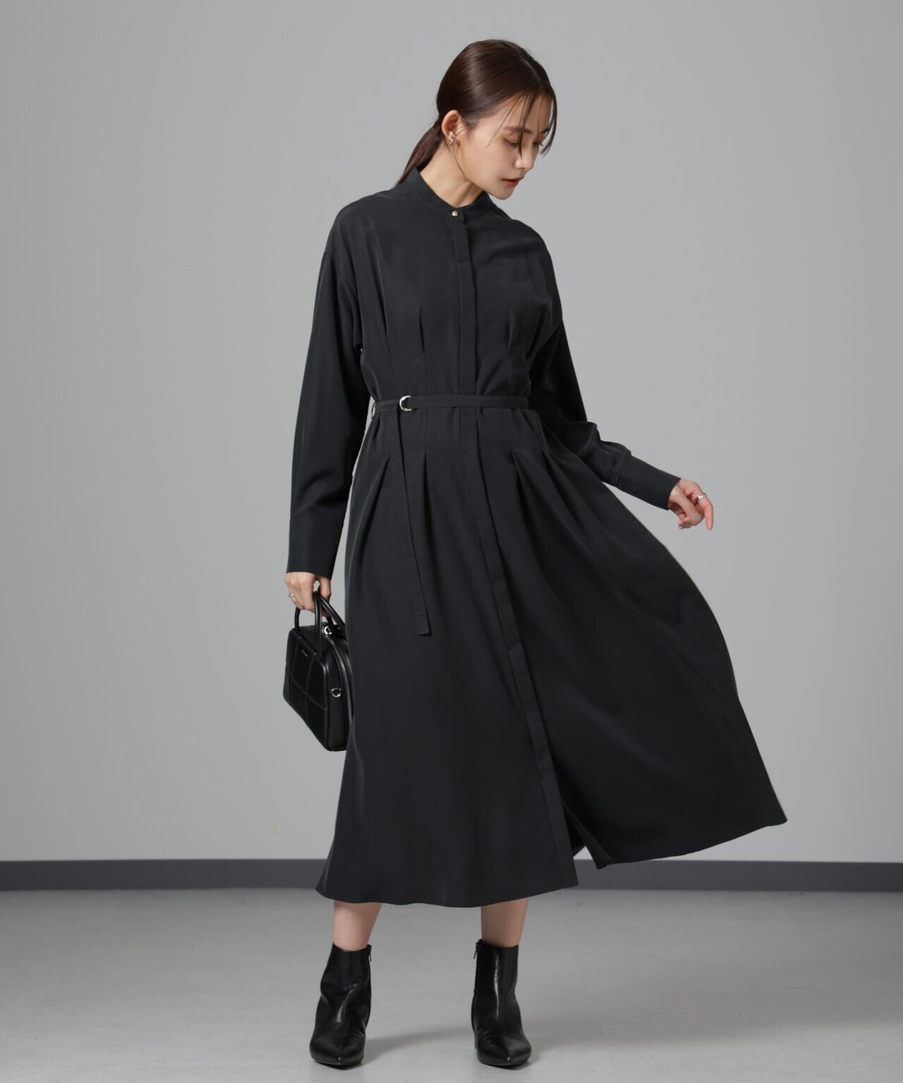 秋らしい素材感のスタンドカラーのベルト付きシャツ型ワンピース。ウエストは中縫いタックで程よくすっきり見えるようにシェイプされ、共生地の細ベルトでウエストマークで決まるきれいめなデザインです。