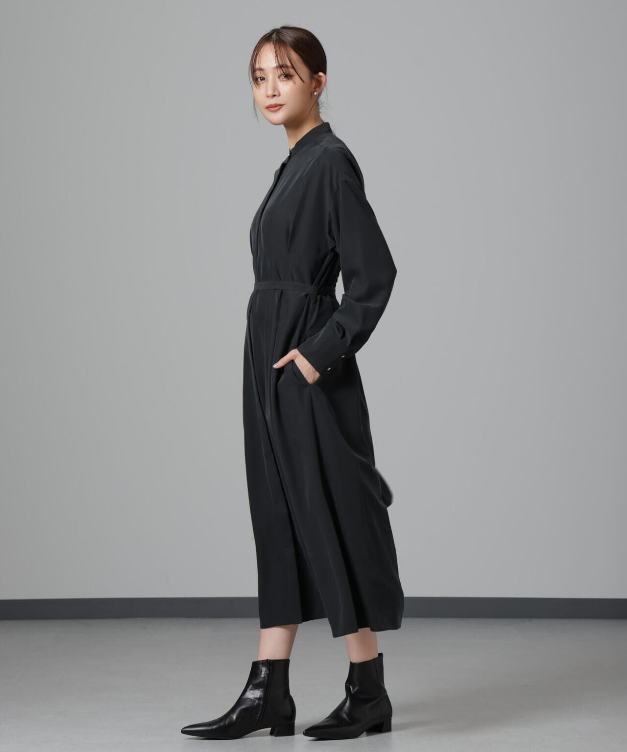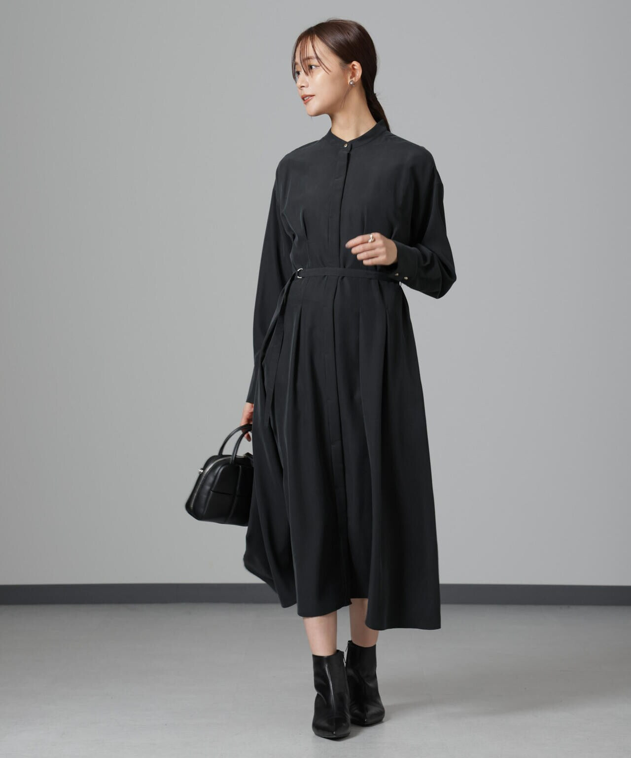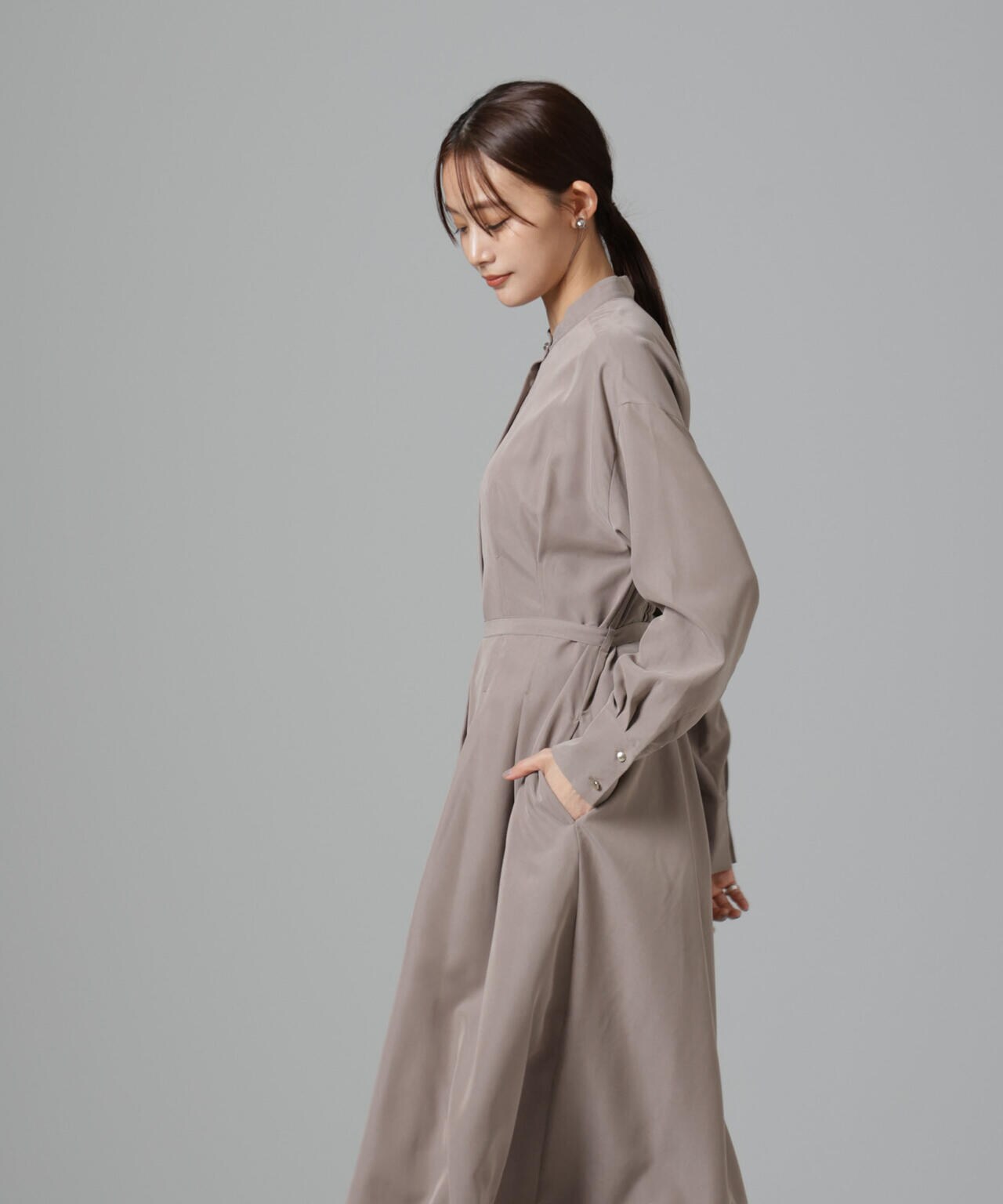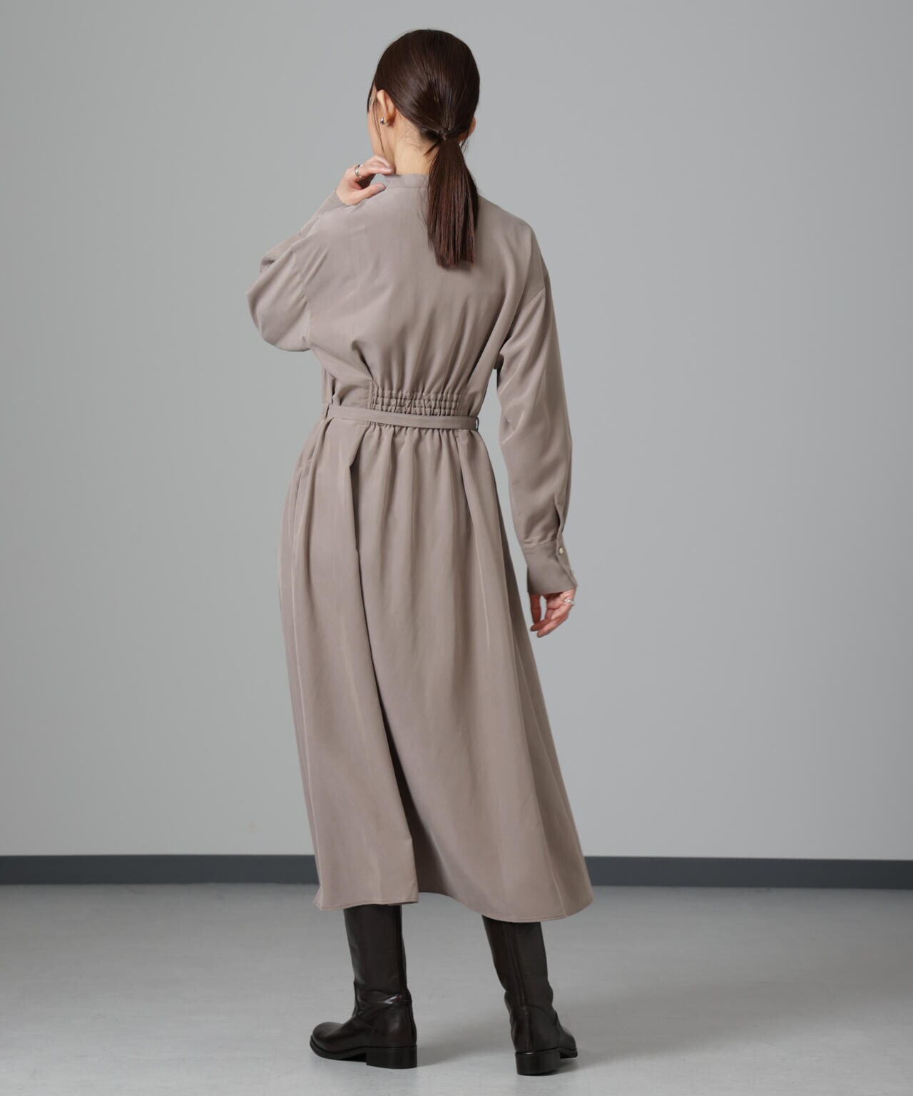 秋らしい素材感のスタンドカラーのベルト付きシャツ型ワンピース。ウエストは中縫いタックで程よくすっきり見えるようにシェイプされ、共生地の細ベルトでウエストマークで決まるきれいめなデザインです。