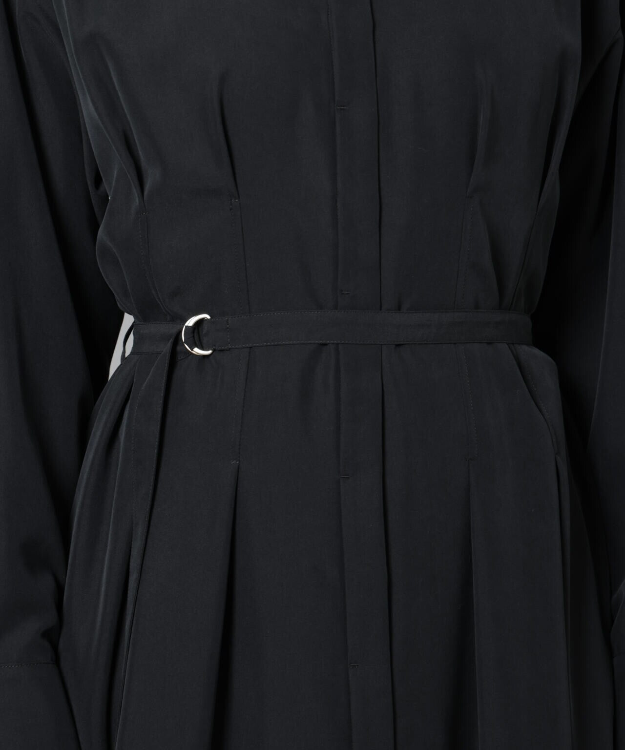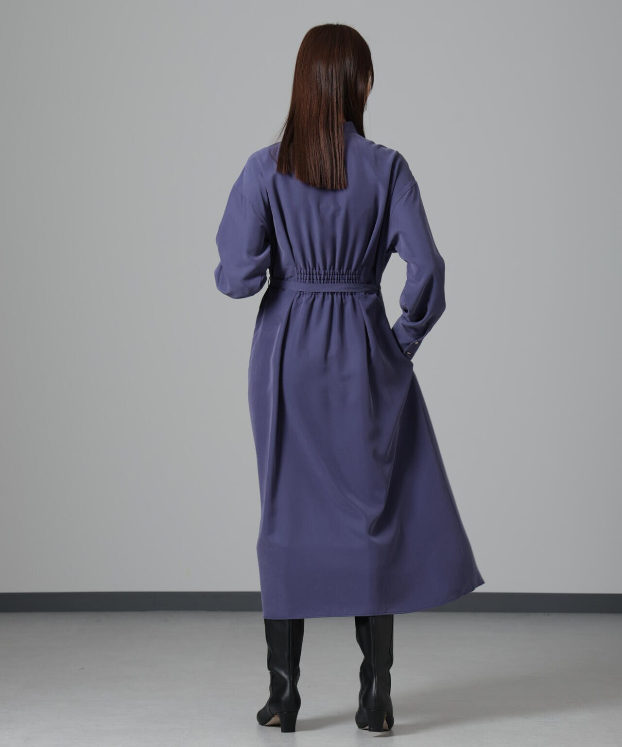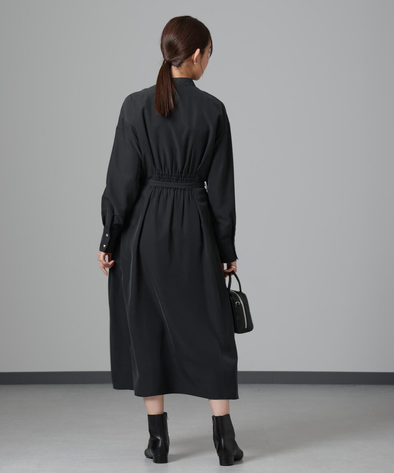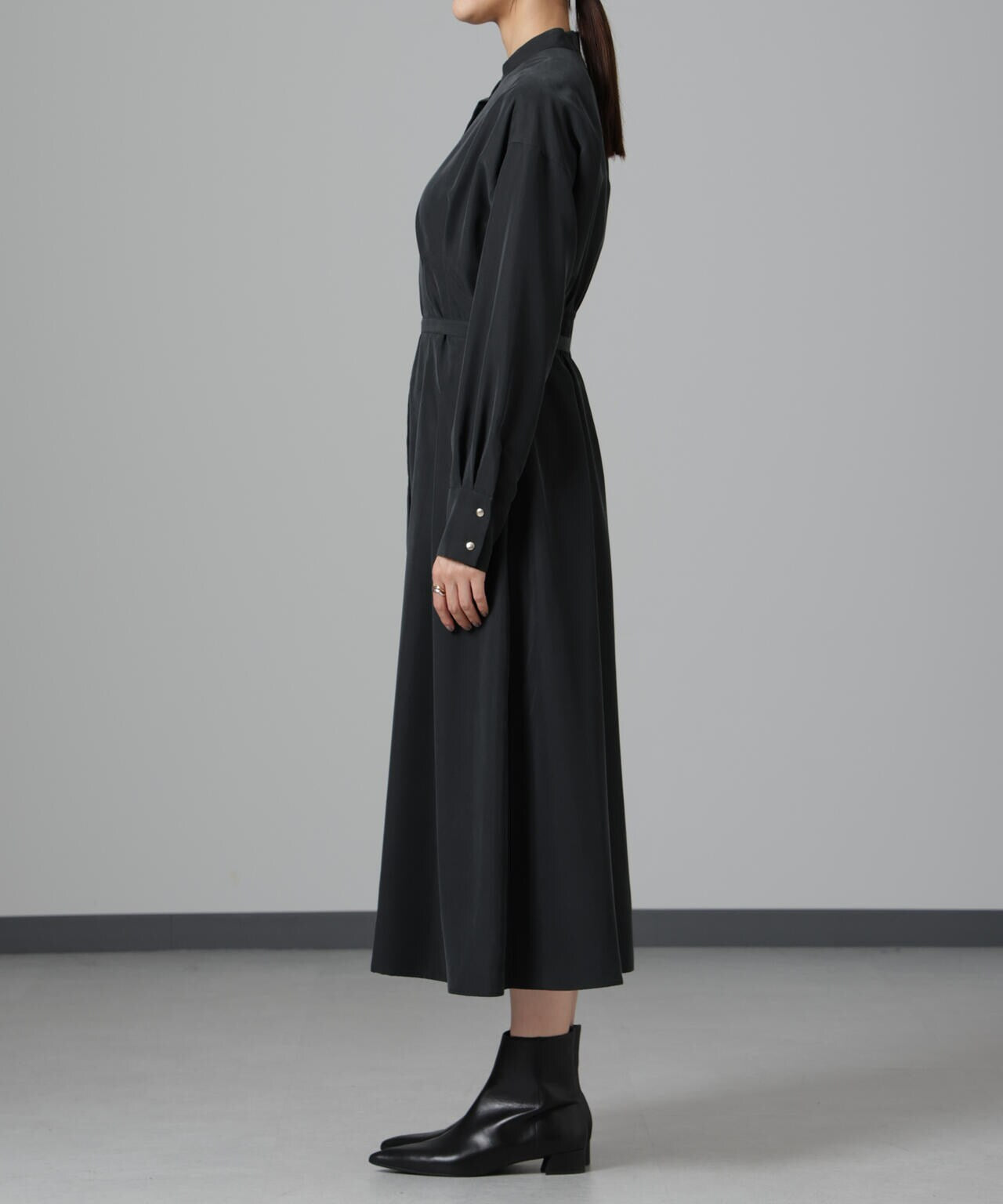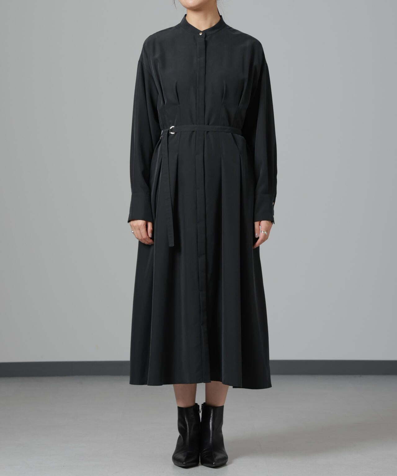 秋らしい素材感のスタンドカラーのベルト付きシャツ型ワンピース。ウエストは中縫いタックで程よくすっきり見えるようにシェイプされ、共生地の細ベルトでウエストマークで決まるきれいめなデザインです。