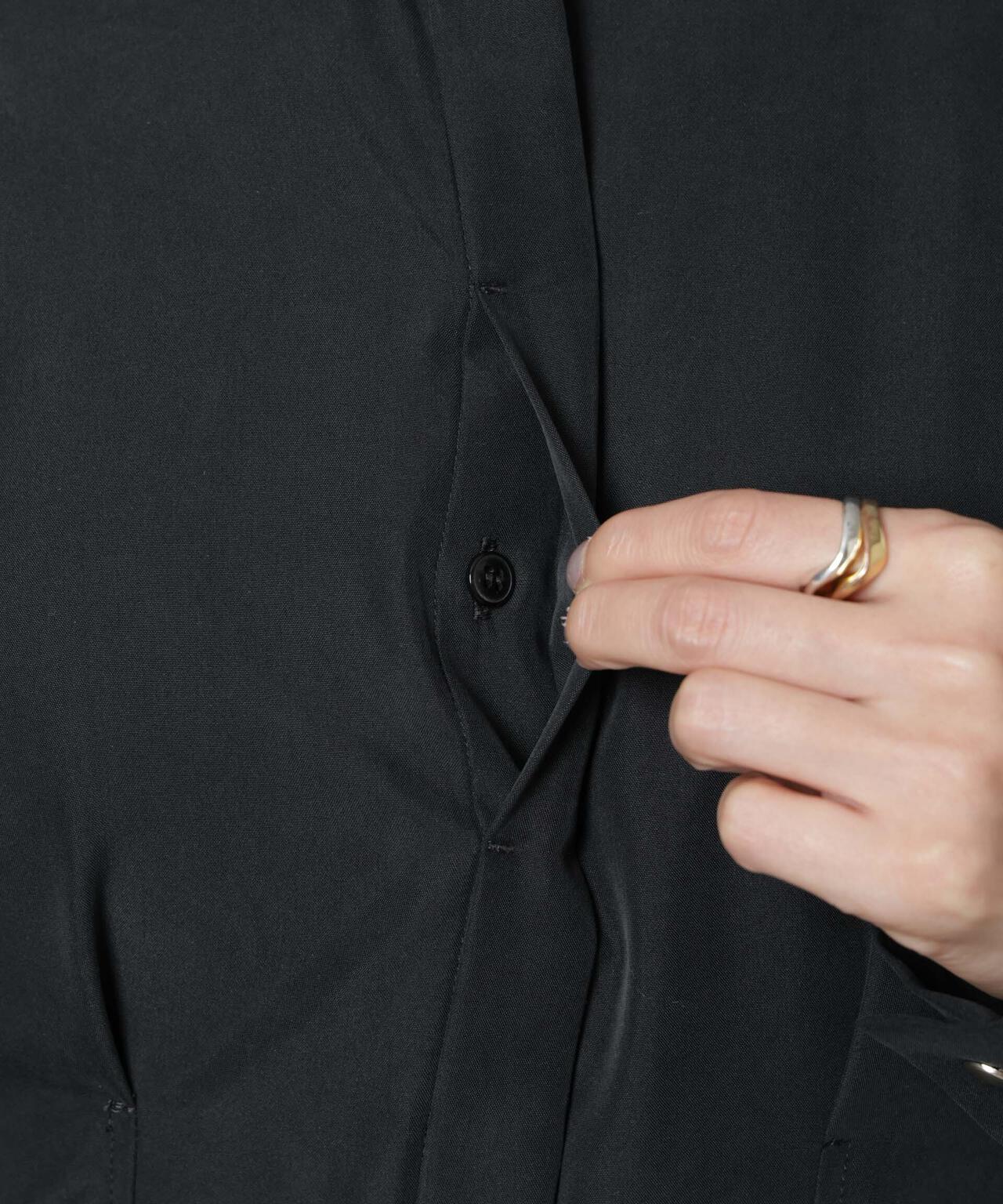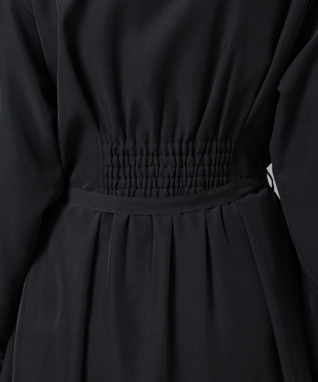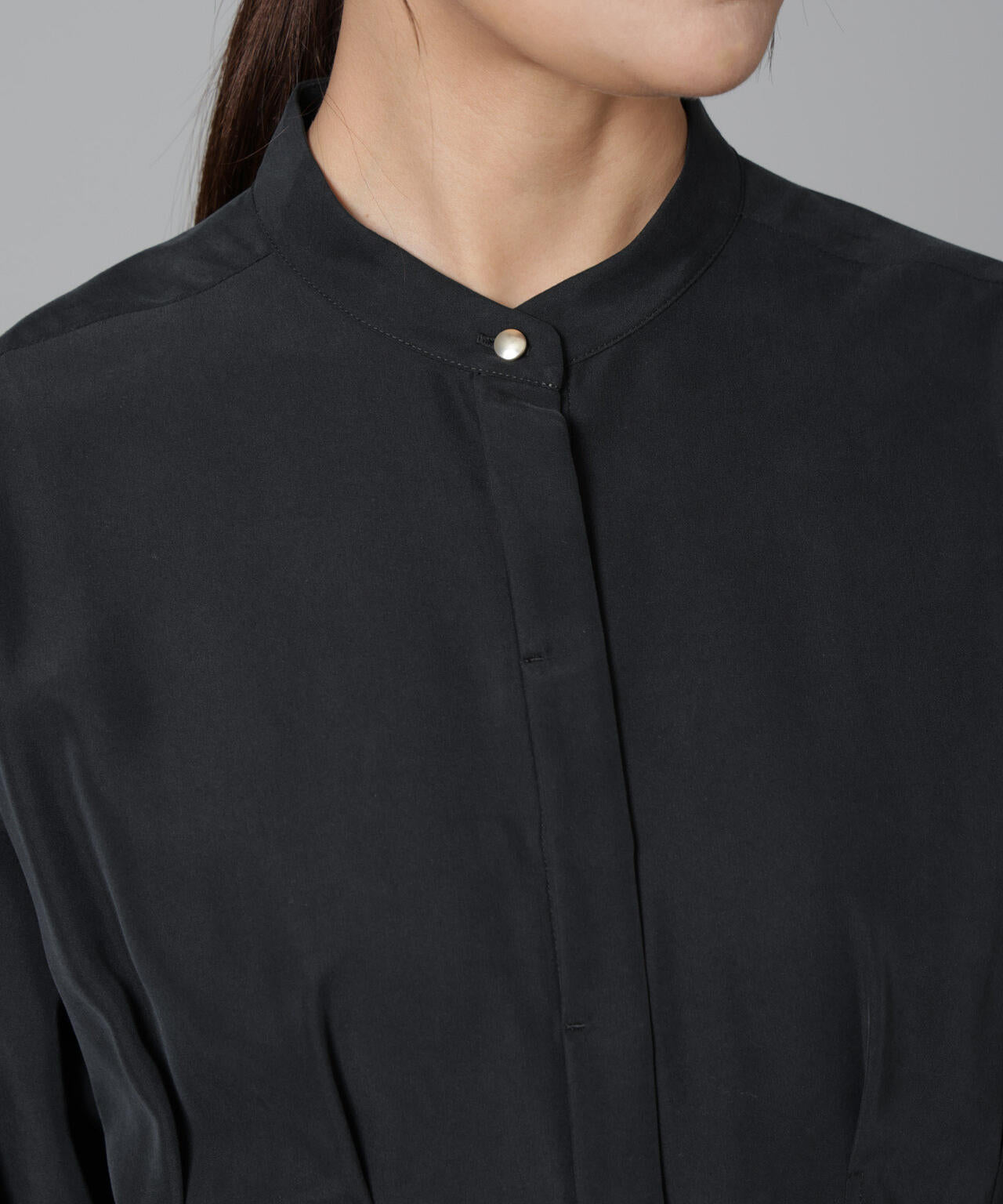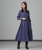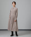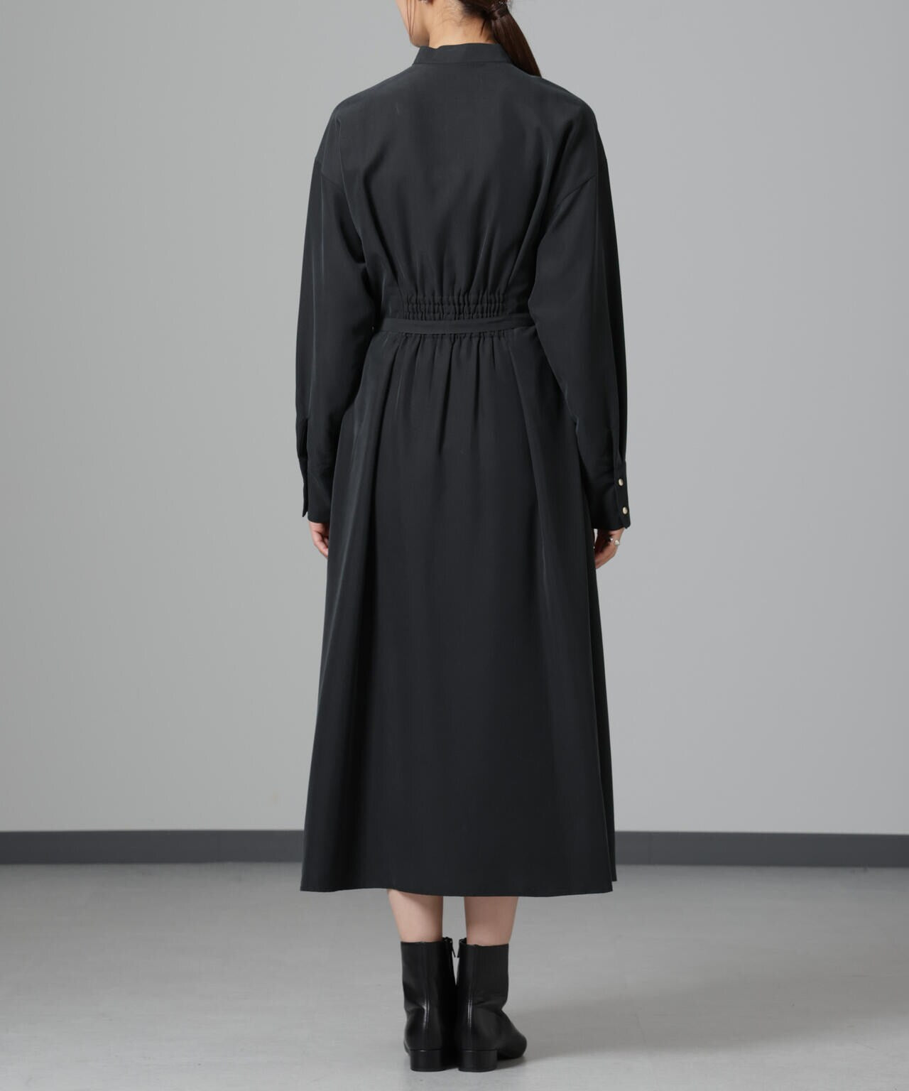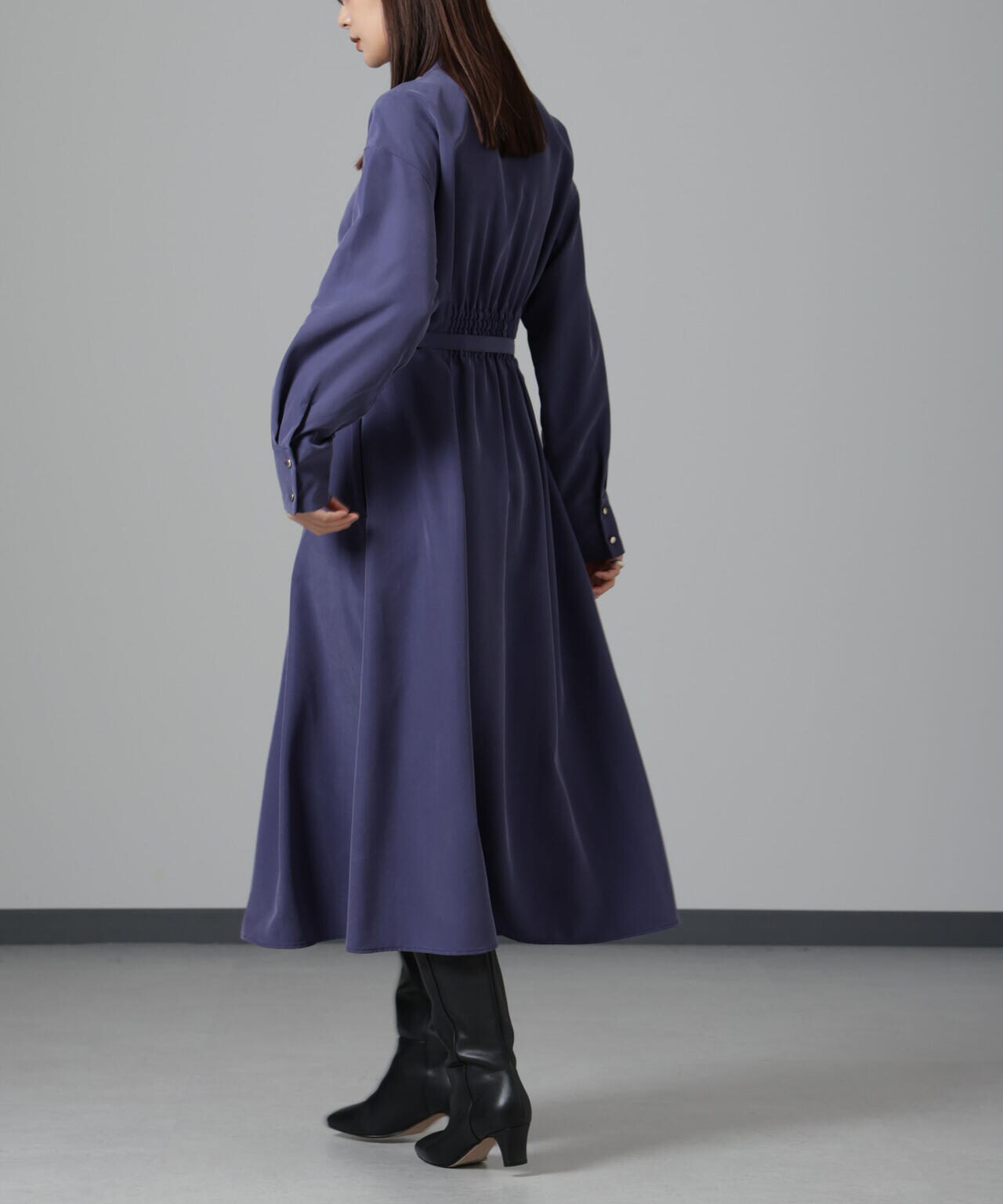 秋らしい素材感のスタンドカラーのベルト付きシャツ型ワンピース。ウエストは中縫いタックで程よくすっきり見えるようにシェイプされ、共生地の細ベルトでウエストマークで決まるきれいめなデザインです。