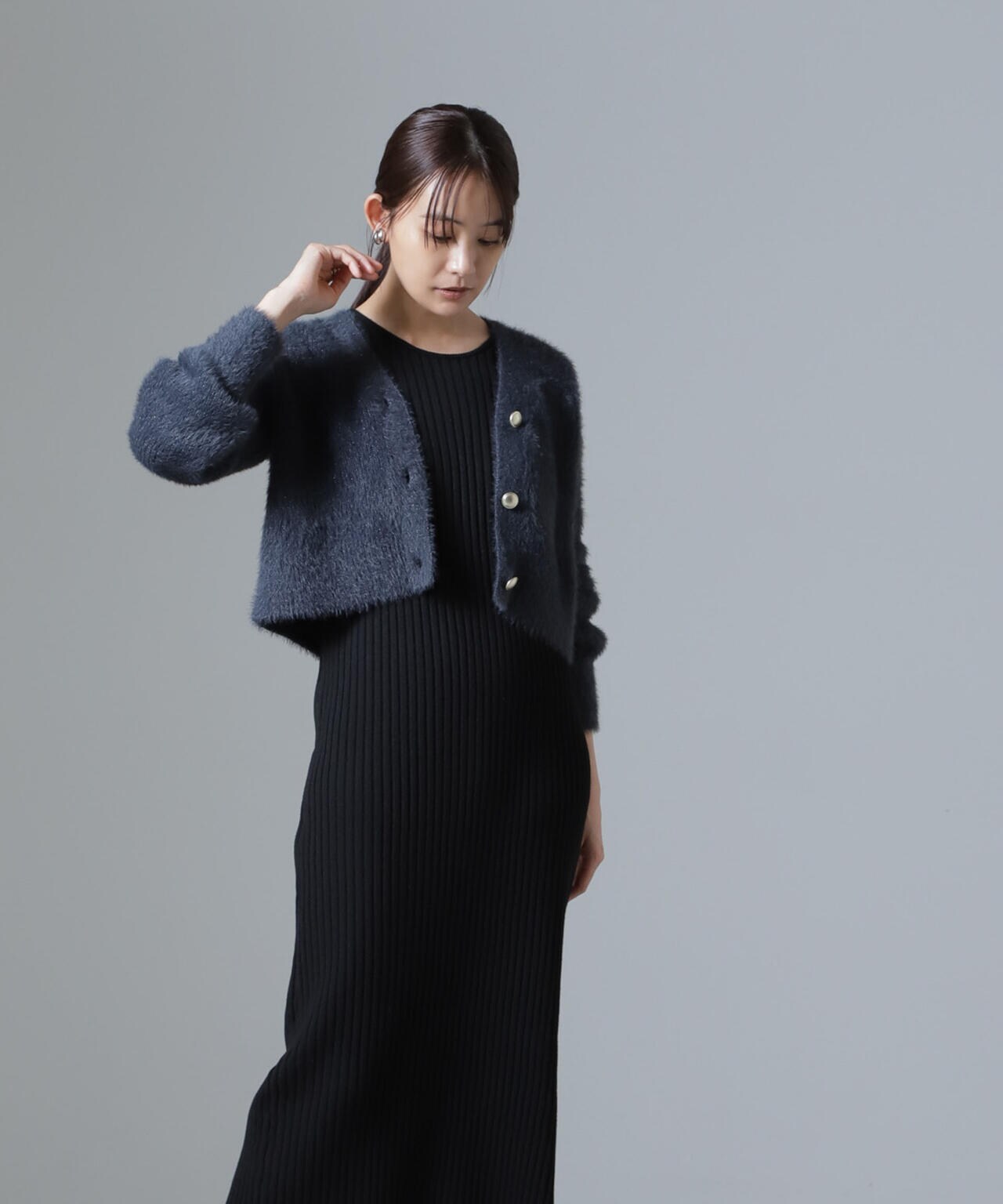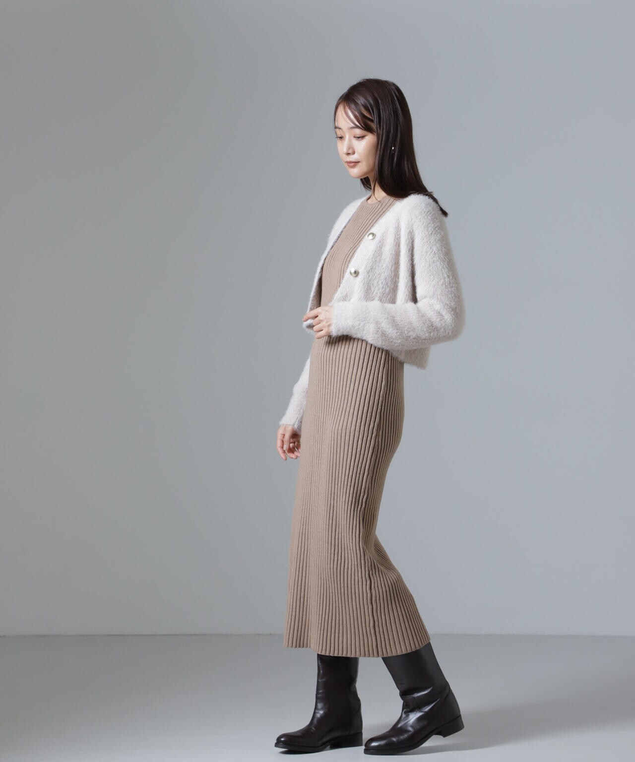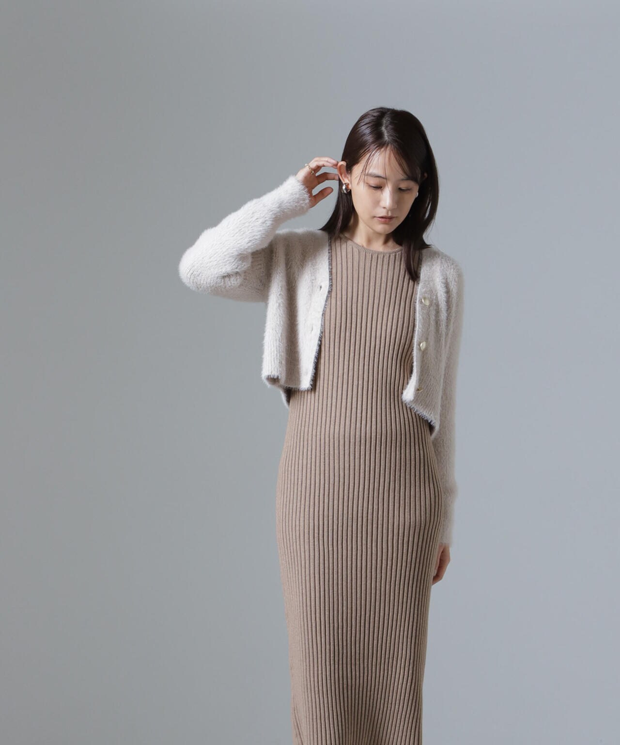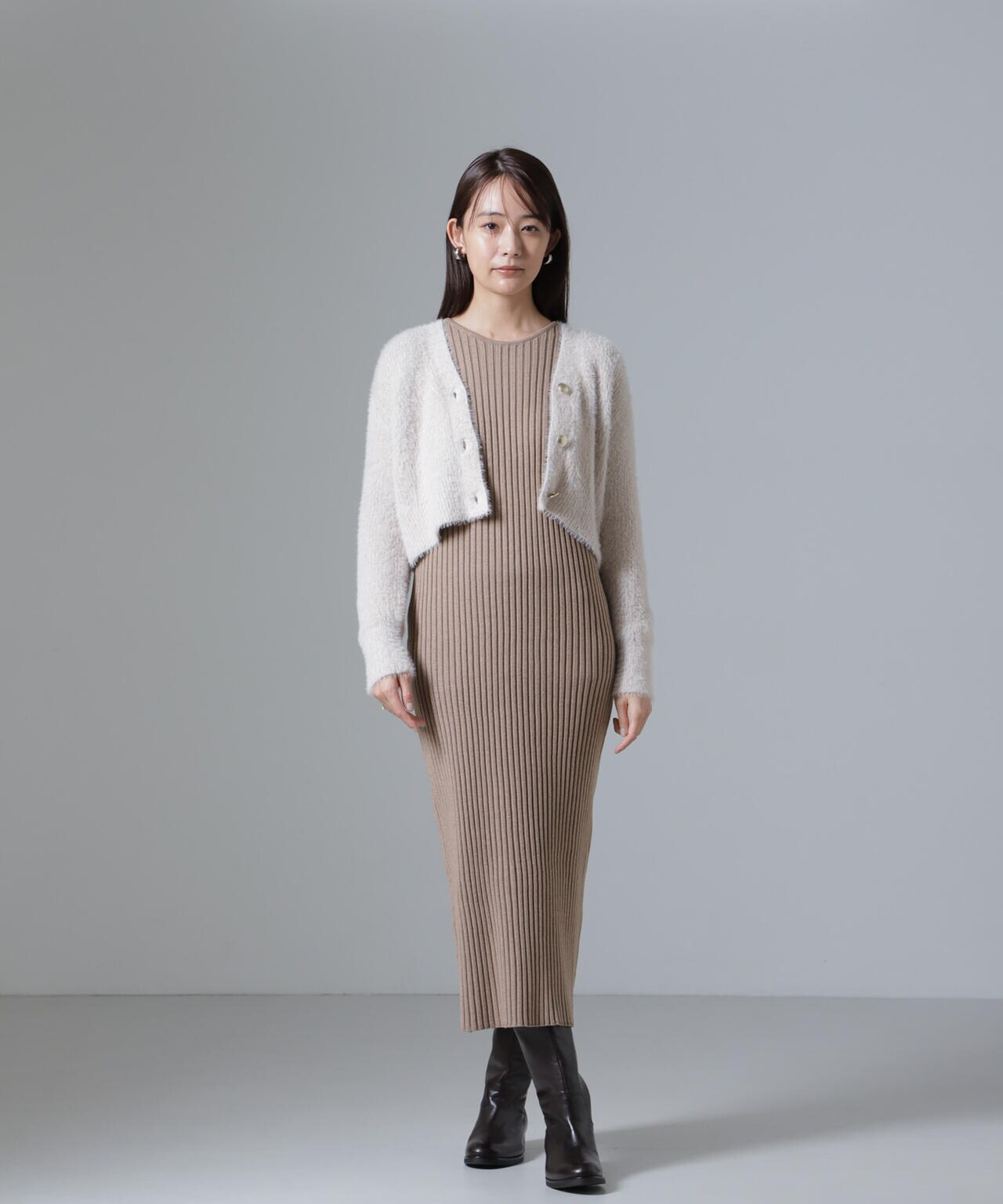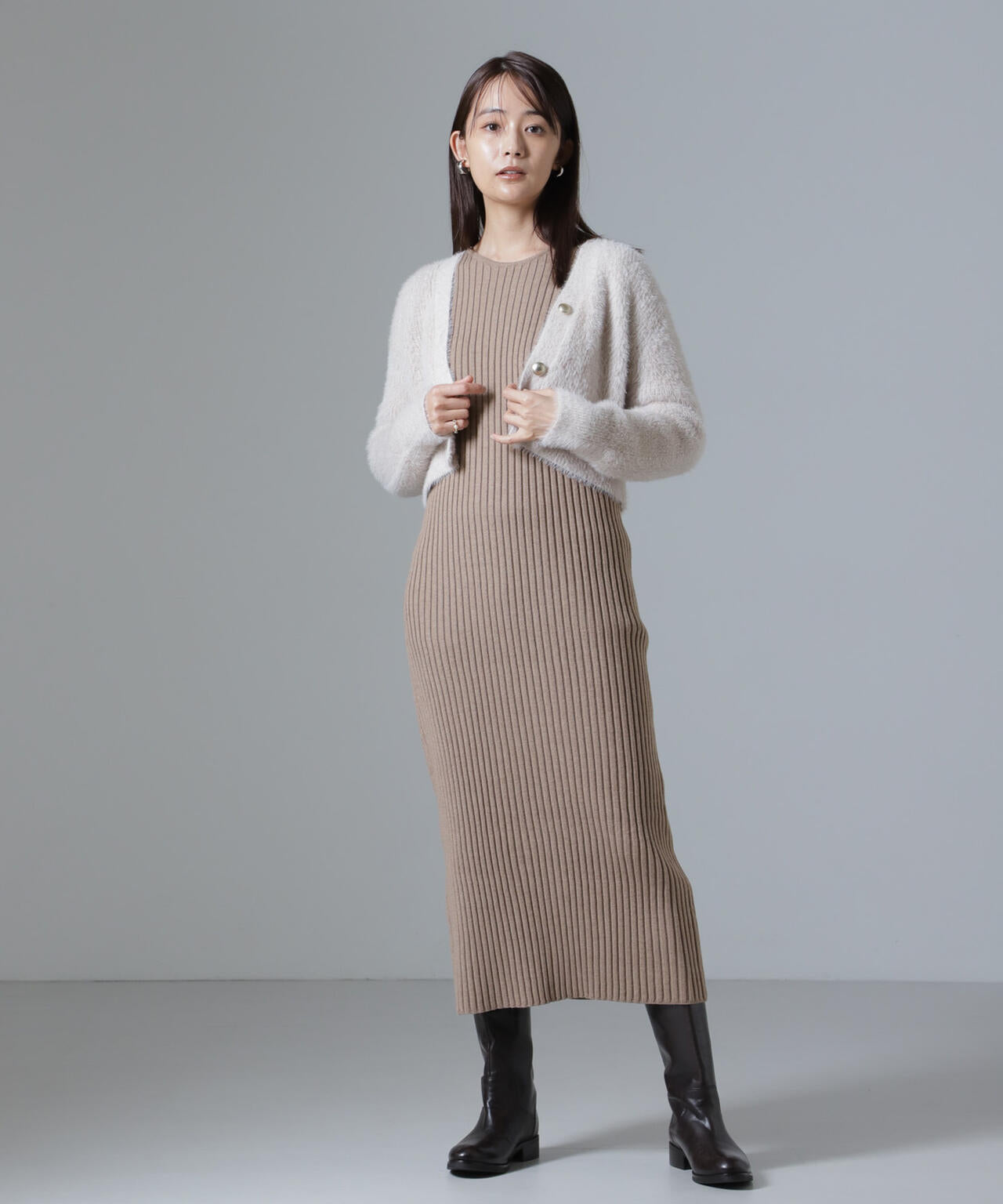 トレンドのフェザー素材のニットカーディガンとリブワンピースのセットアイテム。着ぶくれせずにスタイルアップできるシルエットで、それぞれ単品使いもできるので着回しに重宝しそう。