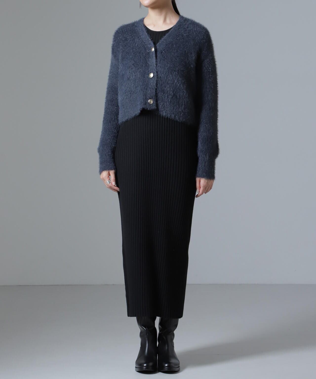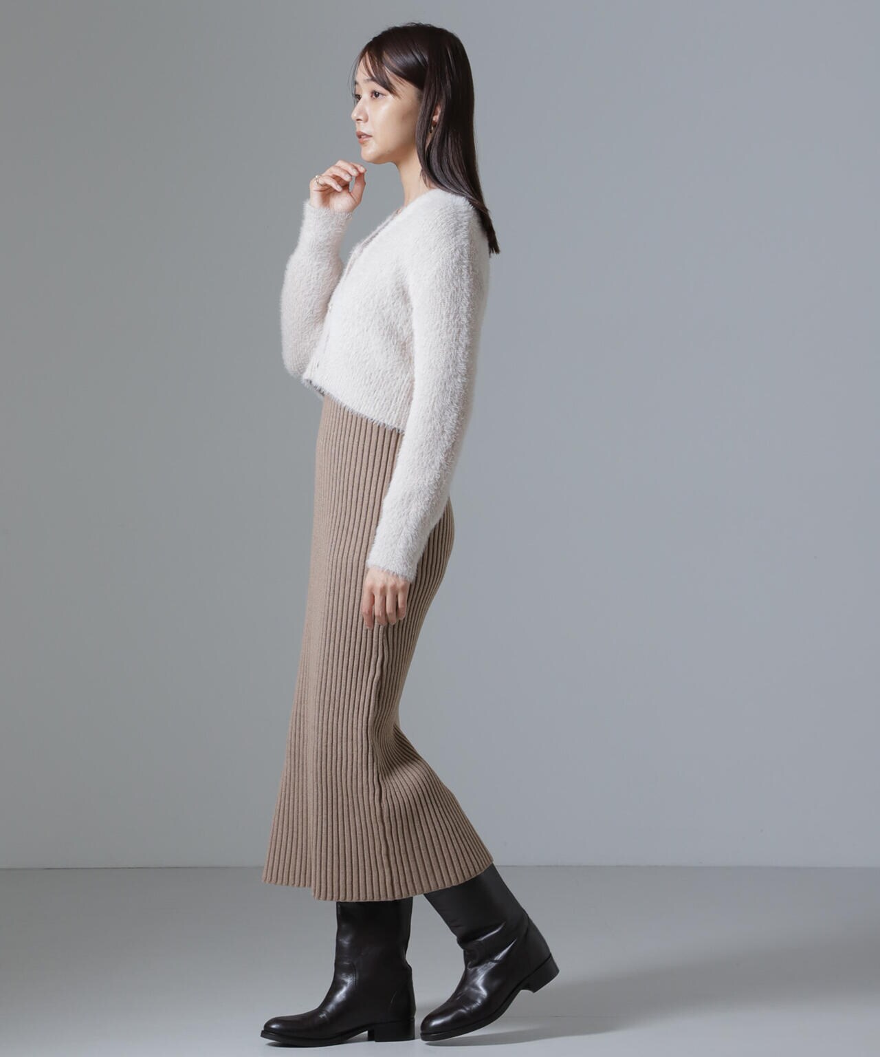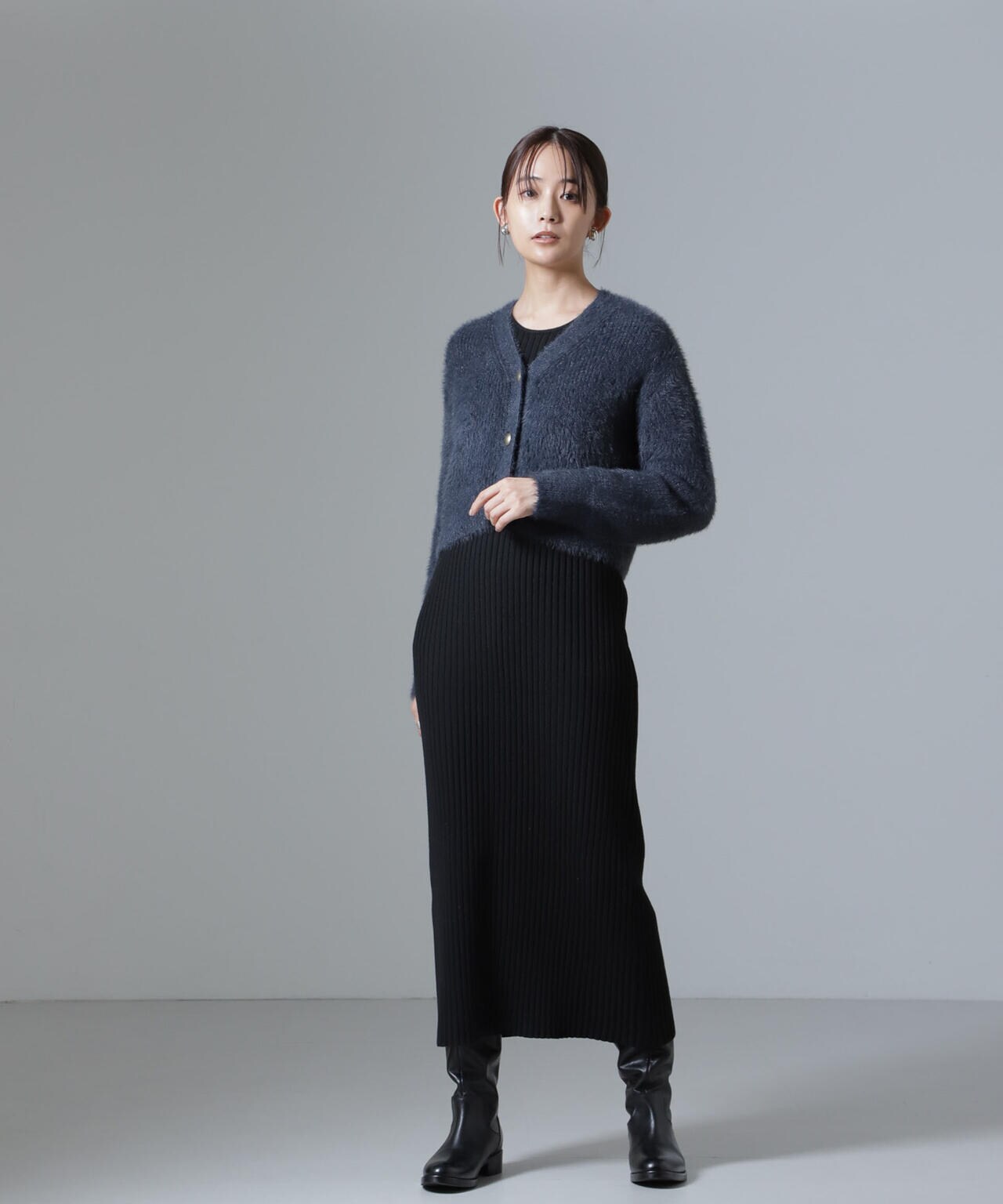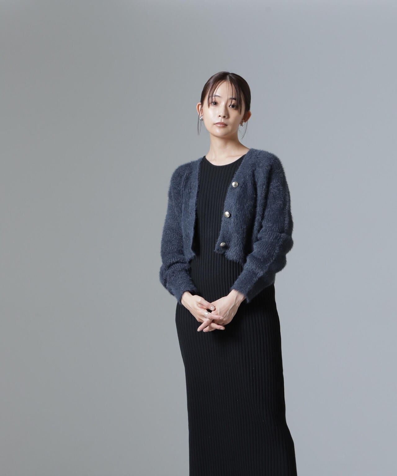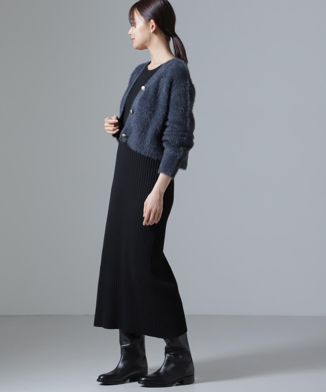 トレンドのフェザー素材のニットカーディガンとリブワンピースのセットアイテム。着ぶくれせずにスタイルアップできるシルエットで、それぞれ単品使いもできるので着回しに重宝しそう。
