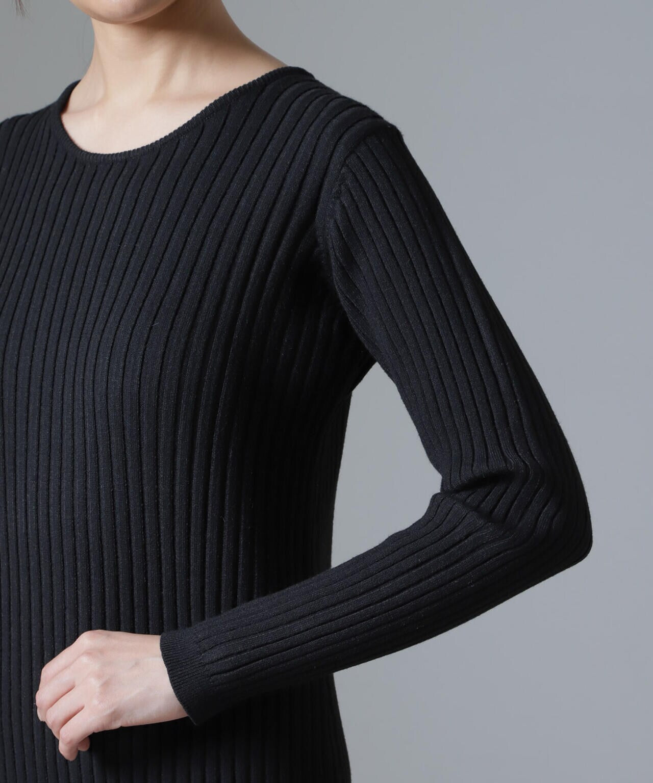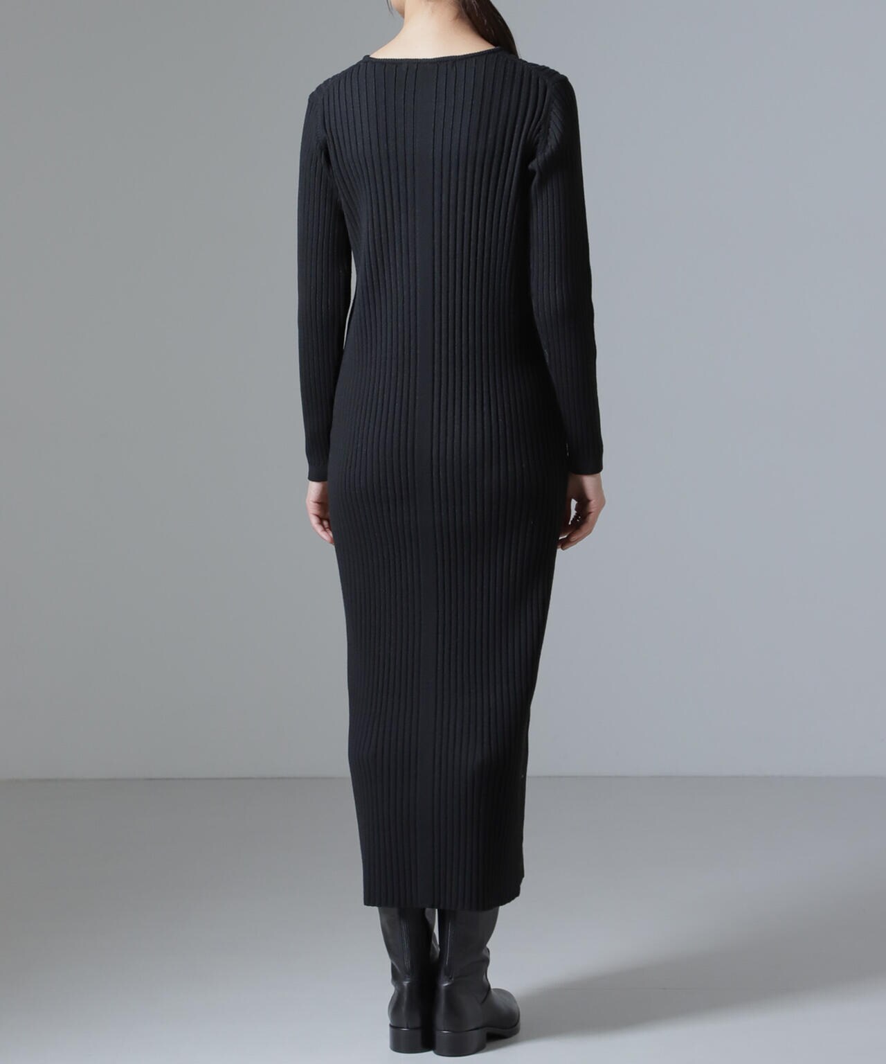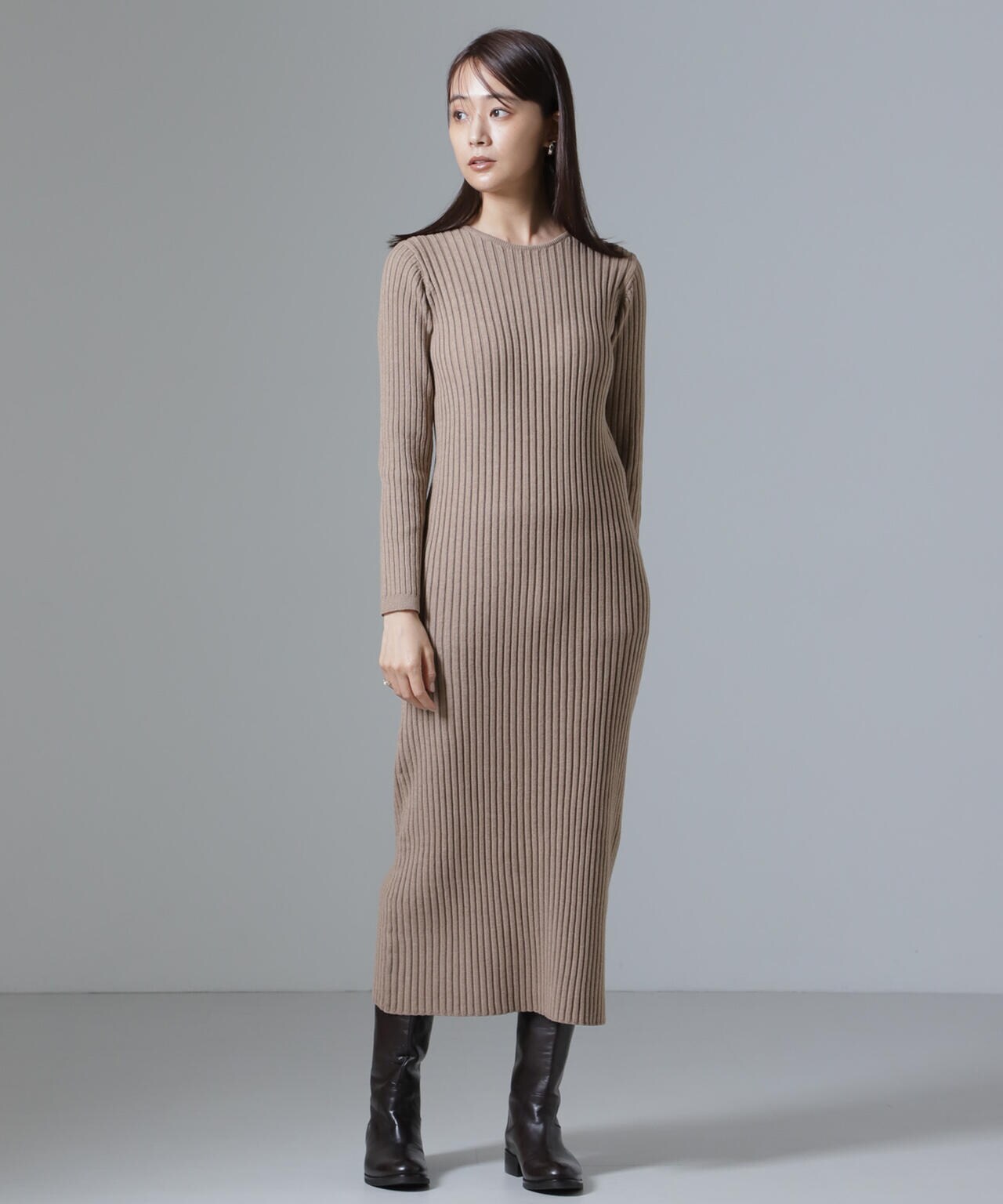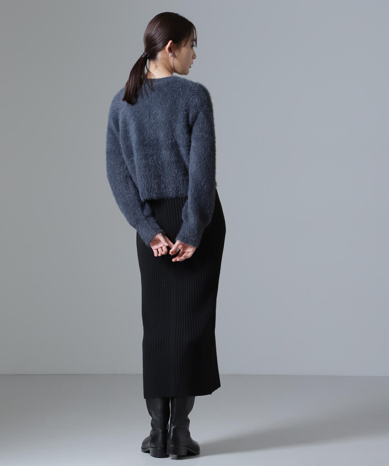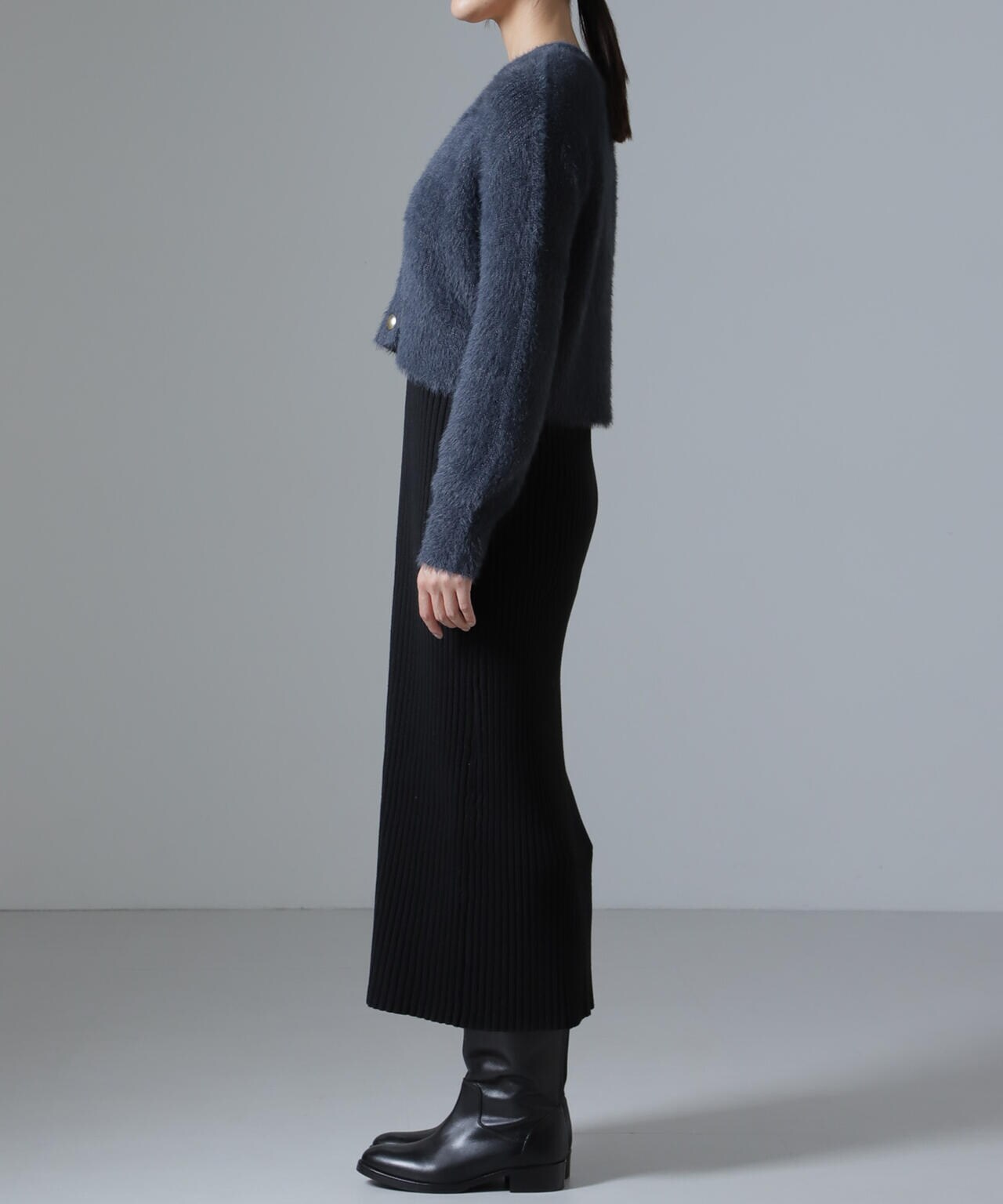 トレンドのフェザー素材のニットカーディガンとリブワンピースのセットアイテム。着ぶくれせずにスタイルアップできるシルエットで、それぞれ単品使いもできるので着回しに重宝しそう。