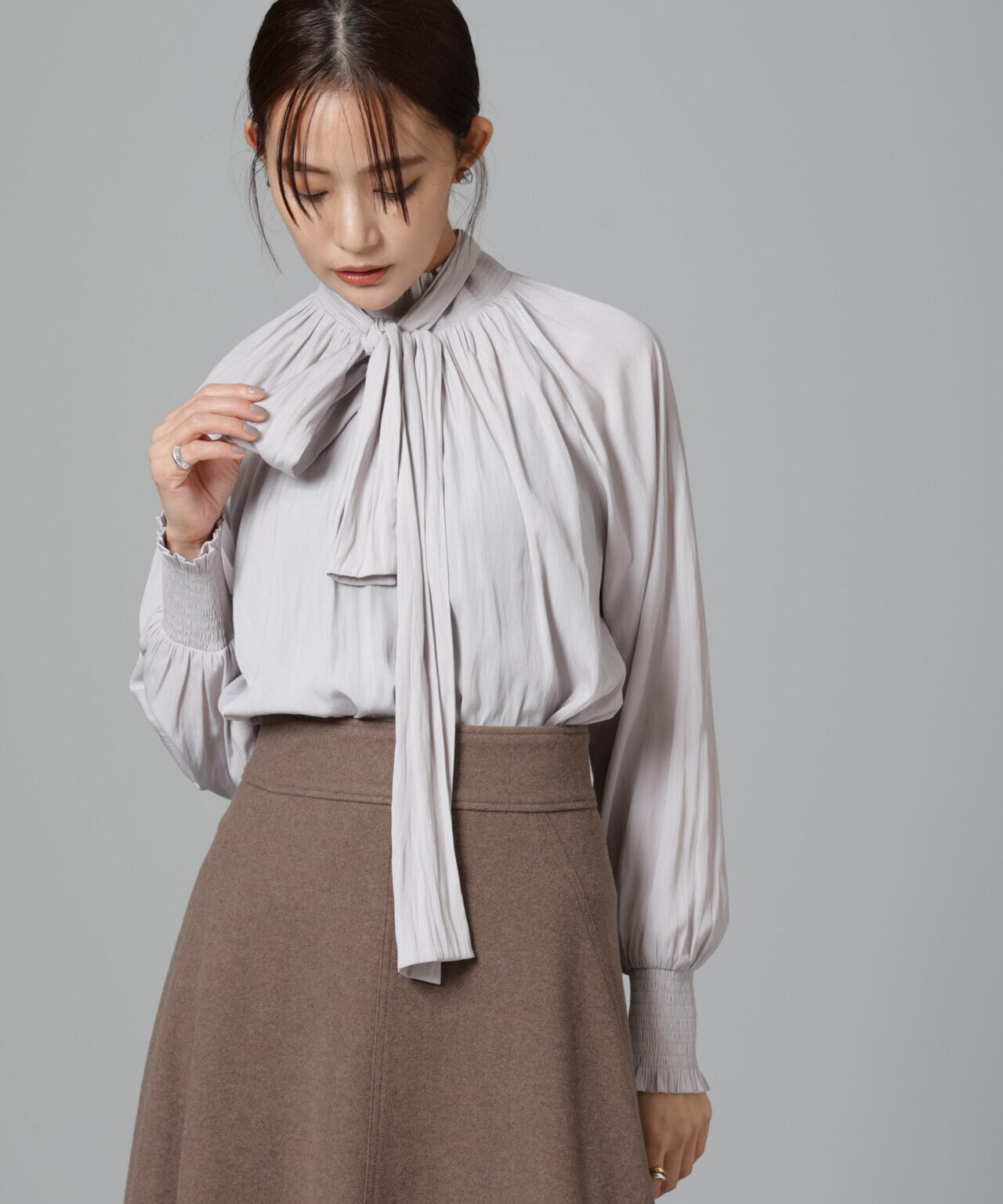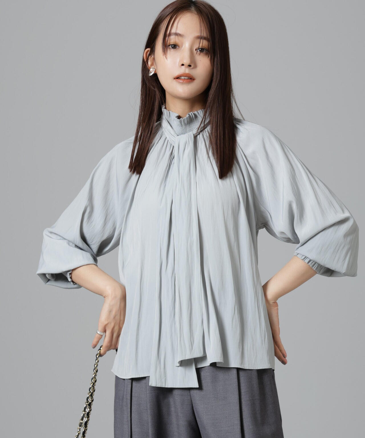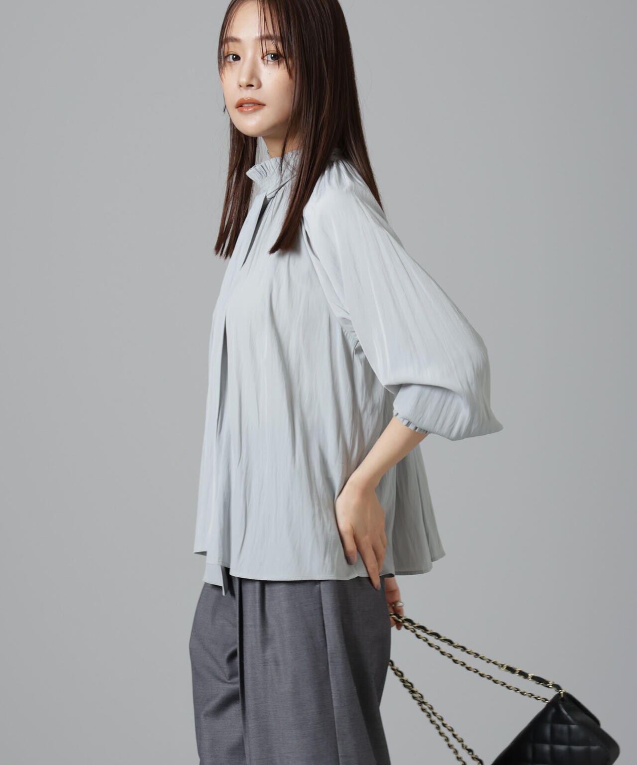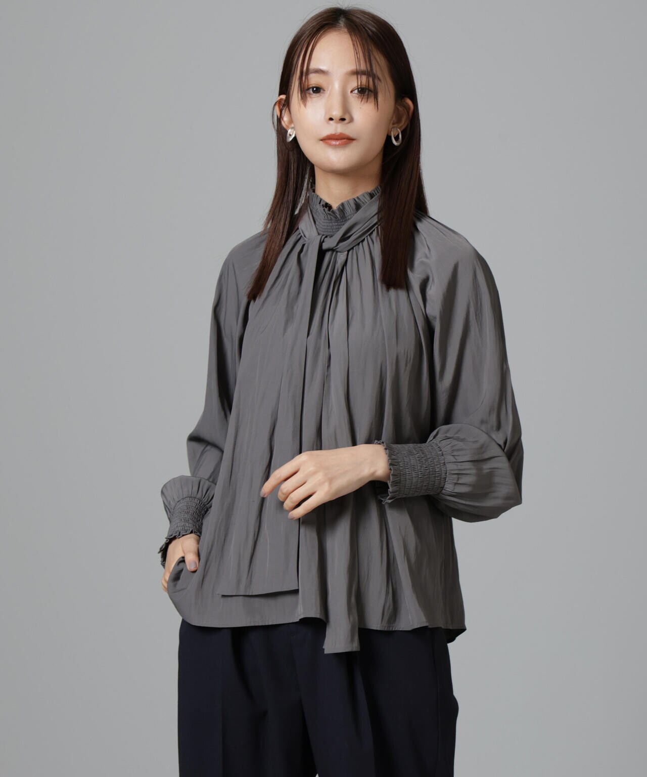 襟元のギャザーとリボンが華やかで女性らしさが溢れるボウタイブラウス。袖をまくった時のふんわりとしたボリューム感もポイント◎。さらりとした軽やかな肌触りで身体のラインを華奢にきれいに見せてくれるひと品です。
