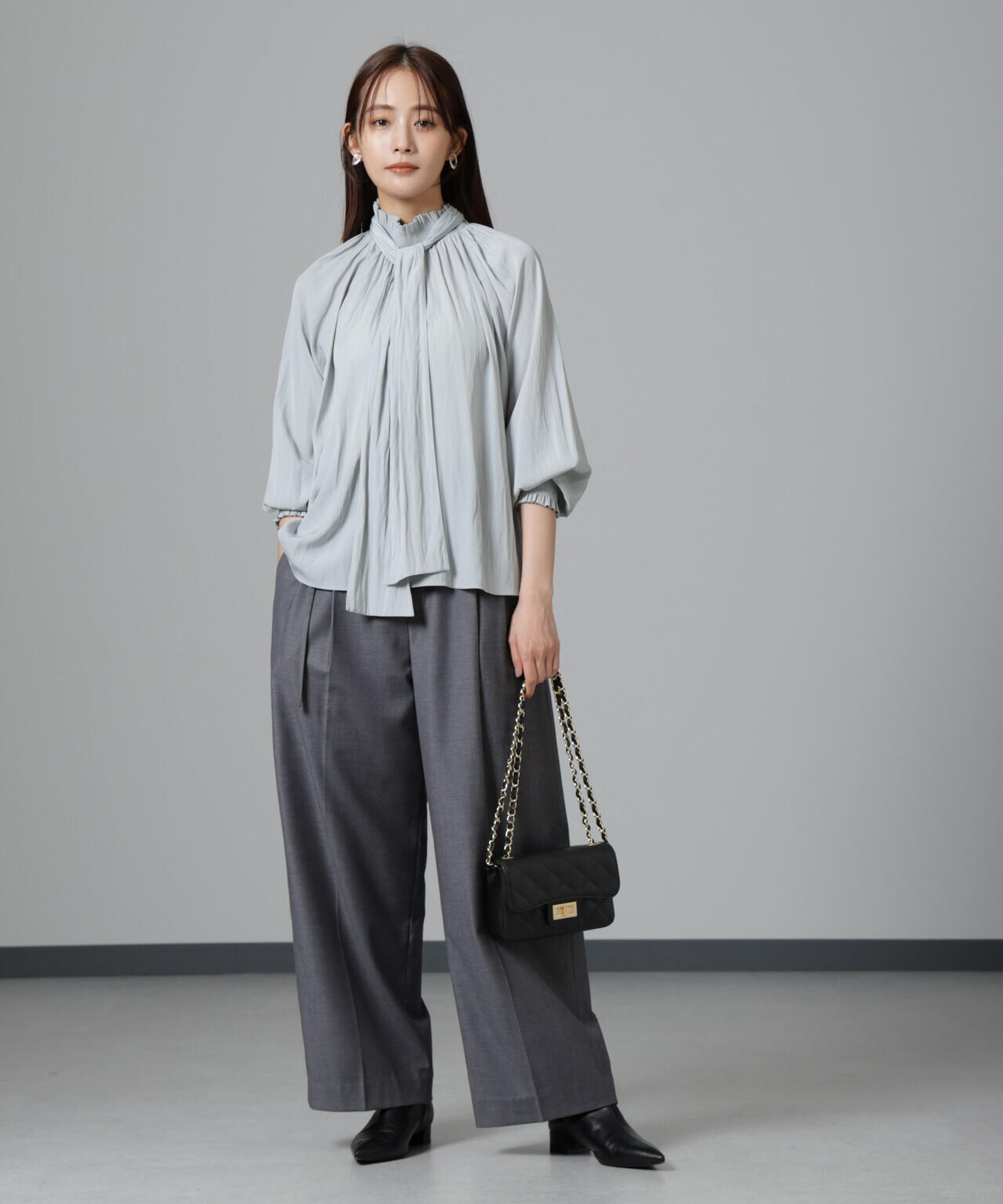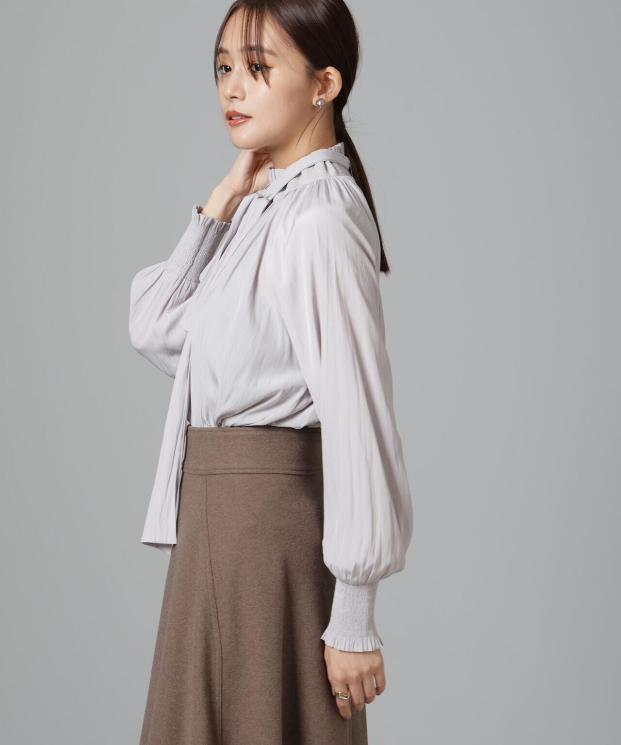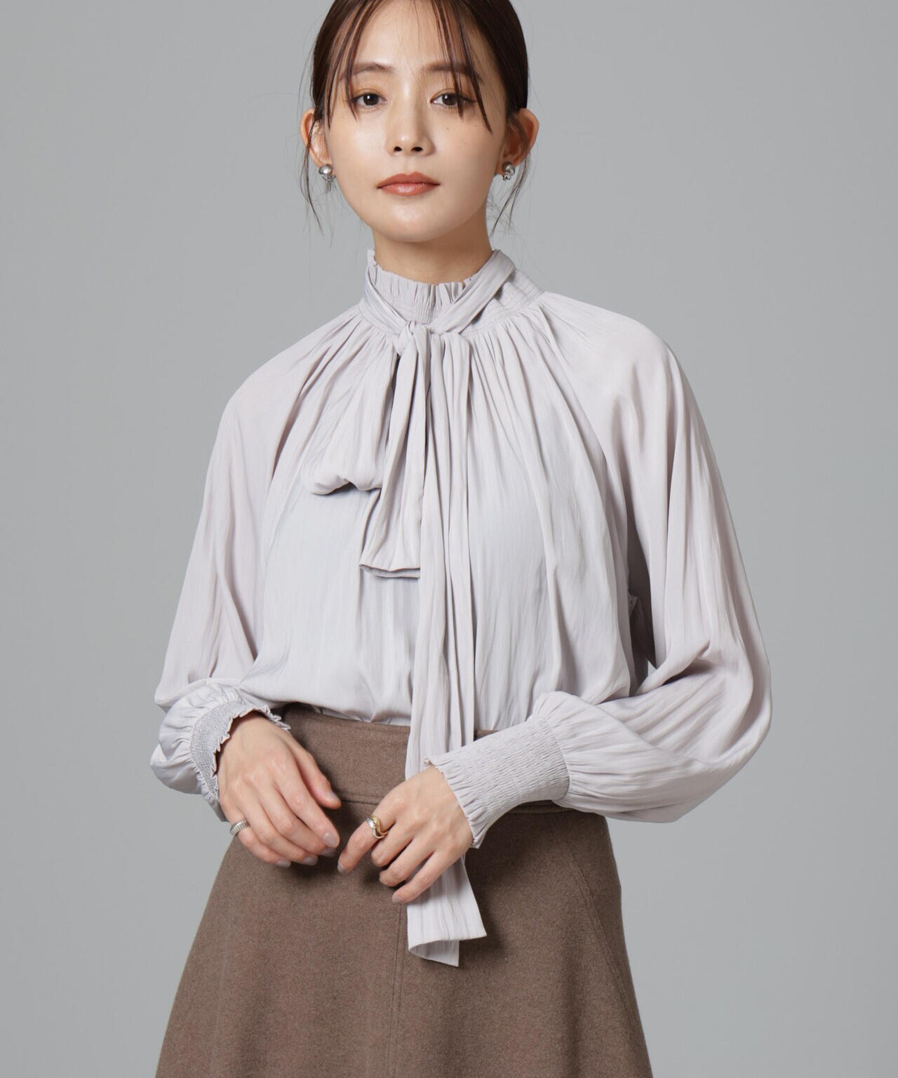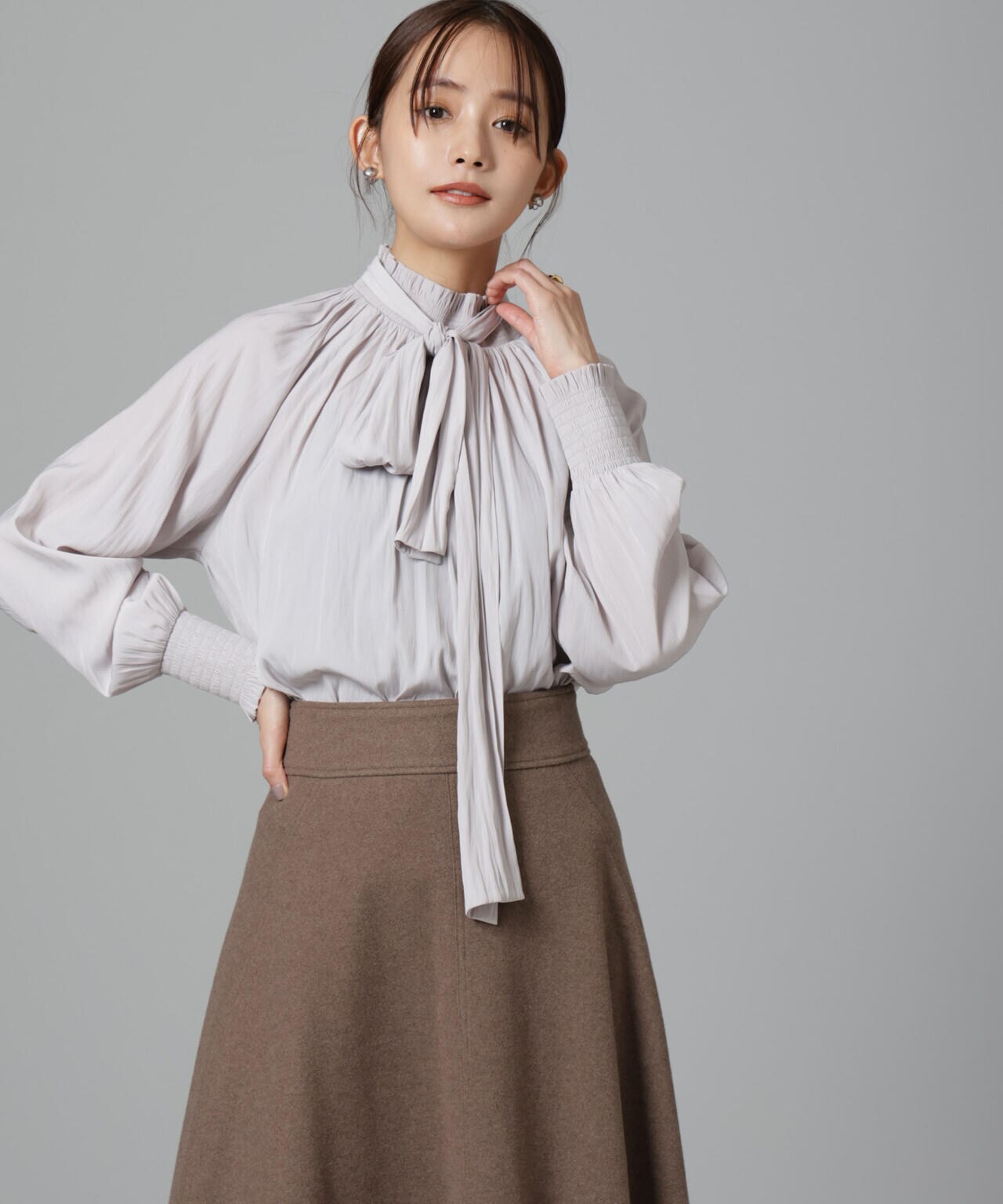 襟元のギャザーとリボンが華やかで女性らしさが溢れるボウタイブラウス。袖をまくった時のふんわりとしたボリューム感もポイント◎。さらりとした軽やかな肌触りで身体のラインを華奢にきれいに見せてくれるひと品です。