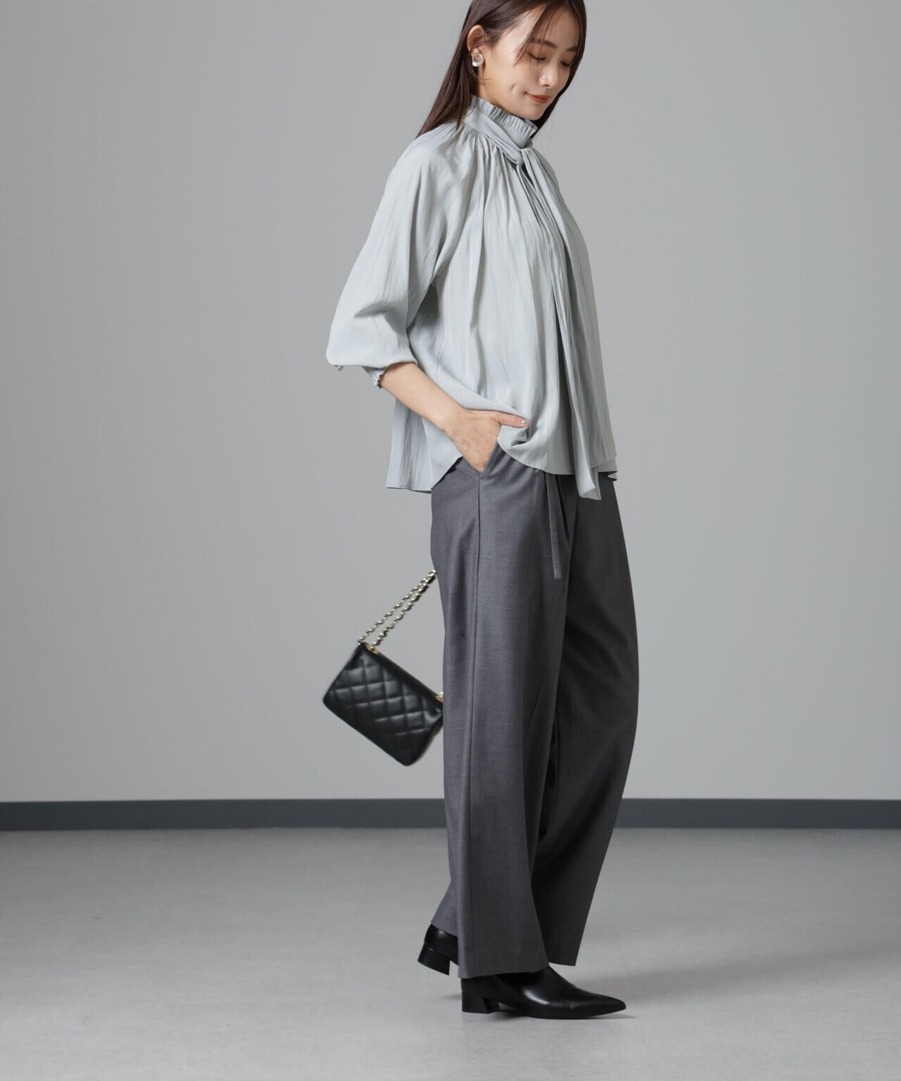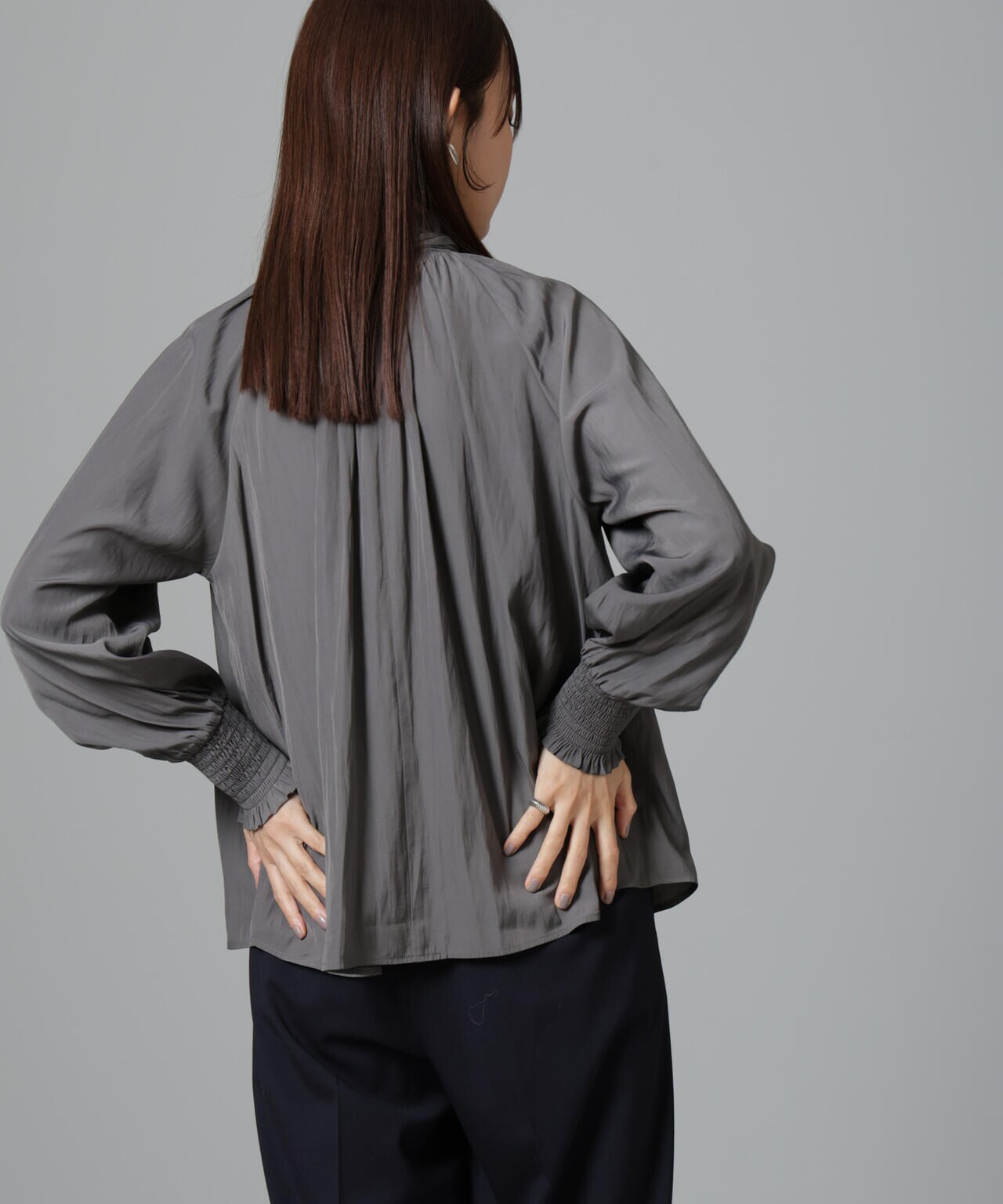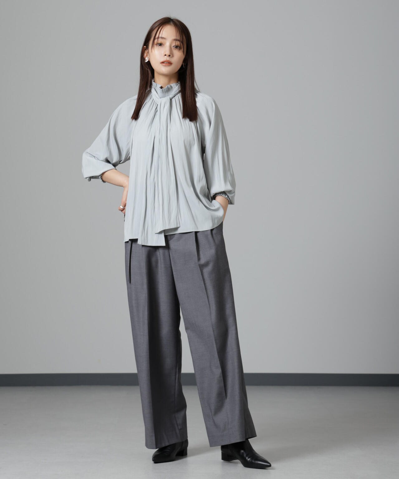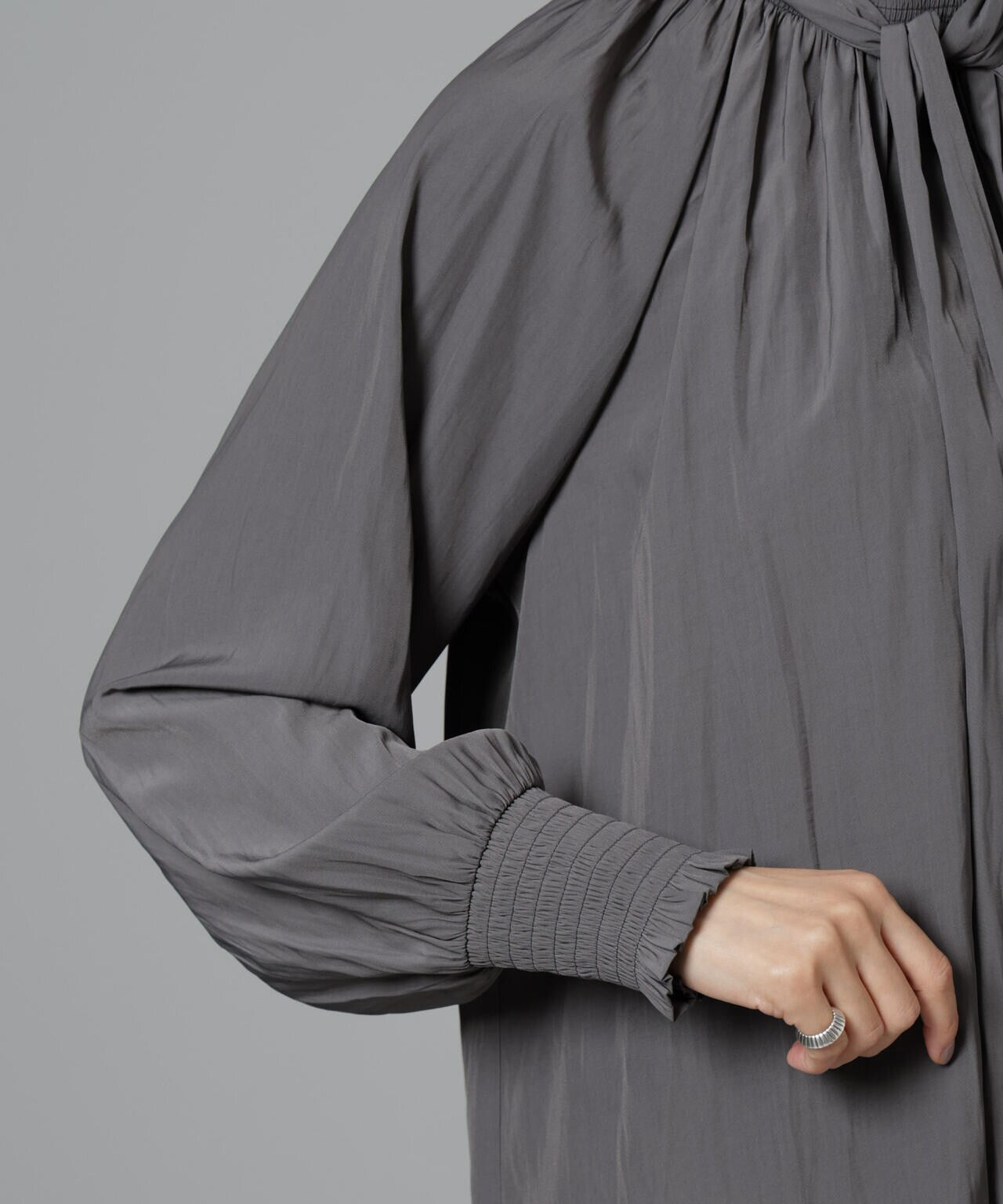 襟元のギャザーとリボンが華やかで女性らしさが溢れるボウタイブラウス。袖をまくった時のふんわりとしたボリューム感もポイント◎。さらりとした軽やかな肌触りで身体のラインを華奢にきれいに見せてくれるひと品です。