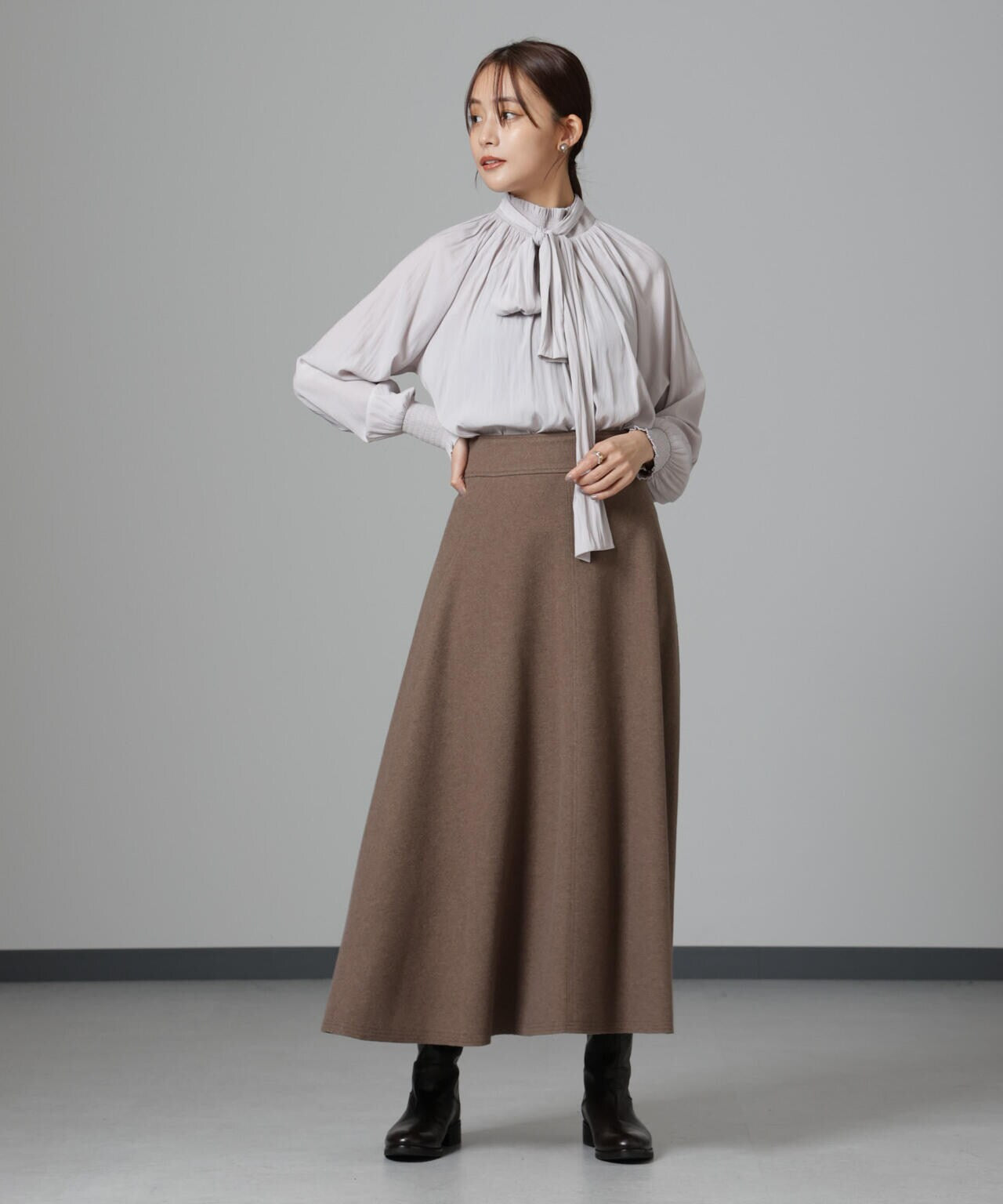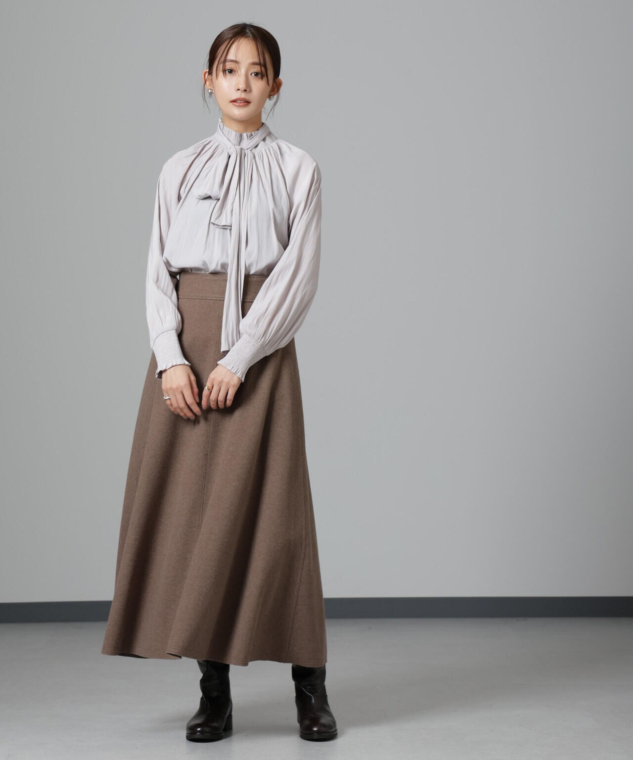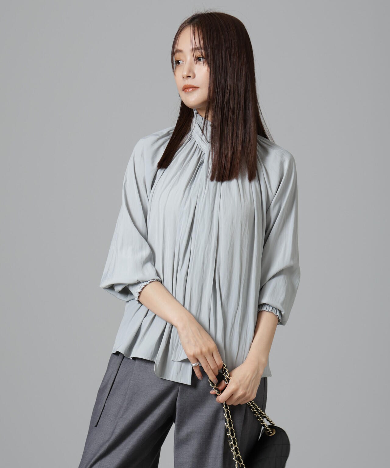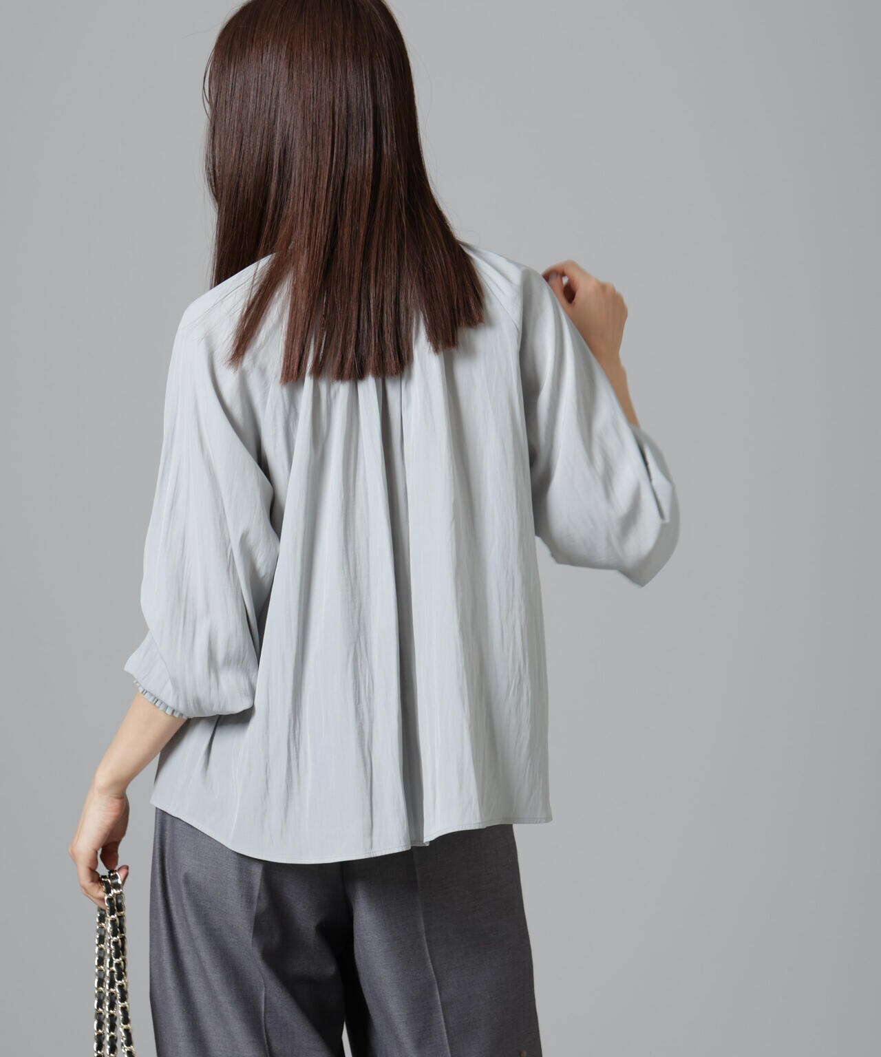 襟元のギャザーとリボンが華やかで女性らしさが溢れるボウタイブラウス。袖をまくった時のふんわりとしたボリューム感もポイント◎。さらりとした軽やかな肌触りで身体のラインを華奢にきれいに見せてくれるひと品です。