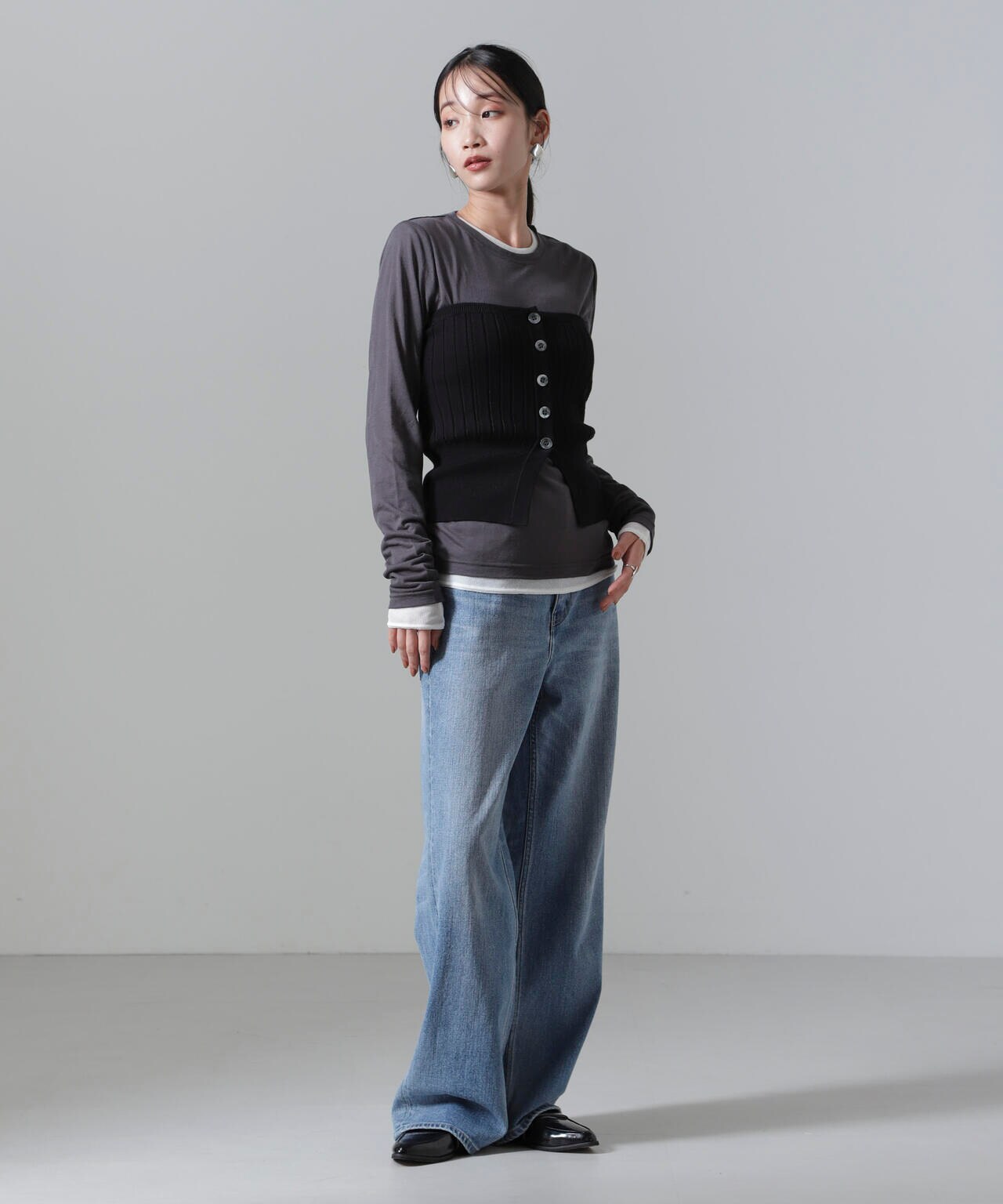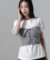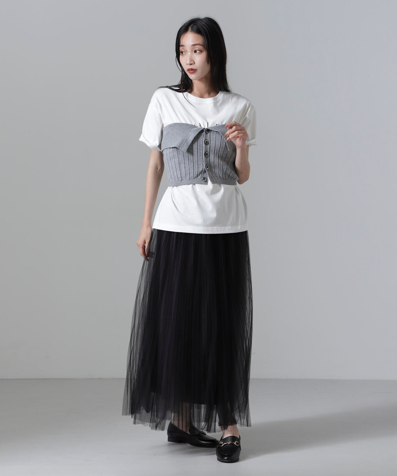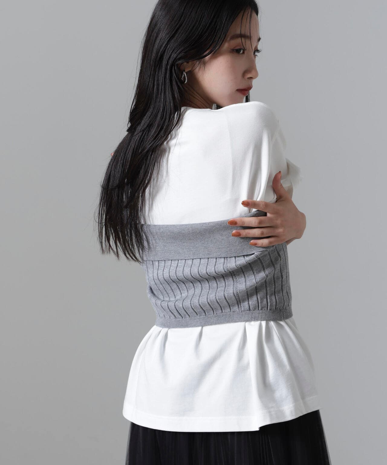 着こなしのアレンジが楽しめるニットベアビスチェ。上下2WAYで着ることができ、Tシャツやシャツの上にレイヤードも素敵なアイテム◎伸縮性のある素材で胸元にはゴムが入っているので、しっかりとホールド感があります。通気性や吸水性もある綿素材なので、これからの季節でも着心地良く着て頂けます。今季らしくシャツや透け感のあるトップスの上に重ねてレイヤードスタイルがおすすめです。
