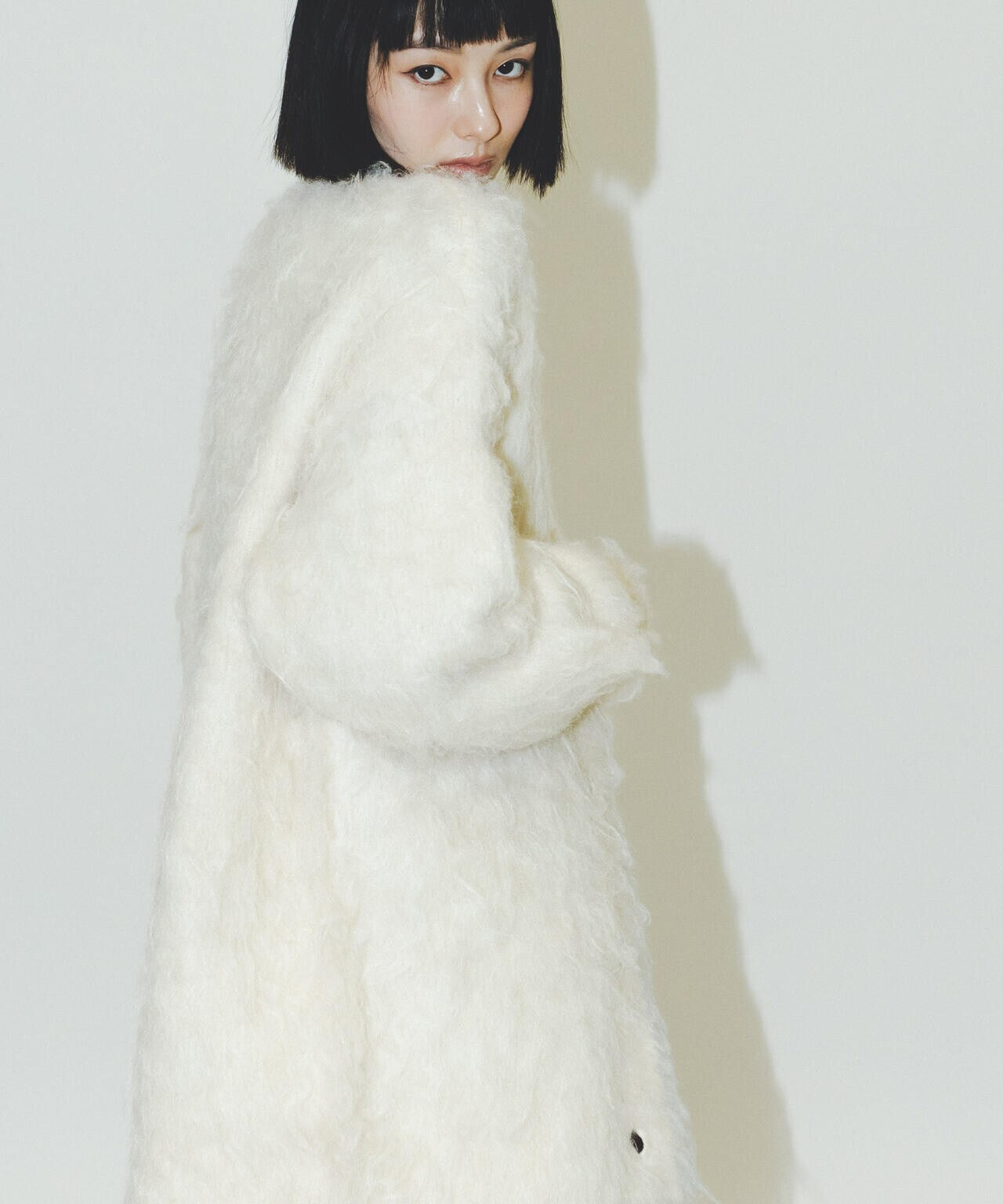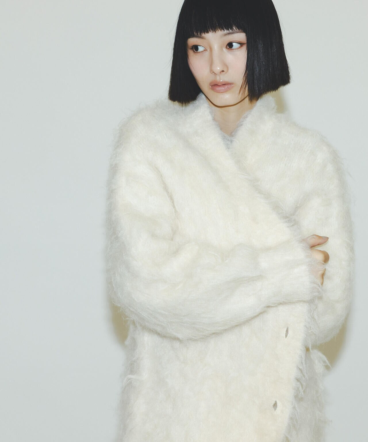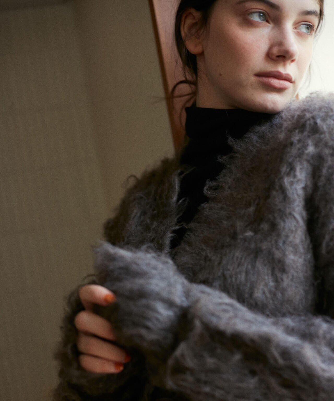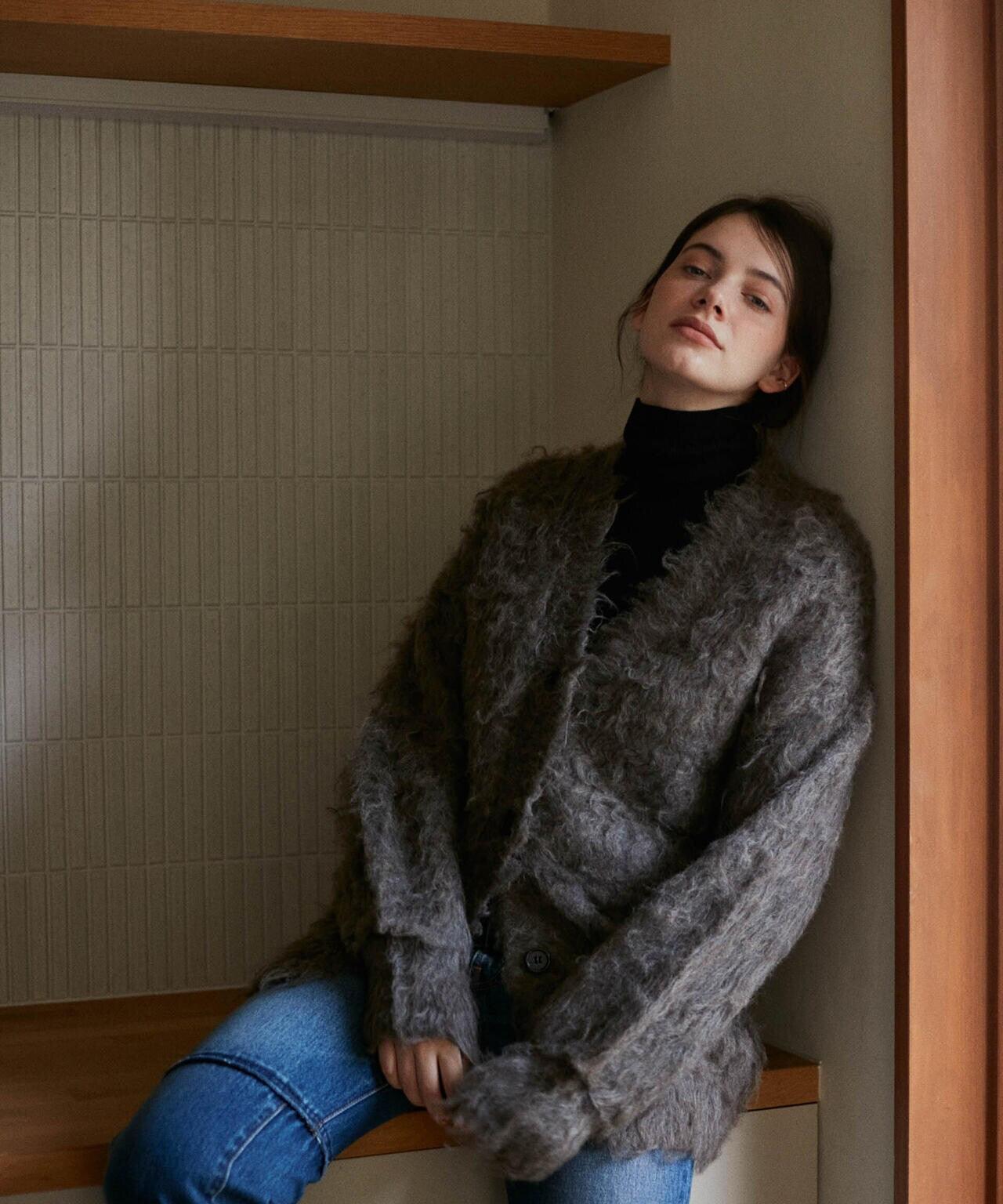 今年らしいシャギー感のある毛足が可愛らしいニットカーディガン。昨年はトップ調の辛口なテイストでしたが、今季はより使い易いアイボリーとモカの2色が登場です!
