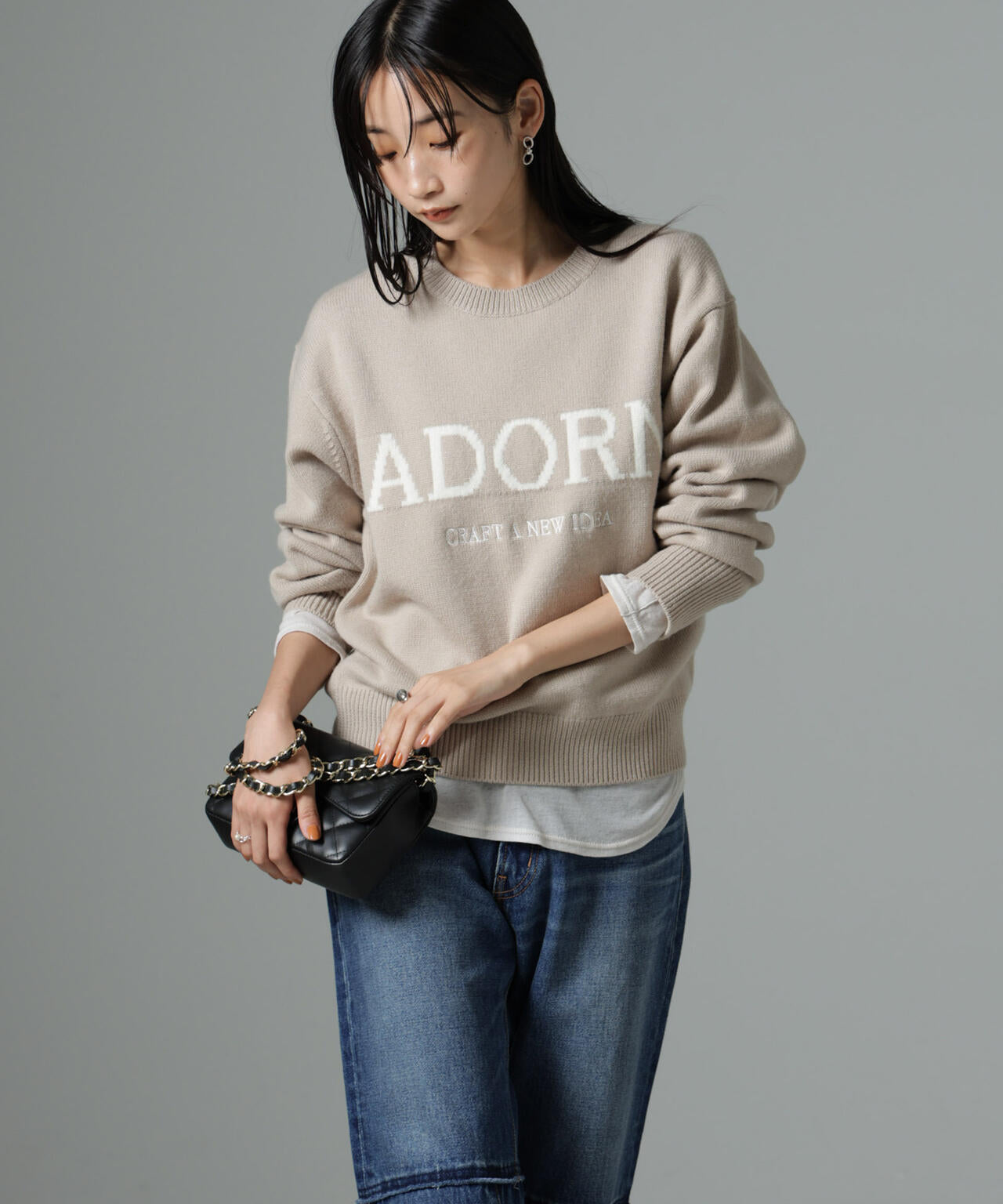 ウール混のミドルゲージで編み立てたニットプルオーバー。ジャガードの大きなロゴとその下に刺繍で文字入れをしたデザインで、質感の異なるロゴ表現もポイント◎。中に薄手のタートルや、クルーネックのロンTを少し覗かせたりするレイヤードアレンジもおすすめです。