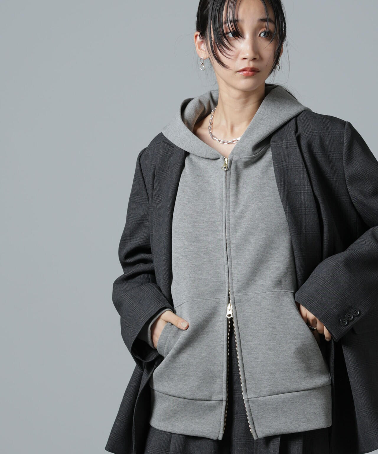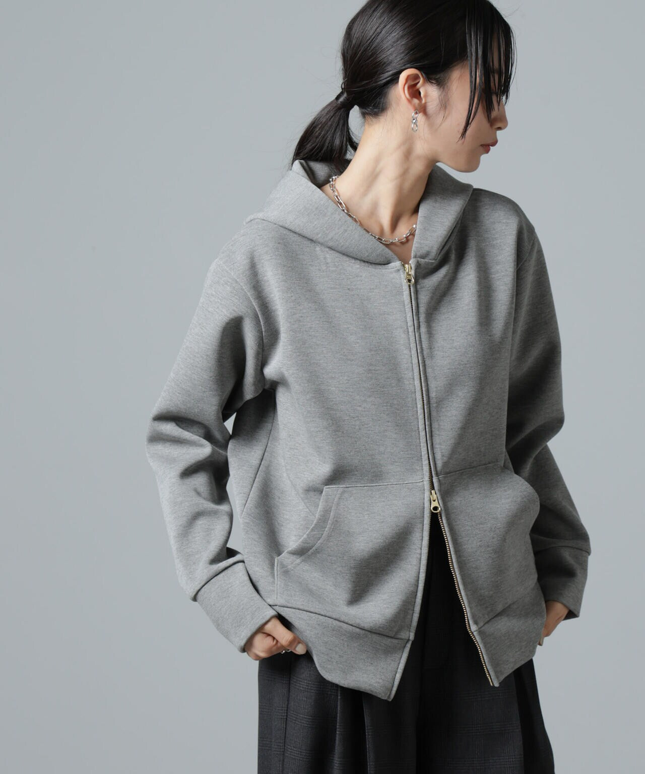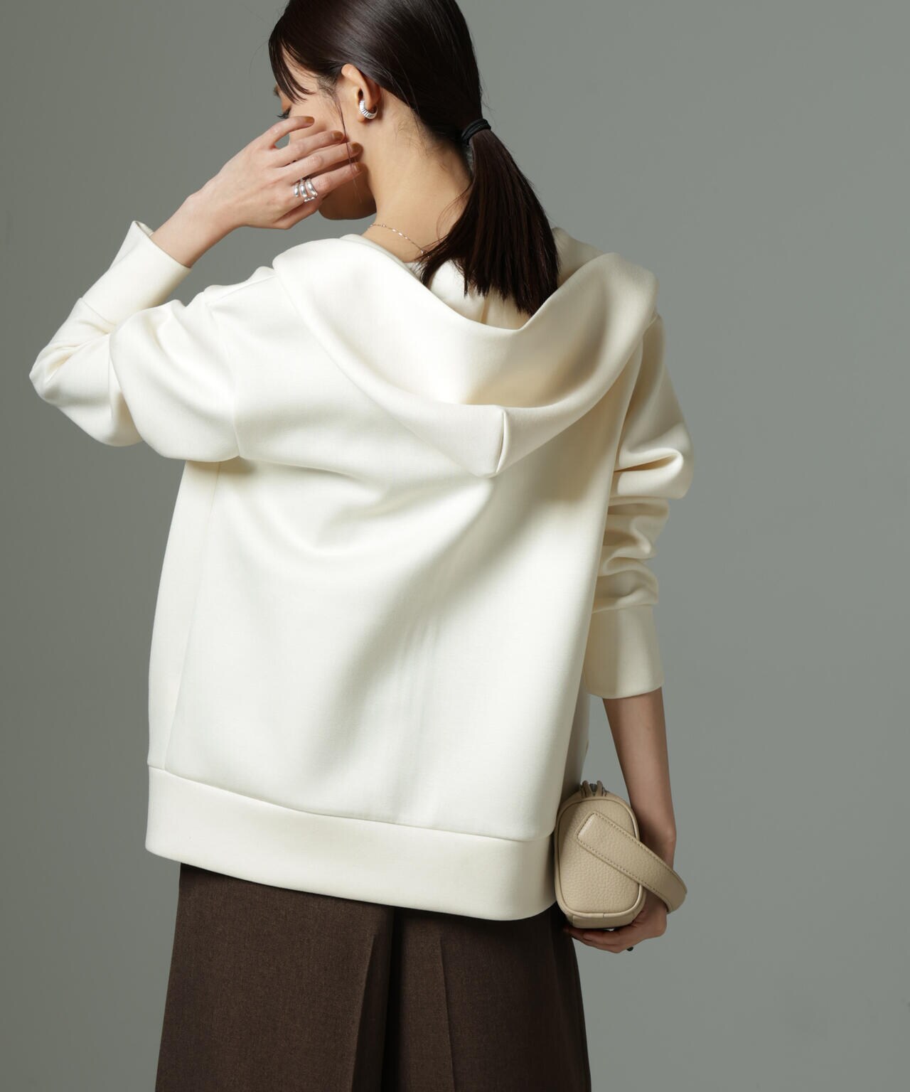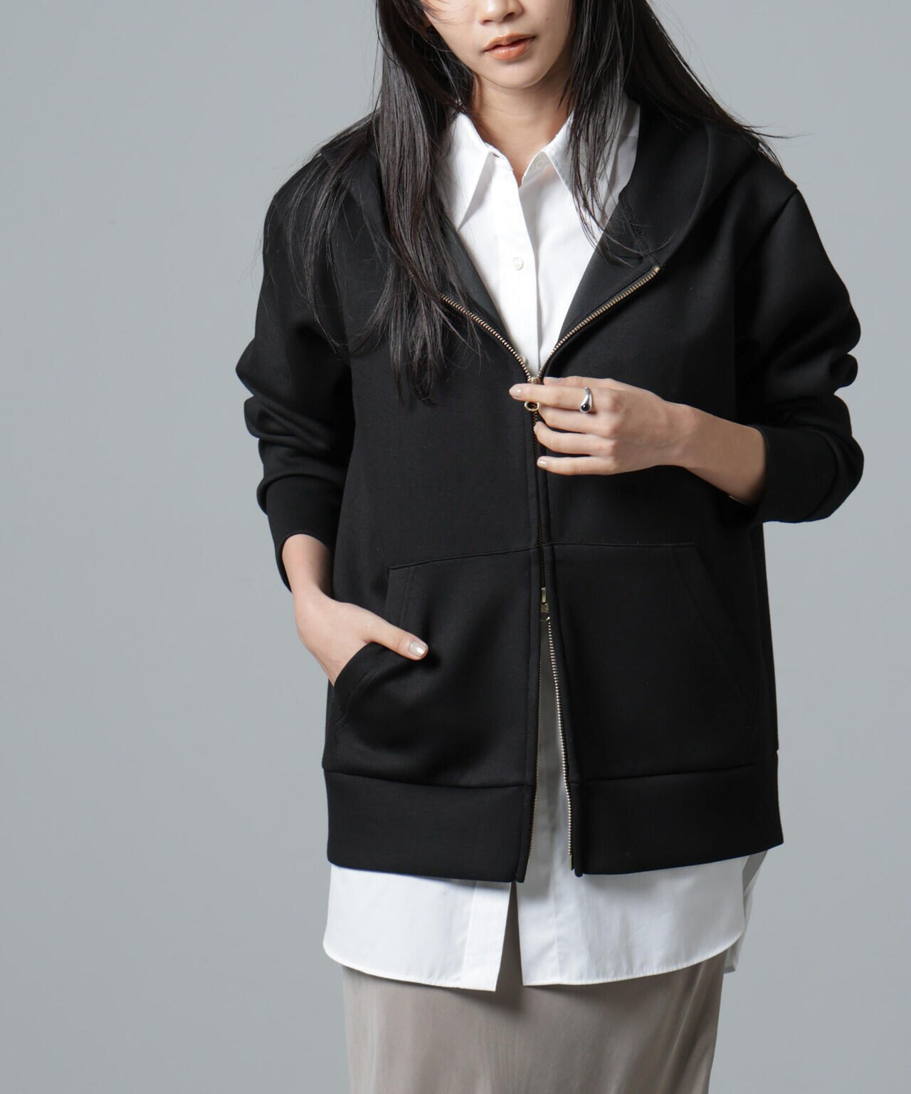 立体的なフォルムが魅力のミニマルなジップフーディー。一枚着や羽織としてはもちろん、ジャケットやコートの中に着てフードを見せるスタイリングもおすすめです。