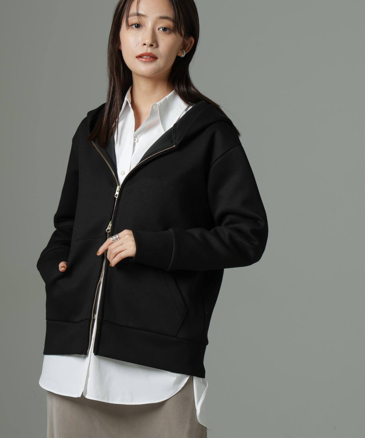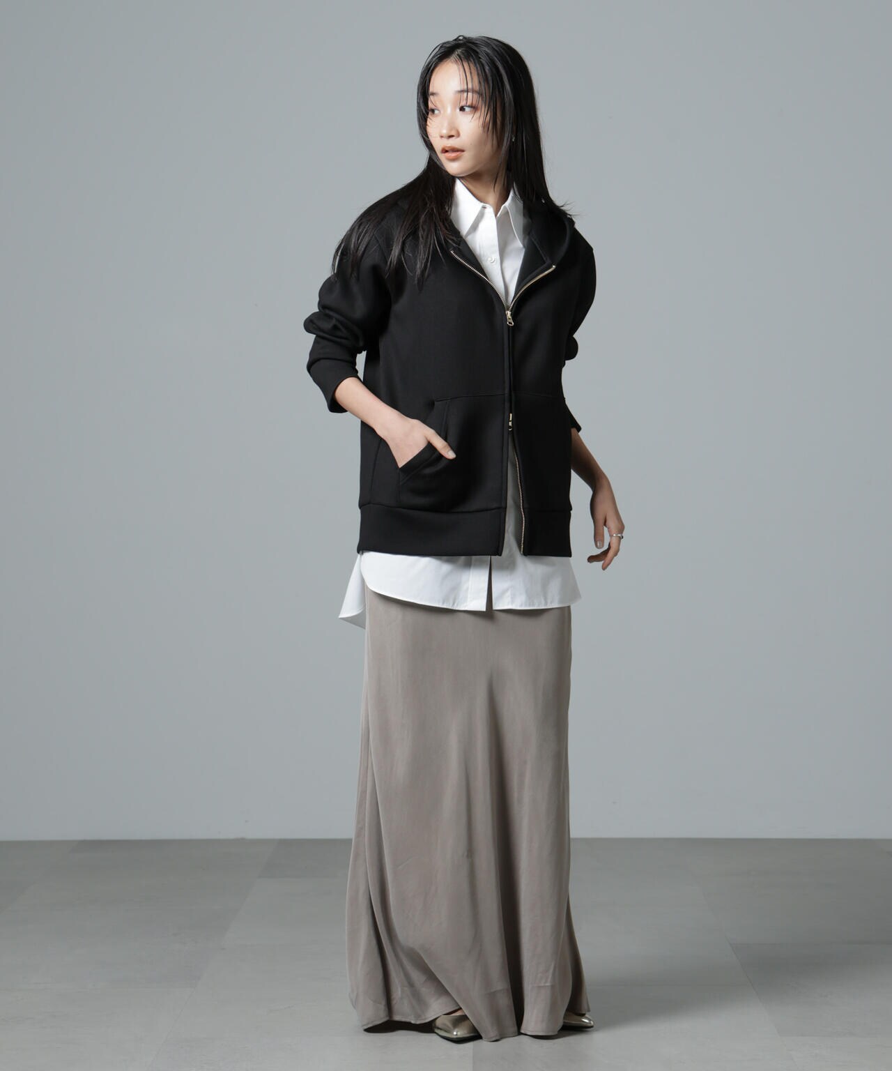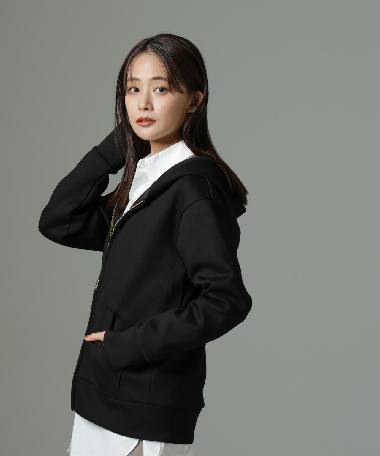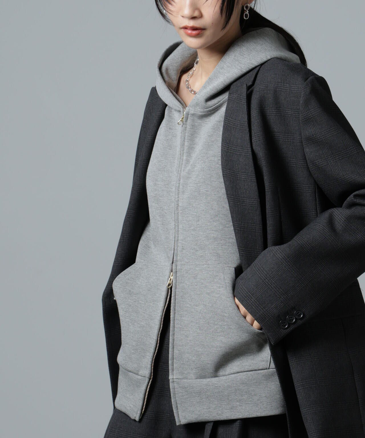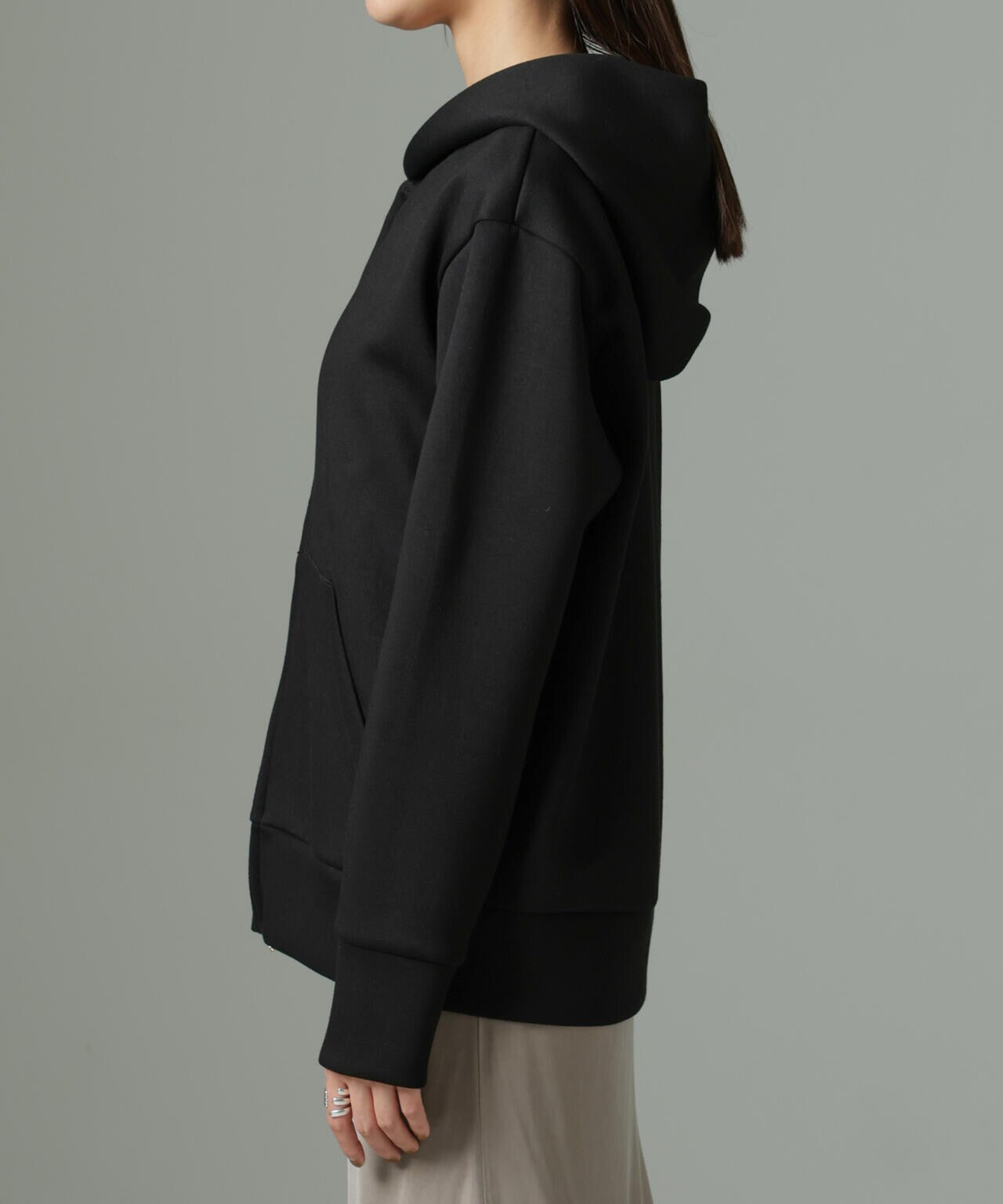 立体的なフォルムが魅力のミニマルなジップフーディー。一枚着や羽織としてはもちろん、ジャケットやコートの中に着てフードを見せるスタイリングもおすすめです。