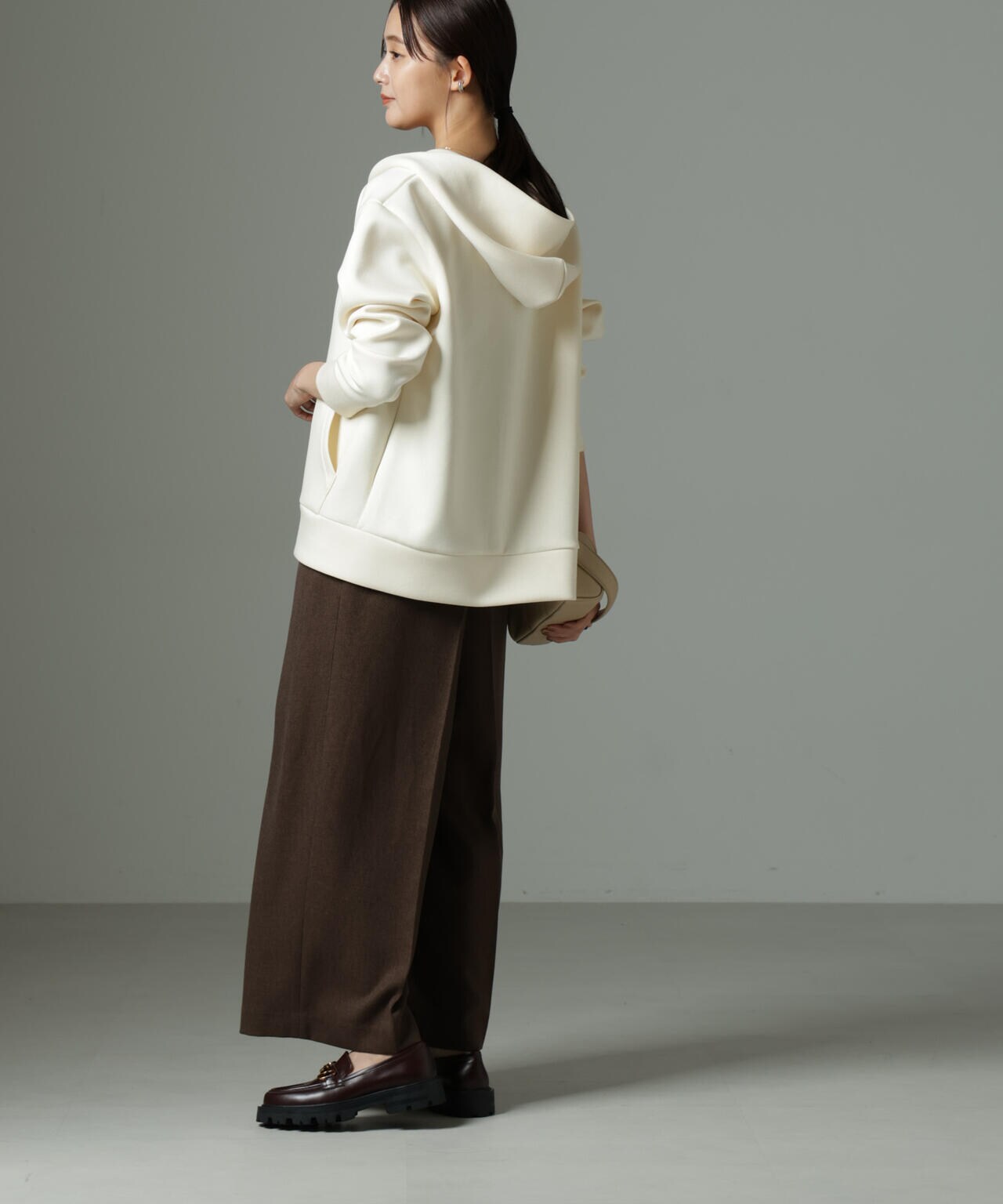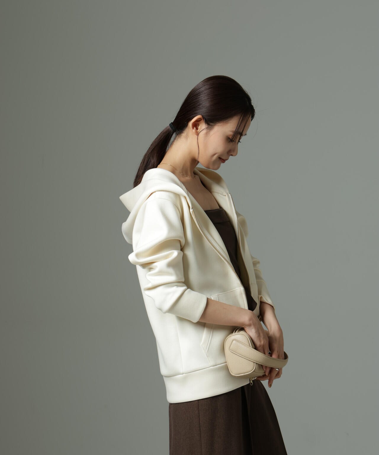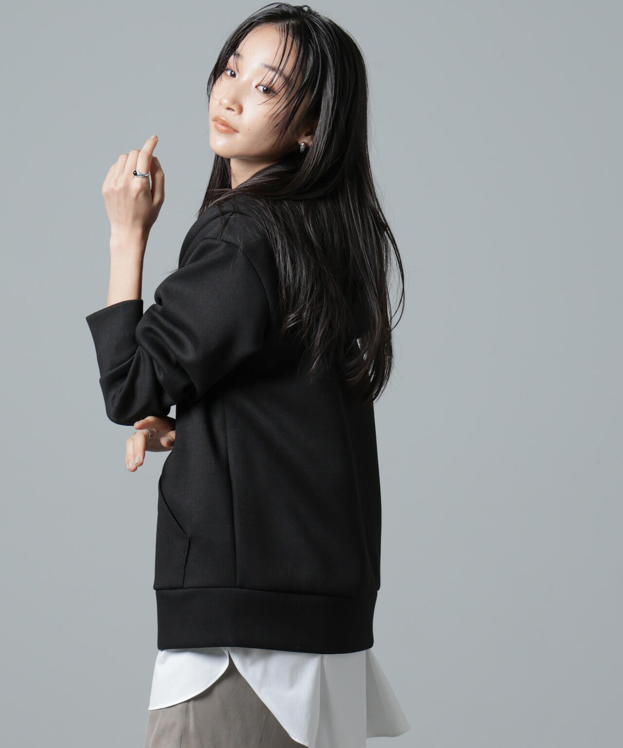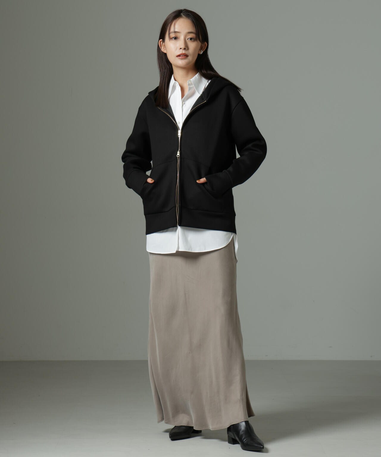 立体的なフォルムが魅力のミニマルなジップフーディー。一枚着や羽織としてはもちろん、ジャケットやコートの中に着てフードを見せるスタイリングもおすすめです。