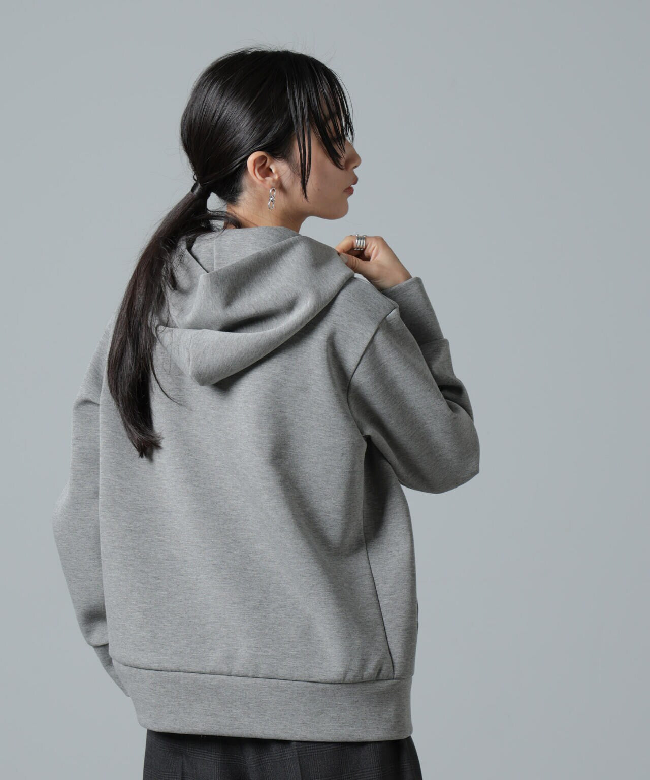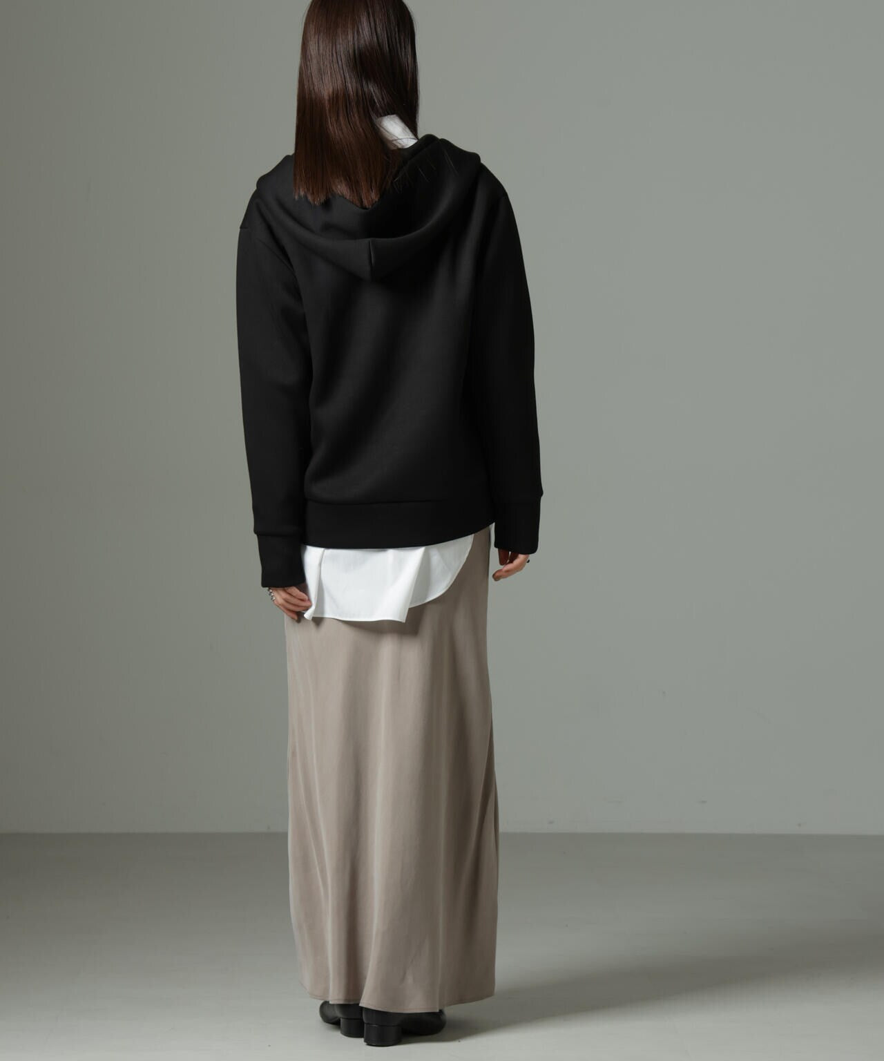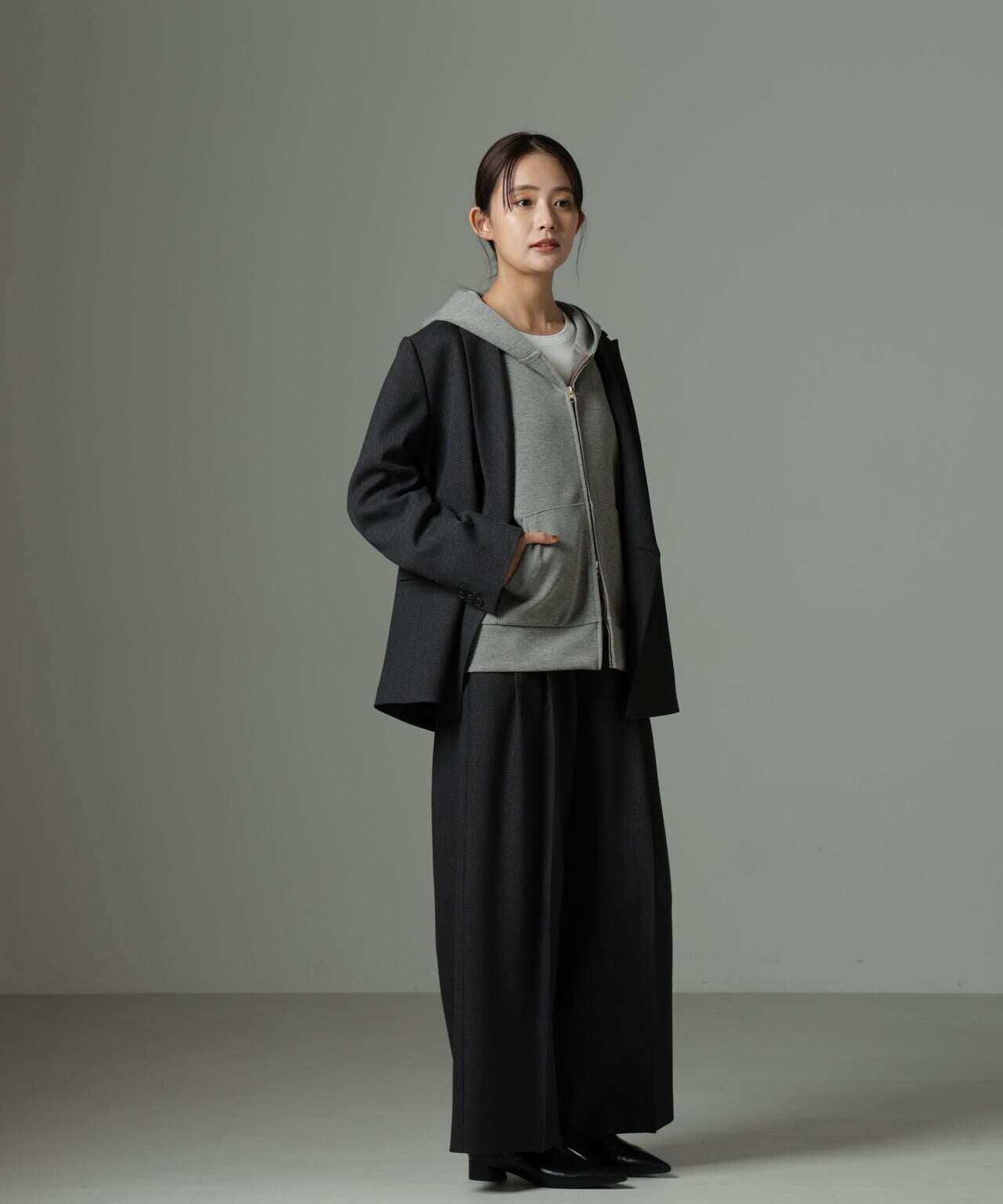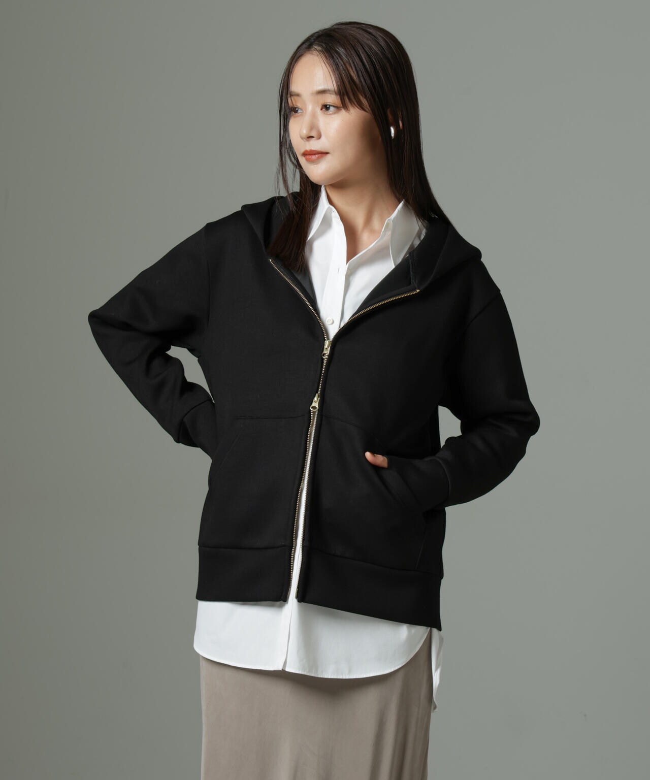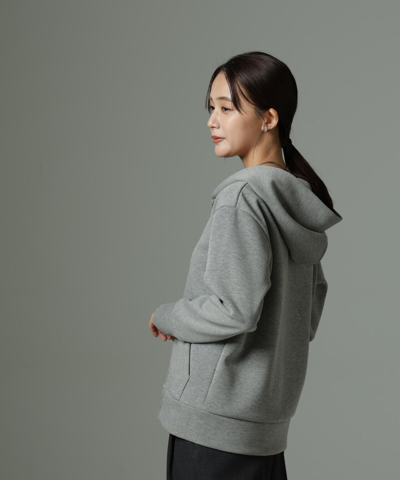 立体的なフォルムが魅力のミニマルなジップフーディー。一枚着や羽織としてはもちろん、ジャケットやコートの中に着てフードを見せるスタイリングもおすすめです。